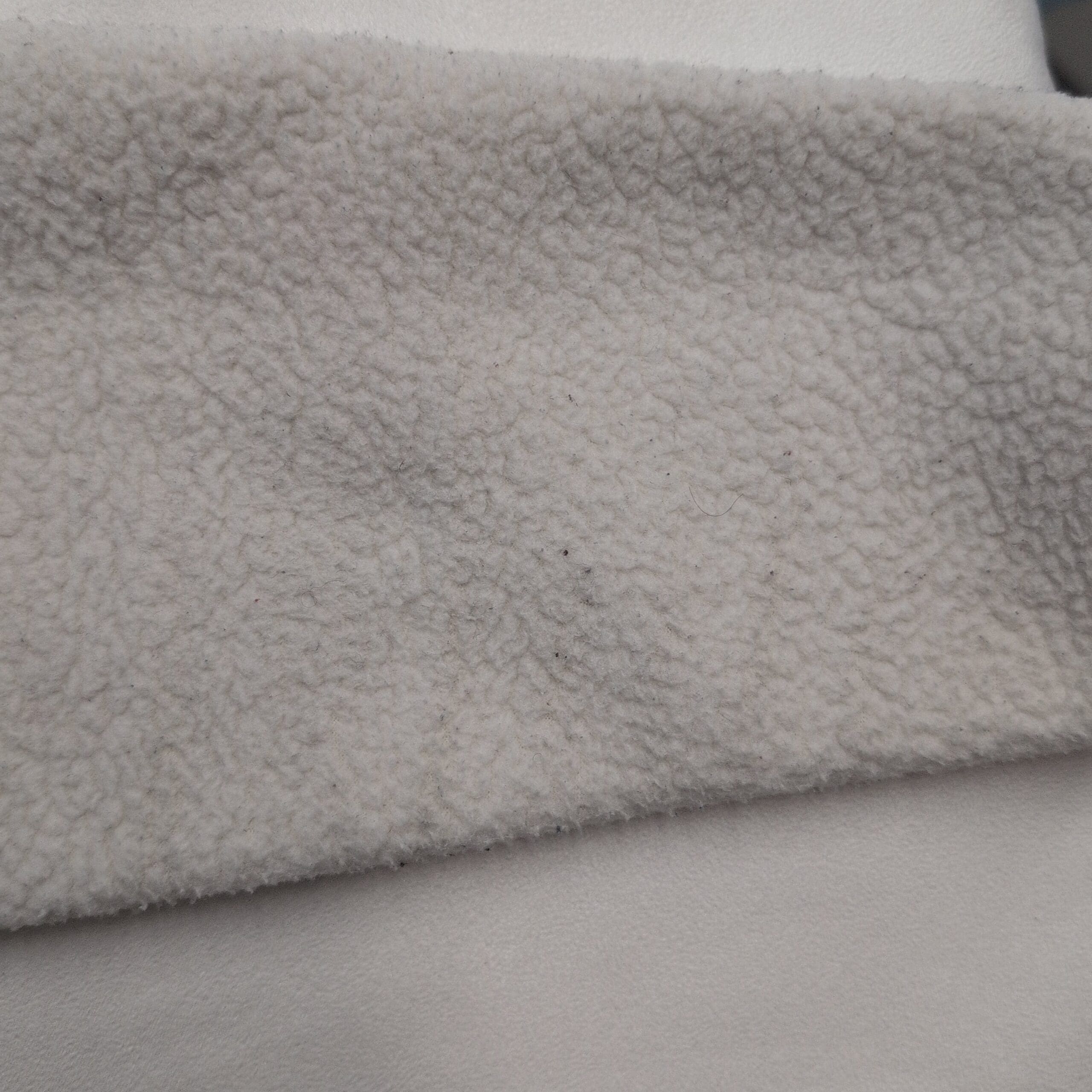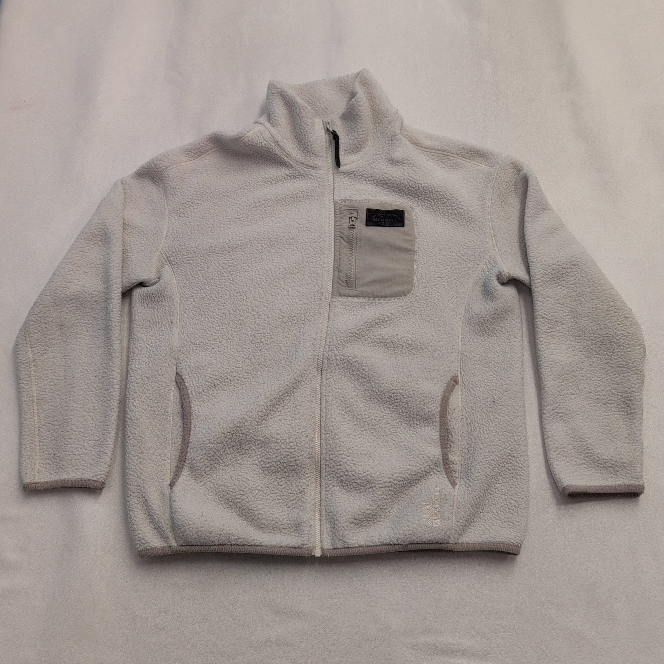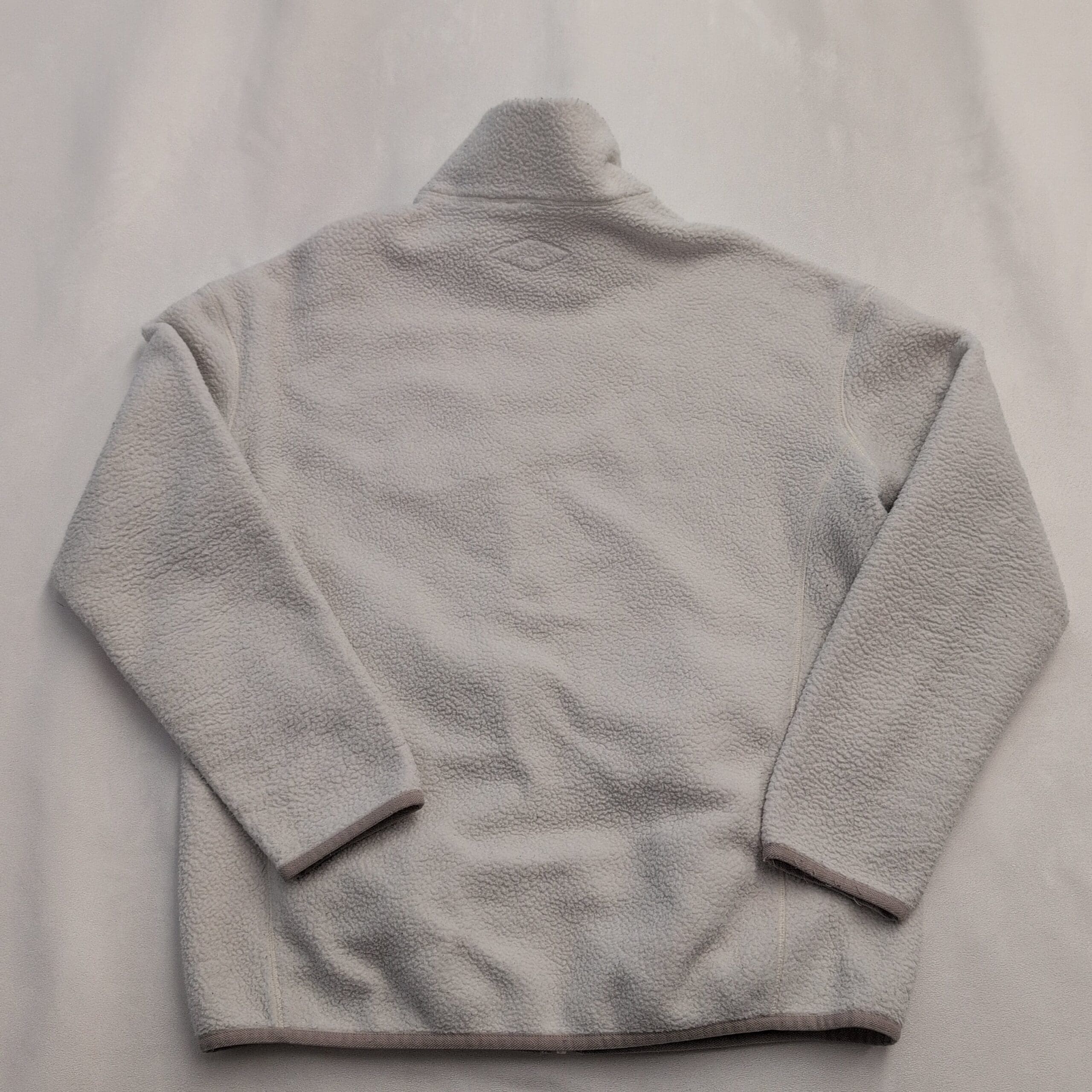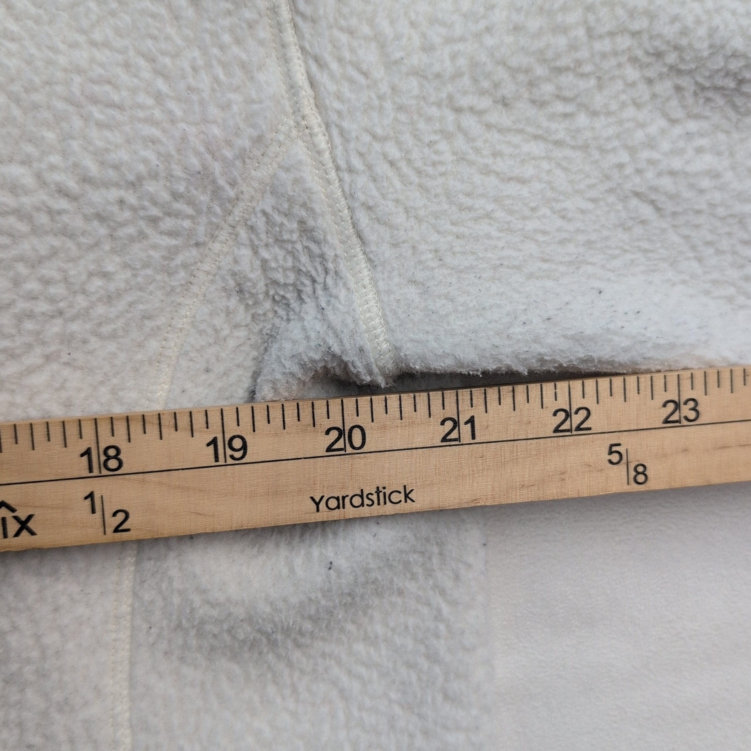 Merrell women’s full-zip fleece jacket in size L. Soft, insulating pile fleece with a stand collar, full-length zipper, zip chest pocket with Merrell logo patch, and two hand pockets. Light gray/ivory color with subtle contrast trim. Fair condition — slight discoloration consistent with normal use; otherwise intact with no rips, holes, or major stains. Comfortable layering piece for hiking or everyday wear.