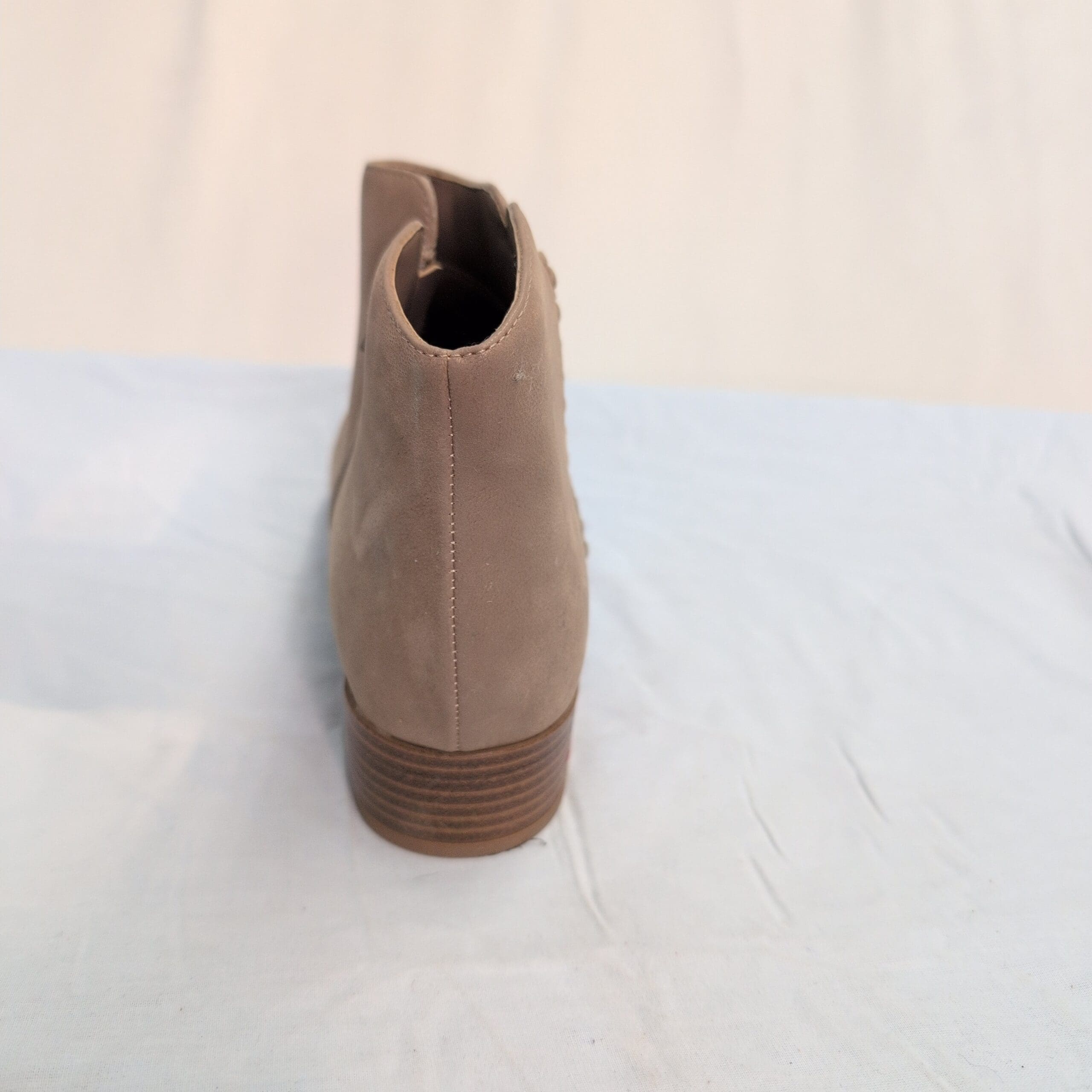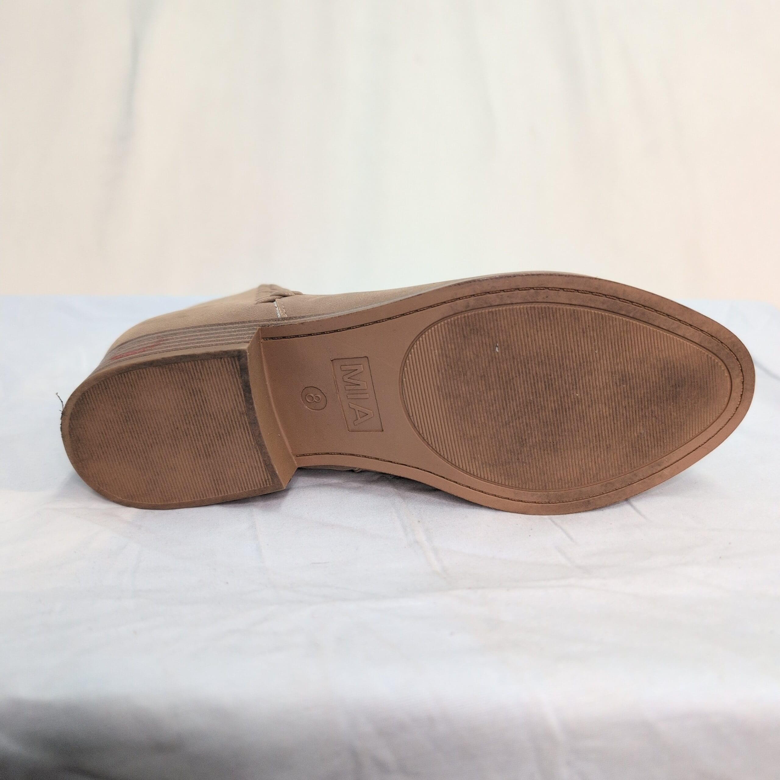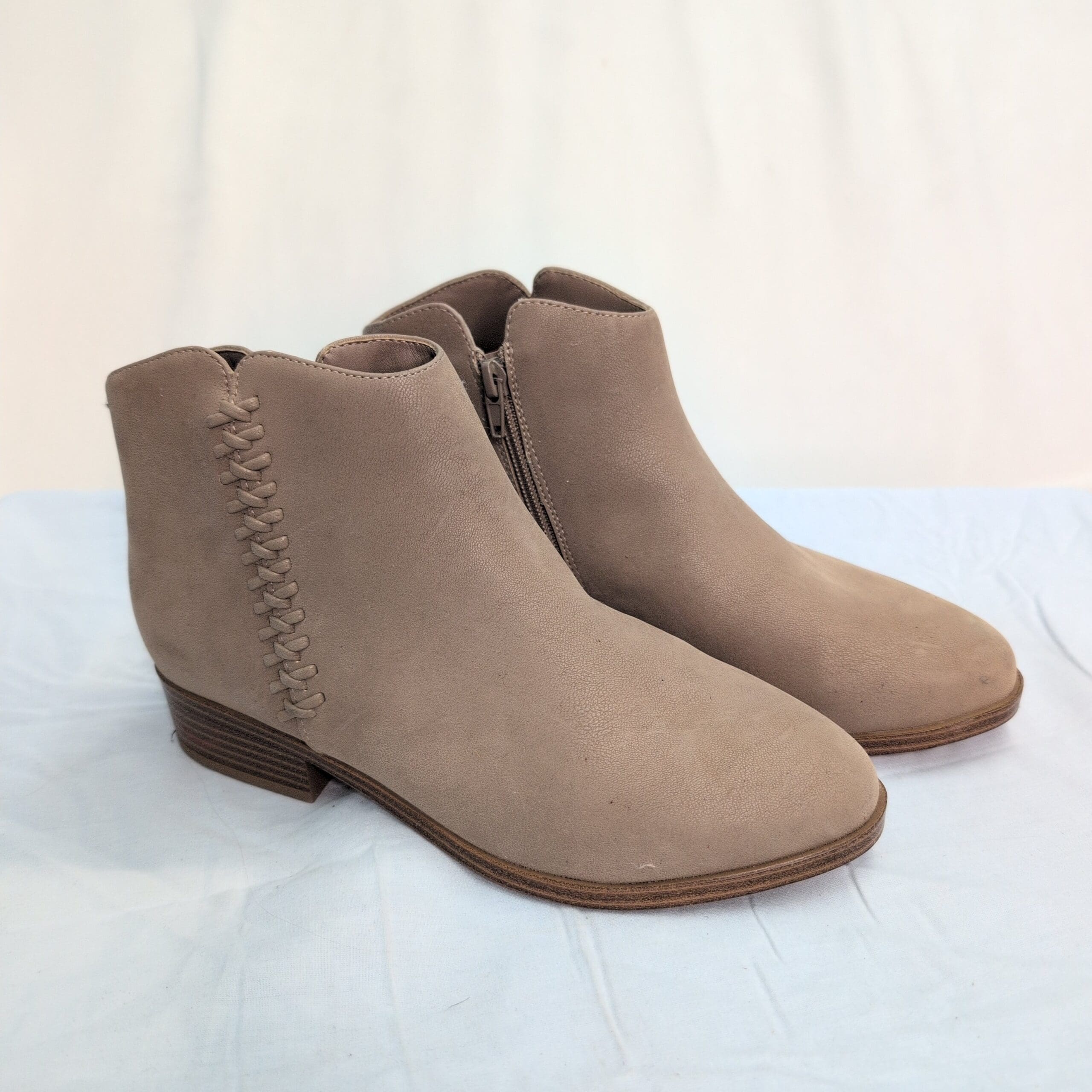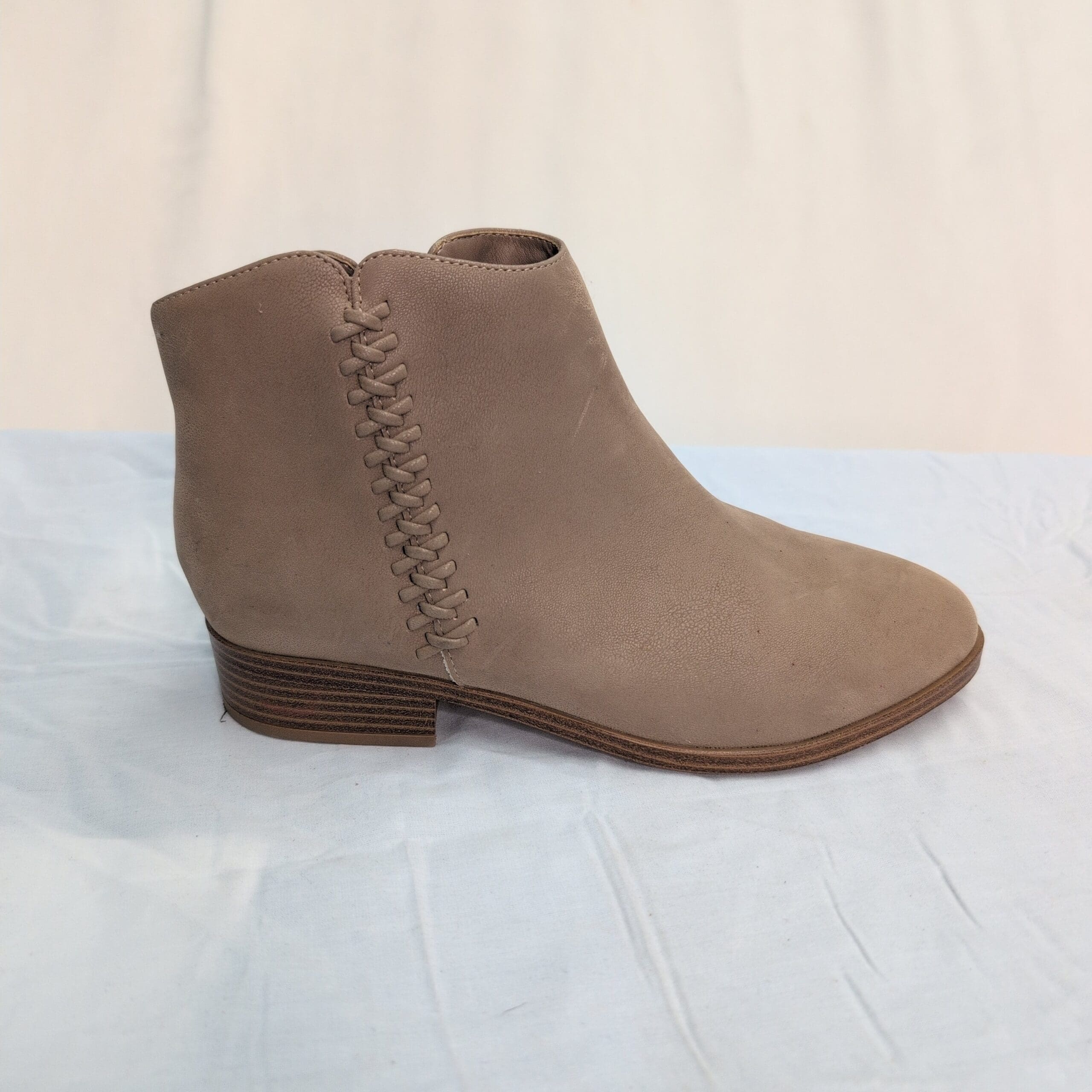 Mia tan ankle booties in women’s size 8. Suede-look upper with a decorative braided side detail and an inside zipper for easy on/off. Low stacked heel and rounded toe make these a versatile, everyday style that pairs well with jeans, skirts, or dresses.