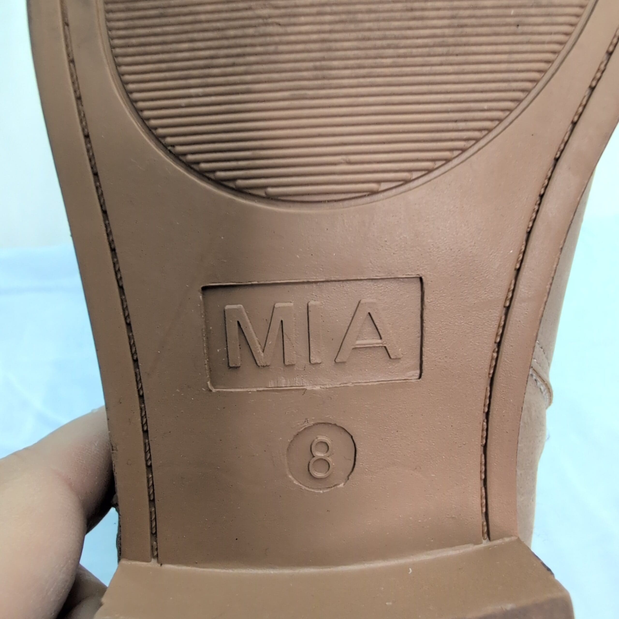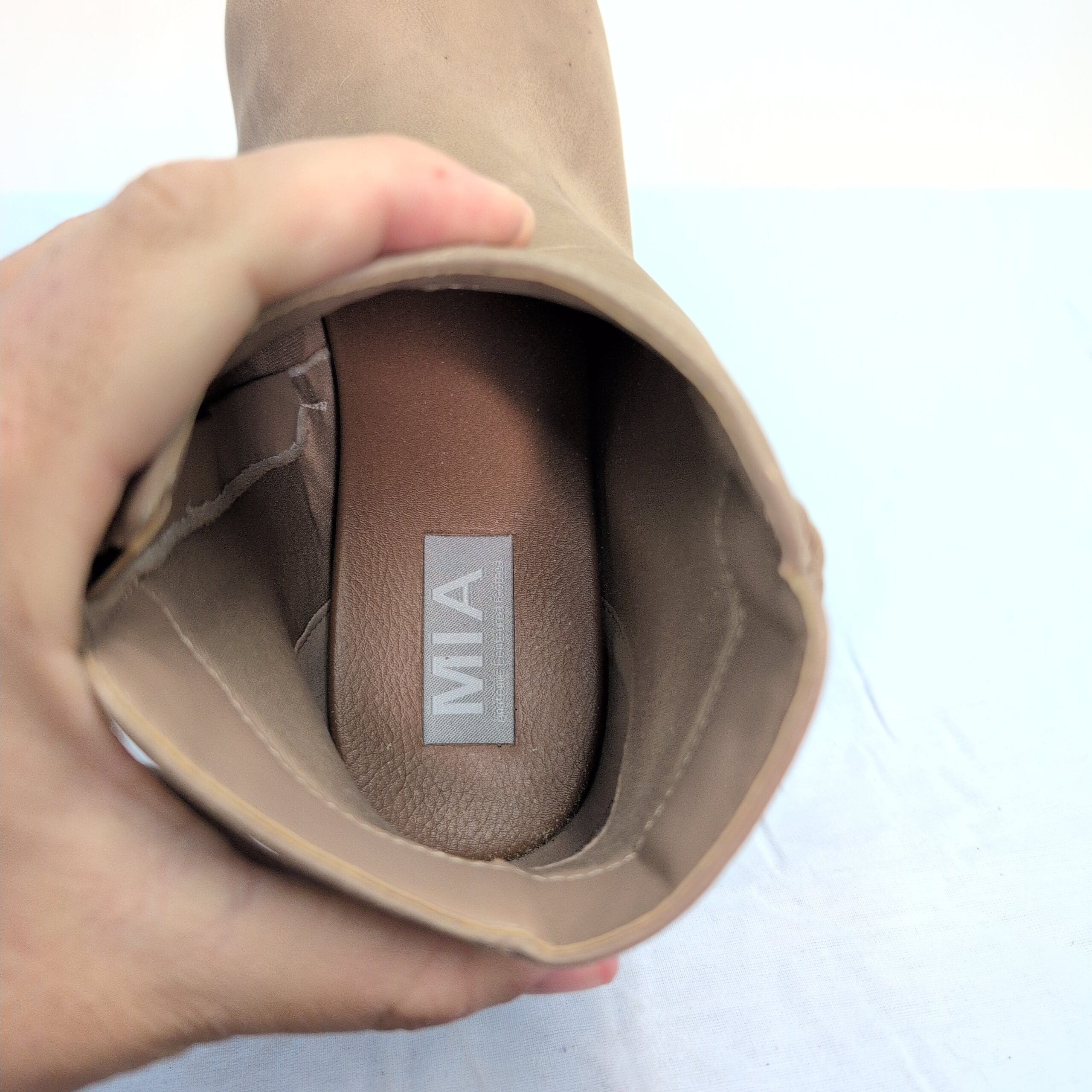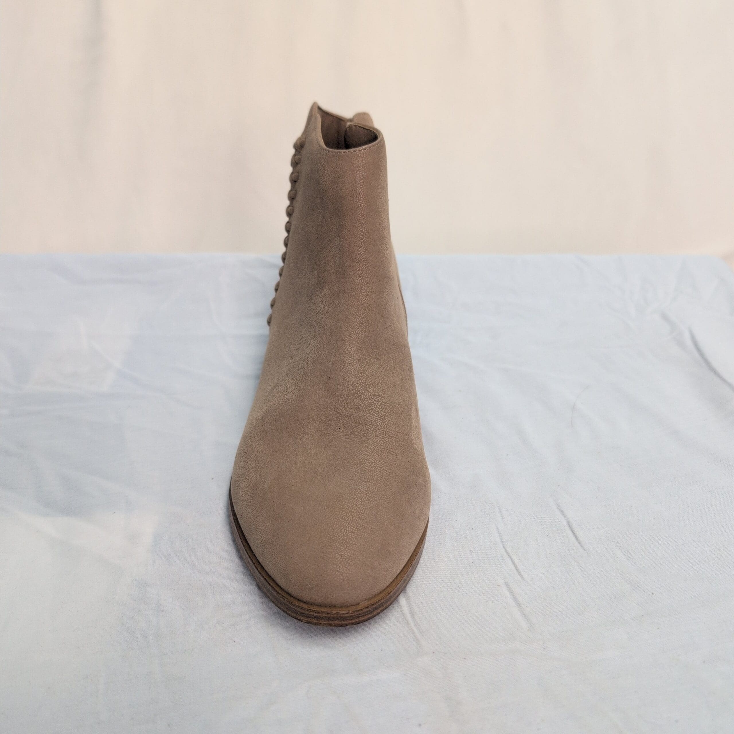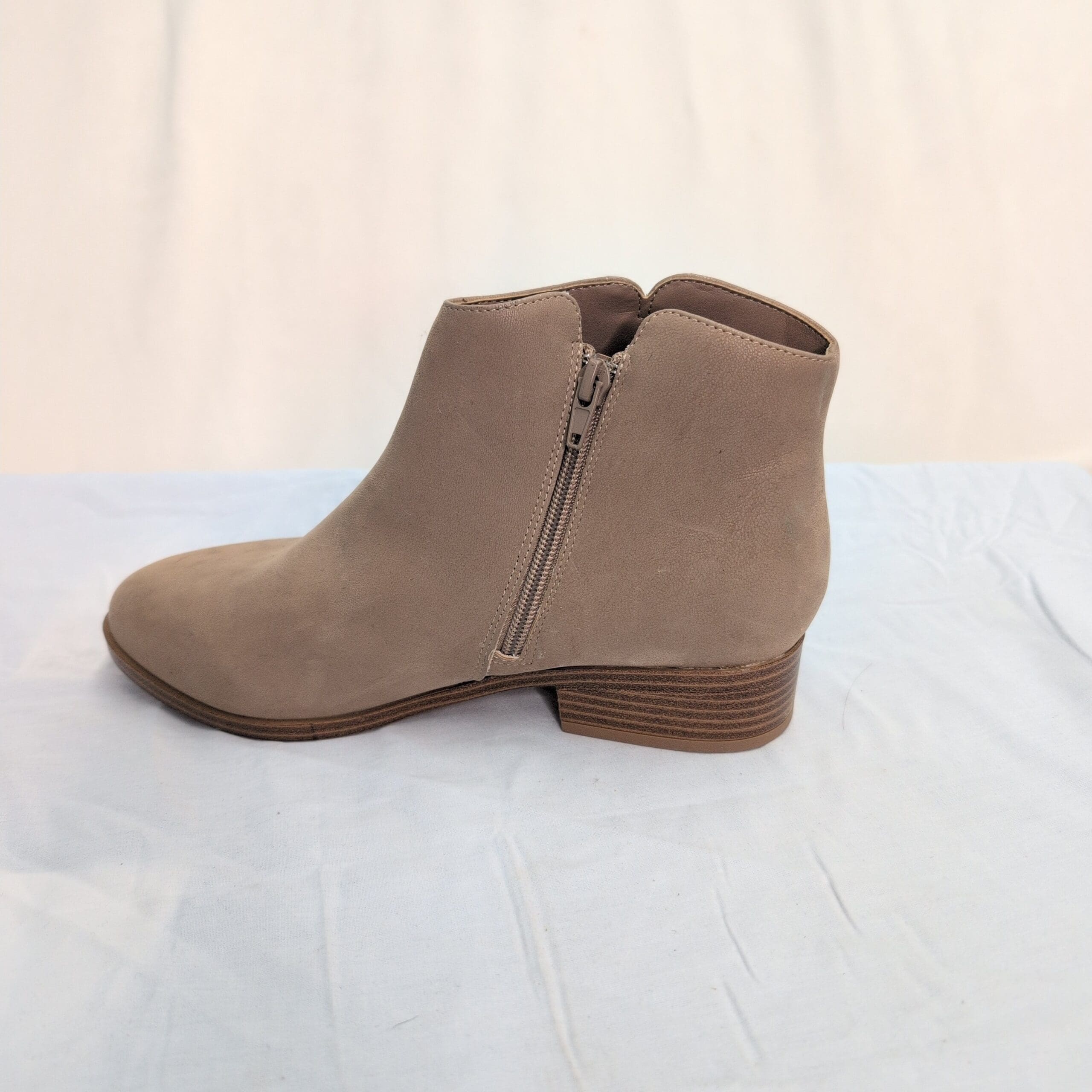Mia tan ankle booties in women’s size 8. Suede-look upper with a decorative braided side detail and an inside zipper for easy on/off. Low stacked heel and rounded toe make these a versatile, everyday style that pairs well with jeans, skirts, or dresses.
