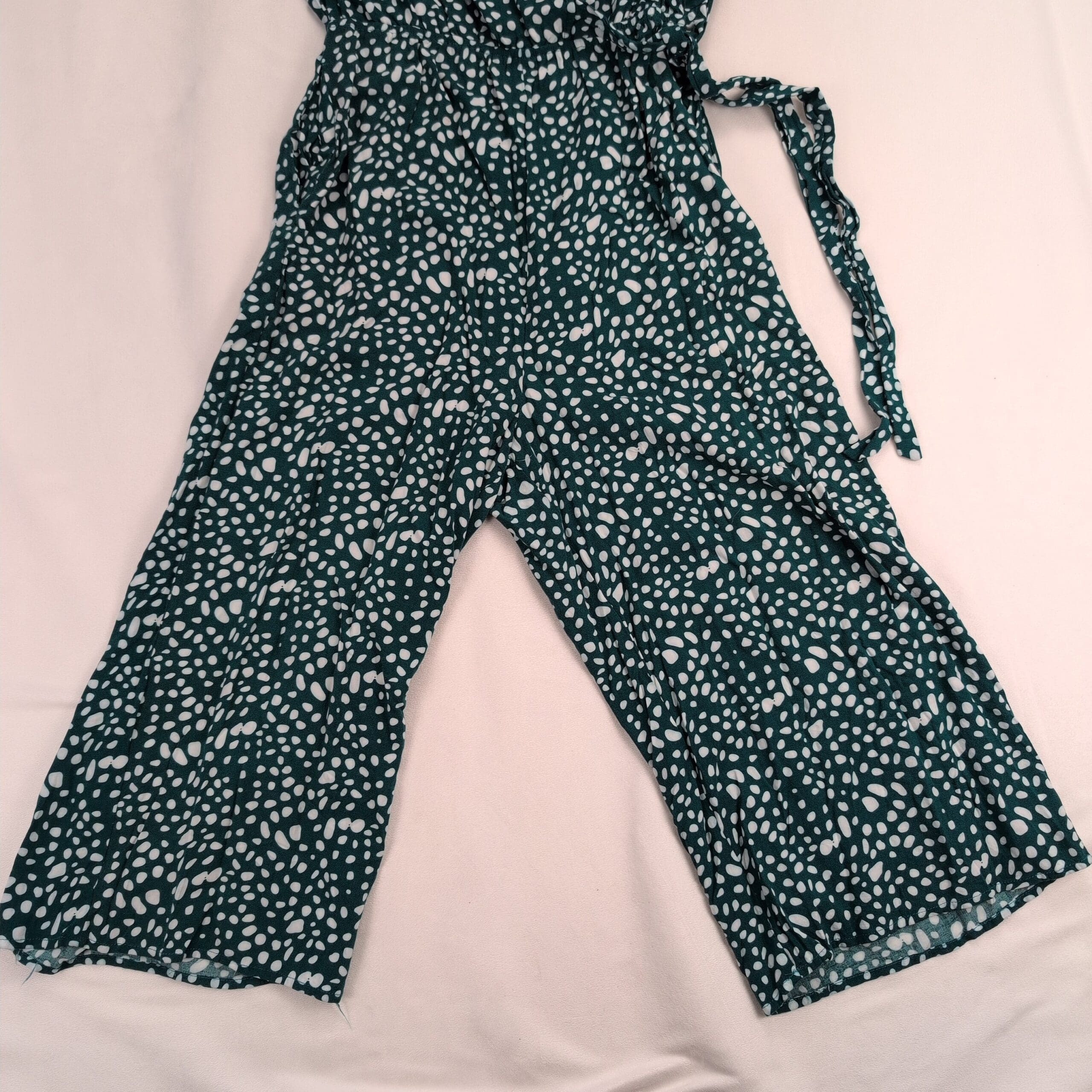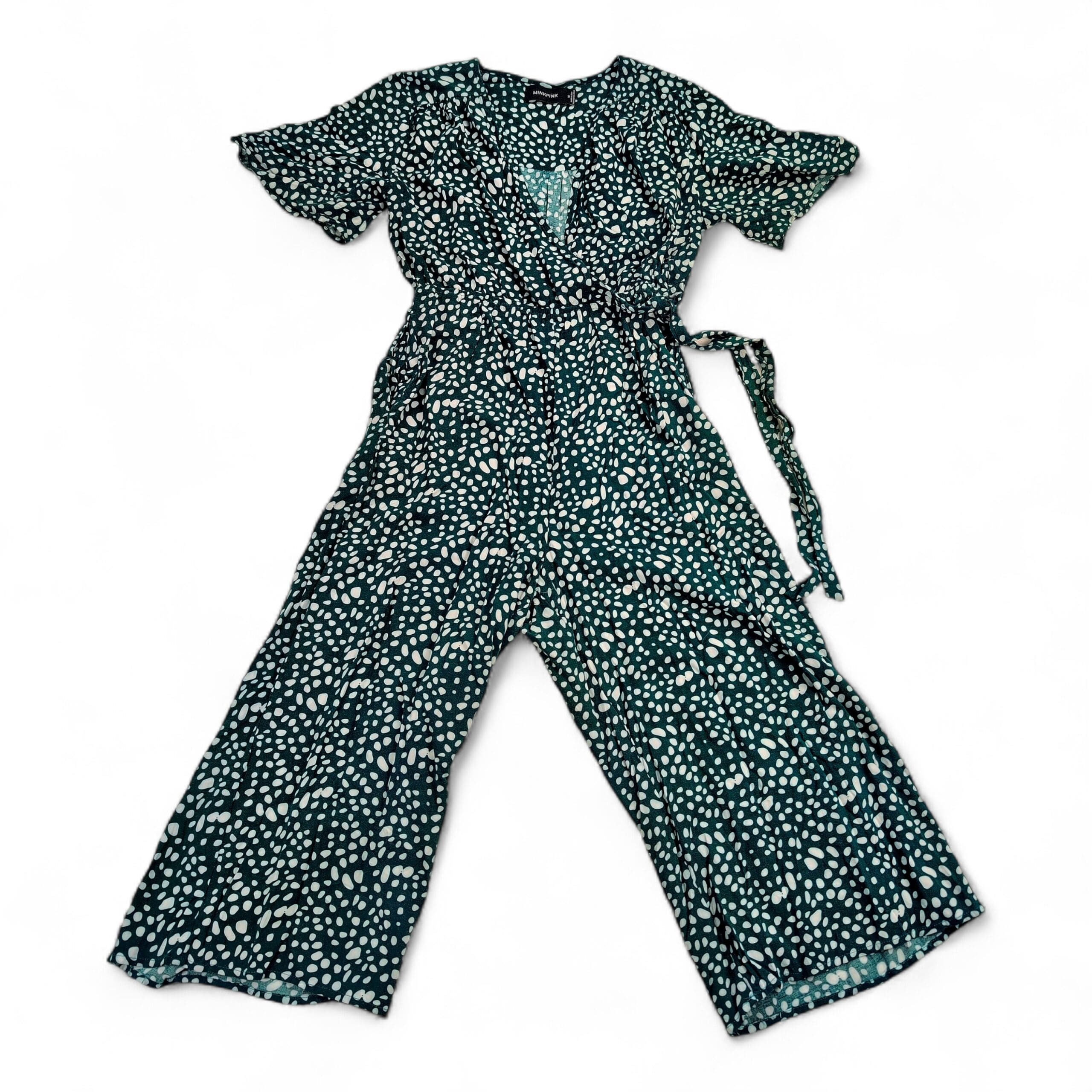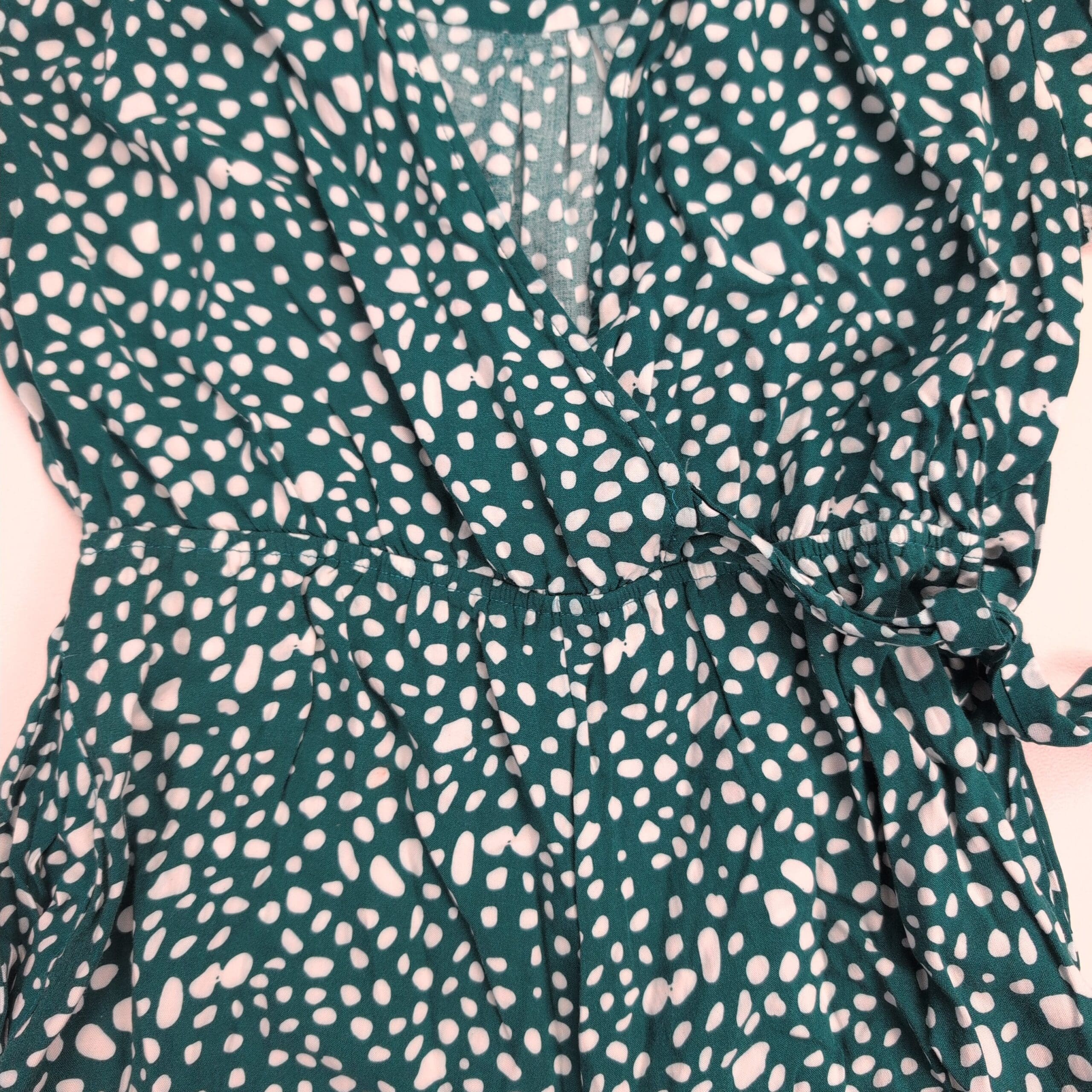 Teal & white abstract dot wrap jumpsuit by Minkpink, size M. Features a surplice V-neck, short flutter sleeves, self-tie waist, and wide cropped legs for a relaxed, flattering silhouette. Lightweight, drapey fabric with all-over print — versatile for daytime or dressed up for evening. Excellent used condition: free of major rips, tears, stains, or flaws; shows typical gentle wear consistent with prior use.