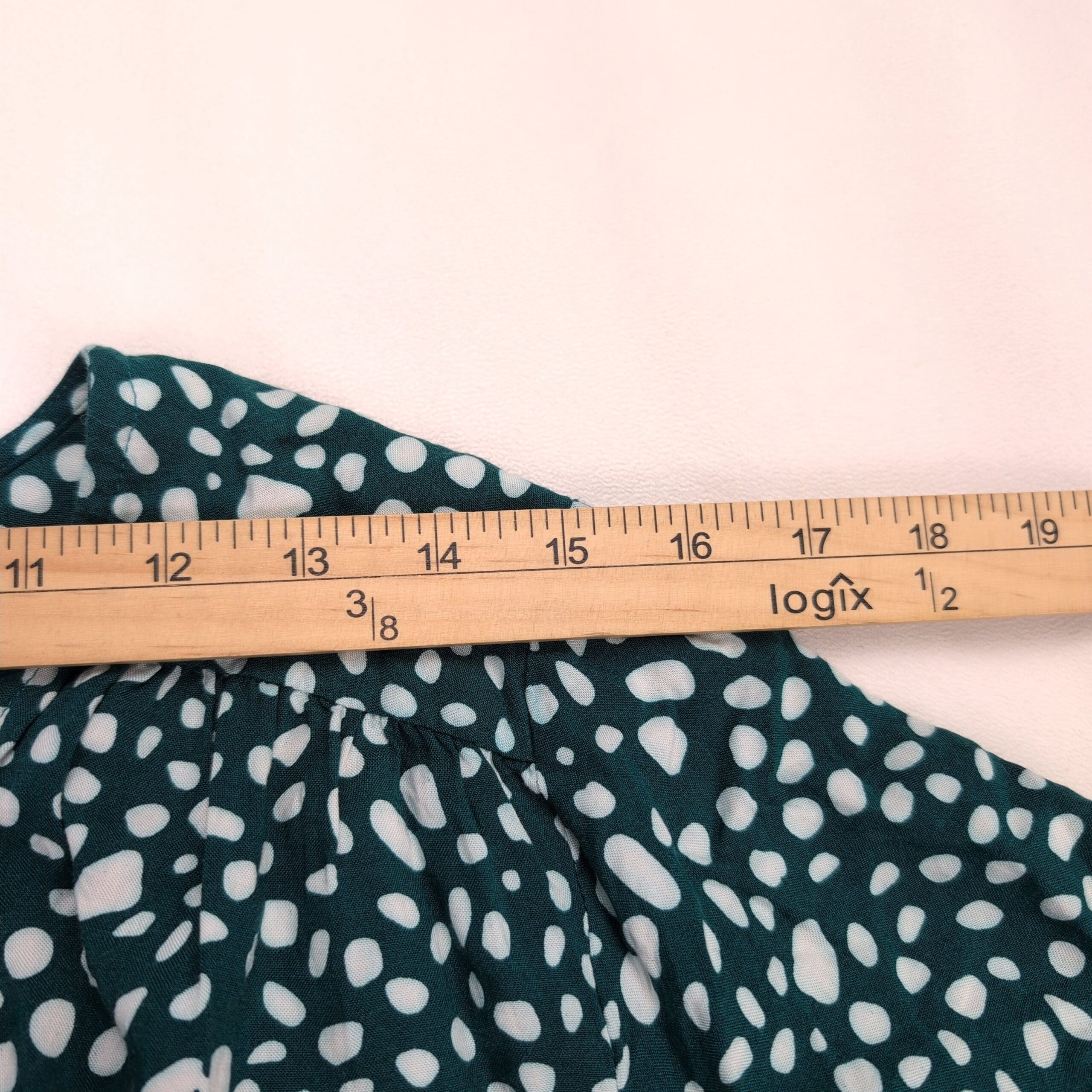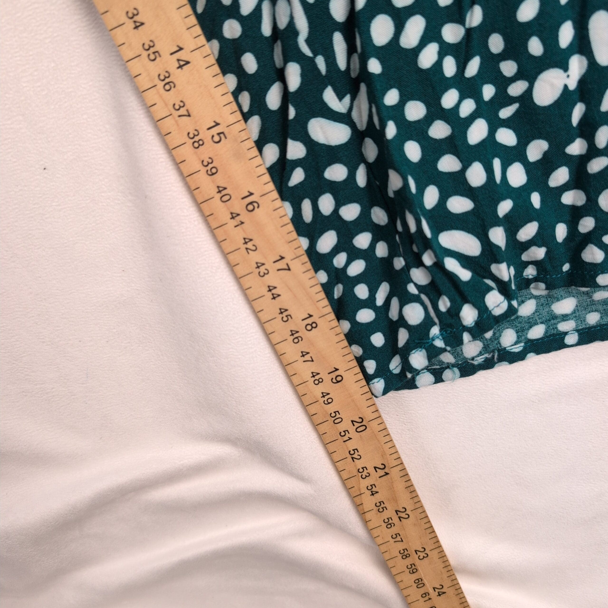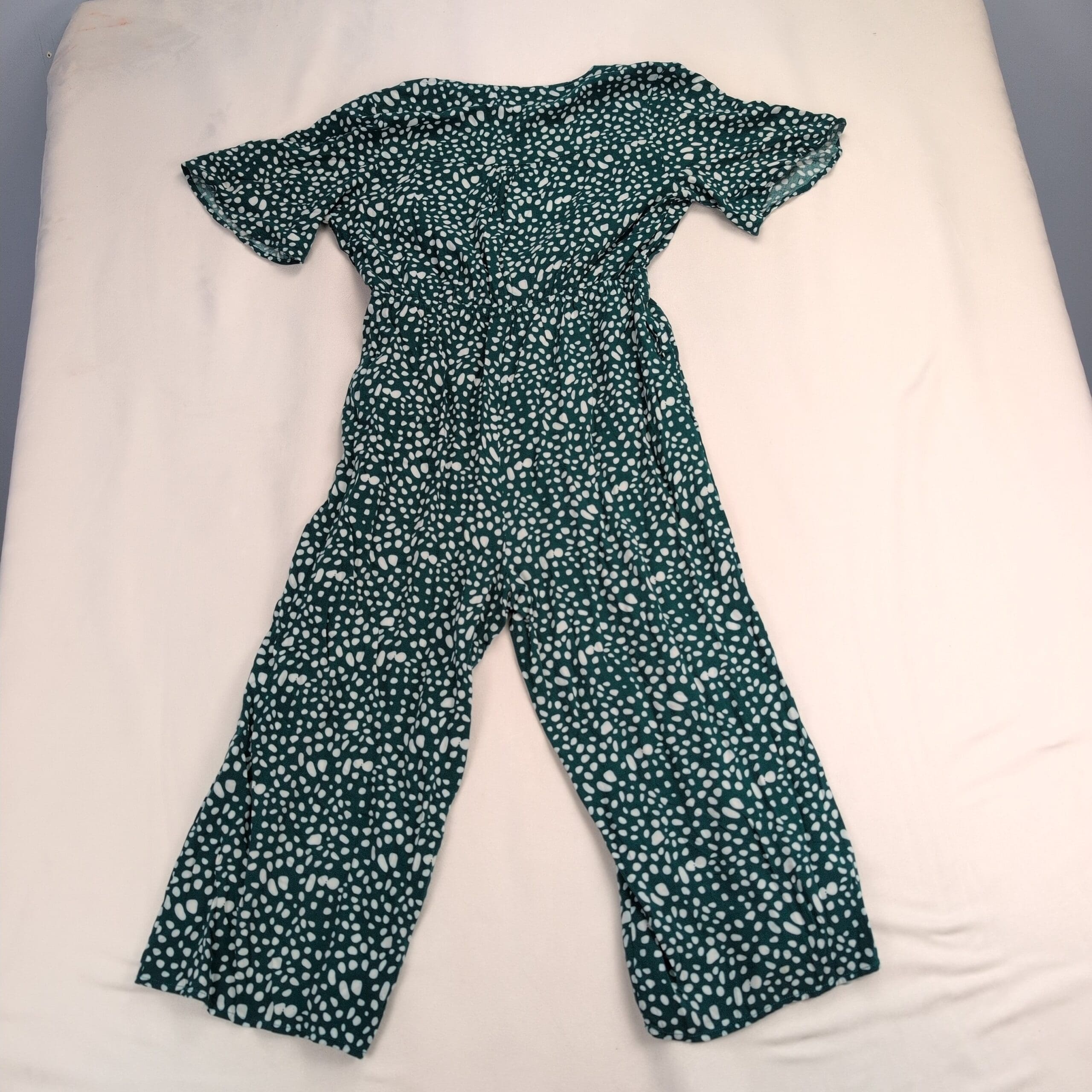 Teal & white abstract dot wrap jumpsuit by Minkpink, size M. Features a surplice V-neck, short flutter sleeves, self-tie waist, and wide cropped legs for a relaxed, flattering silhouette. Lightweight, drapey fabric with all-over print — versatile for daytime or dressed up for evening. Excellent used condition: free of major rips, tears, stains, or flaws; shows typical gentle wear consistent with prior use.