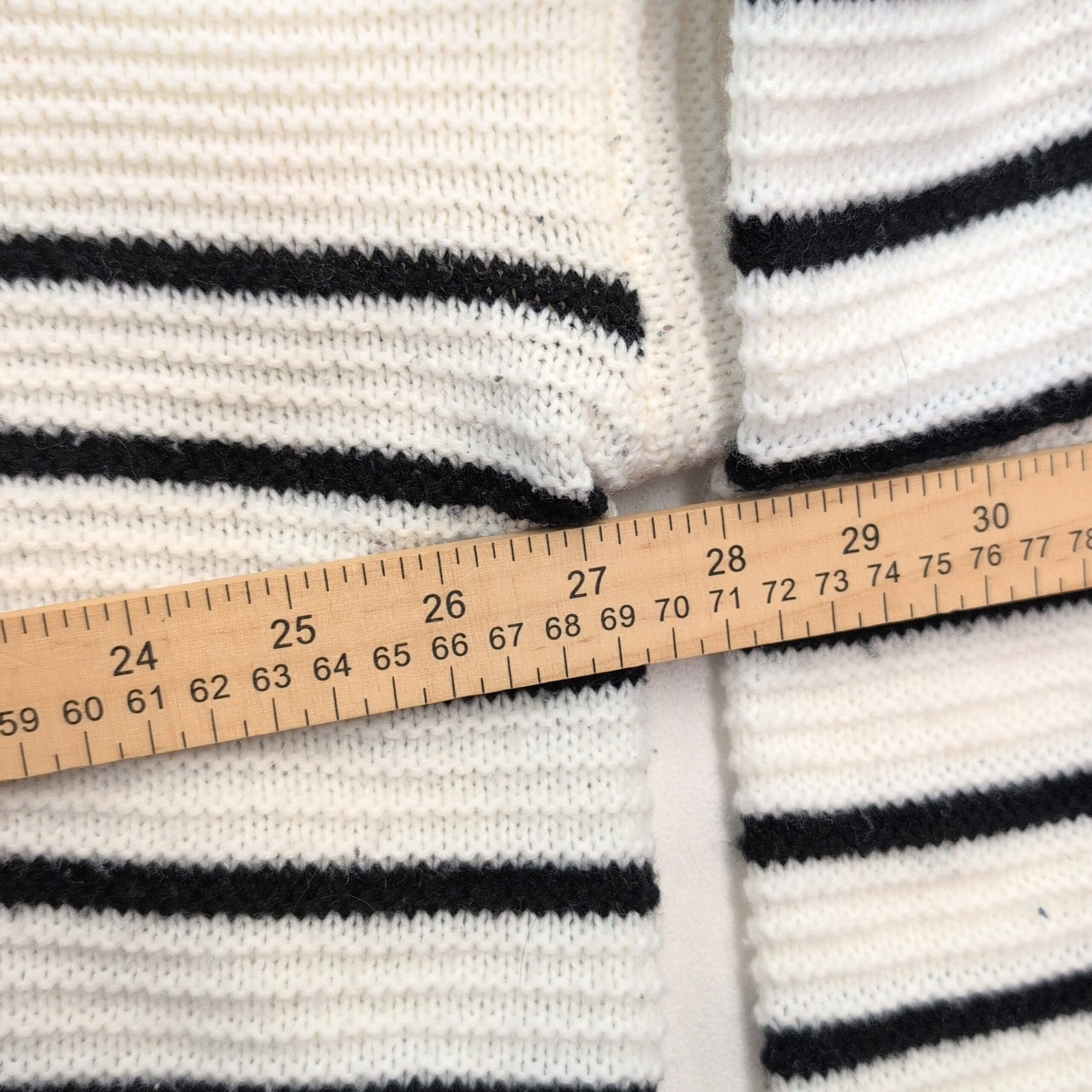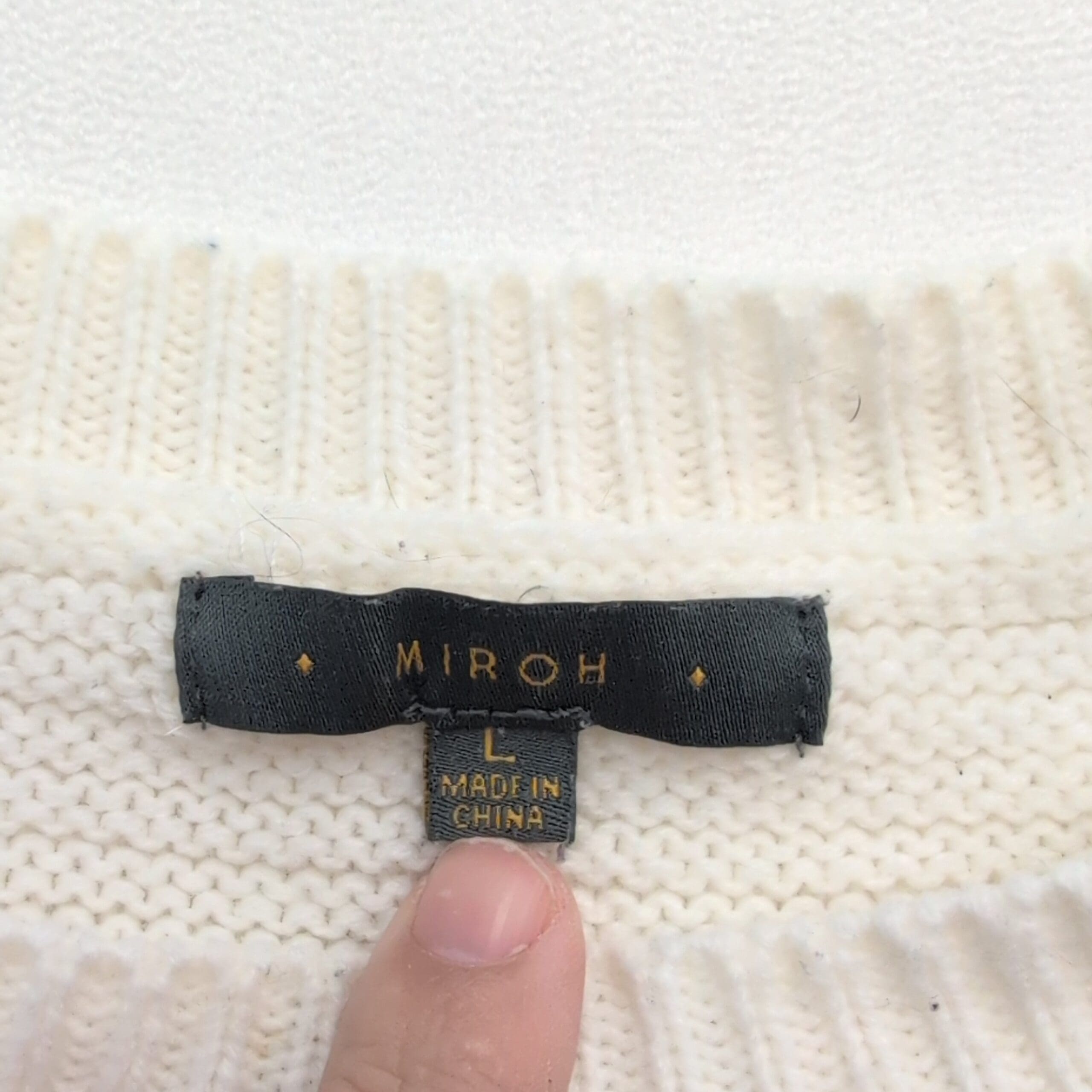 Classic Miroh striped crewneck sweater in cream (ivory) with black horizontal stripes. Boxy, slightly cropped silhouette with drop shoulders and ribbed crew neckline, cuffs, and hem. Size L — fits relaxed; no exact measurements provided. Excellent used condition: free of major rips, tears, stains, or flaws, though typical light wear may be present. Versatile piece for layering or pairing with high-rise jeans or skirts.