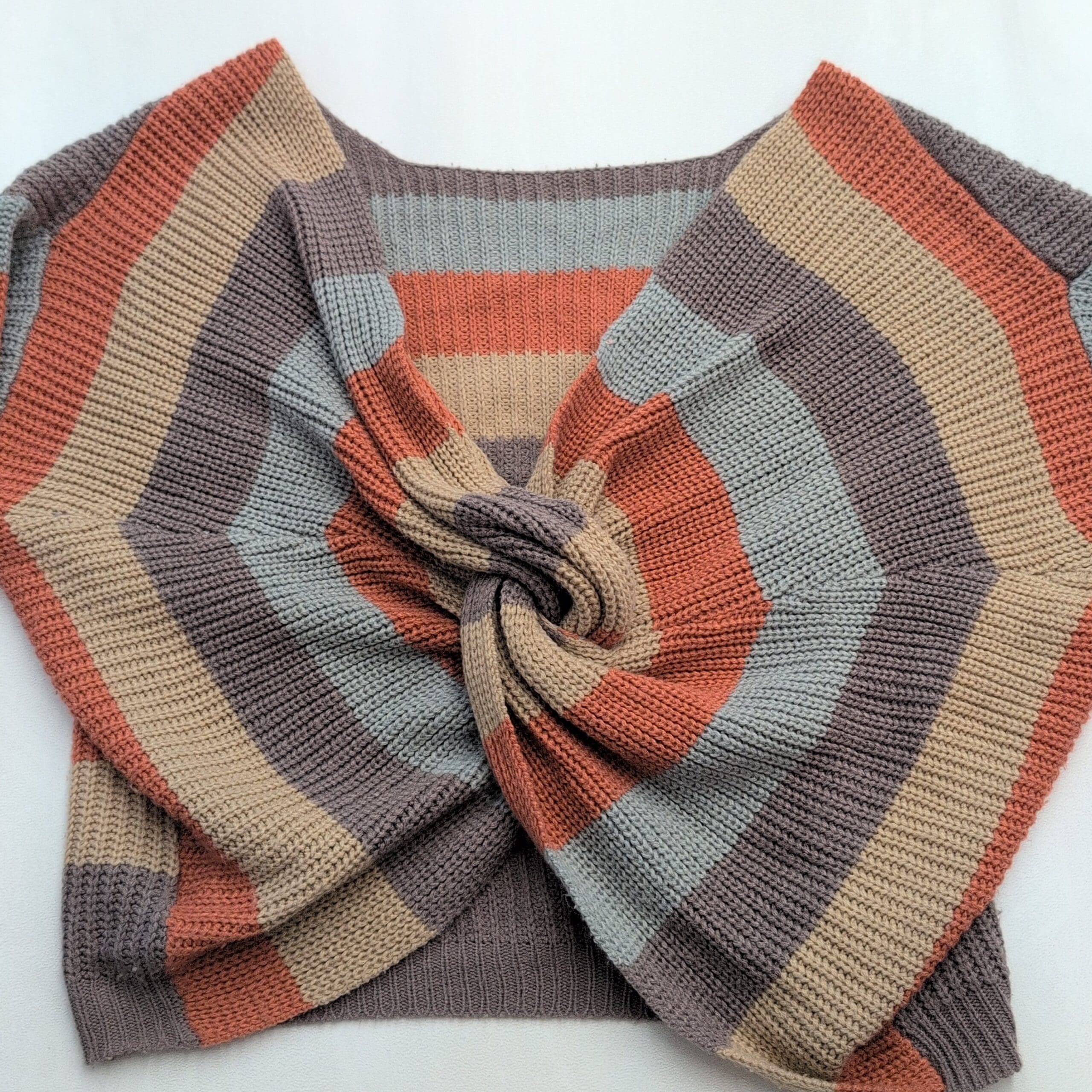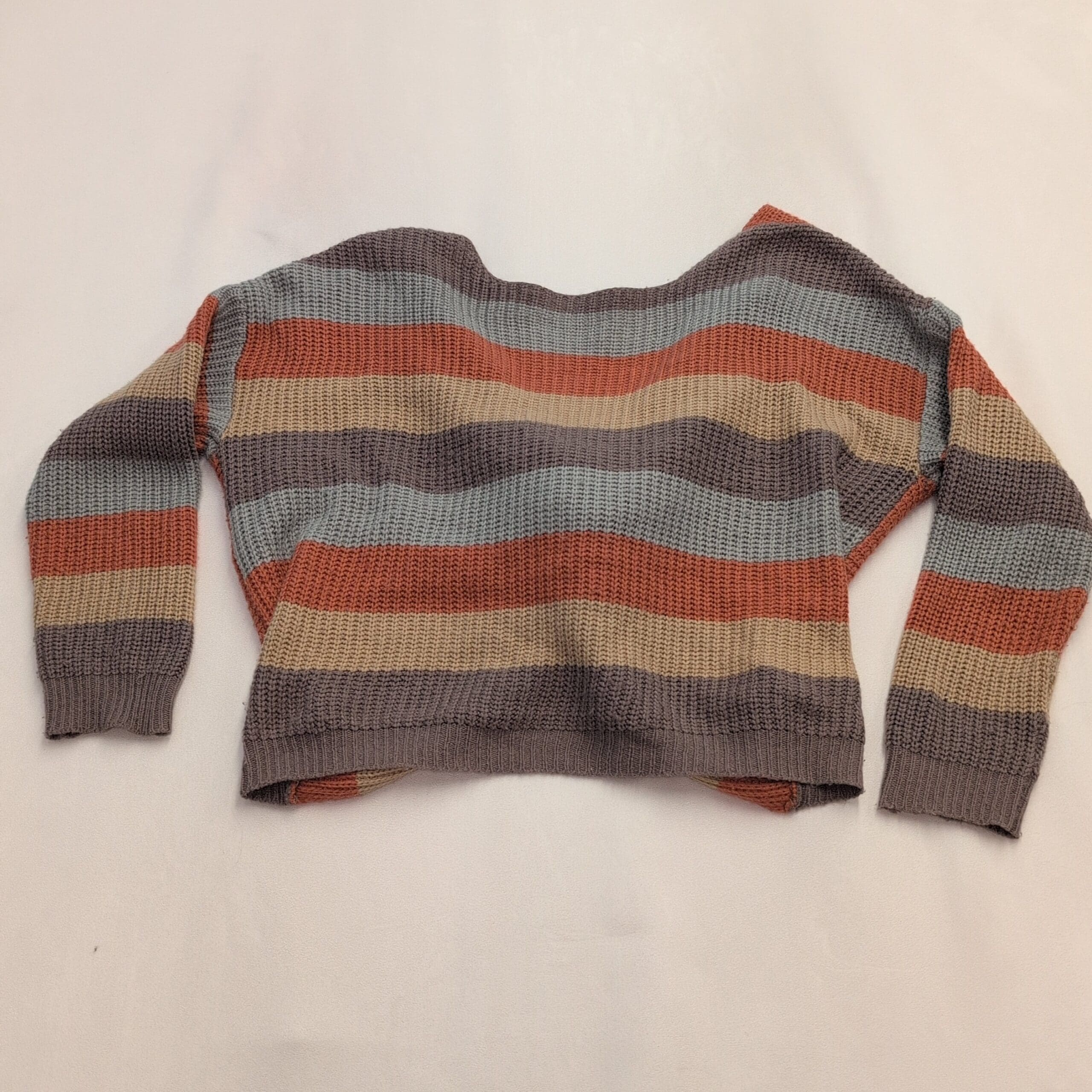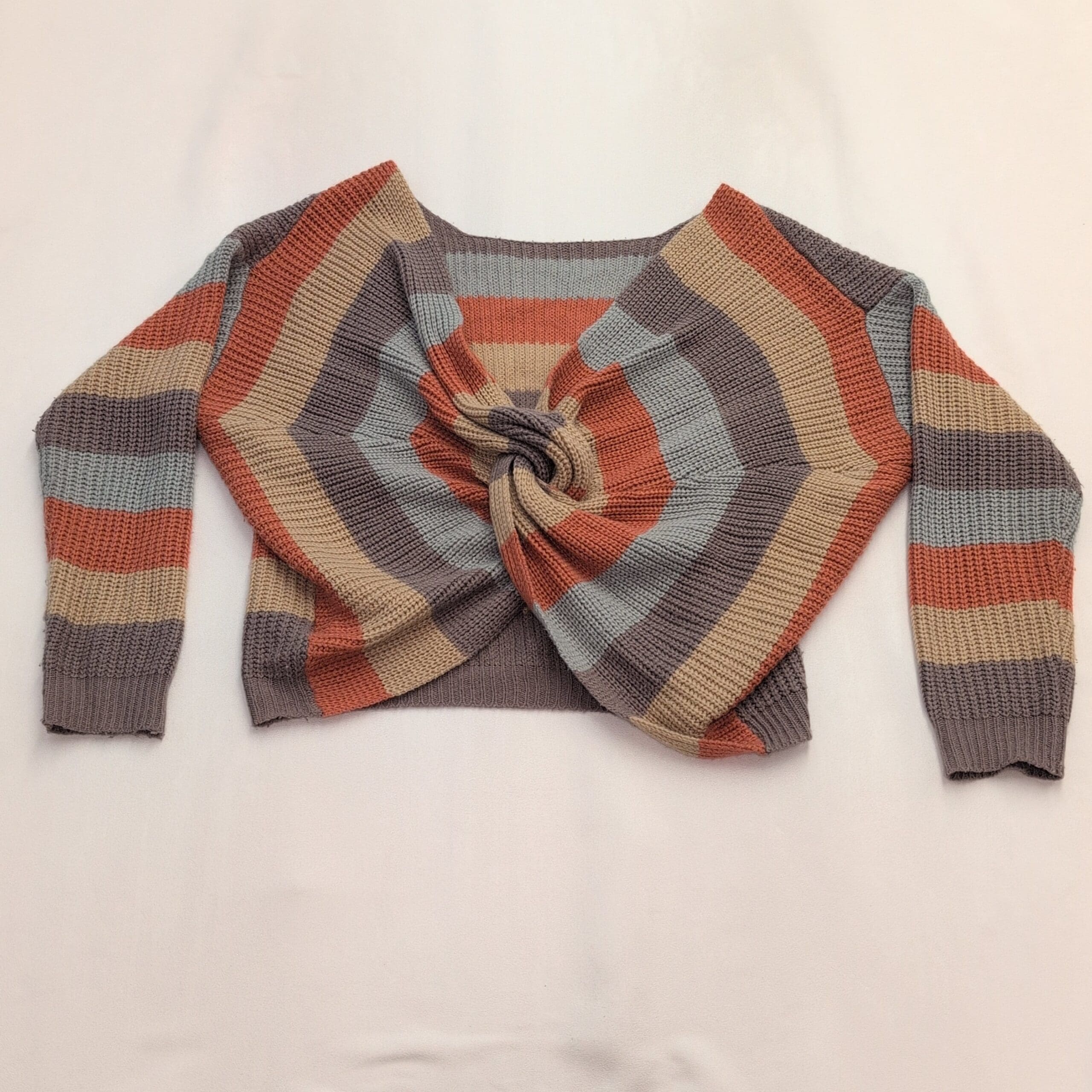 Lightweight knit Miroh women’s sweater in size L with a fashionable twist/knot front and cropped silhouette. Wide horizontal stripes in rust, light blue, beige and taupe; long sleeves with ribbed cuffs and a ribbed hem. Excellent used condition — free of major rips, tears, stains, or flaws; normal light wear consistent with prior use. Stylish for layering over high-waist jeans or skirts.