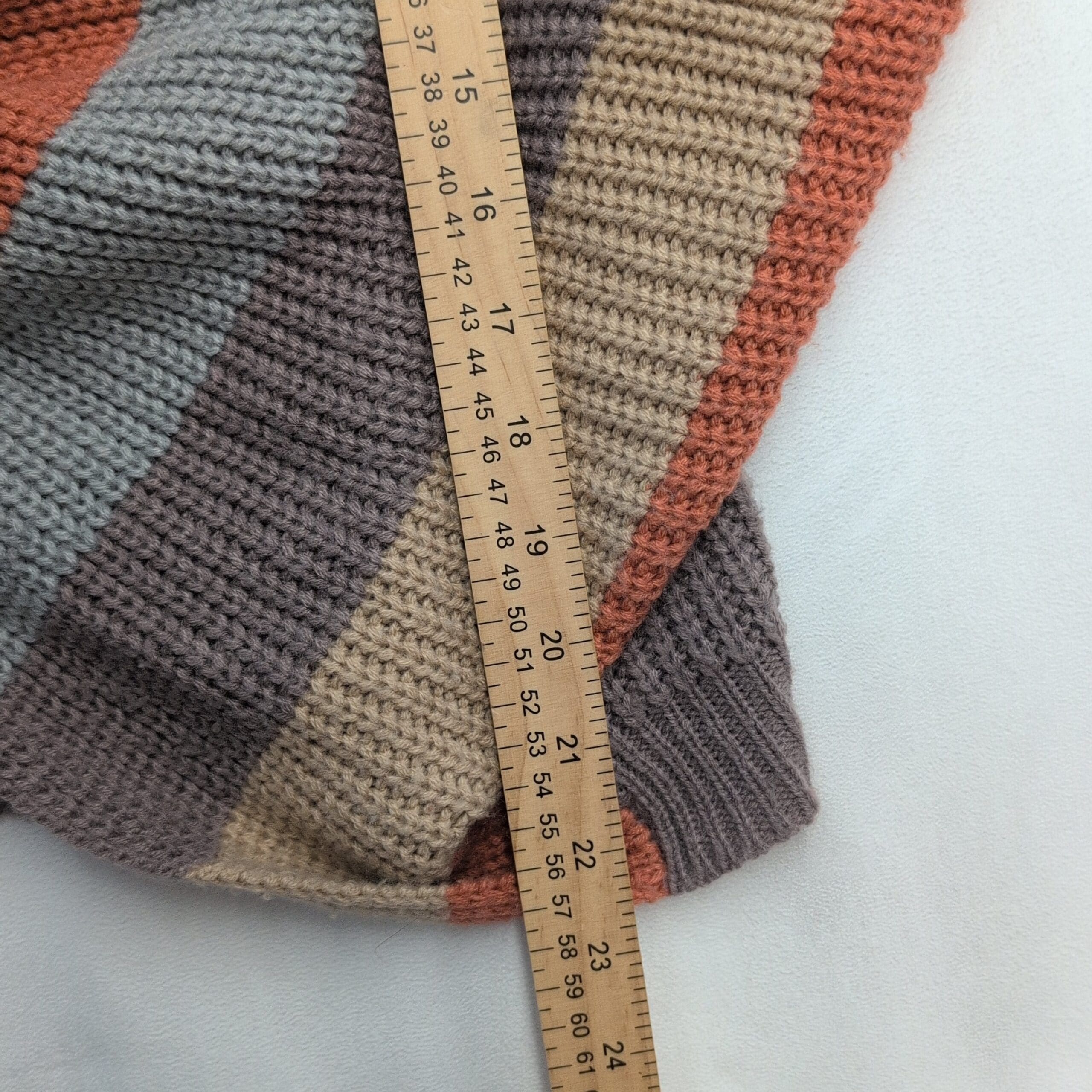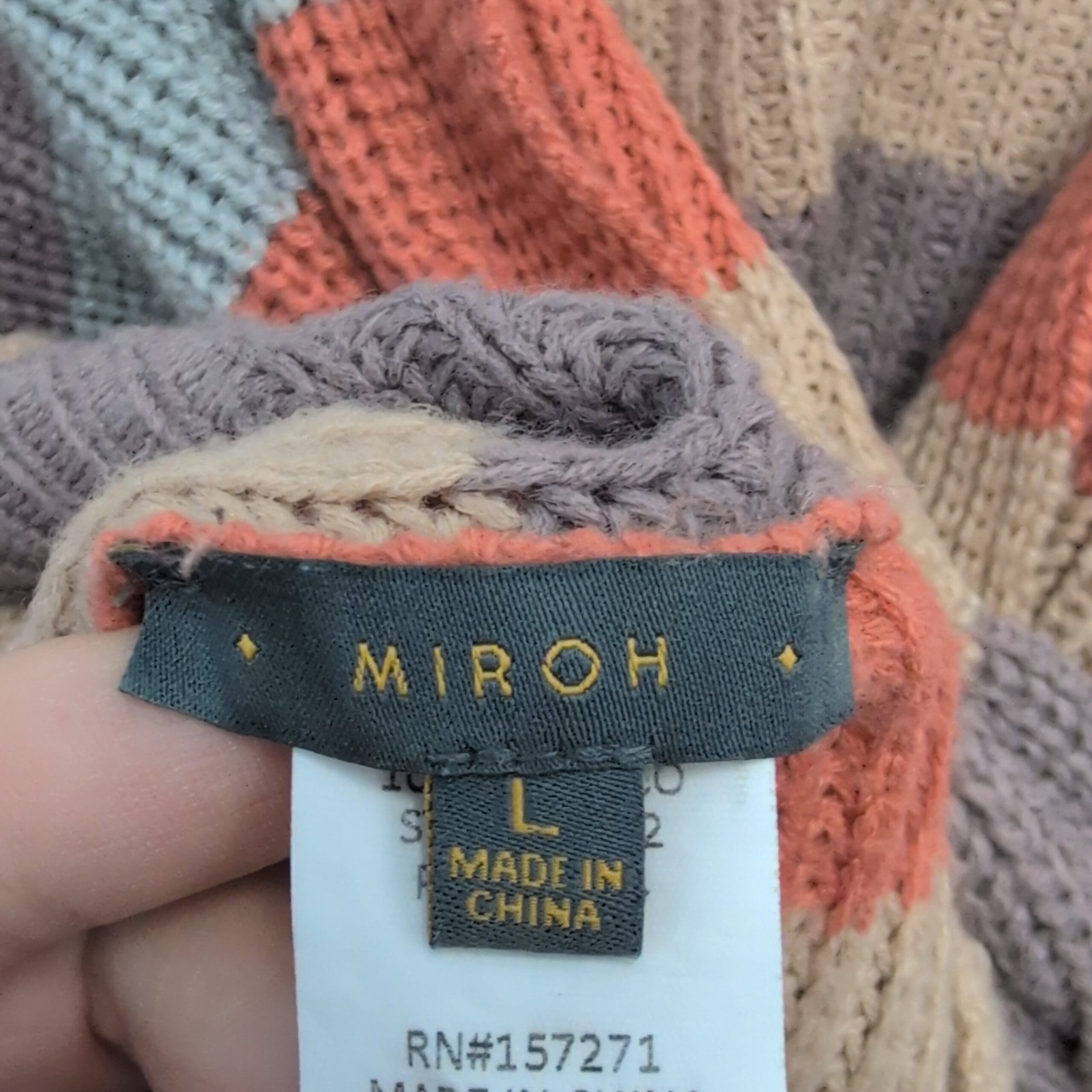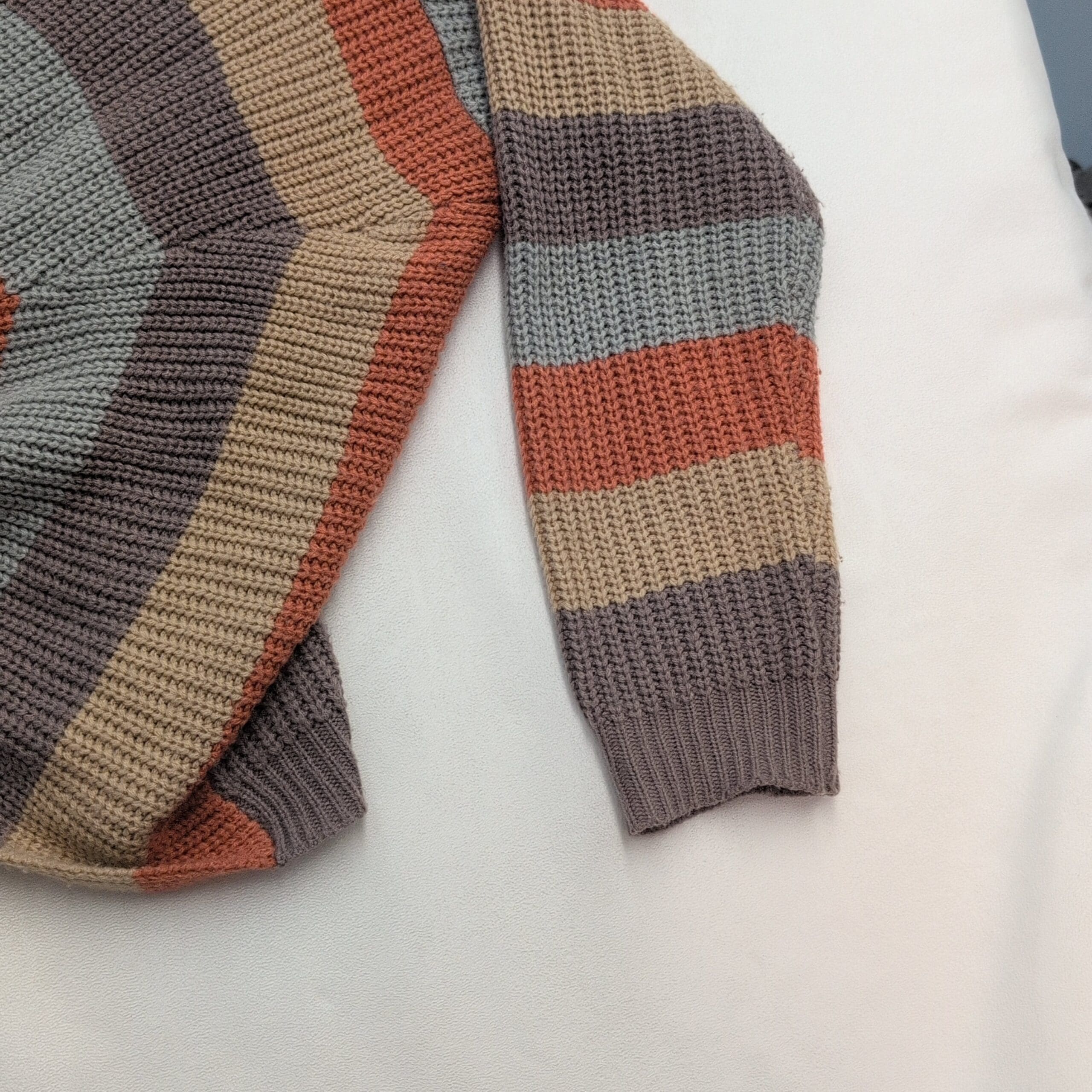 Lightweight knit Miroh women’s sweater in size L with a fashionable twist/knot front and cropped silhouette. Wide horizontal stripes in rust, light blue, beige and taupe; long sleeves with ribbed cuffs and a ribbed hem. Excellent used condition — free of major rips, tears, stains, or flaws; normal light wear consistent with prior use. Stylish for layering over high-waist jeans or skirts.