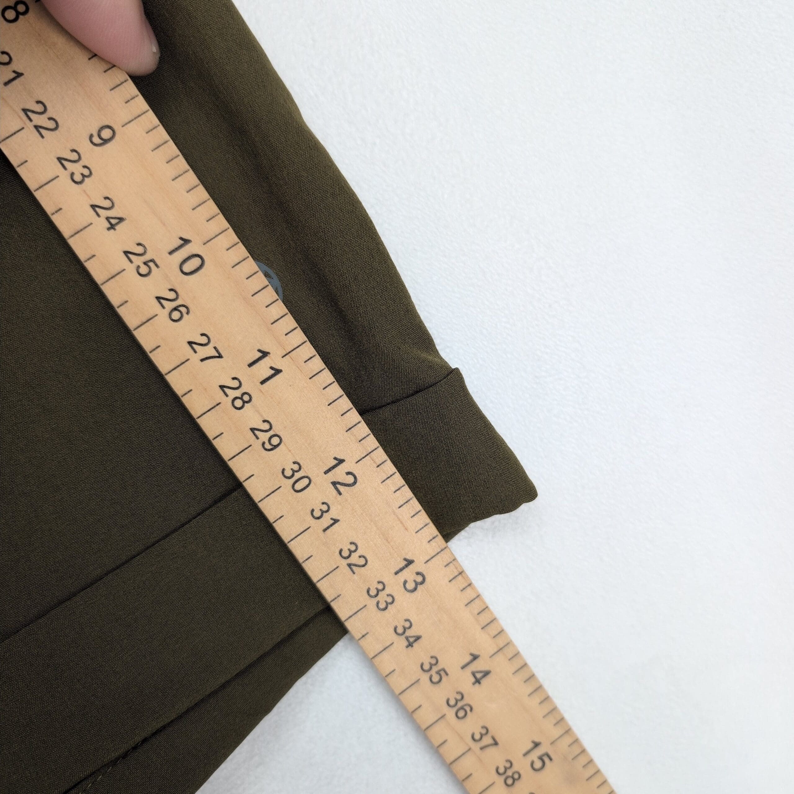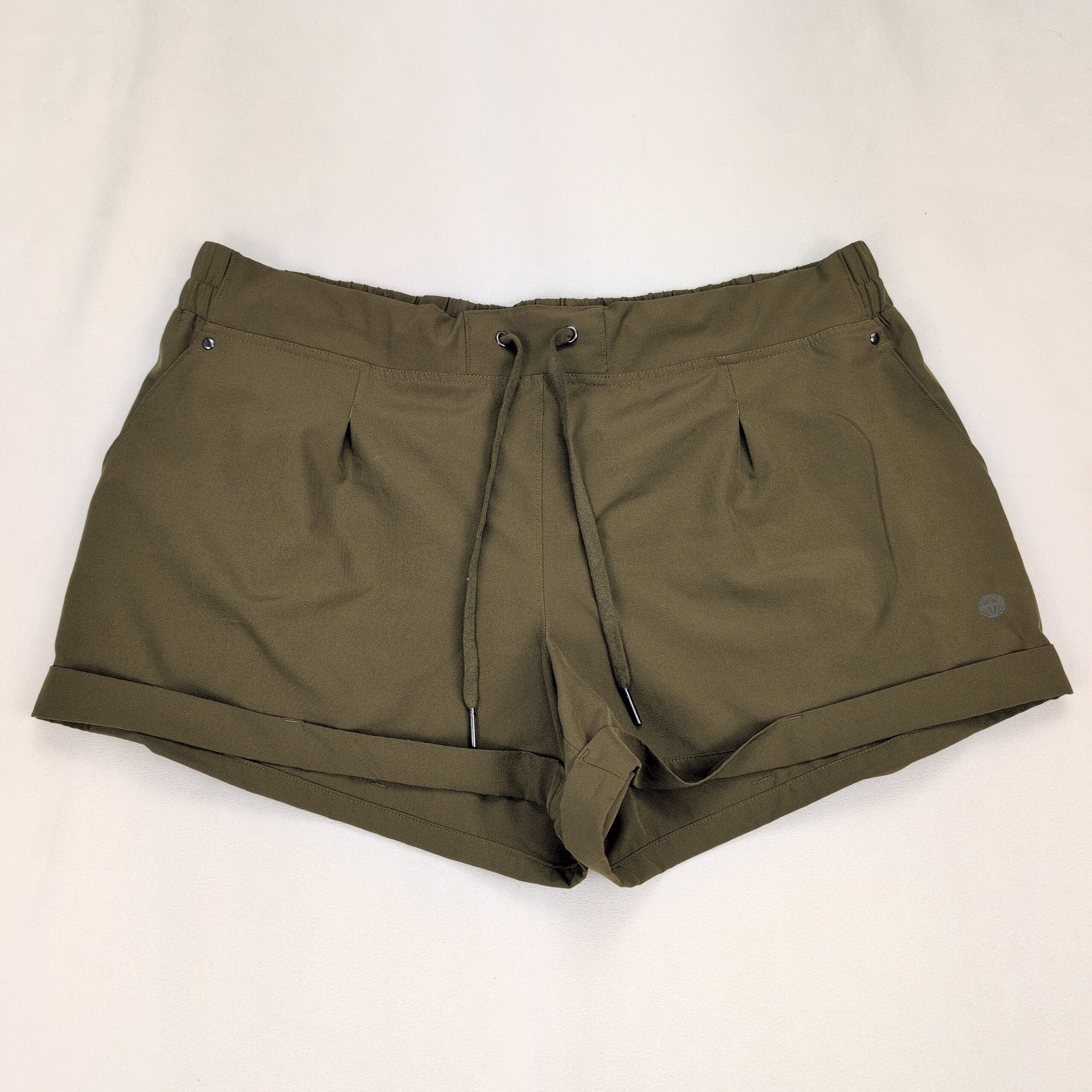 Mondetta women’s olive drawstring shorts in size XXL. Elasticized waistband with adjustable drawstring and metal aglets, soft cuffed hem, subtle front pleats, and convenient front pockets. Small Mondetta logo at lower hem. Casual active style that works for everyday wear or light workouts.