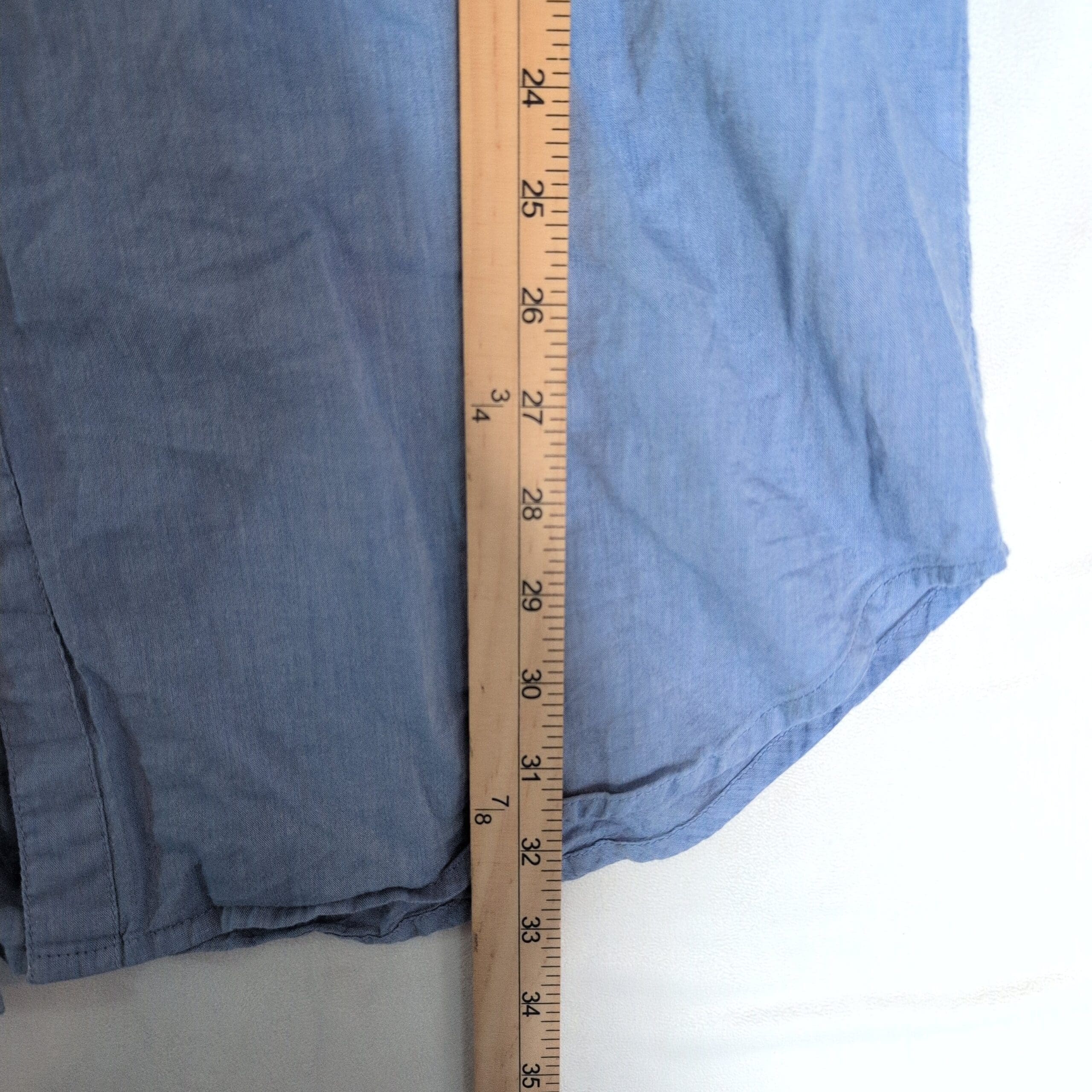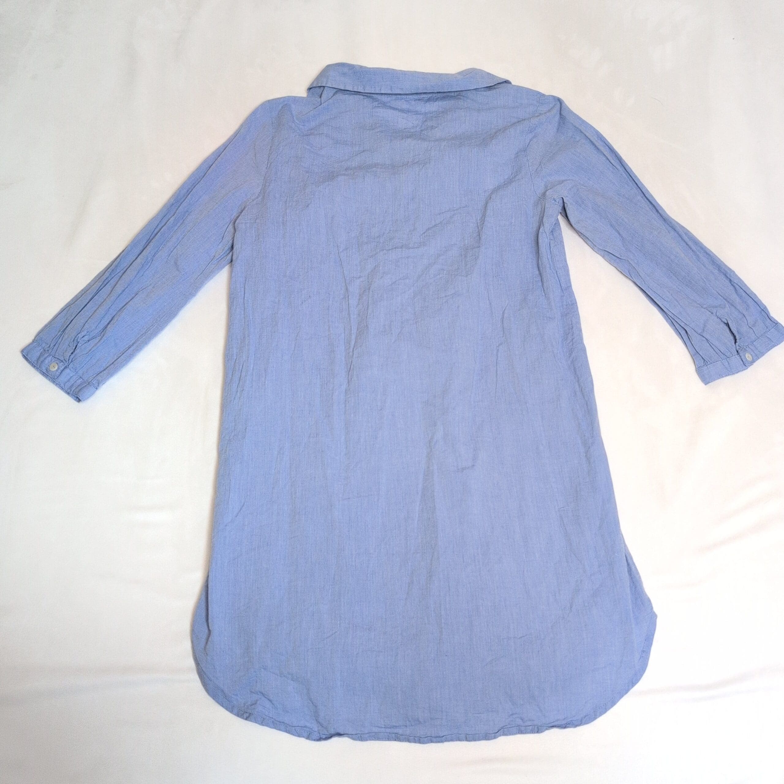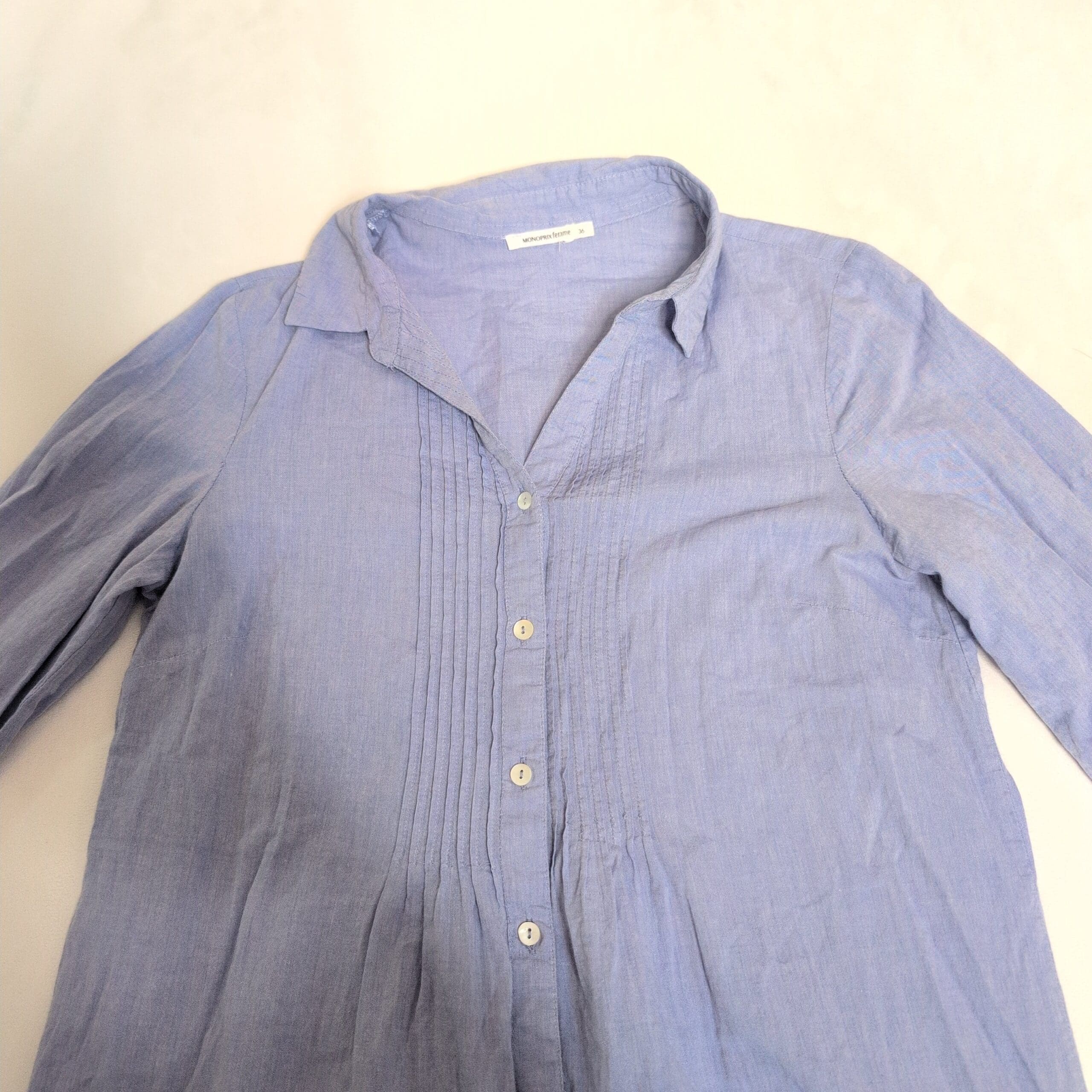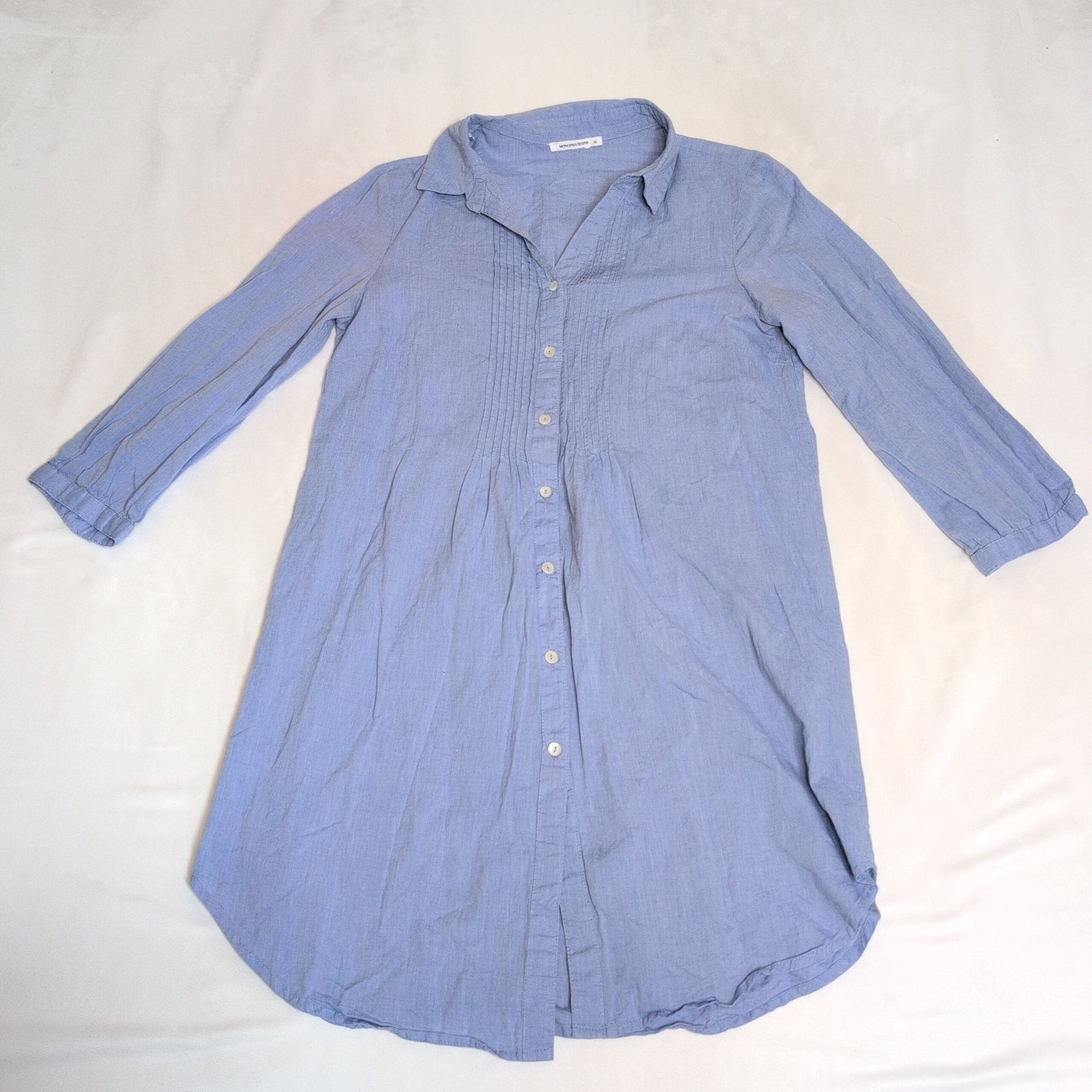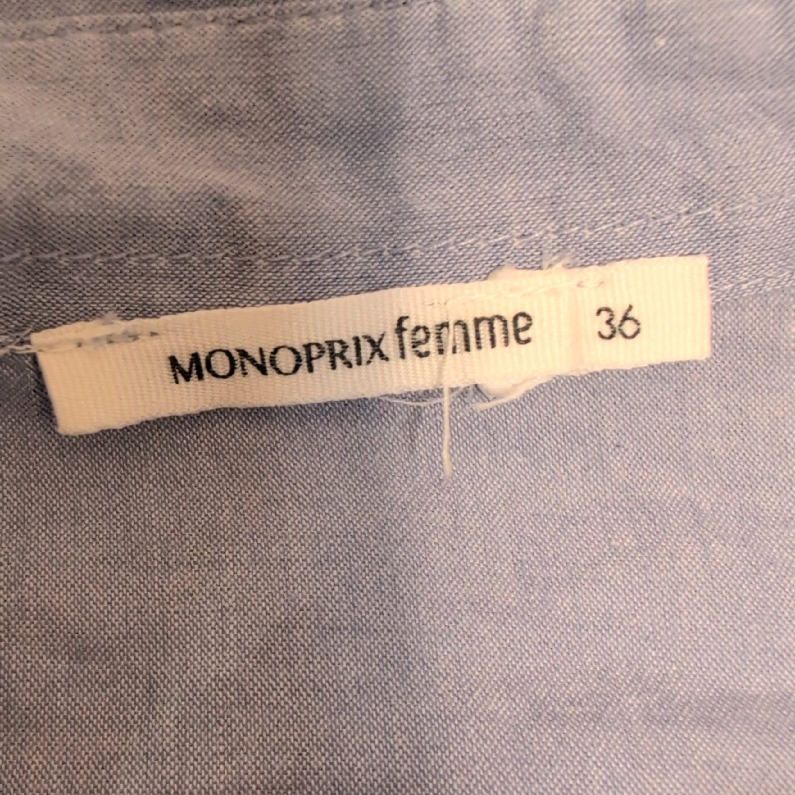 Monoprix Femme blue long-sleeve button-front shirtdress in size S (EU 36). Lightweight, relaxed tunic silhouette with subtle pintuck detailing at the bodice, classic collar, functional front buttons, and three-quarter sleeves with cuffs. Slightly curved hem for an easy, casual look.
