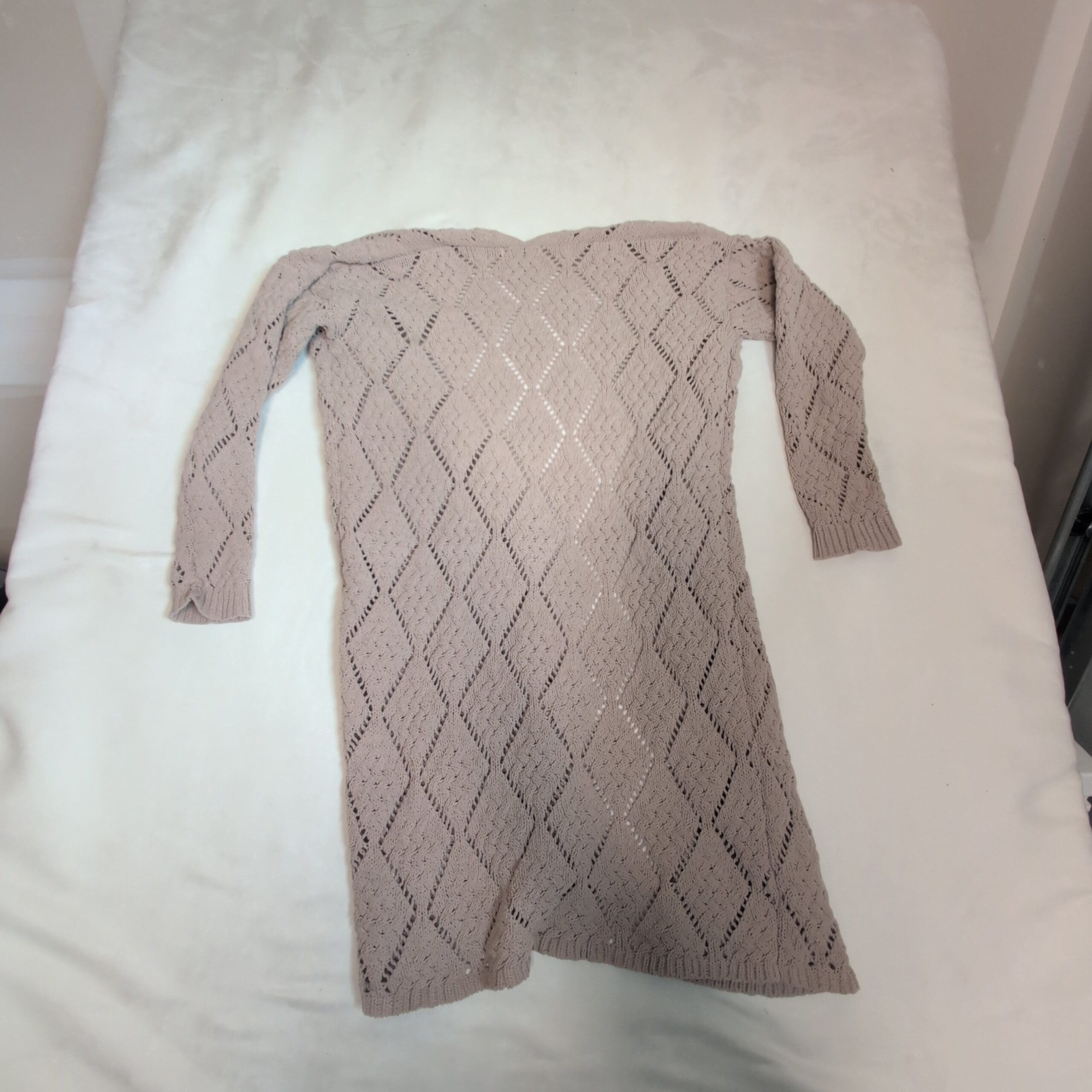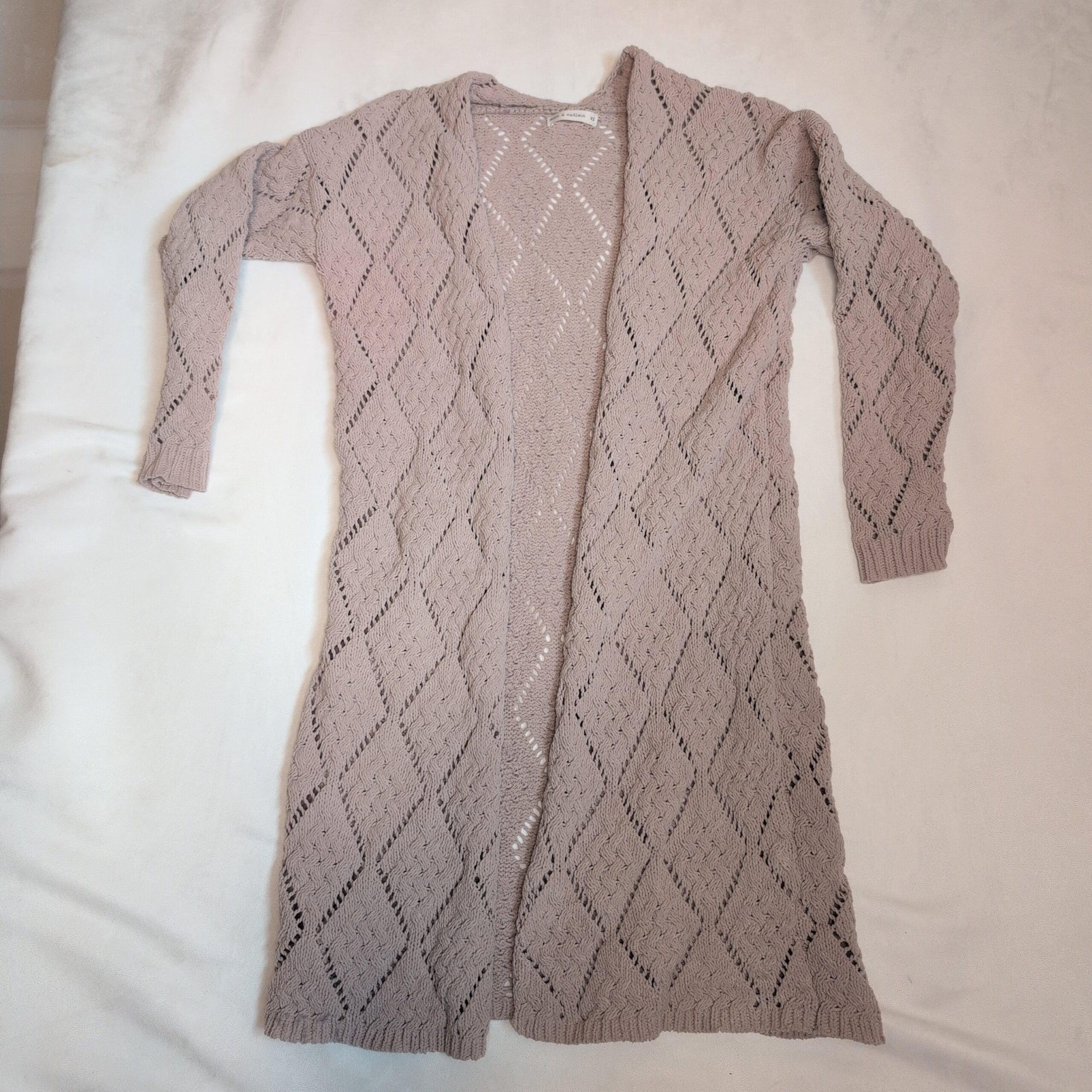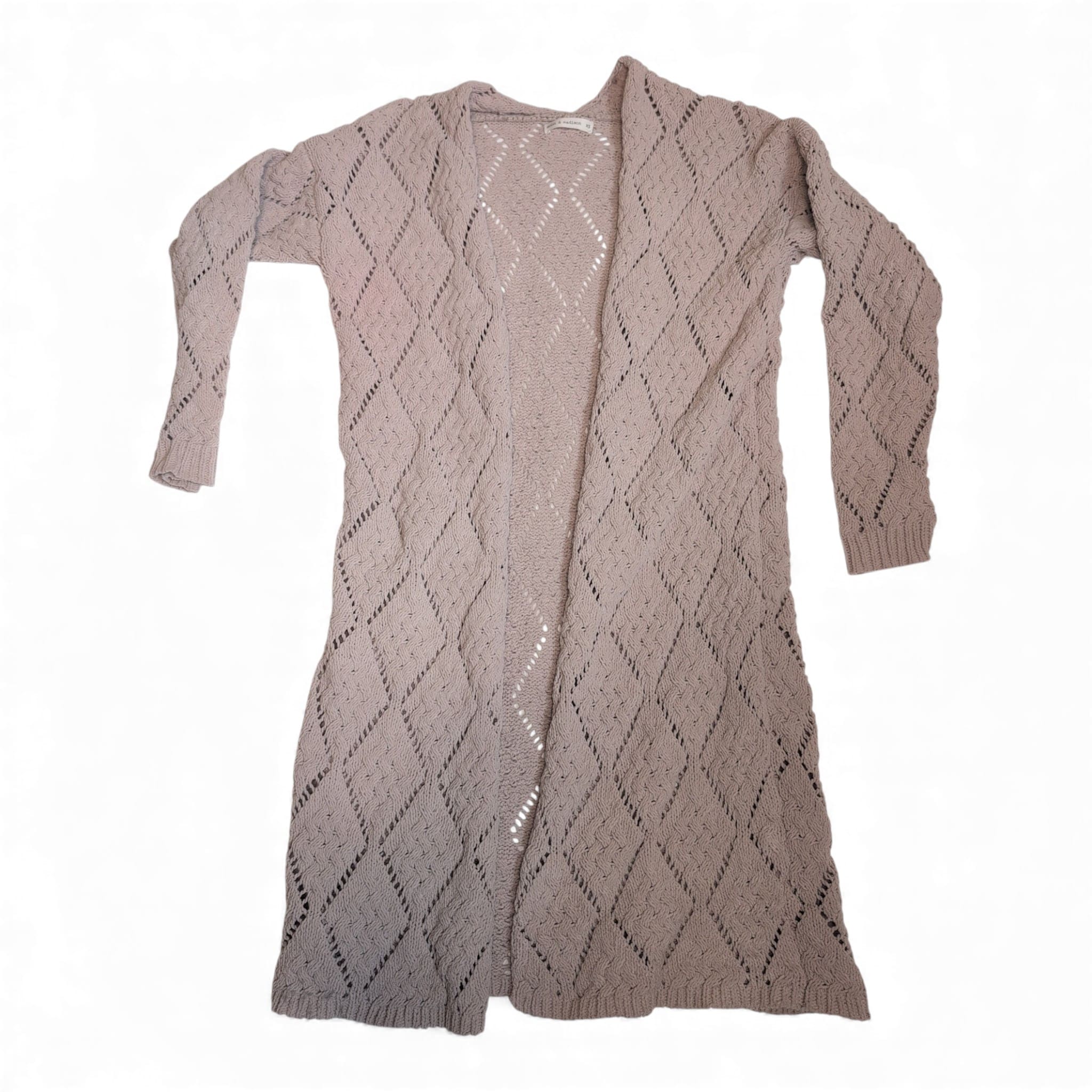 Moon and Madison tan open-front long cardigan in size XS. Lightweight diamond-pattern knit with ribbed cuffs and hem — a versatile duster silhouette that layers beautifully over tees, dresses, or work outfits. Soft, breathable knit with an elegant textured look. Excellent pre-owned condition with minimal signs of wear. True to size XS. Care: gentle wash and lay flat to dry.