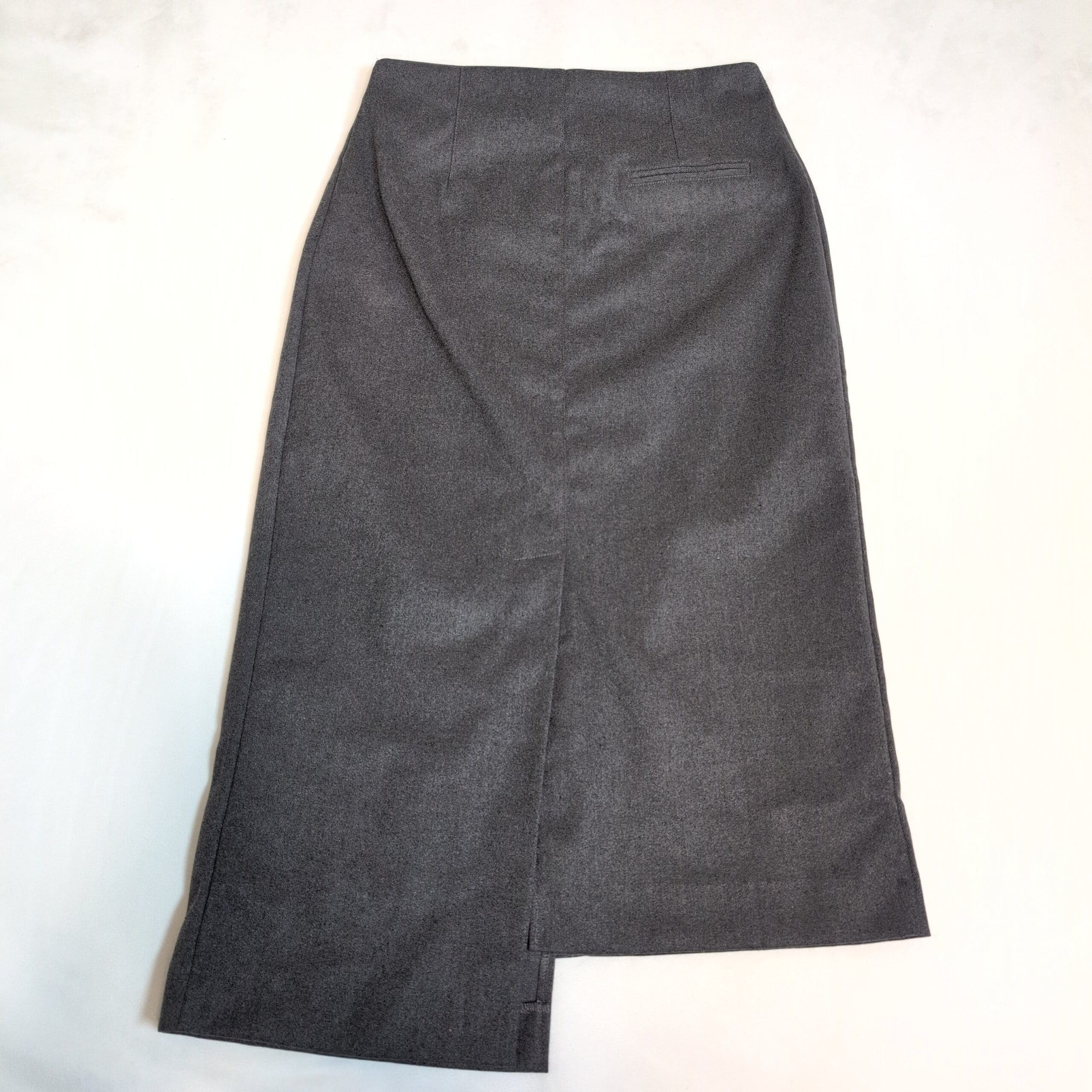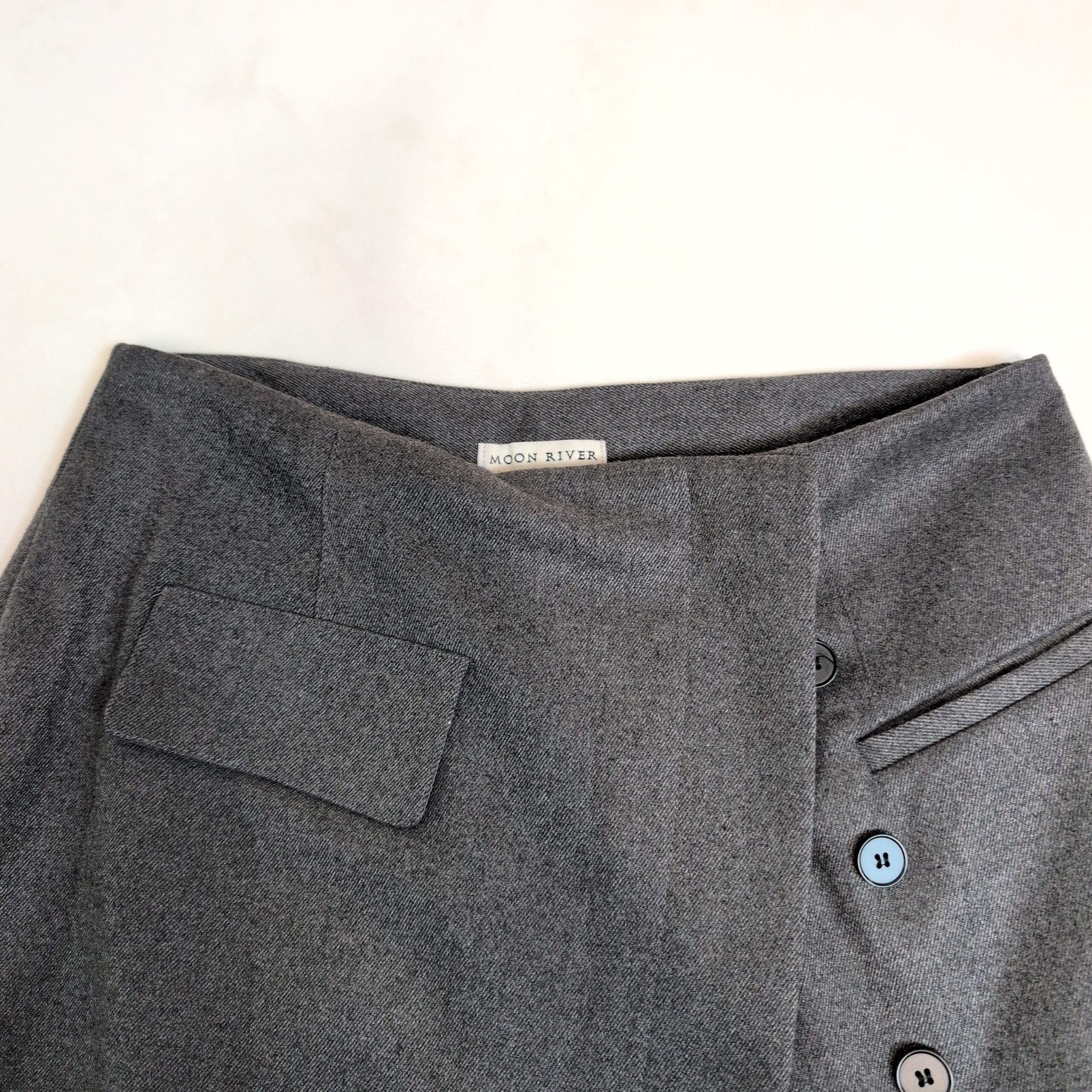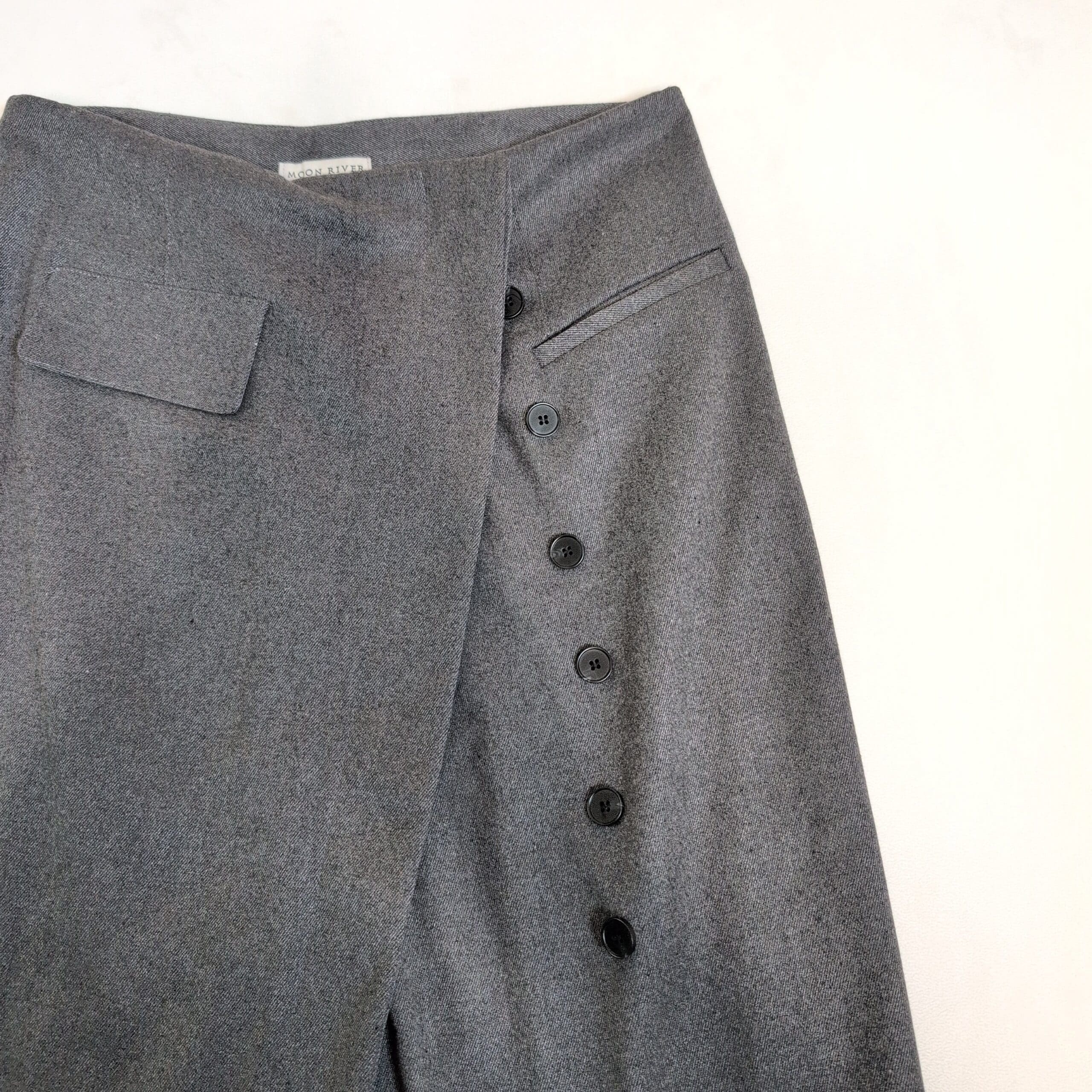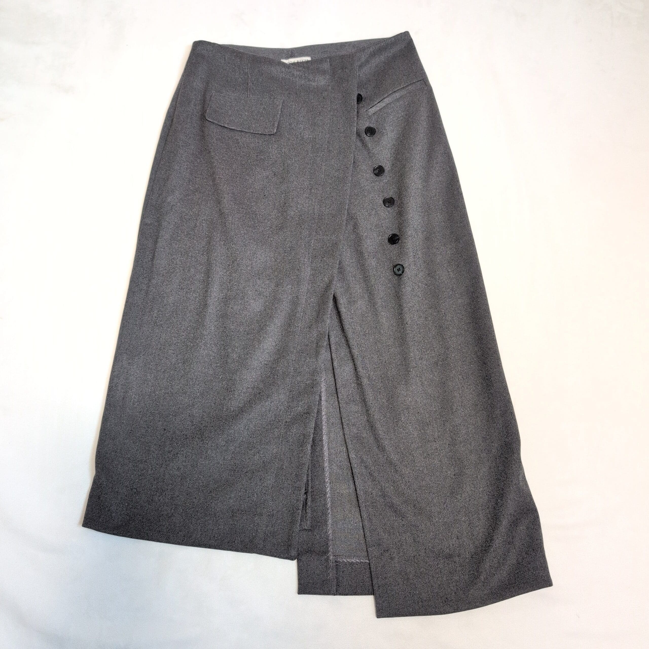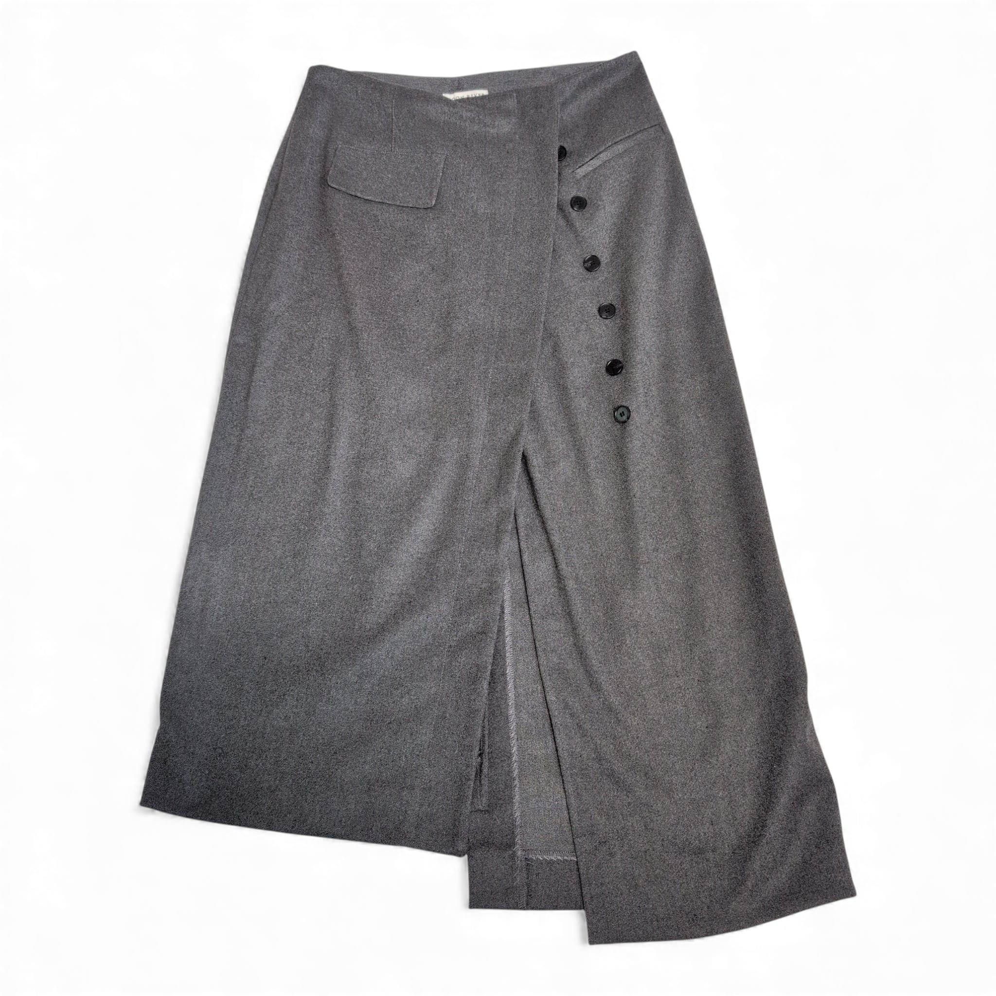 Moon Rover gray midi skirt in size M. Features an asymmetric button-front detail, a front slit for ease of movement, and a flap pocket at the waist. Tailored silhouette that transitions easily from office to weekend styling. Versatile neutral gray for effortless pairing.