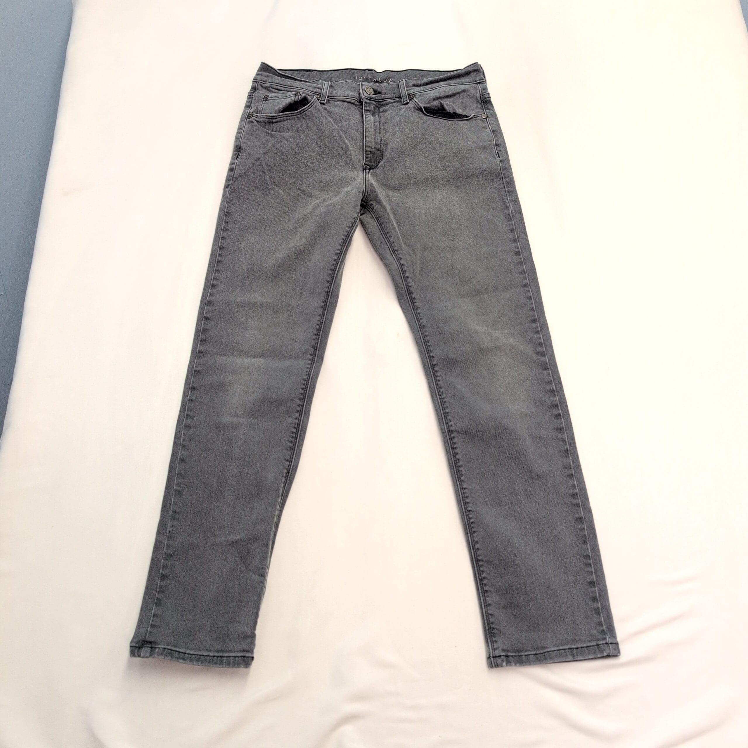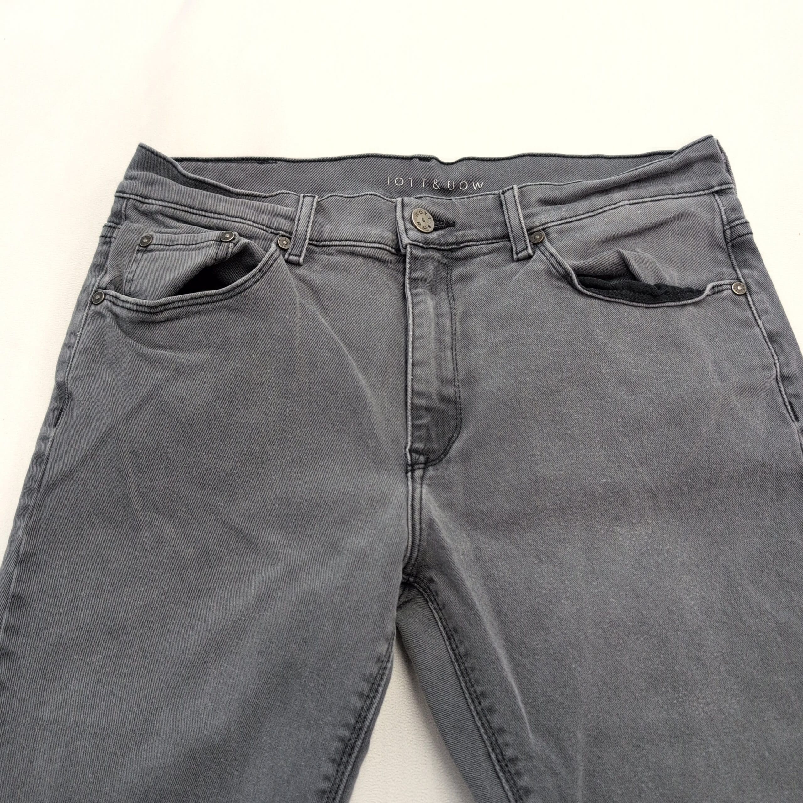 Mot & Bow slim-straight men’s jeans in a versatile gray wash. Size: Waist 31 (standard). Clean, classic silhouette that works well dressed up or casual. Light, even fading and subtle whiskering from normal wear visible in photos.