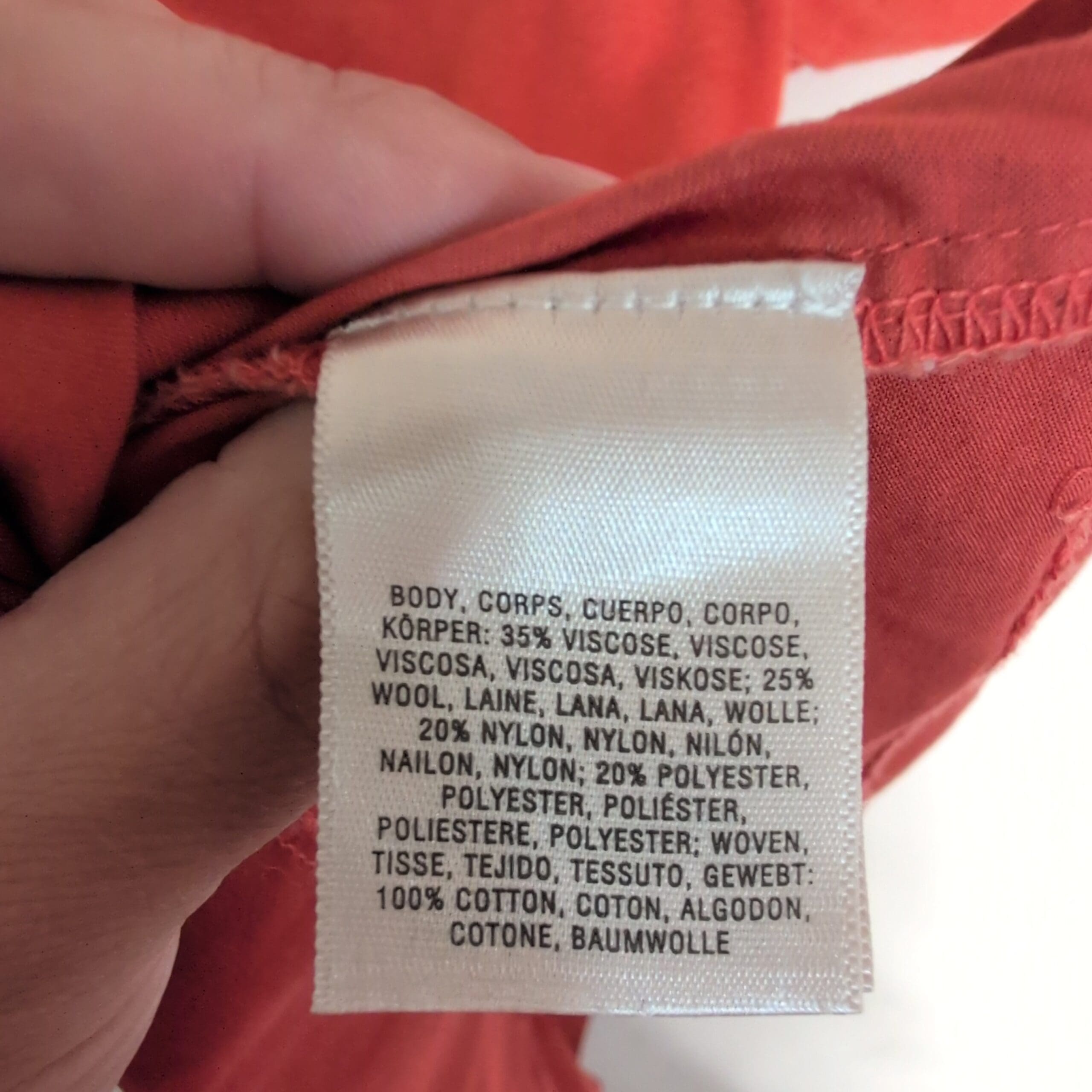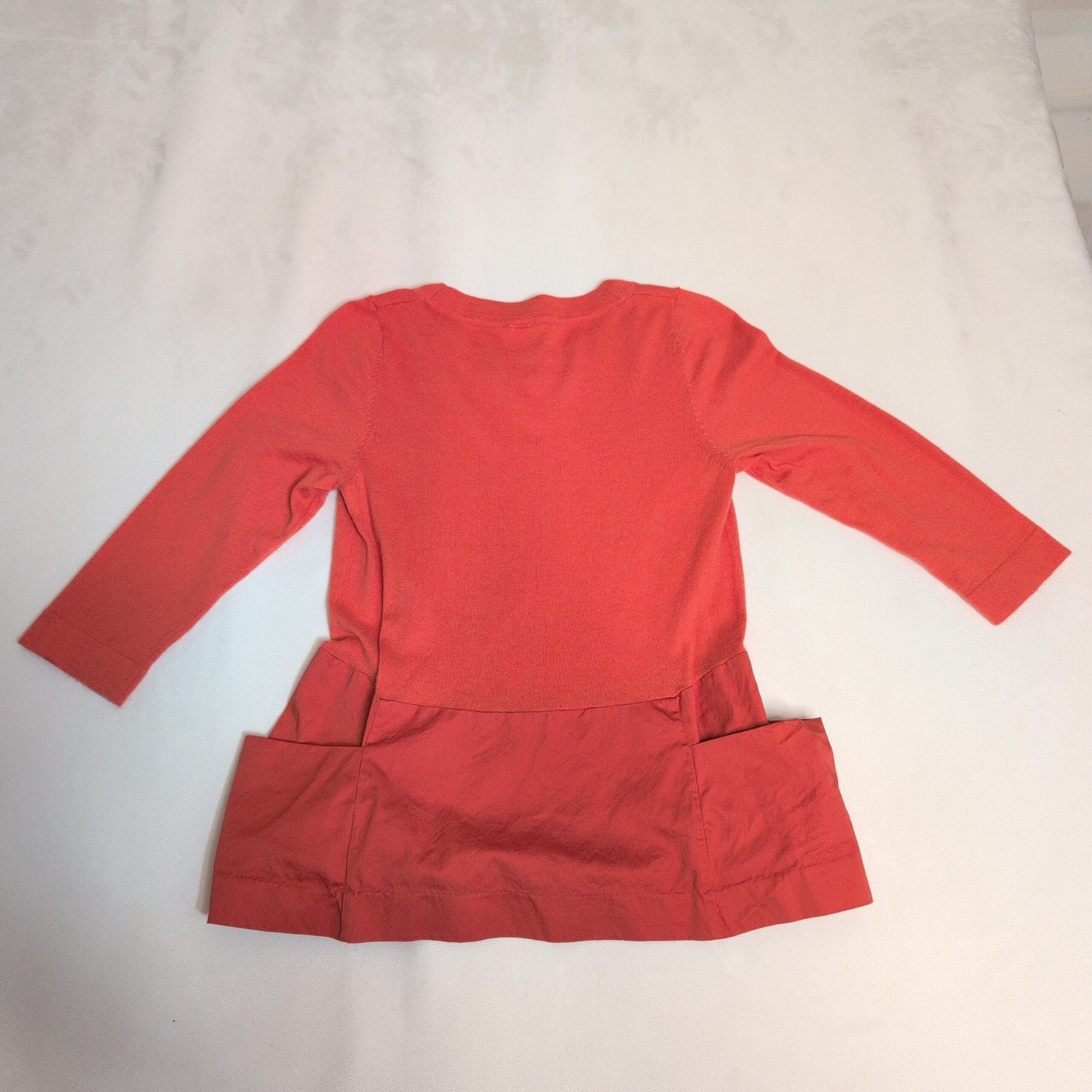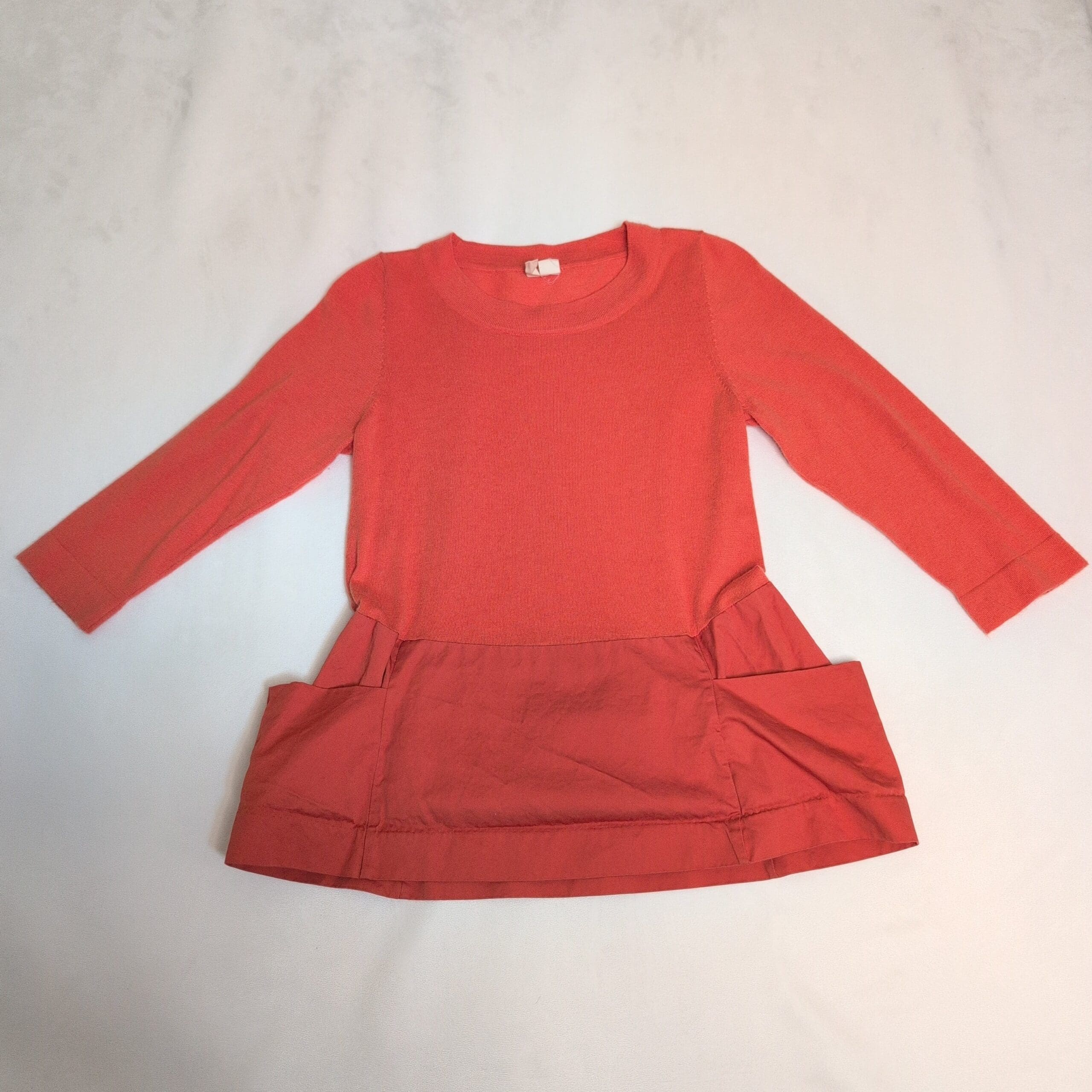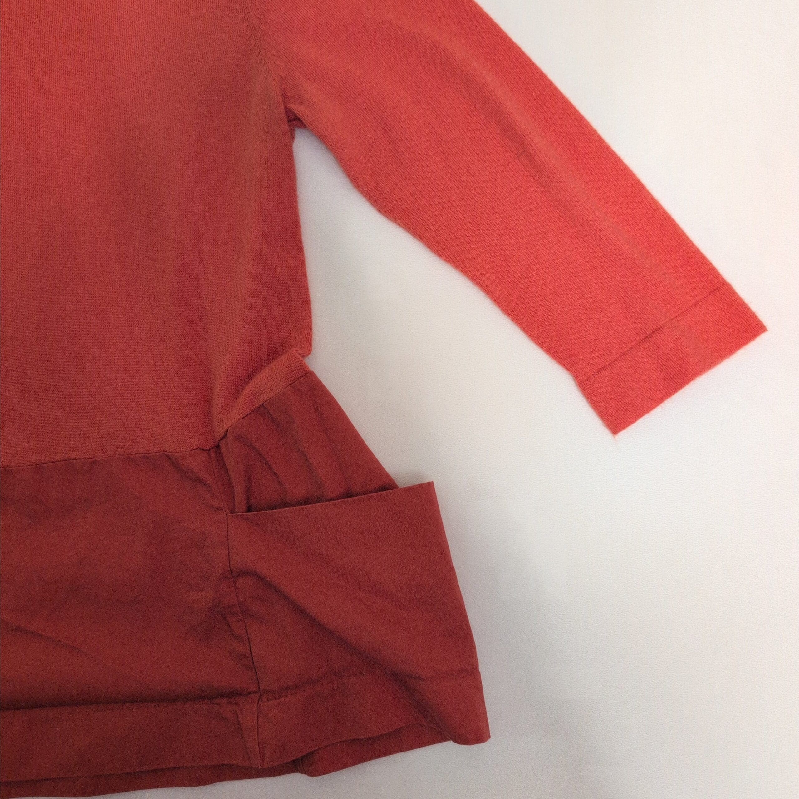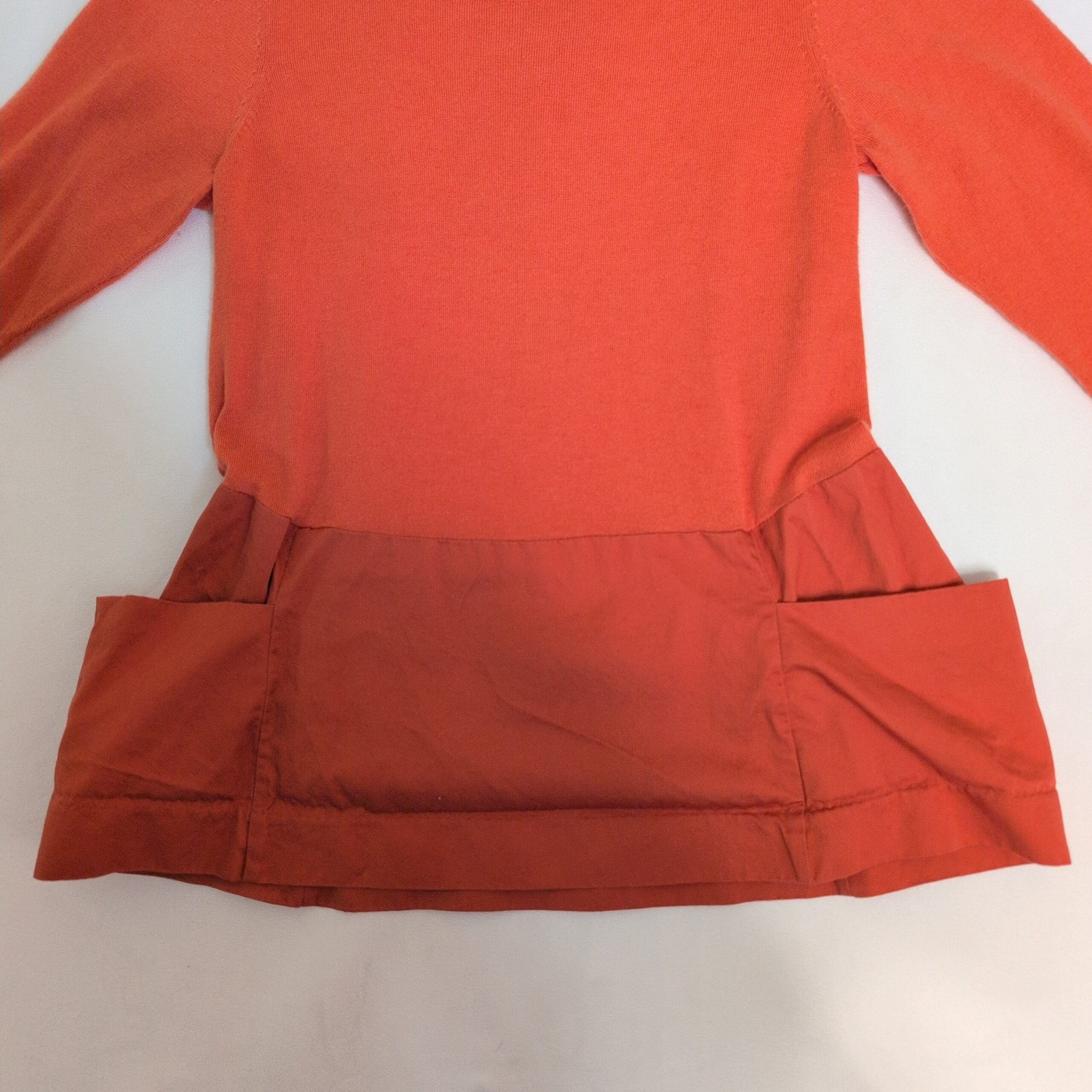 Moth women’s sweater in a vibrant orange, size M. Knit crew/scoop neckline with long sleeves and a peplum-style woven hem that creates a layered look. Features integrated side pockets on the lower skirt panel for added interest and functionality. Lightweight-to-medium weight knit ideal for transitional seasons; pairs well with jeans, leggings, or skirts for casual to polished outfits.