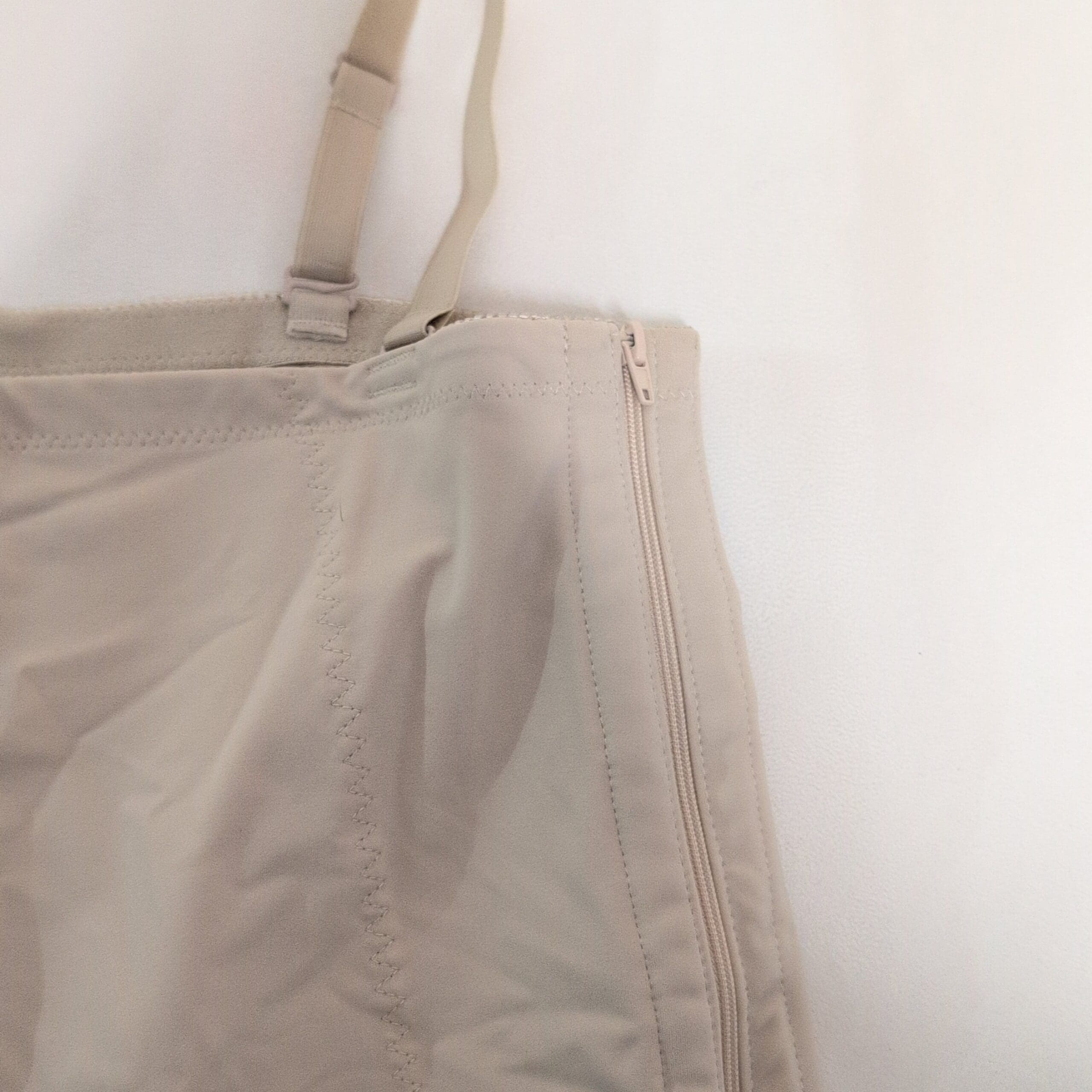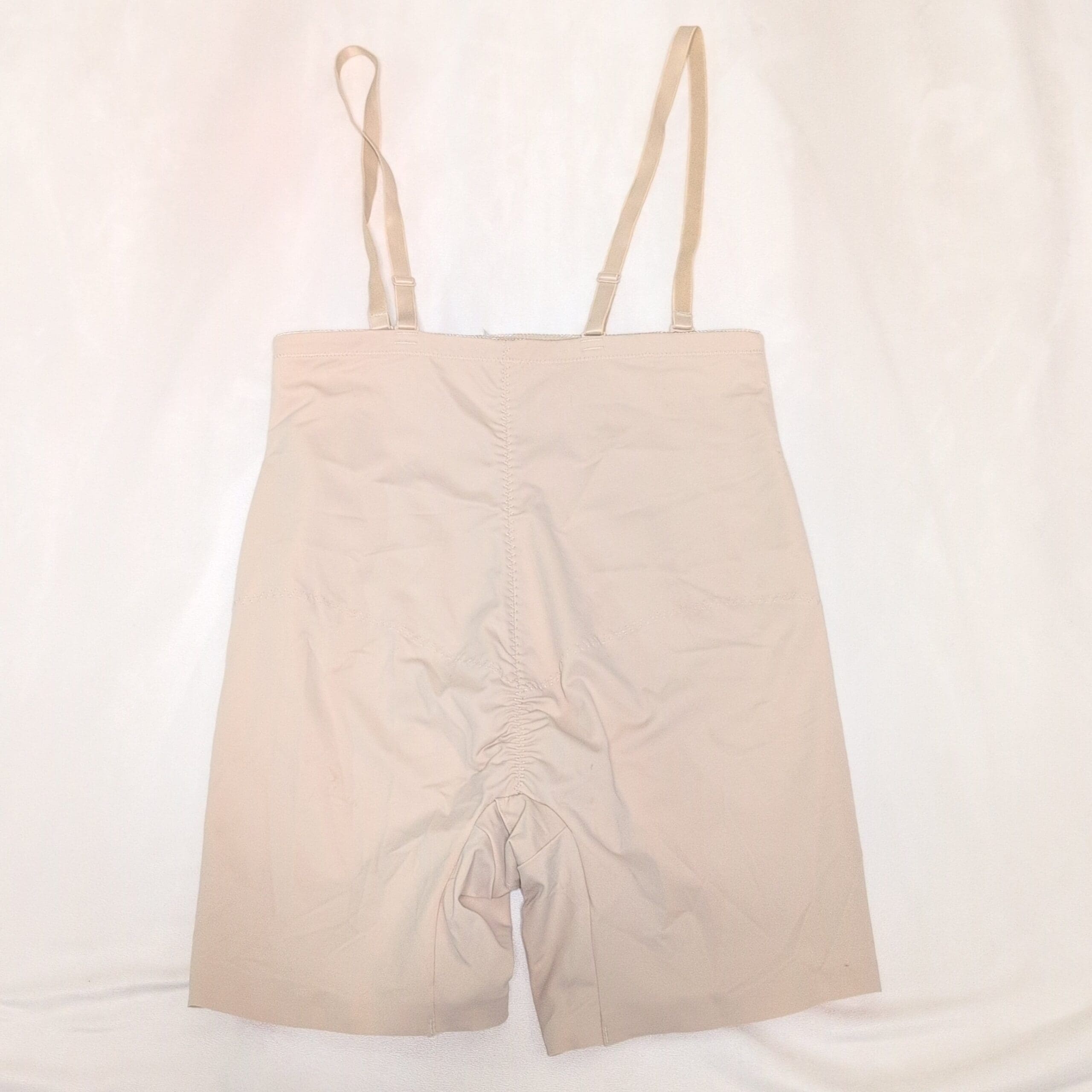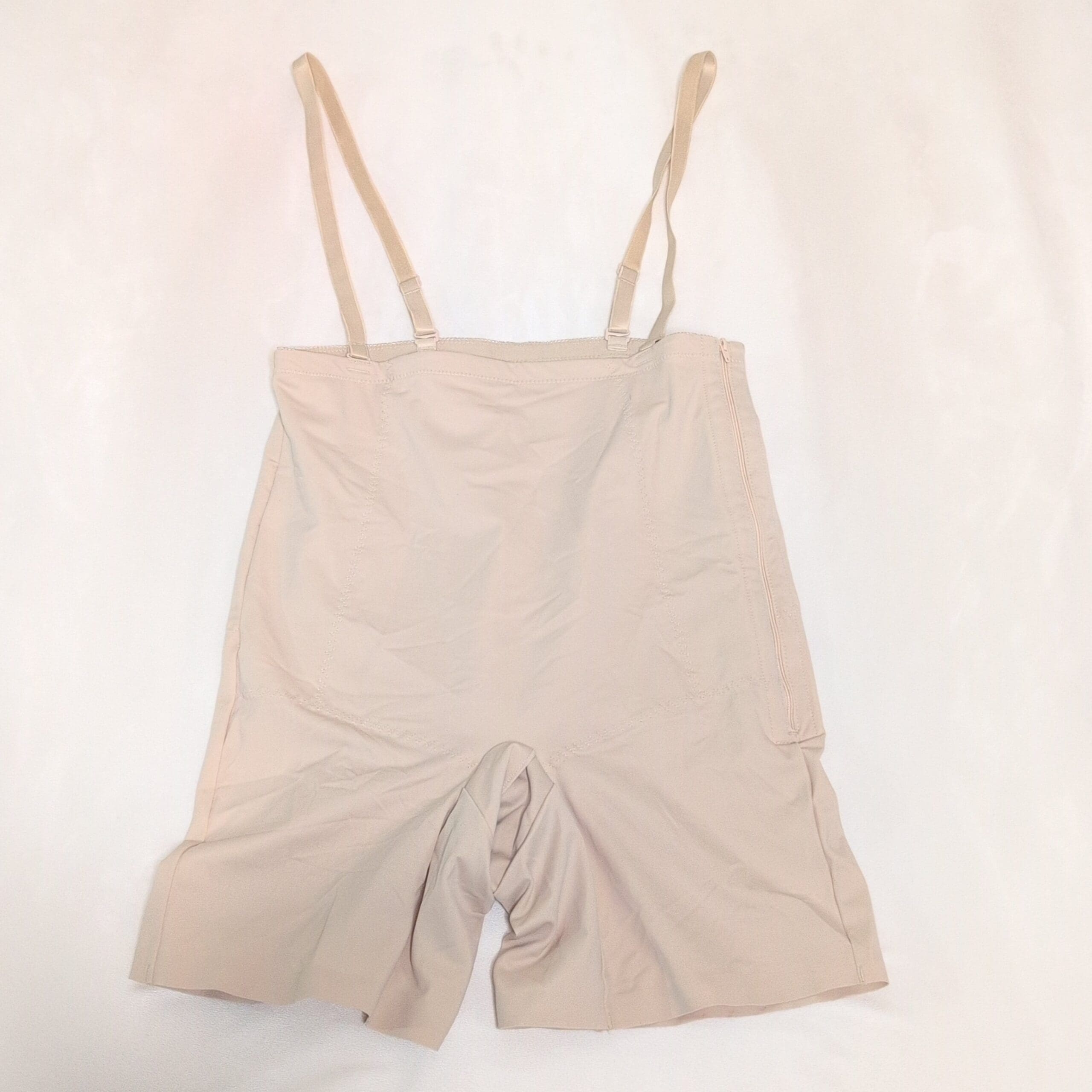 Motif Medical tan postpartum compression shapewear romper in Size L. Designed for postnatal support, this high-waist, mid-thigh garment provides firm abdominal and hip compression to aid recovery. Features adjustable shoulder straps and a side zipper for easier on/off. Made from breathable, stretch fabric for comfortable all-day wear.