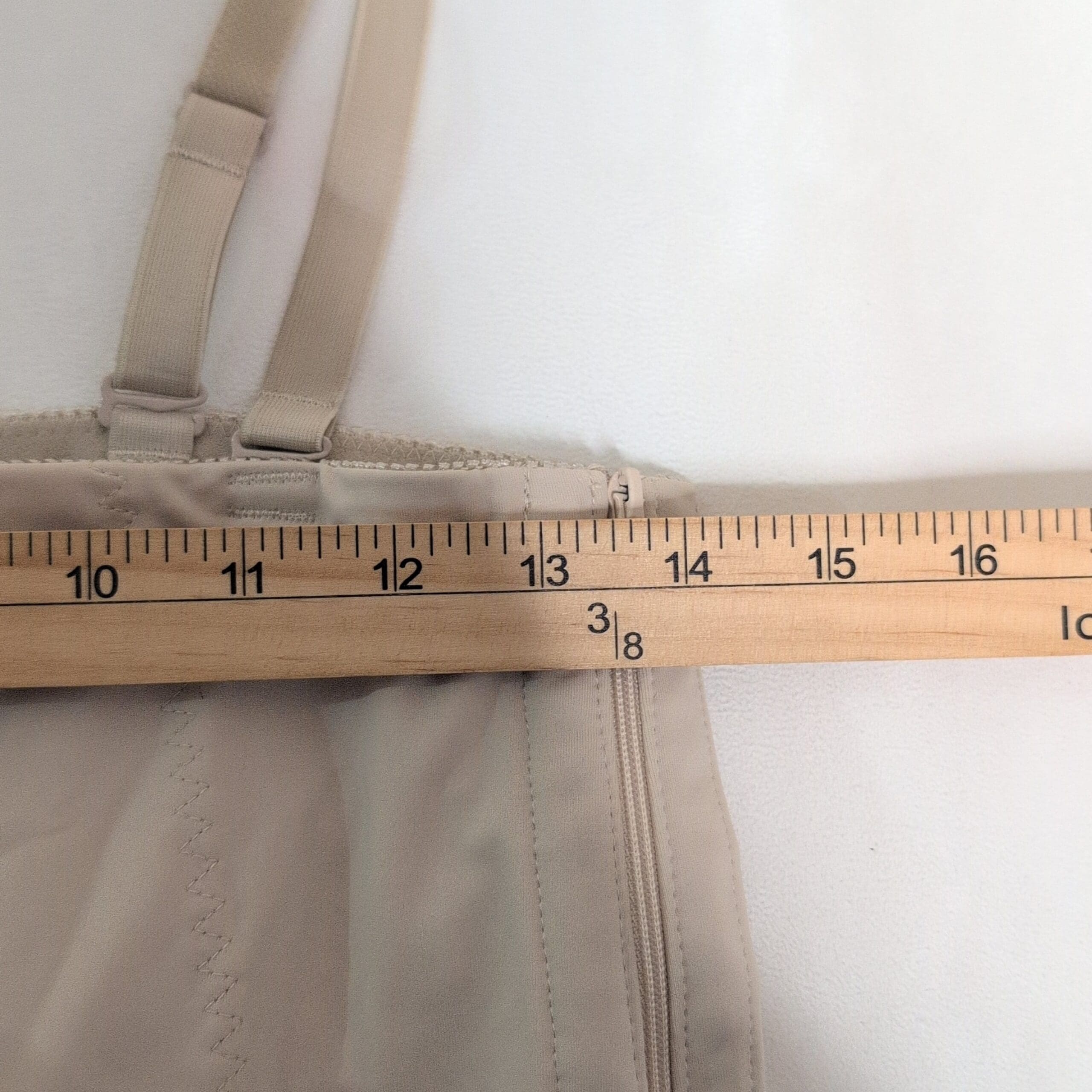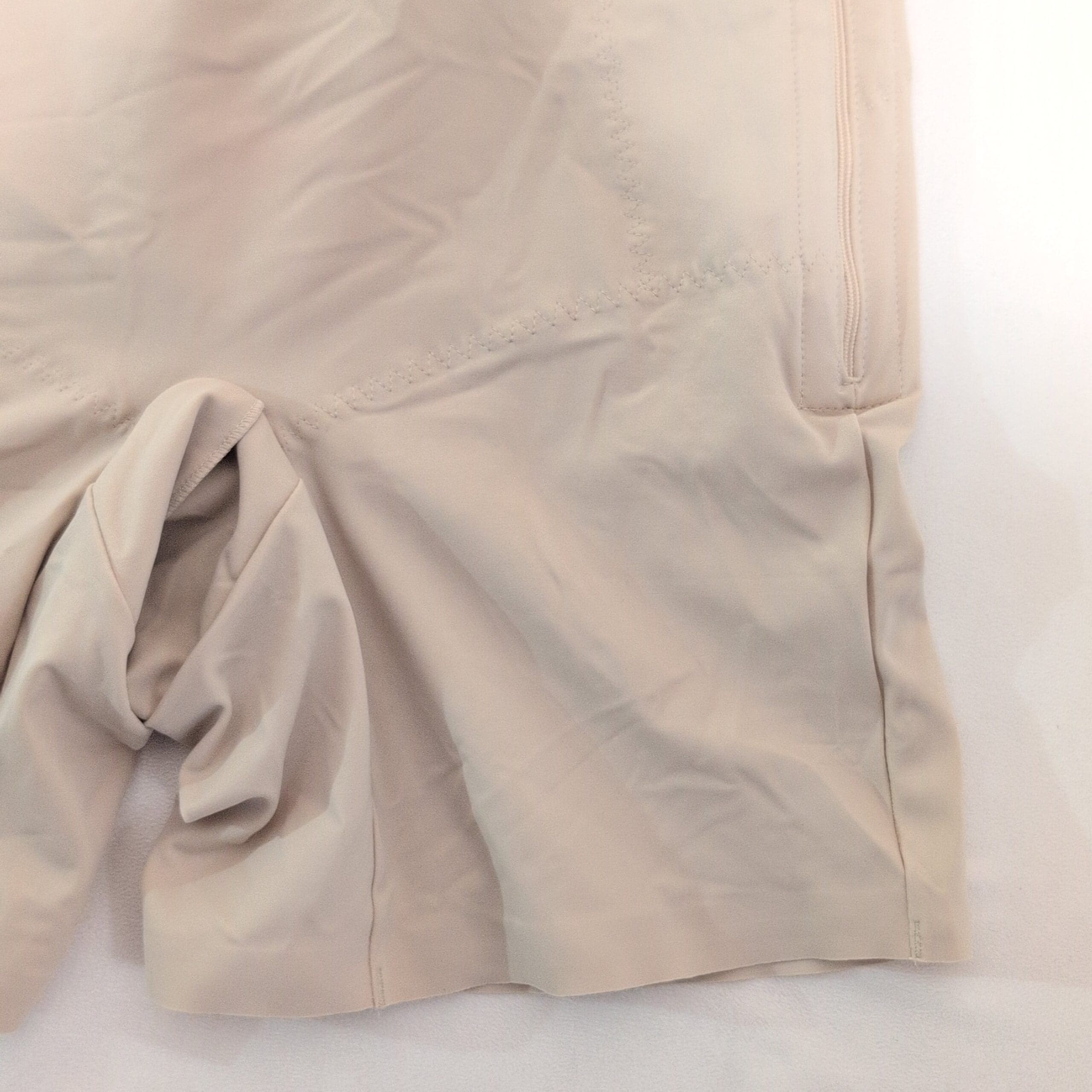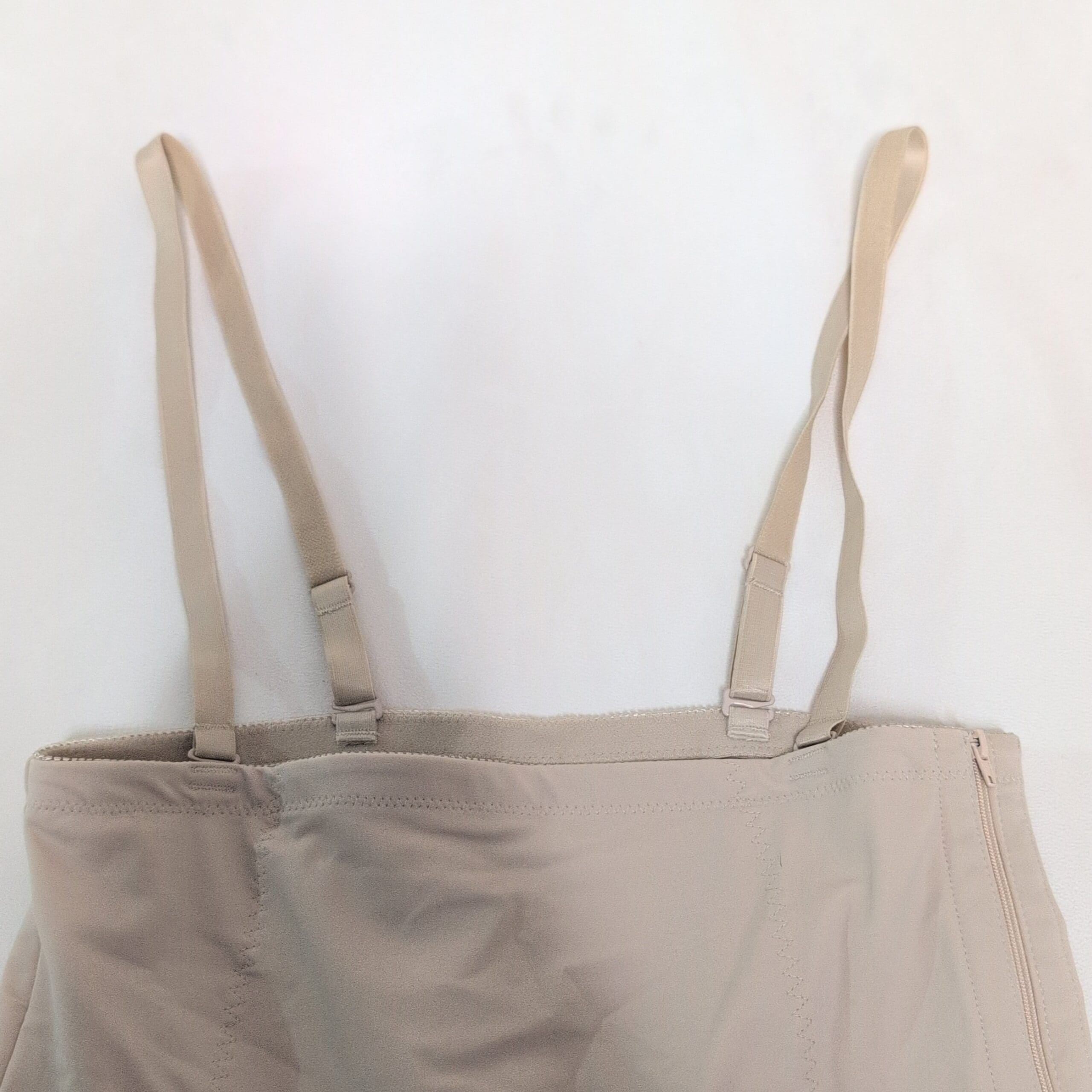Motif Medical tan postpartum compression shapewear romper in Size L. Designed for postnatal support, this high-waist, mid-thigh garment provides firm abdominal and hip compression to aid recovery. Features adjustable shoulder straps and a side zipper for easier on/off. Made from breathable, stretch fabric for comfortable all-day wear.