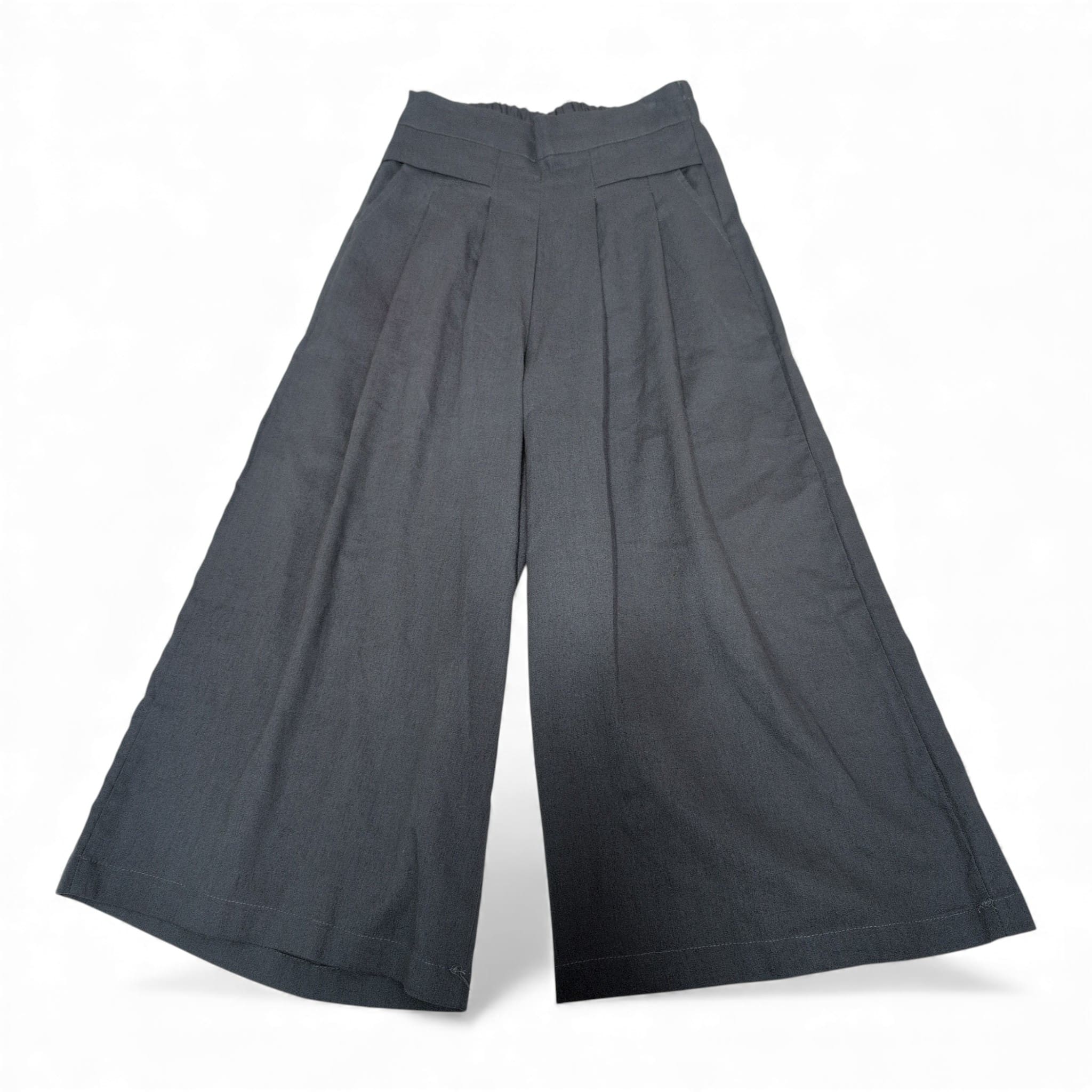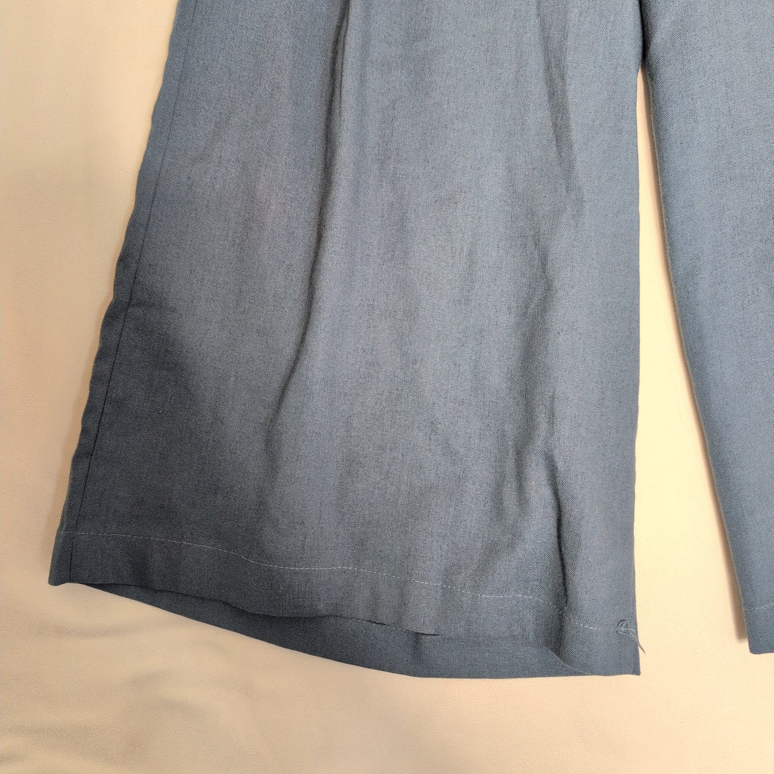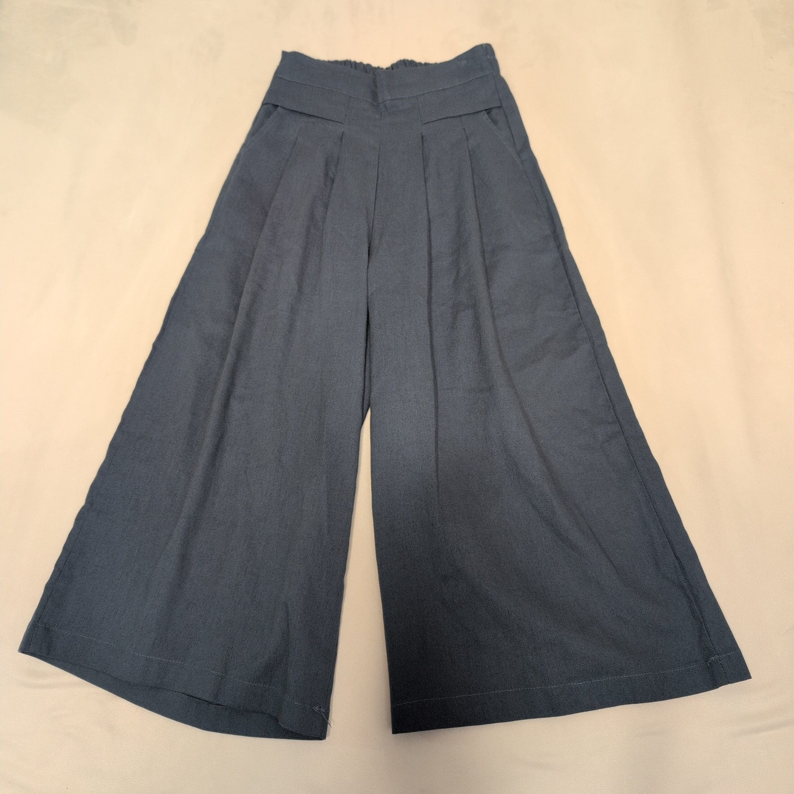 Mu Mianxiu women’s wide-leg pants in blue, size S. Features a high-rise waistband with subtle front pleats and a partially elasticized back for added comfort. Wide cropped legs provide a breezy, elegant drape—great for casual days or smart-casual outfits. Includes side pockets and a clean hemline. Lightweight woven fabric with a soft hand; please review photos for texture and exact color. Pre-owned—see photos for condition.