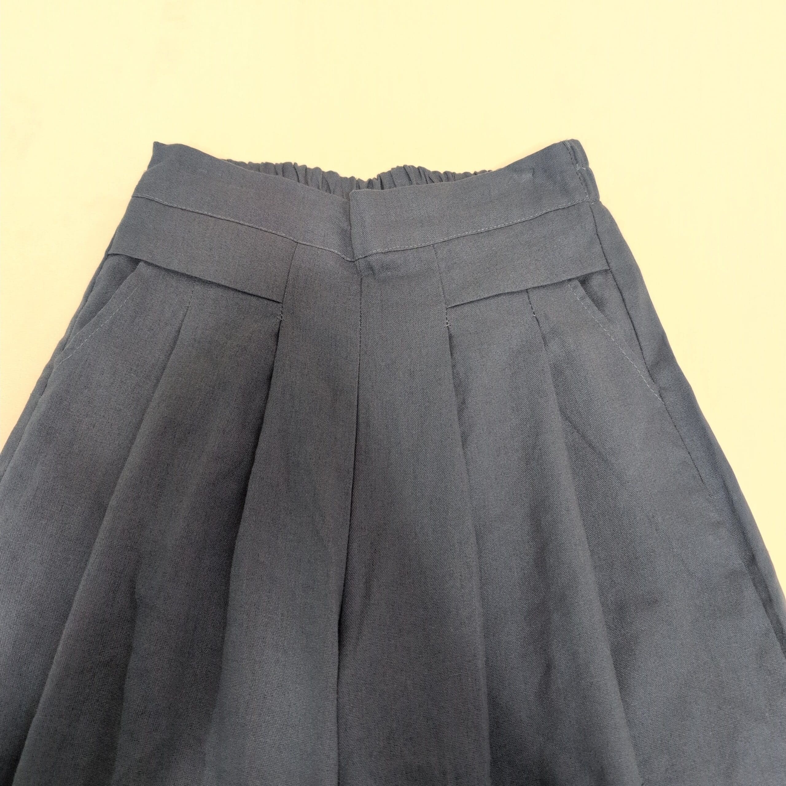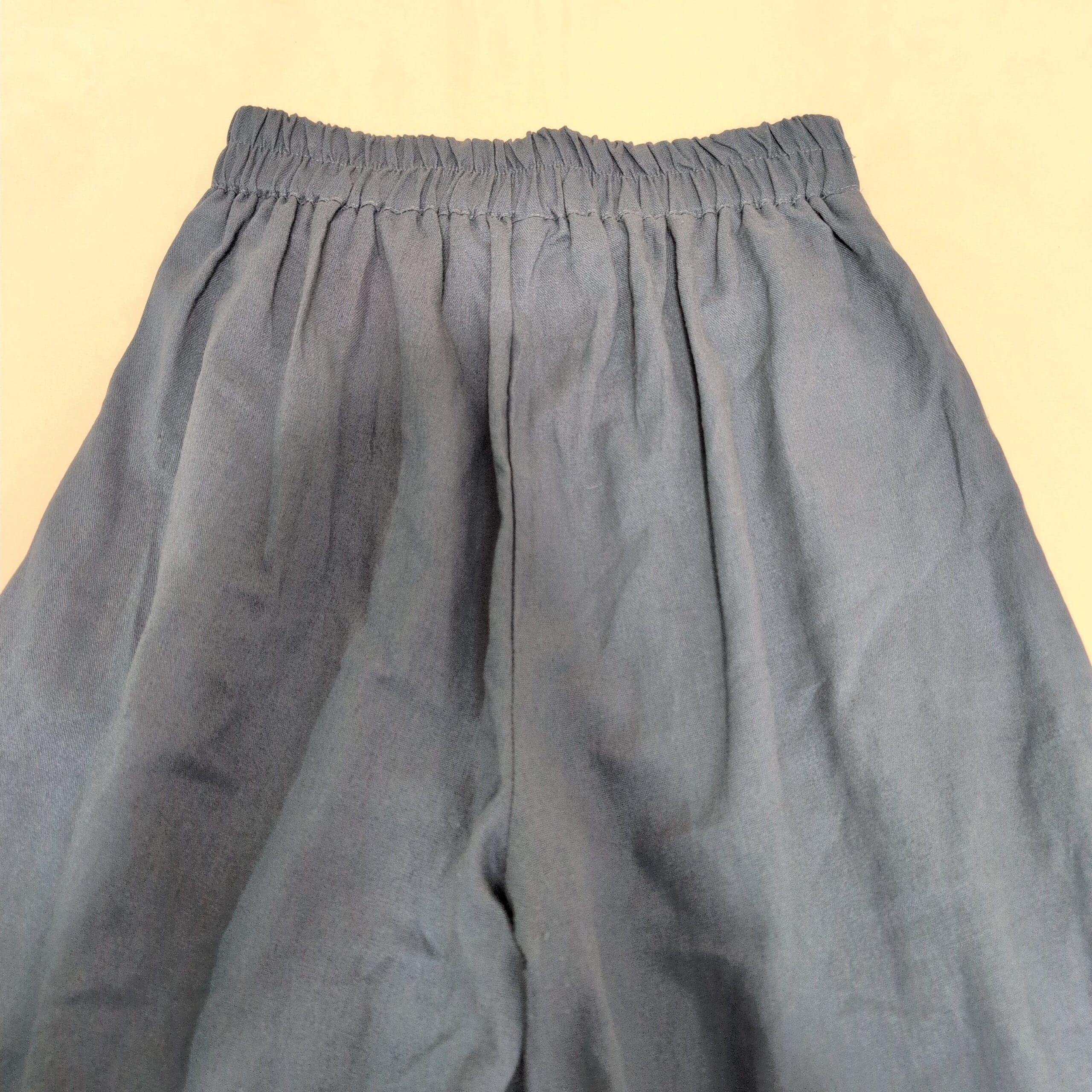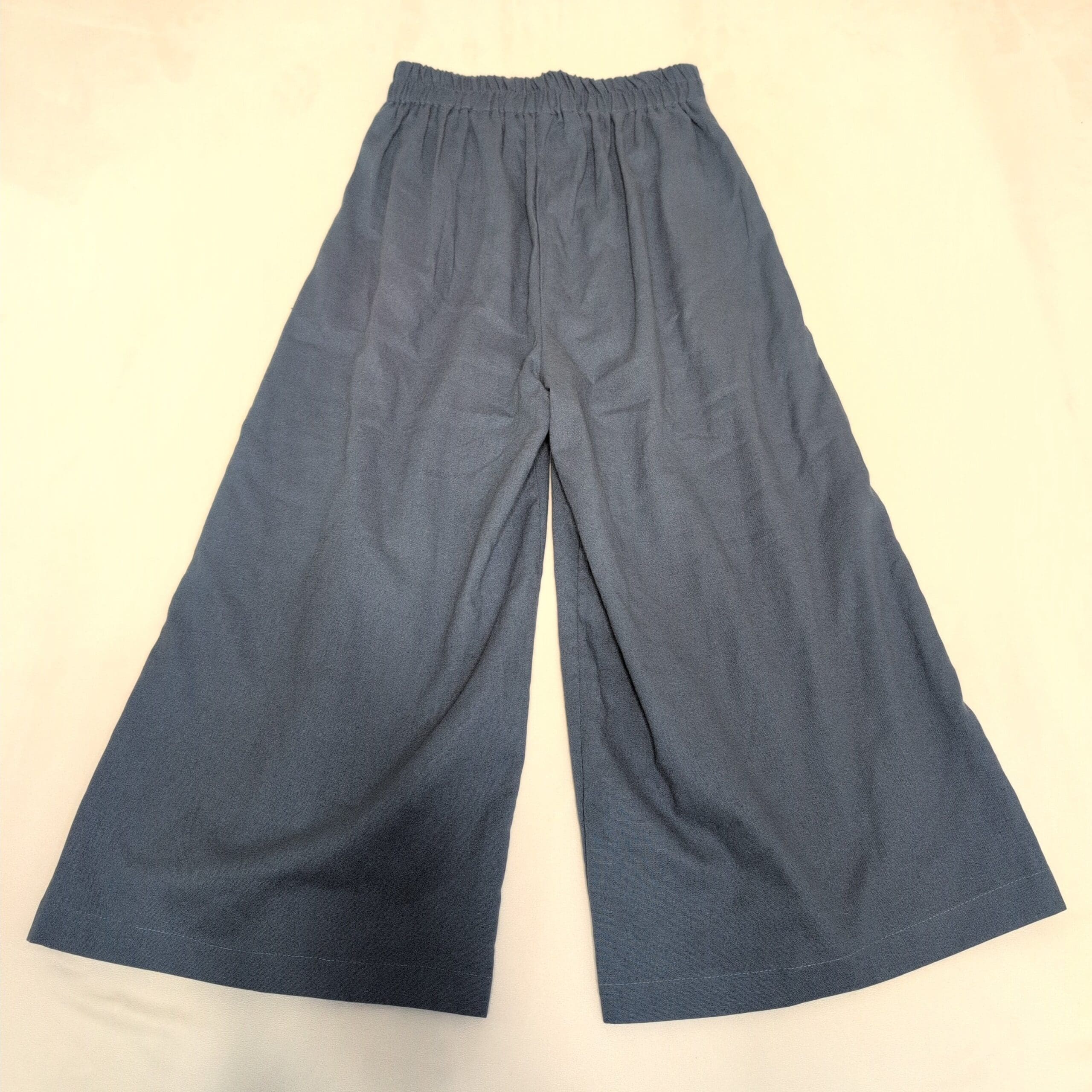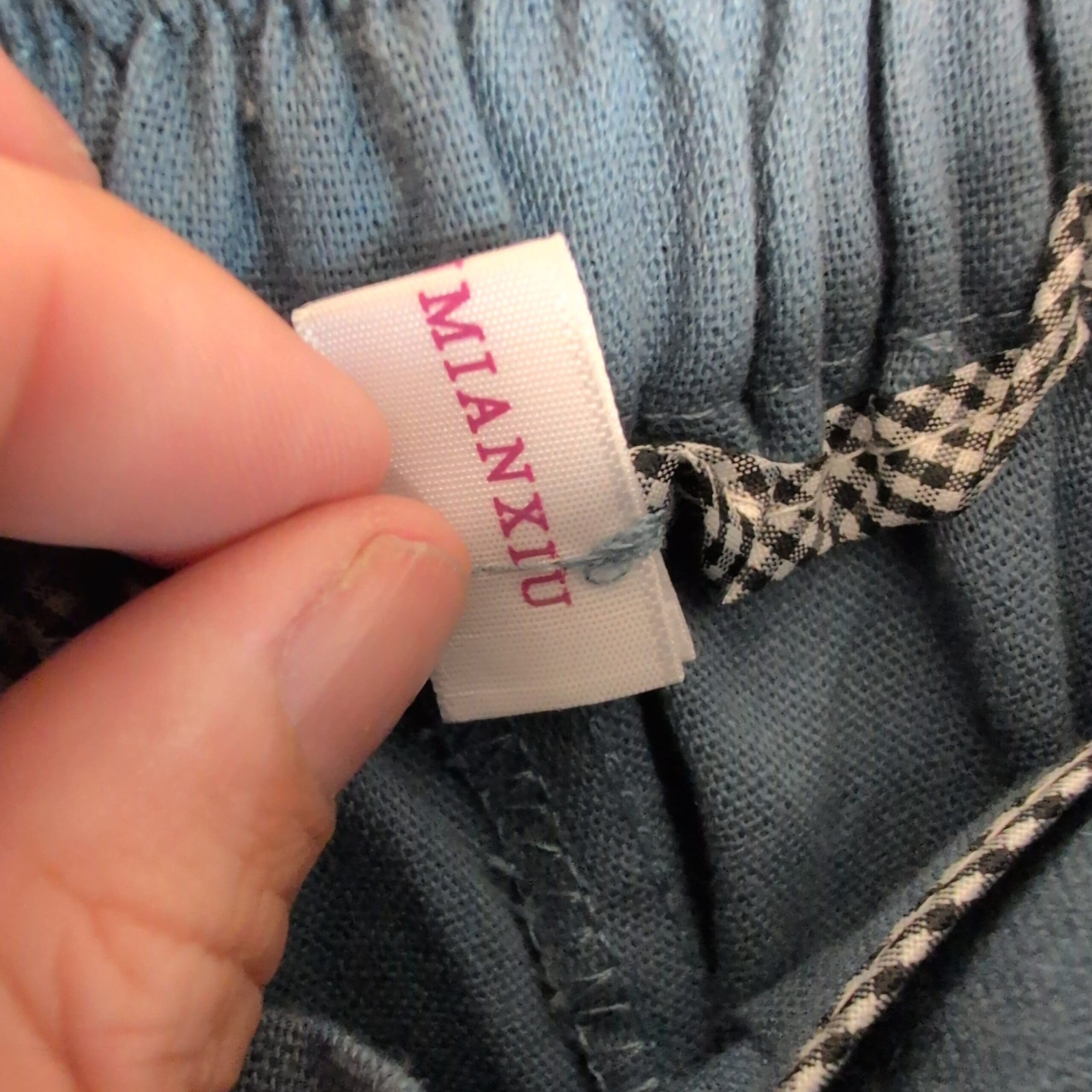 Mu Mianxiu women’s wide-leg pants in blue, size S. Features a high-rise waistband with subtle front pleats and a partially elasticized back for added comfort. Wide cropped legs provide a breezy, elegant drape—great for casual days or smart-casual outfits. Includes side pockets and a clean hemline. Lightweight woven fabric with a soft hand; please review photos for texture and exact color. Pre-owned—see photos for condition.