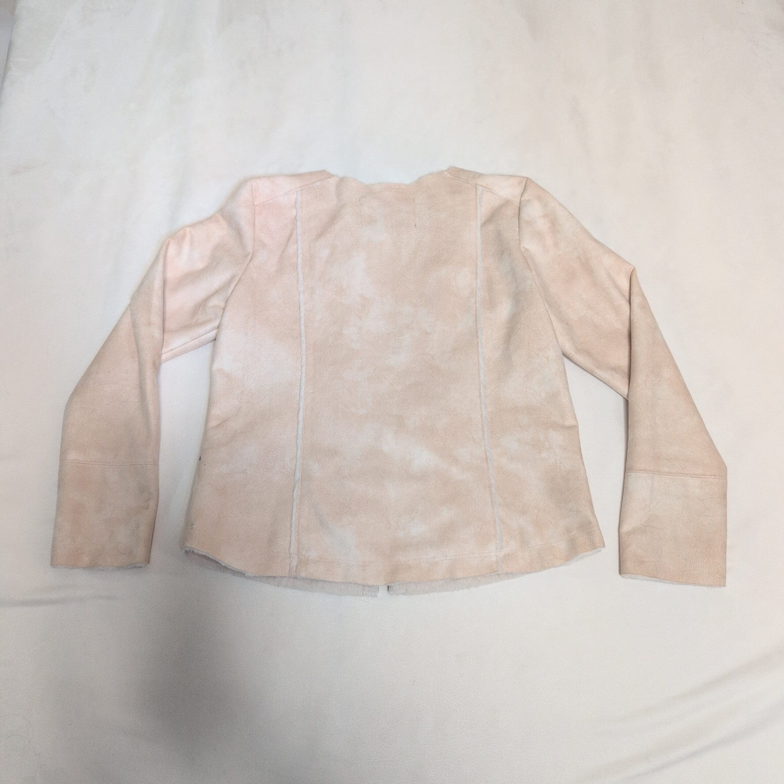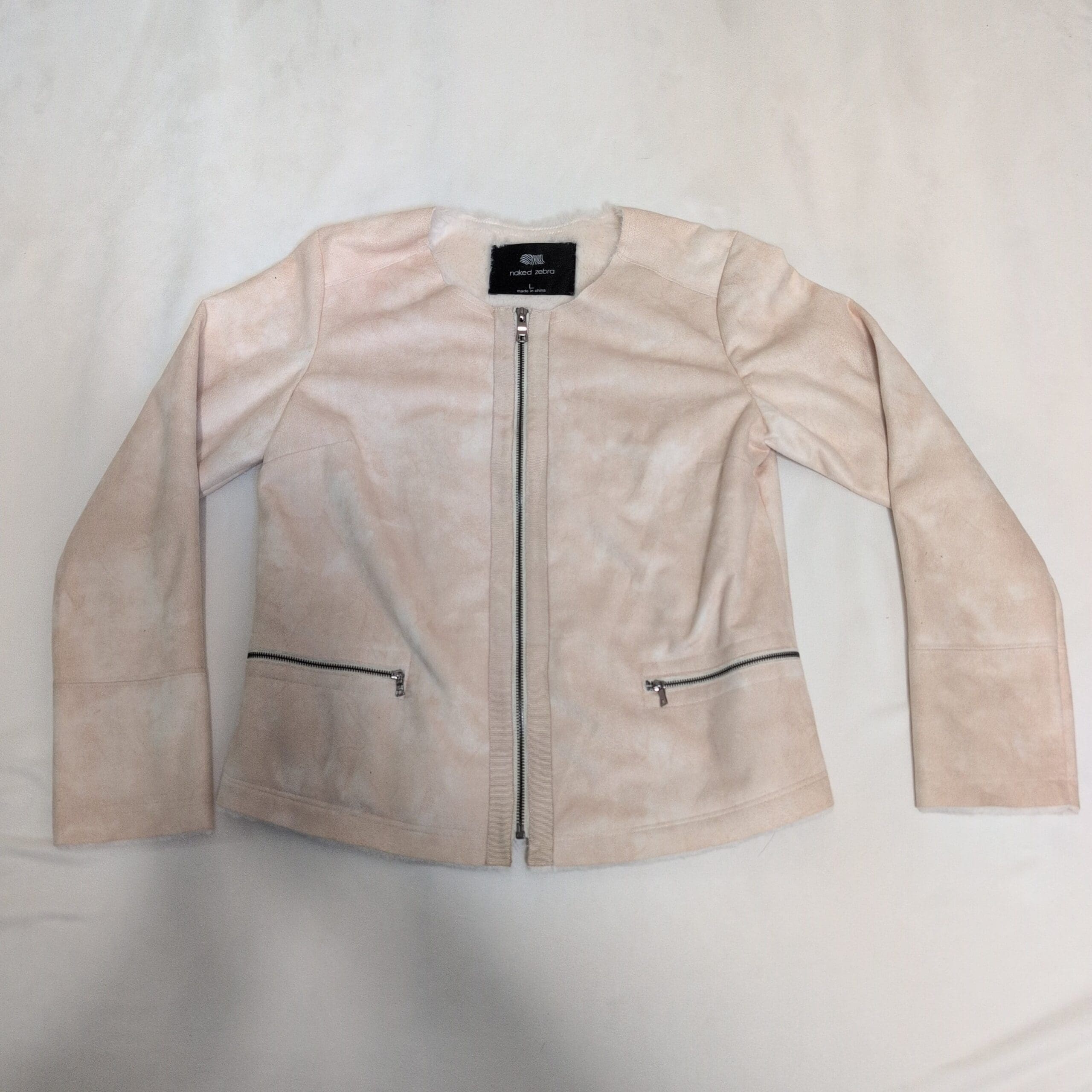 Naked Zebra women’s tan jacket in size L. Collarless, zip-front design with two zippered front pockets and clean, tailored seams for a polished silhouette. Soft suede-look finish and lightweight construction make it ideal for layering from spring to fall. Silver-tone hardware and full-length zipper add a modern touch. Pre-owned with light, normal wear consistent with use; no major flaws visible in photos.