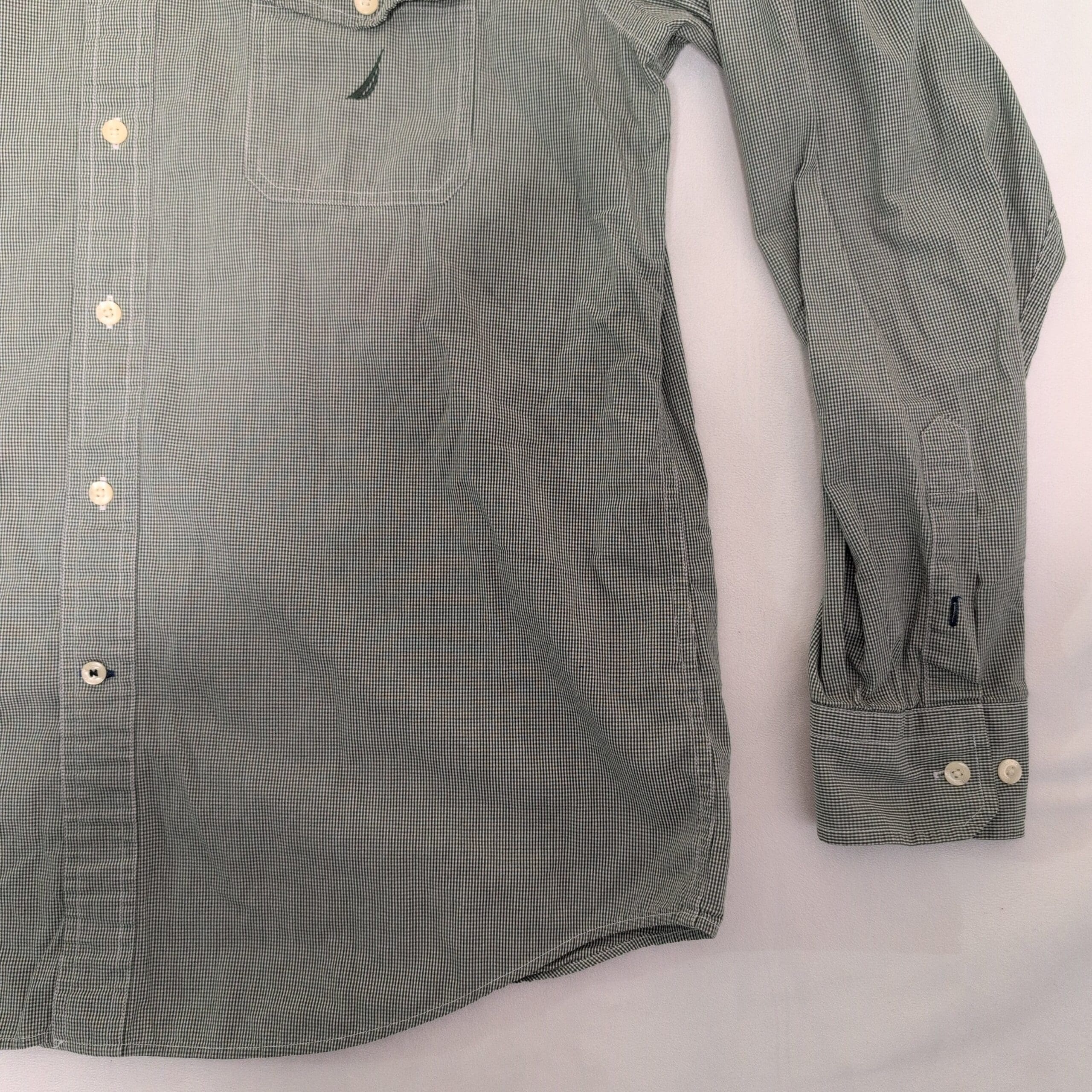 Classic Nautica men’s long-sleeve button-down shirt in green. Size L (standard). Features a button-down collar, full button front, chest pocket with Nautica sail logo, and button cuffs—versatile for casual or office wear. Overall good condition with normal wear; there is a very small stain on the front right of the shirt (see photos for detail). All buttons are present and functional.