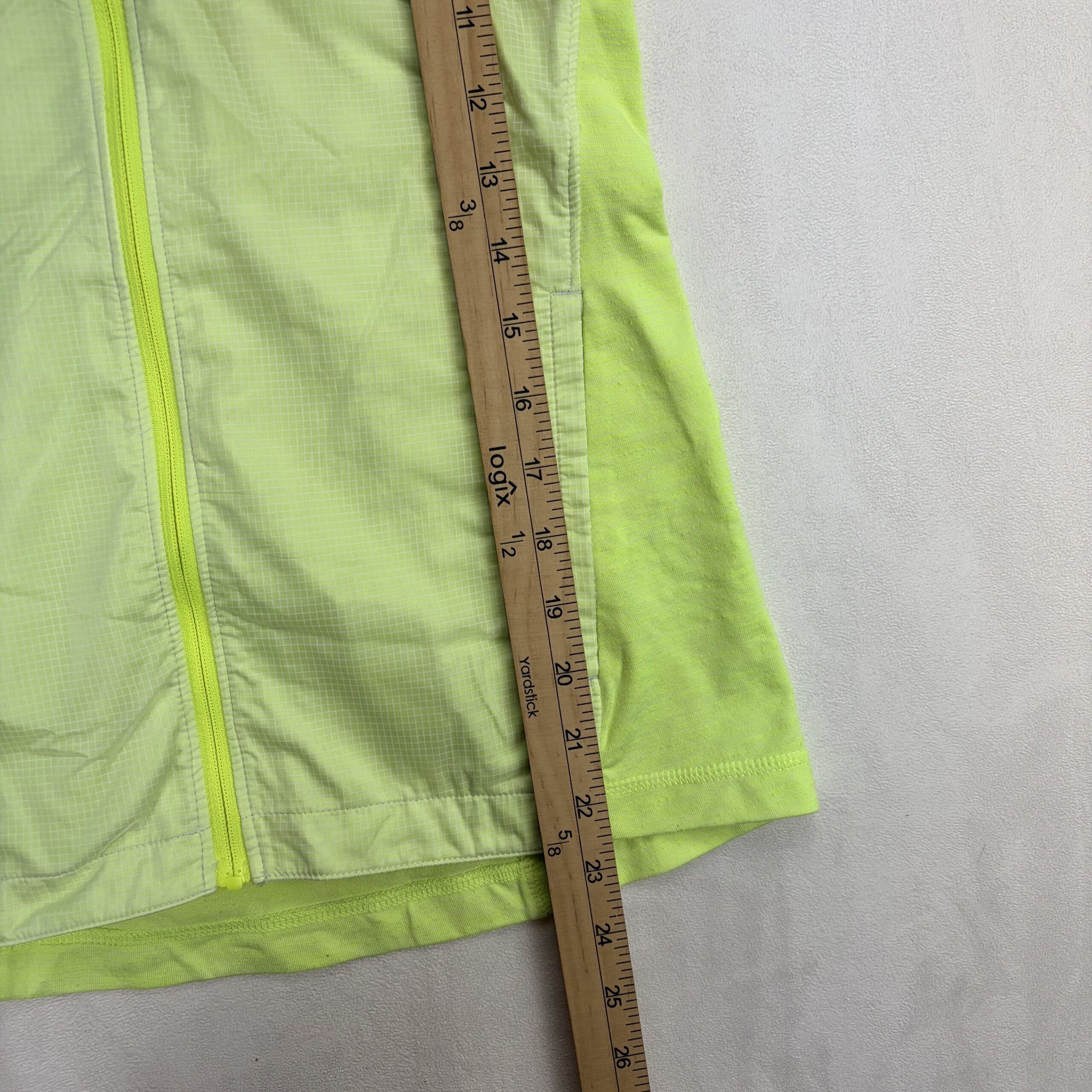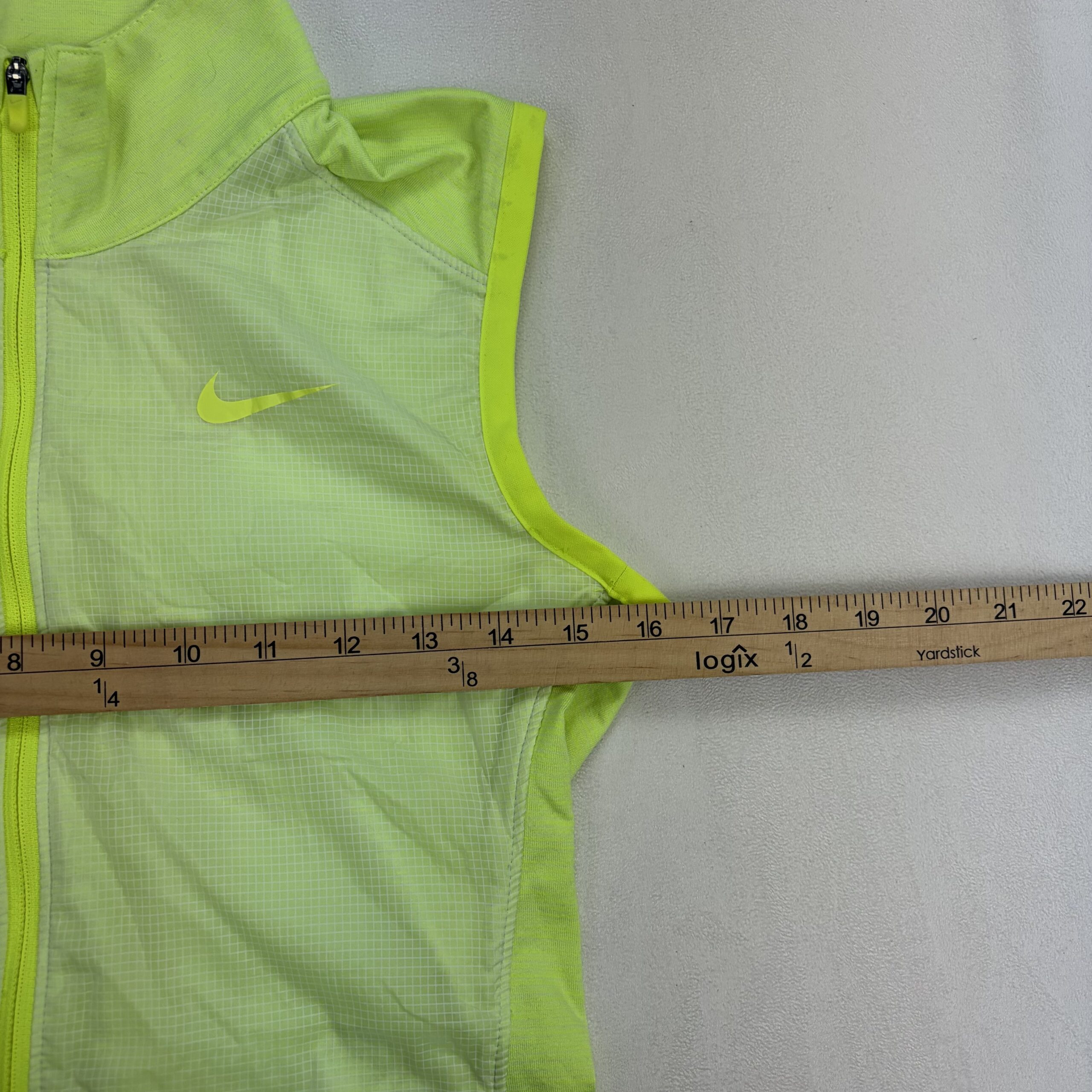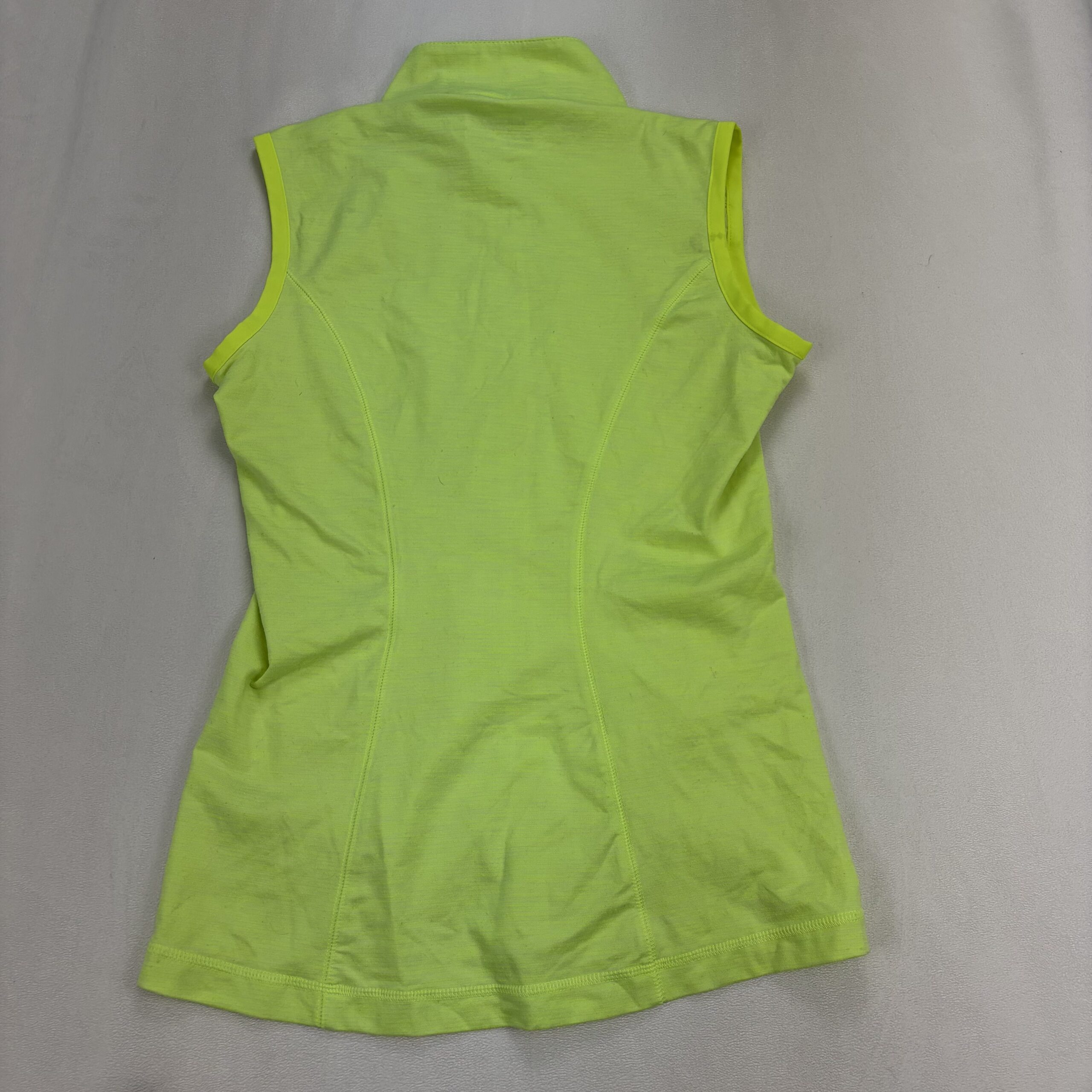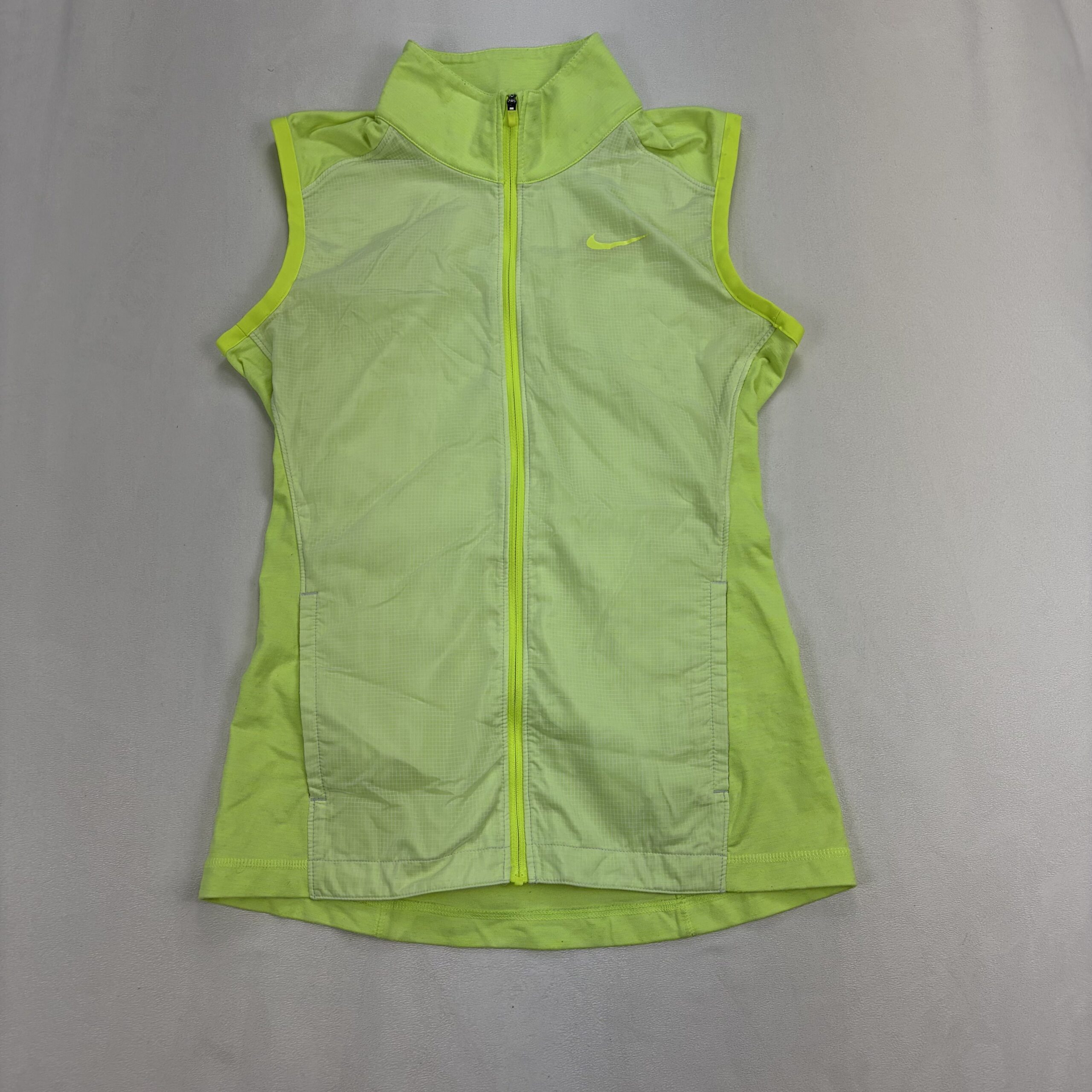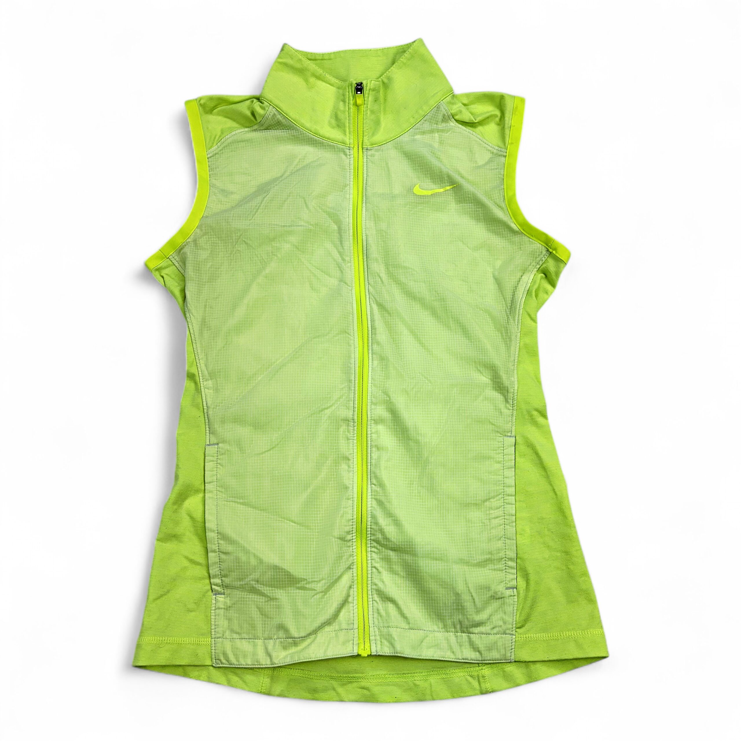 Neon green/yellow Nike women’s sleeveless athletic vest, size XS. Features a full-length front zipper, high collar, fitted silhouette ideal for running or training, and embroidered Swoosh on the chest. Lightweight design with breathable front panel and stretch side panels for comfortable movement. Excellent used condition — free of major rips, tears, stains, or flaws; typical light wear may be present. See photos for color and details.