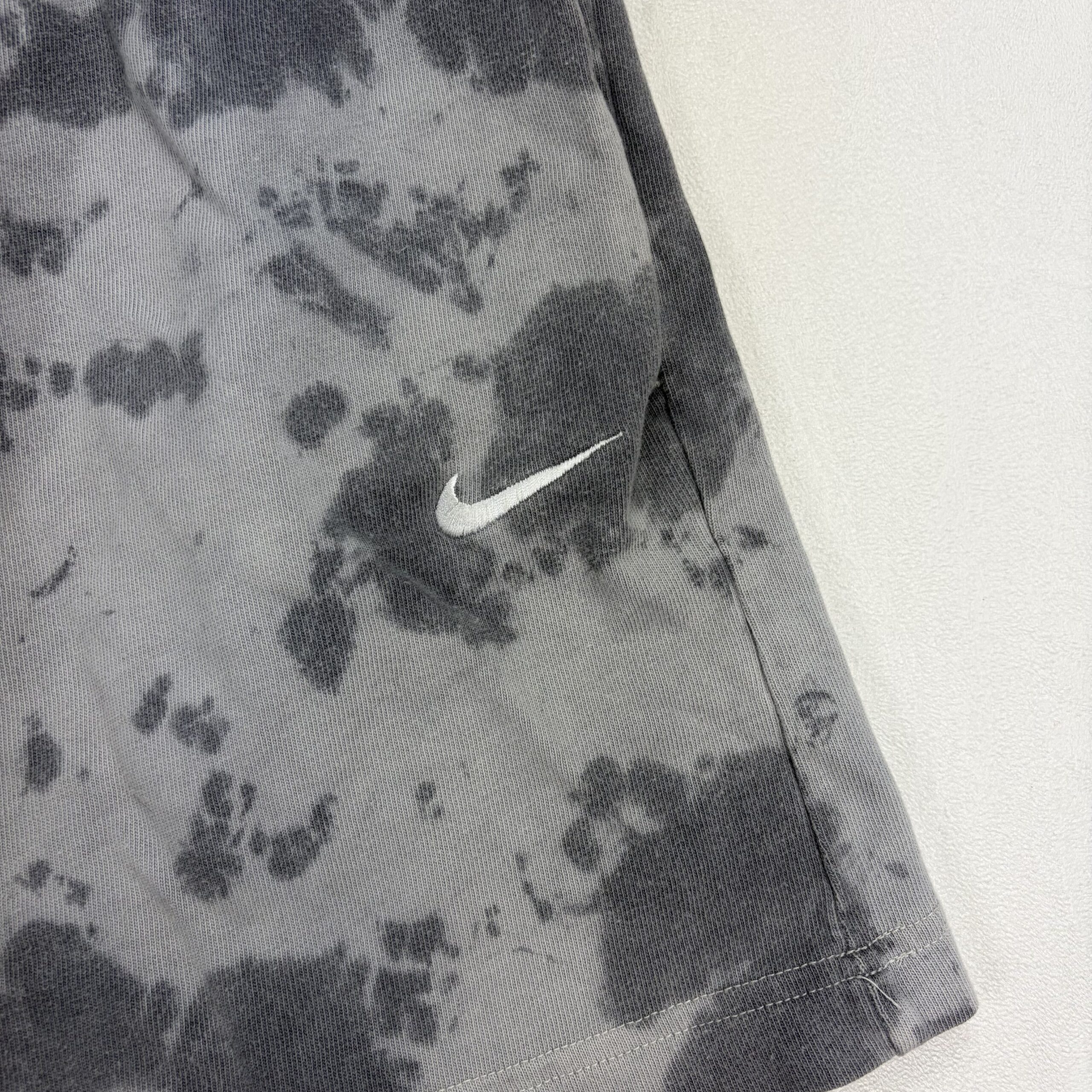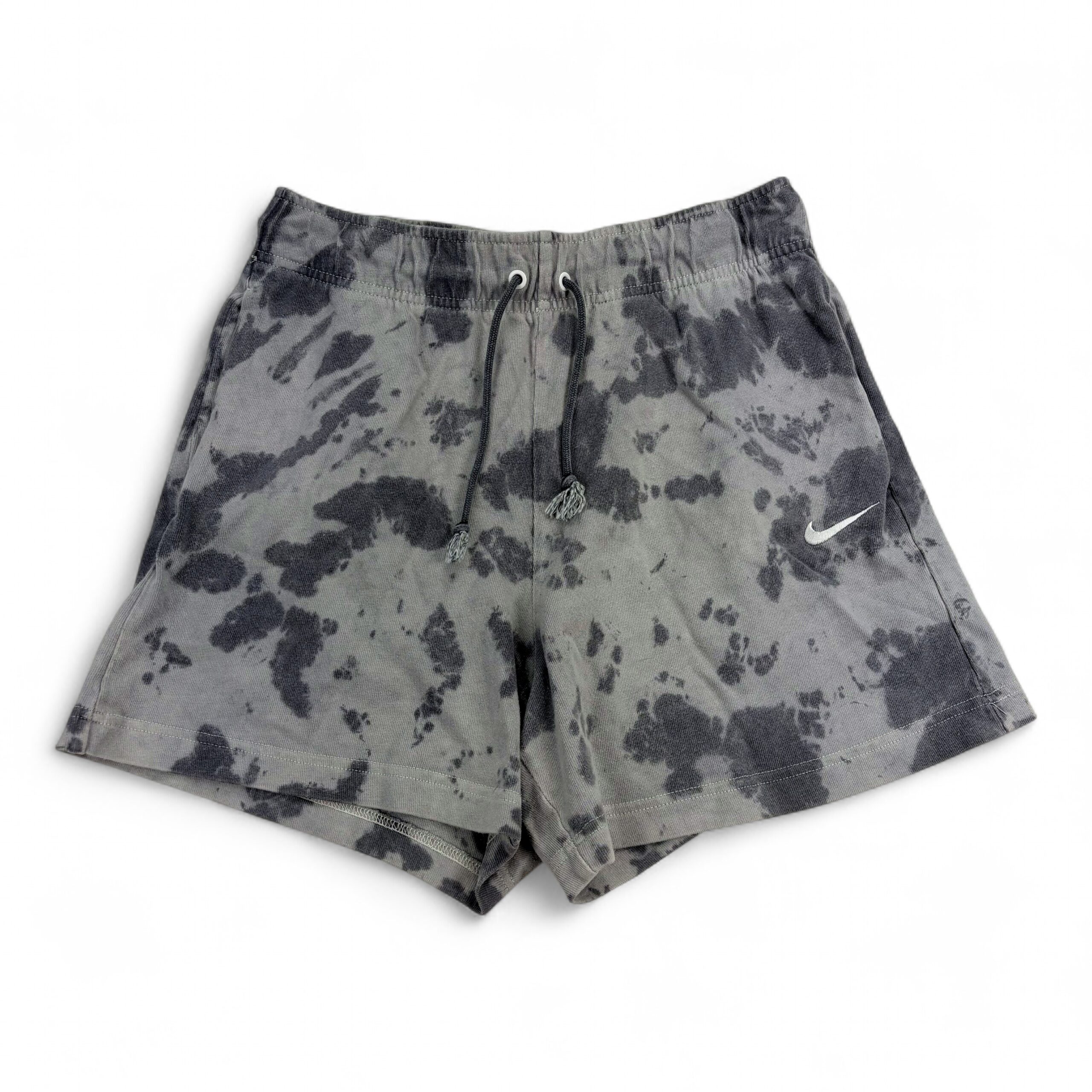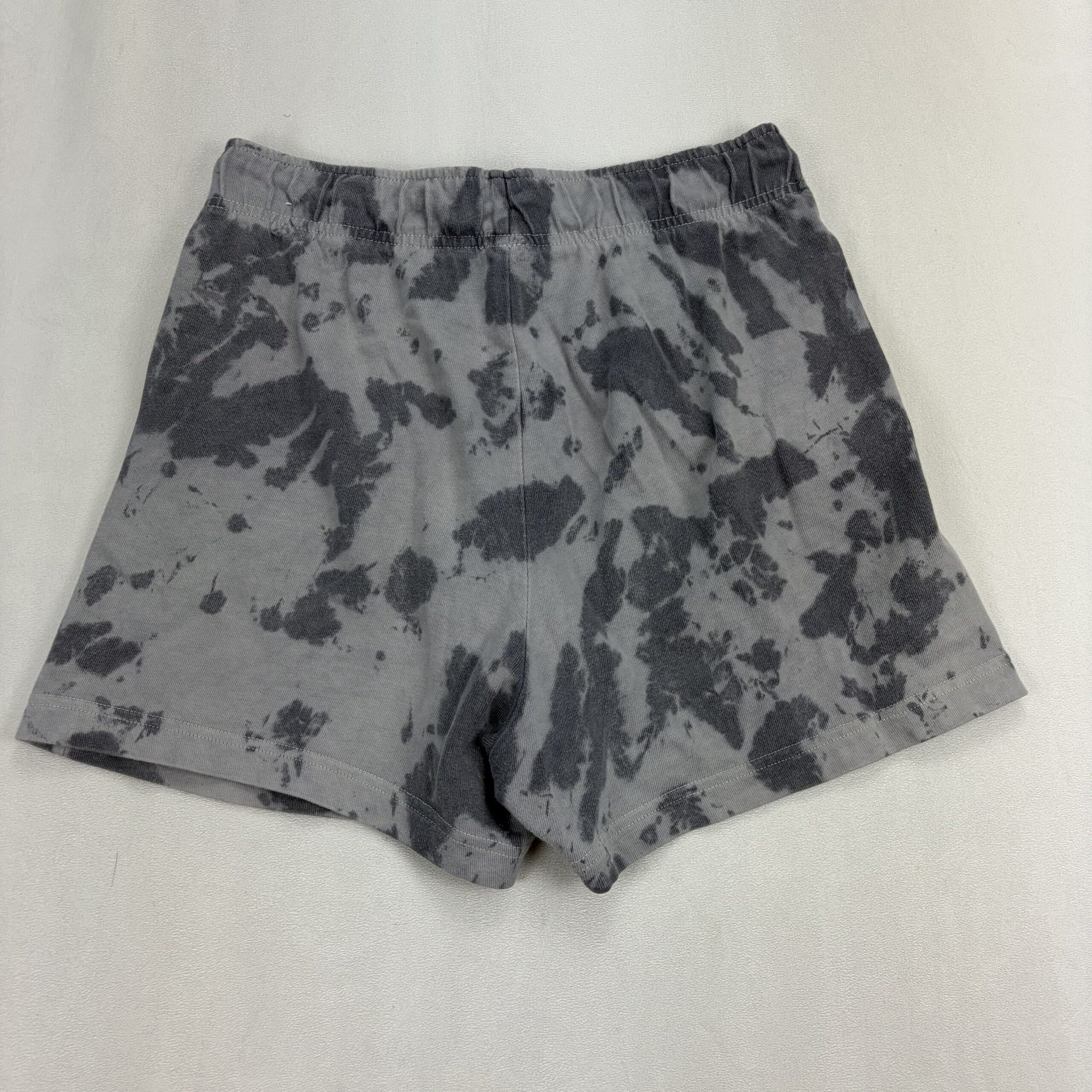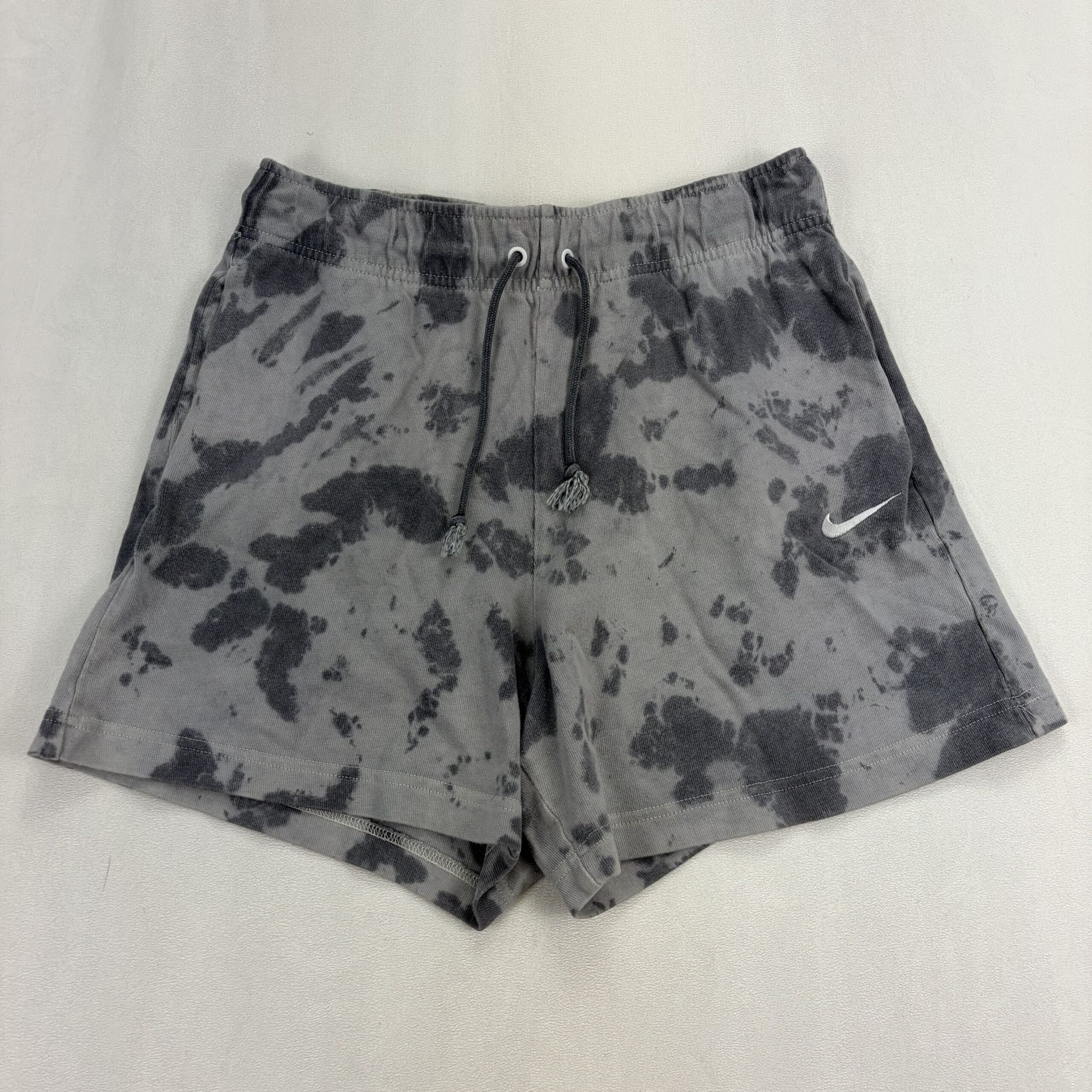 Nike women’s tie-dye drawstring shorts in size S. Grey and black acid-wash pattern with embroidered white Swoosh on the left leg. Elastic waistband with adjustable drawstring and a relaxed, sporty fit — great for lounging, workouts, or casual wear. Excellent used condition; free of major rips, tears, or stains though may show light, typical wear from normal use.