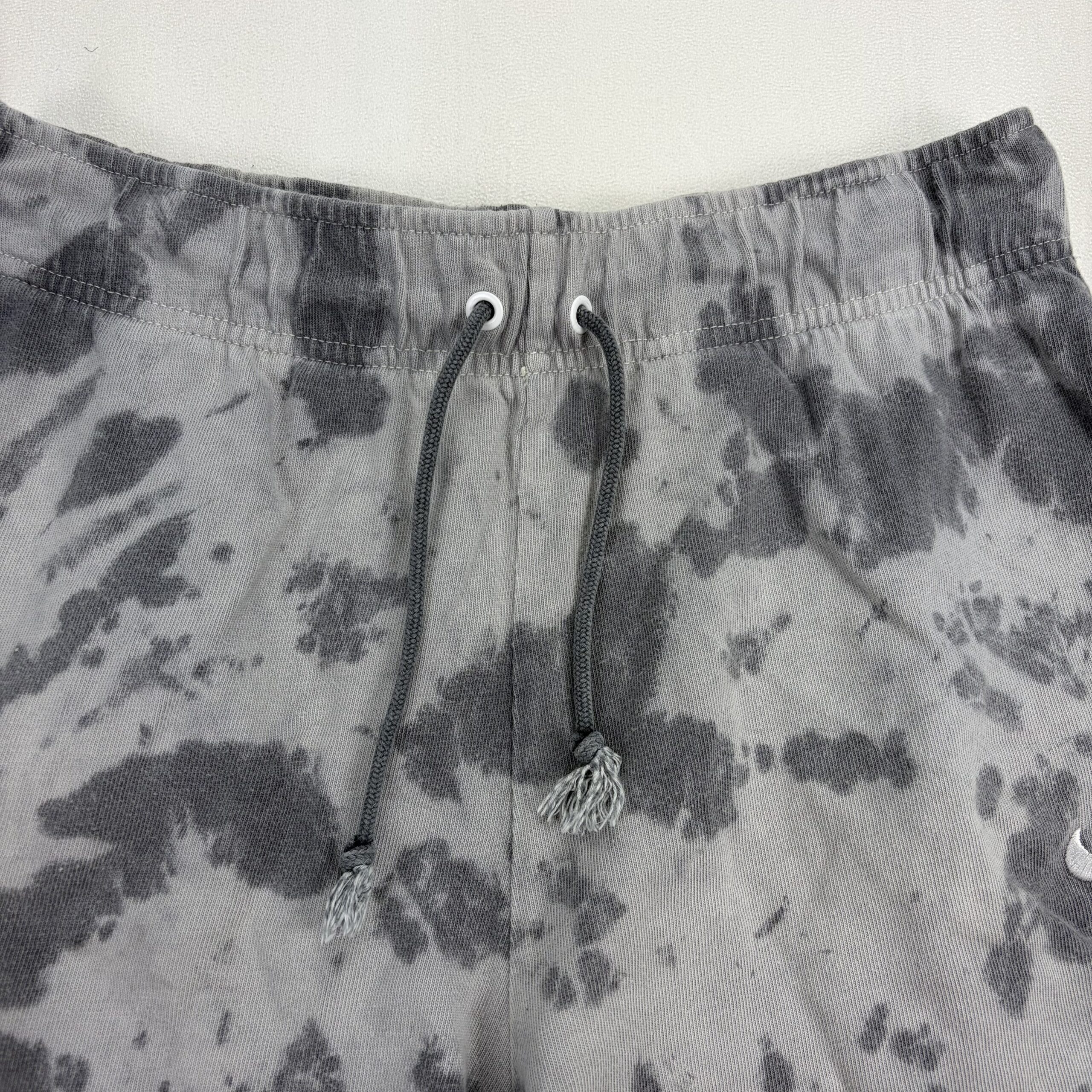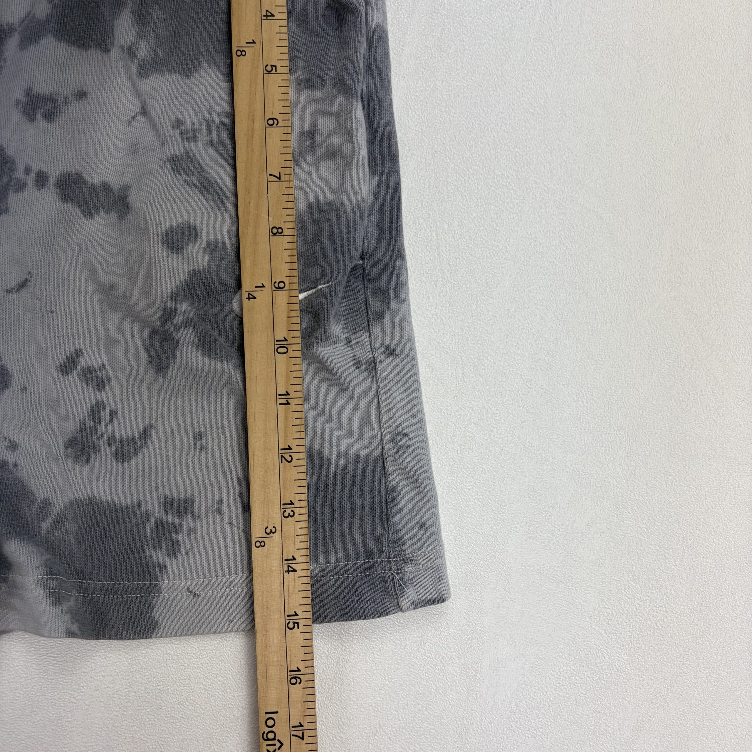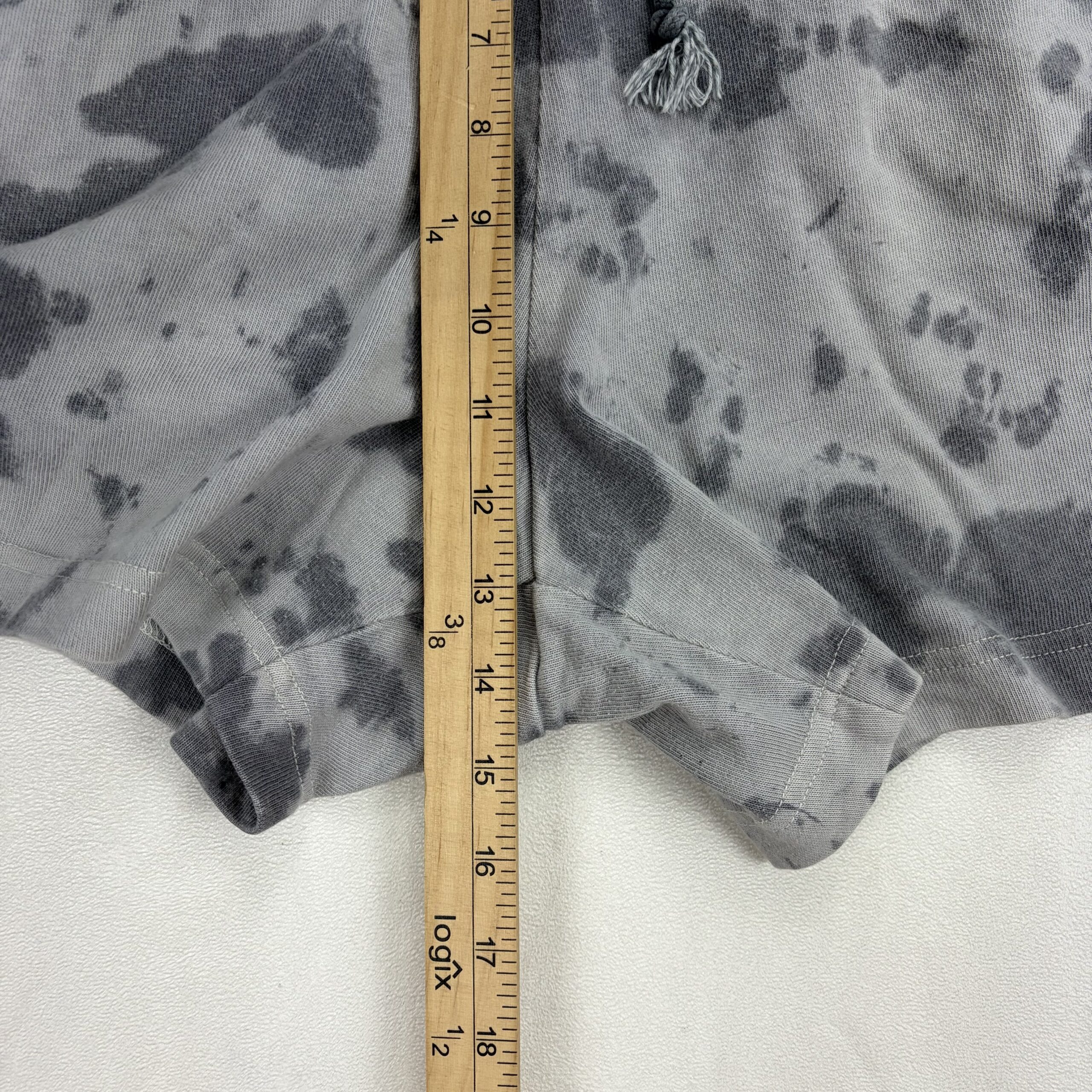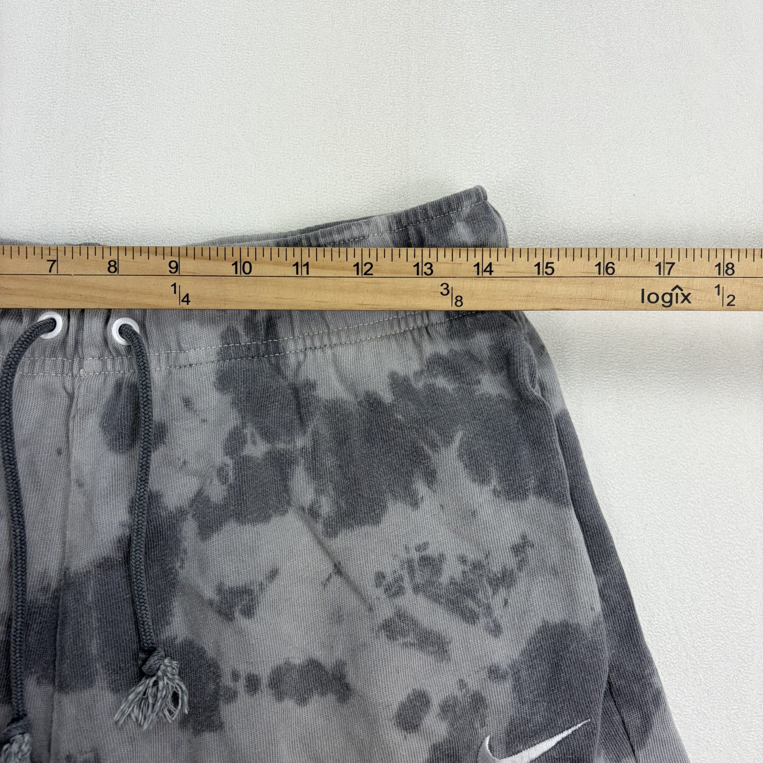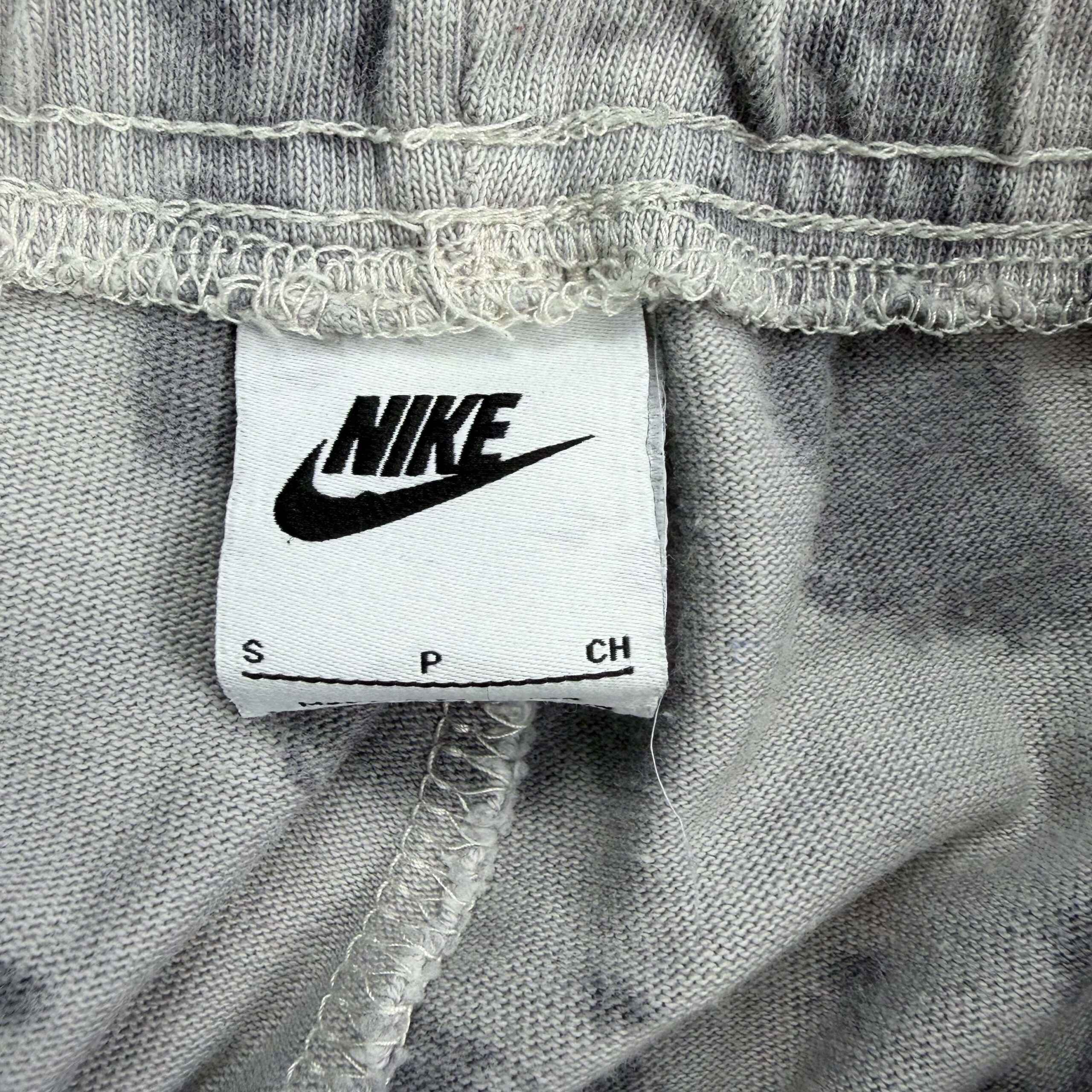 Nike women’s tie-dye drawstring shorts in size S. Grey and black acid-wash pattern with embroidered white Swoosh on the left leg. Elastic waistband with adjustable drawstring and a relaxed, sporty fit — great for lounging, workouts, or casual wear. Excellent used condition; free of major rips, tears, or stains though may show light, typical wear from normal use.