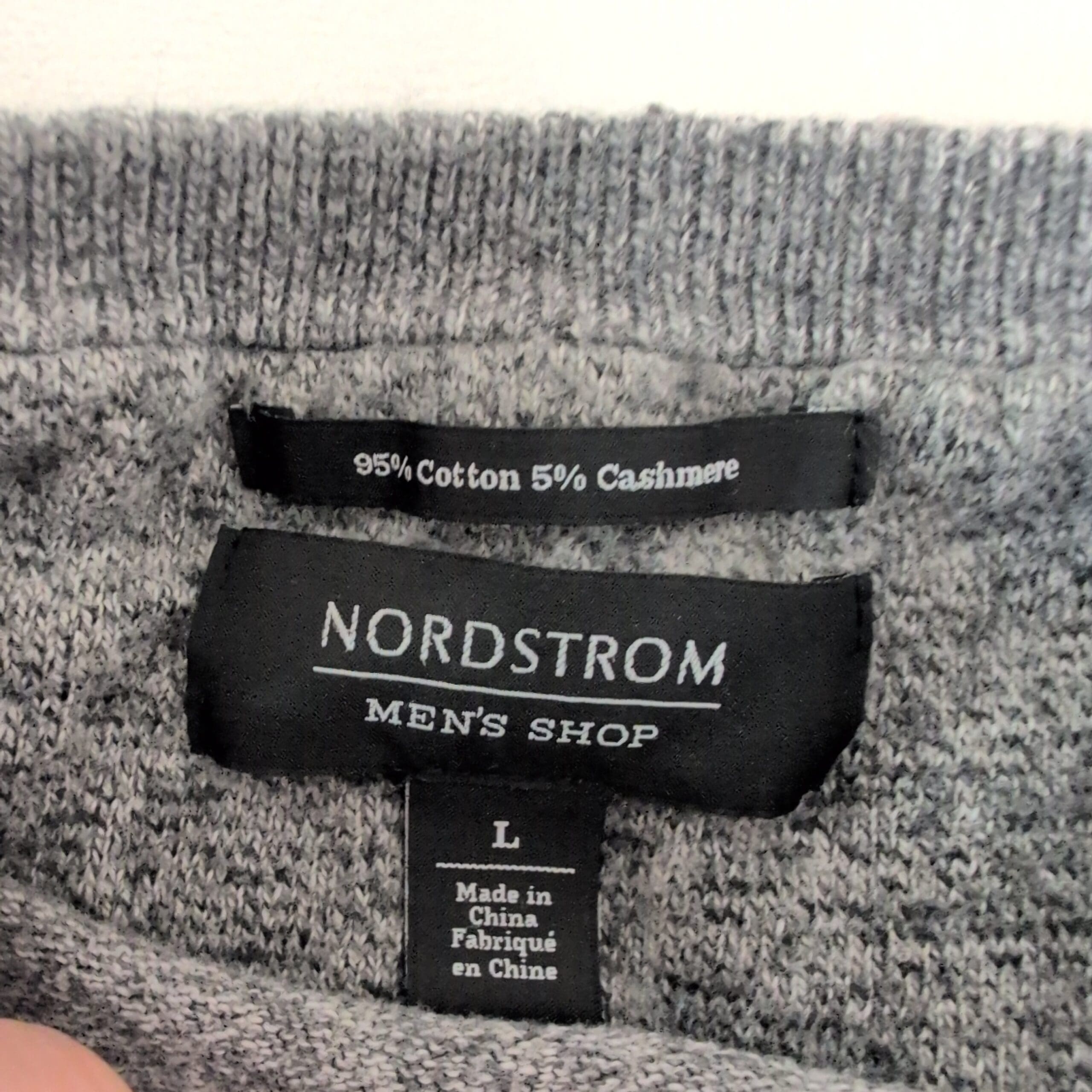 Classic Nordstrom men’s crewneck sweater in heather gray. Size L (standard). Lightweight-to-medium knit with ribbed crew neckline, cuffs, and hem — a versatile layer for work or weekend looks.