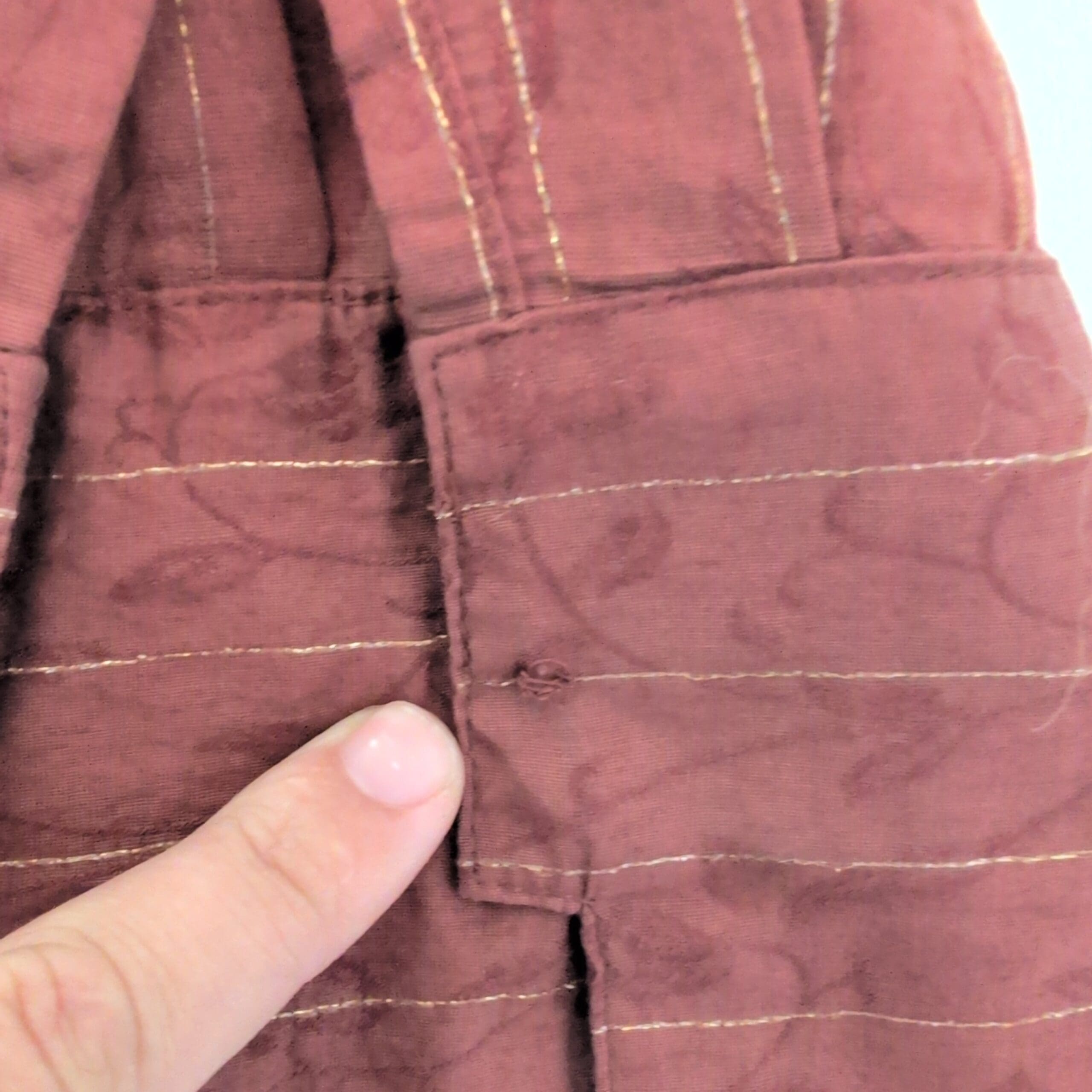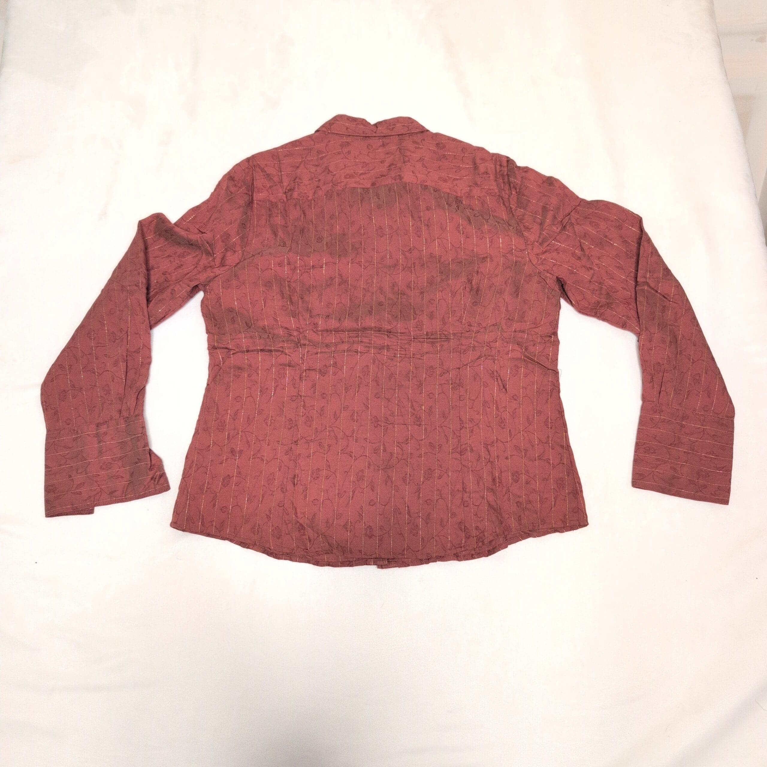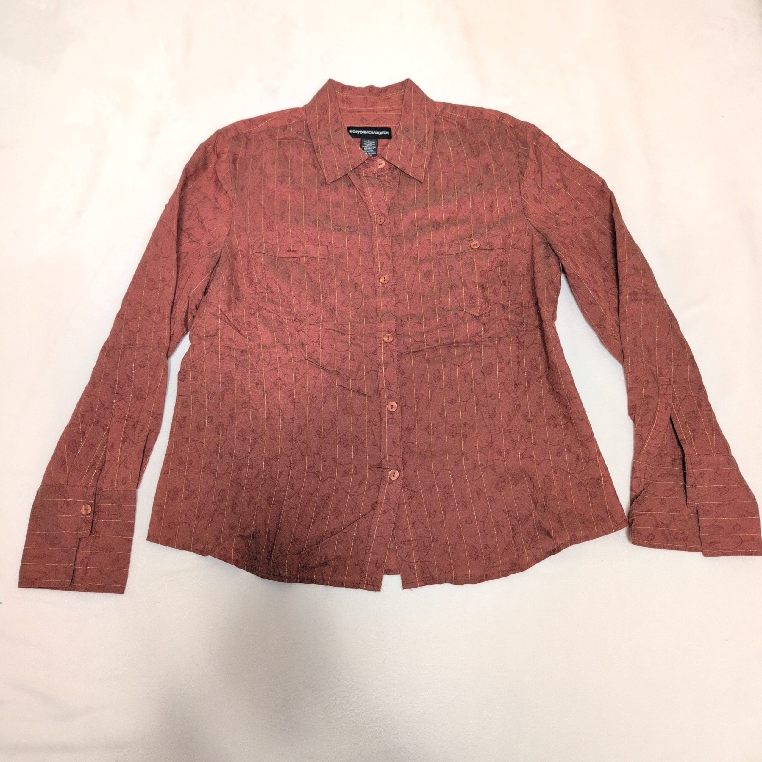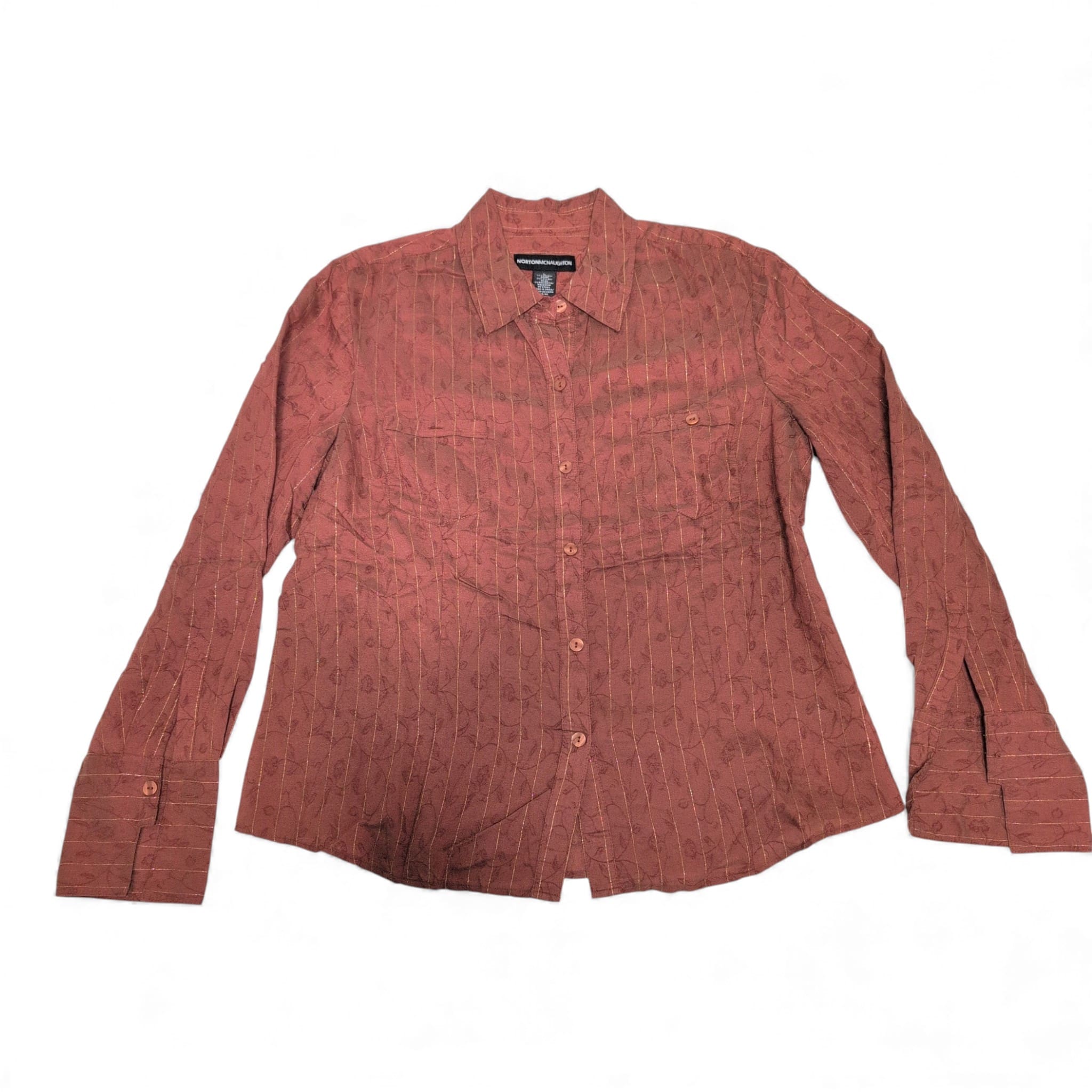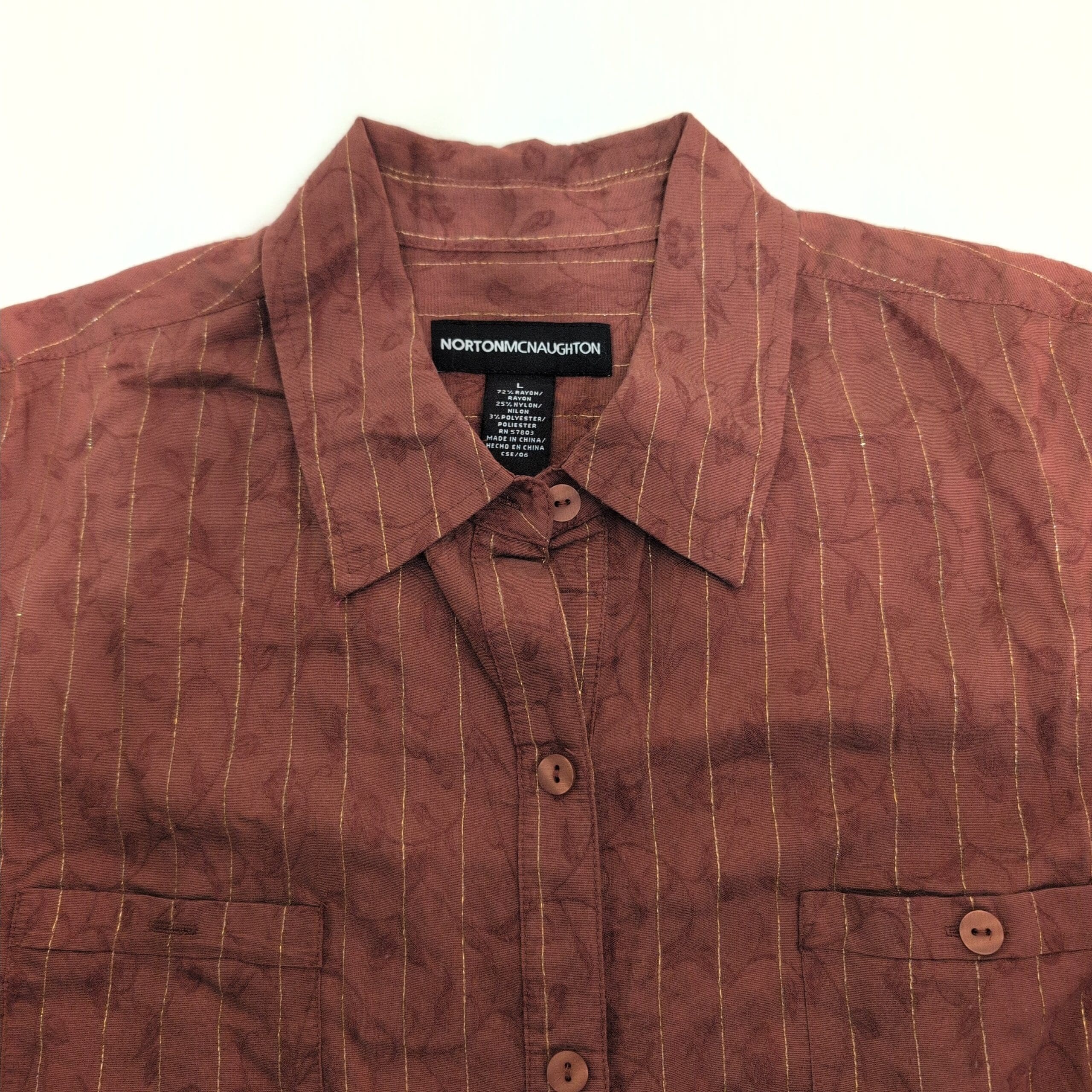 Norton McNaughton women’s button-down shirt in a warm brown tone. Classic collar, long sleeves, two chest pockets, and a subtle vertical pinstripe with a tone-on-tone textured pattern. Size L (standard). Missing button on left cuff — see photos for detail. Excellent overall wearable condition aside from the missing cuff button; great for layering or casual office wear. Please review all photos for color, pattern, and condition details.