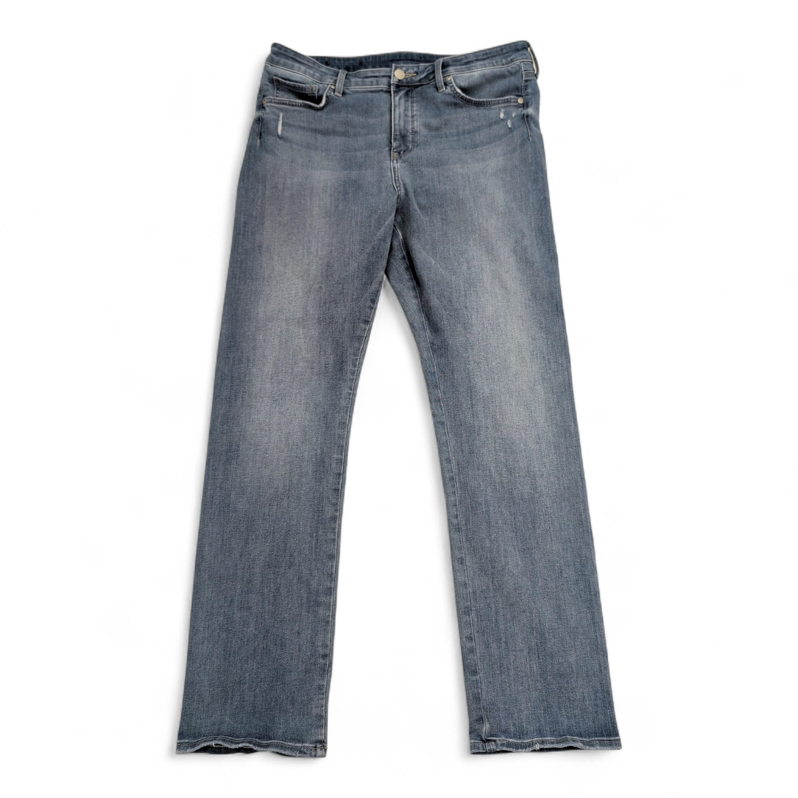 NYDJ women’s jeans, Size 12. Light blue wash straight-leg denim with classic five-pocket styling and zip fly/button closure. Versatile everyday jean that pairs easily with tees or blouses.