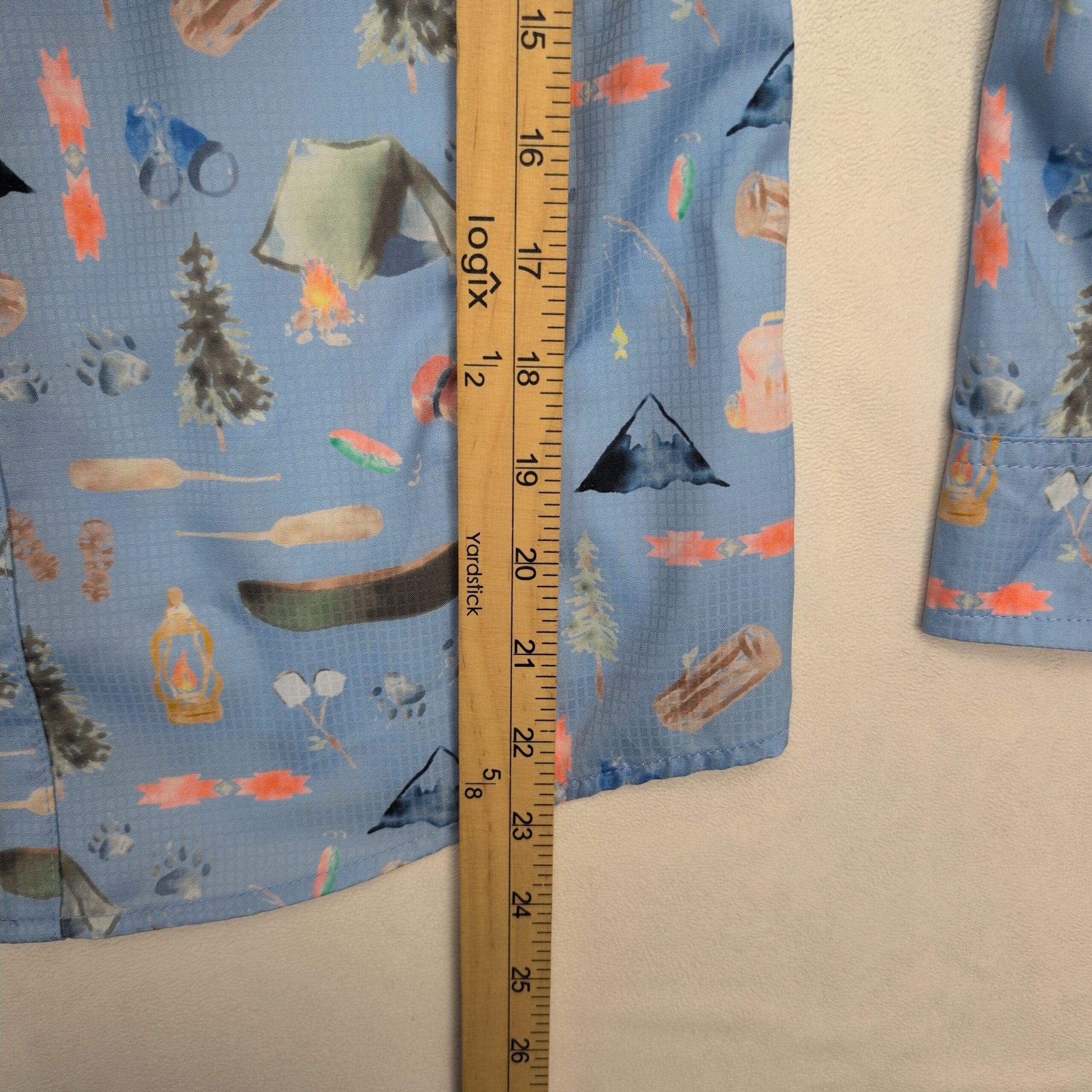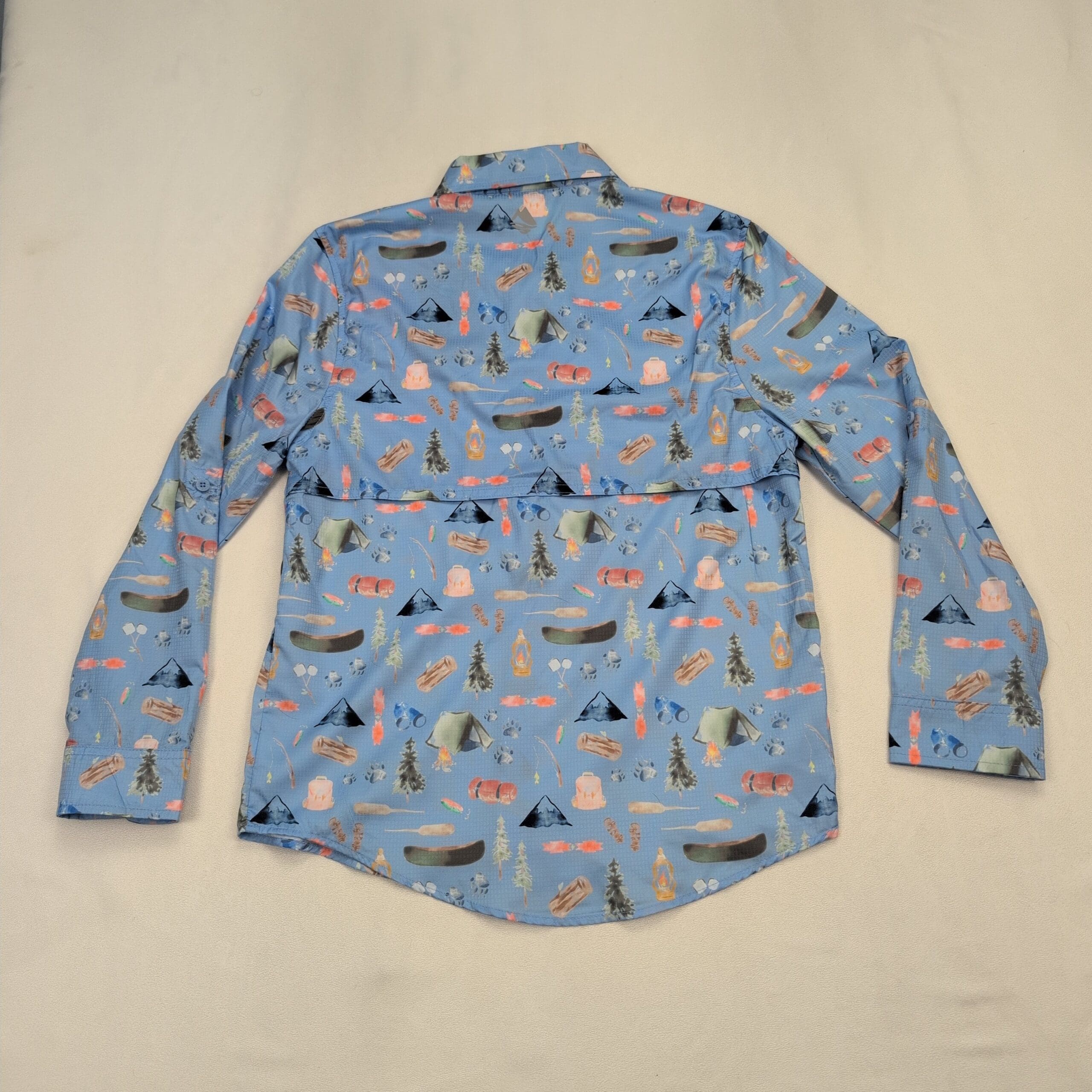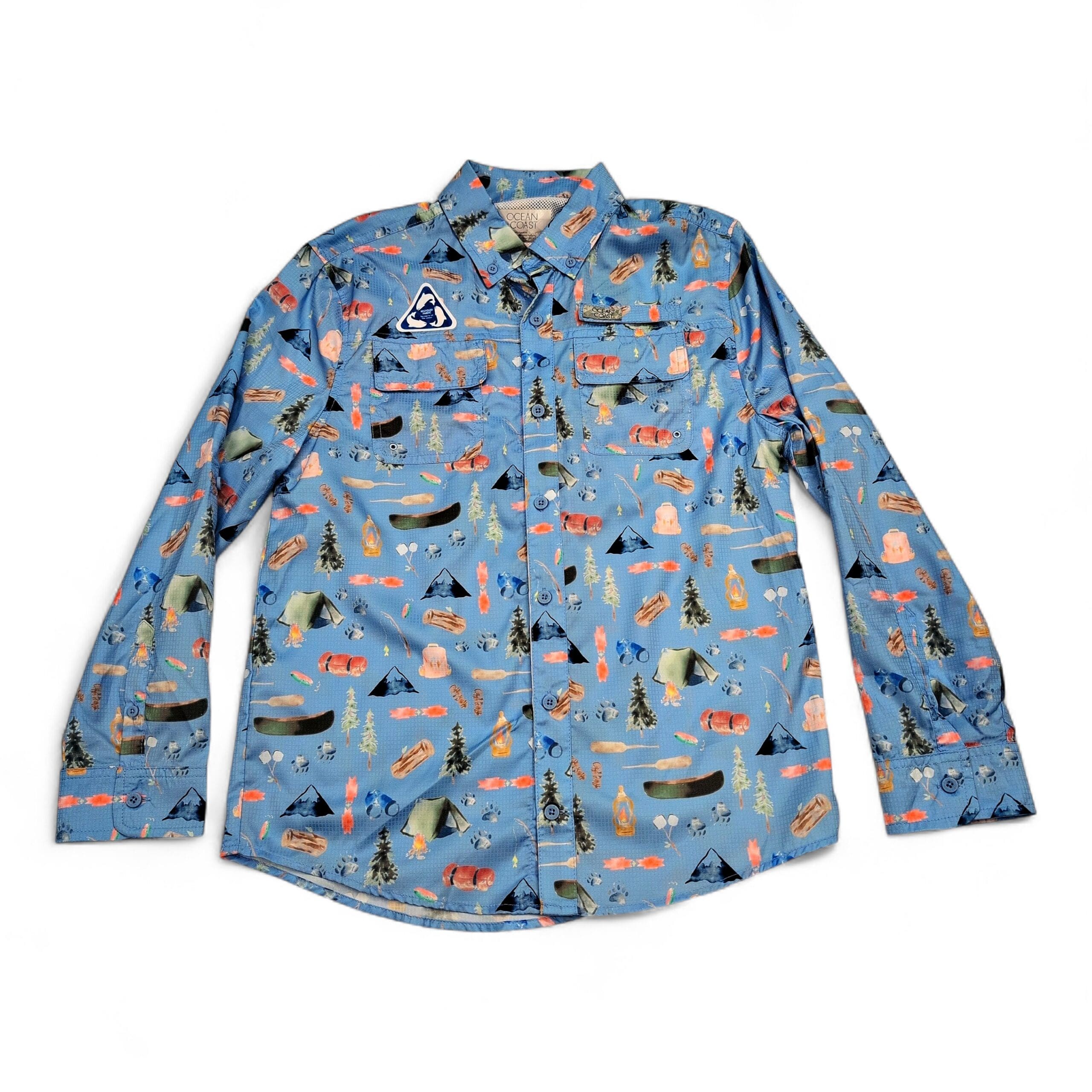 Lightweight Ocean + Coast women’s long-sleeve button-down in size L with an all-over camping print — tents, canoes, lanterns, logs and trees on a soft light-blue background. Features a collared neckline, full button front, two chest flap pockets, button cuffs and a relaxed fit ideal for layering. Excellent used condition: free of major rips, stains, or missing buttons; typical light wear consistent with prior use. See photos for print detail and tag.