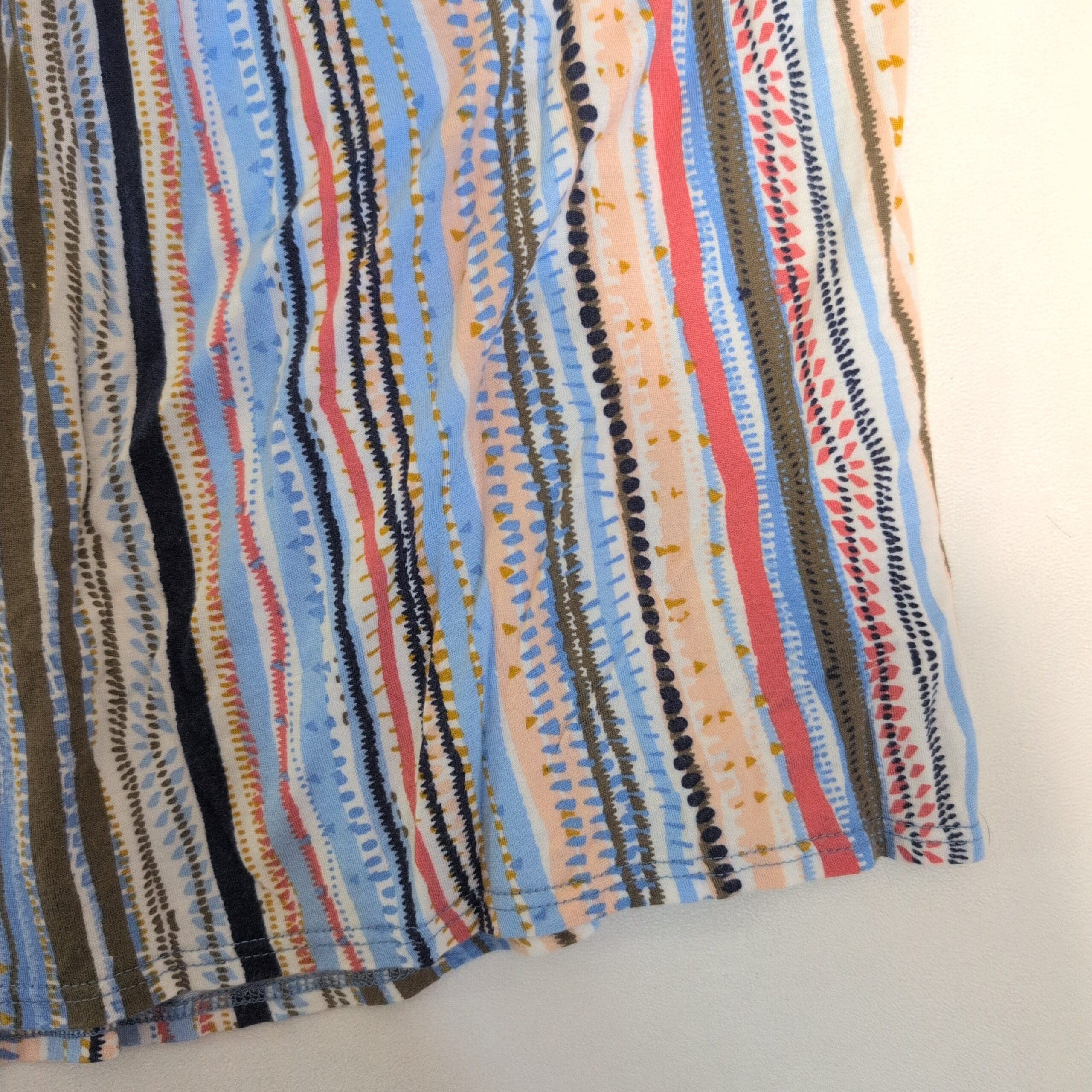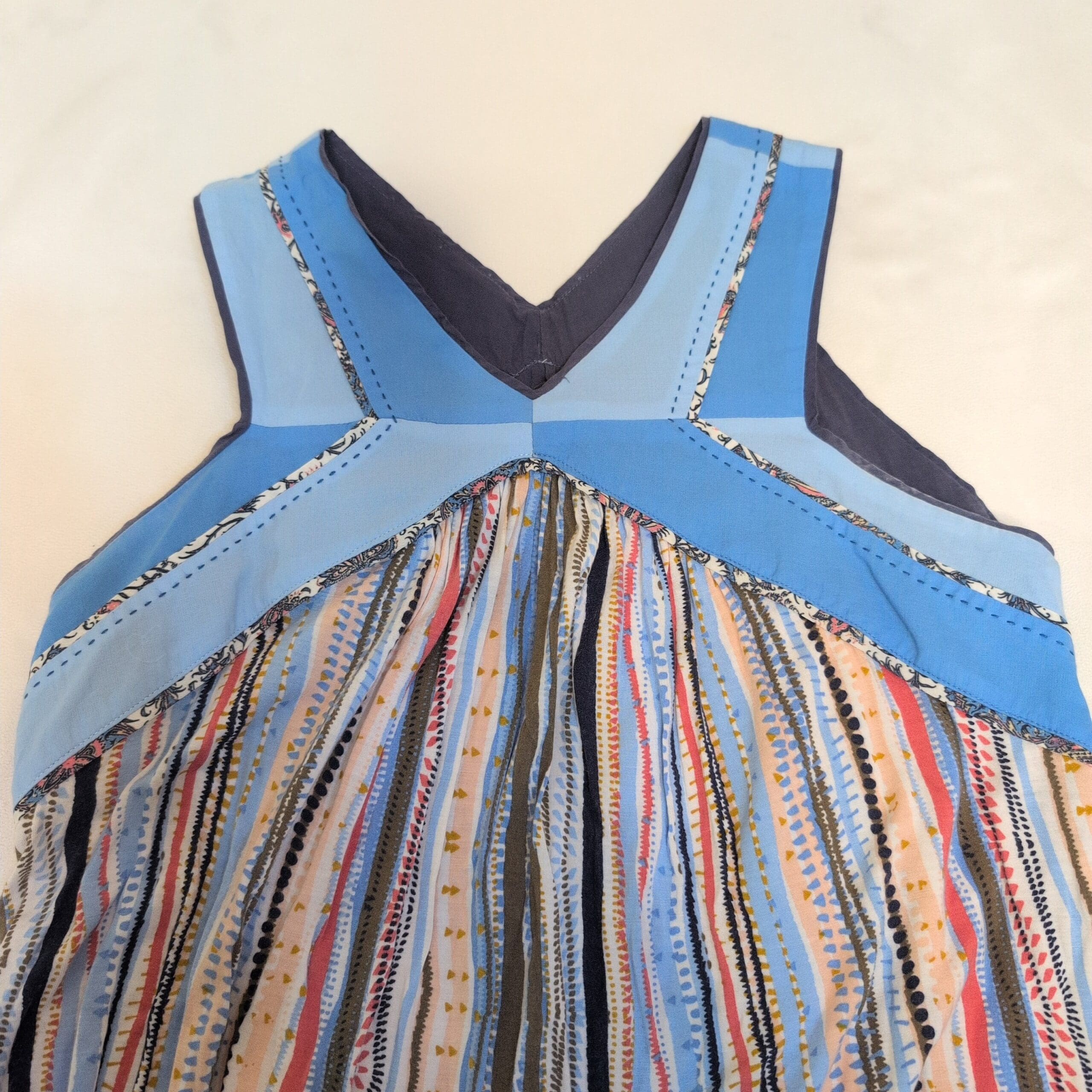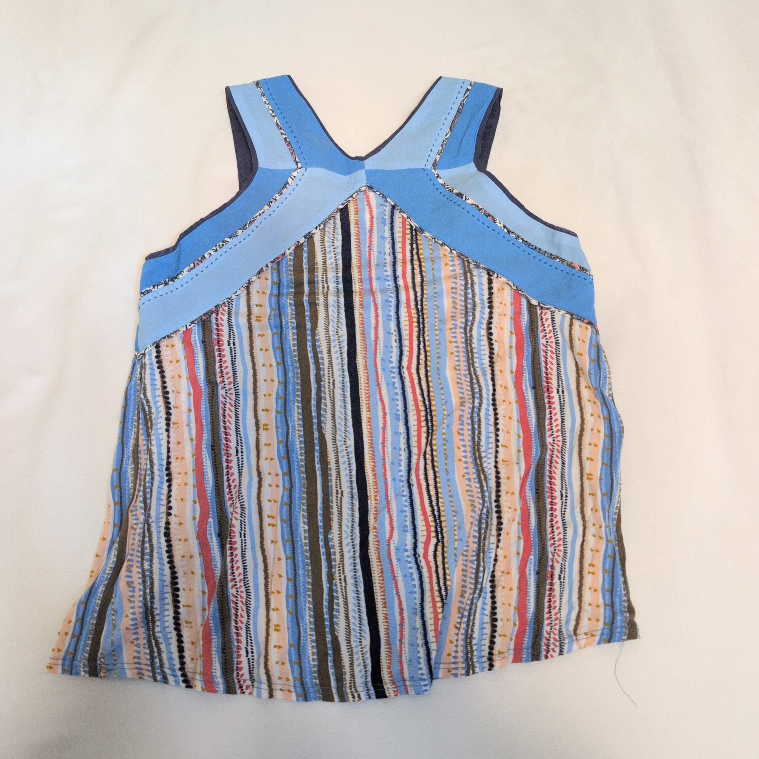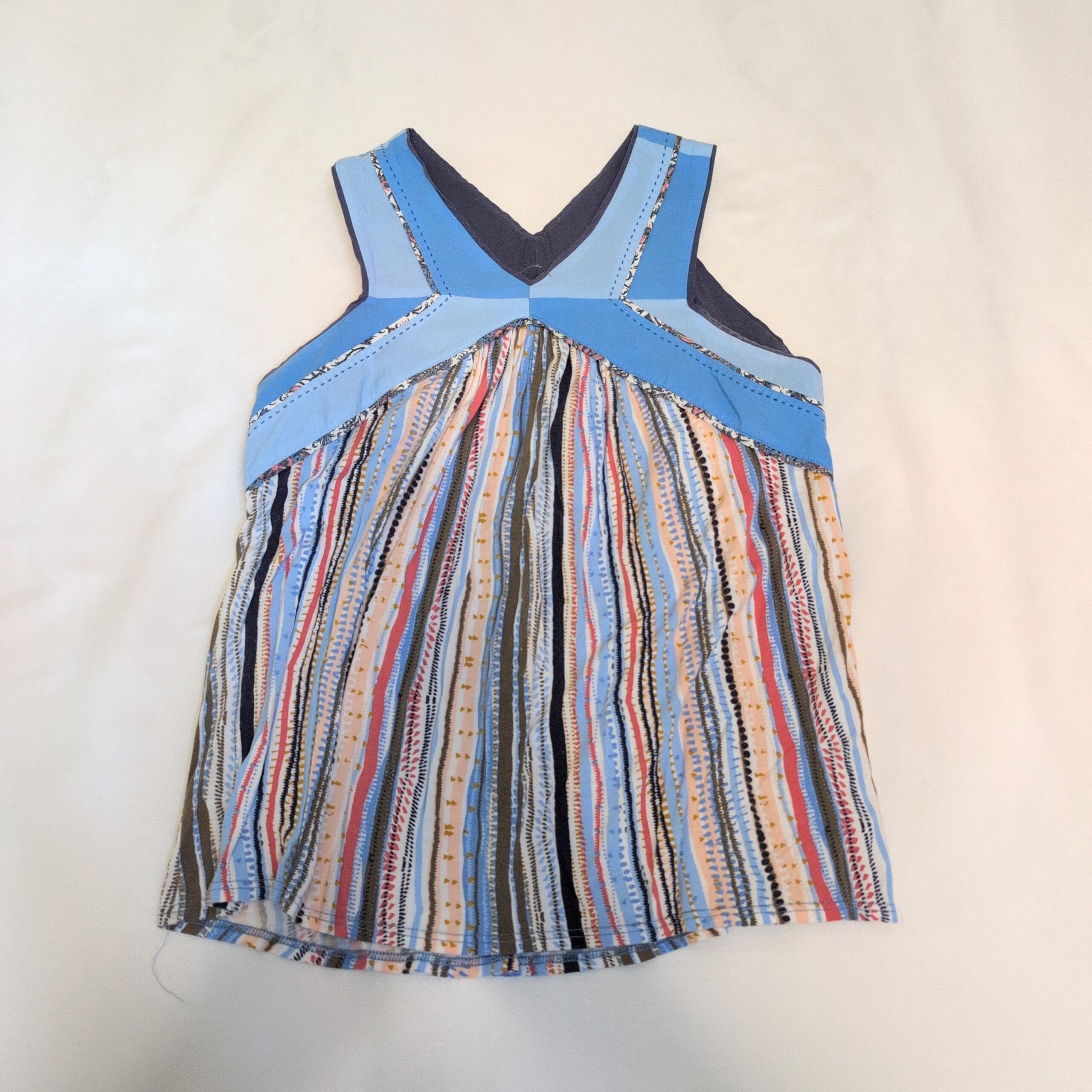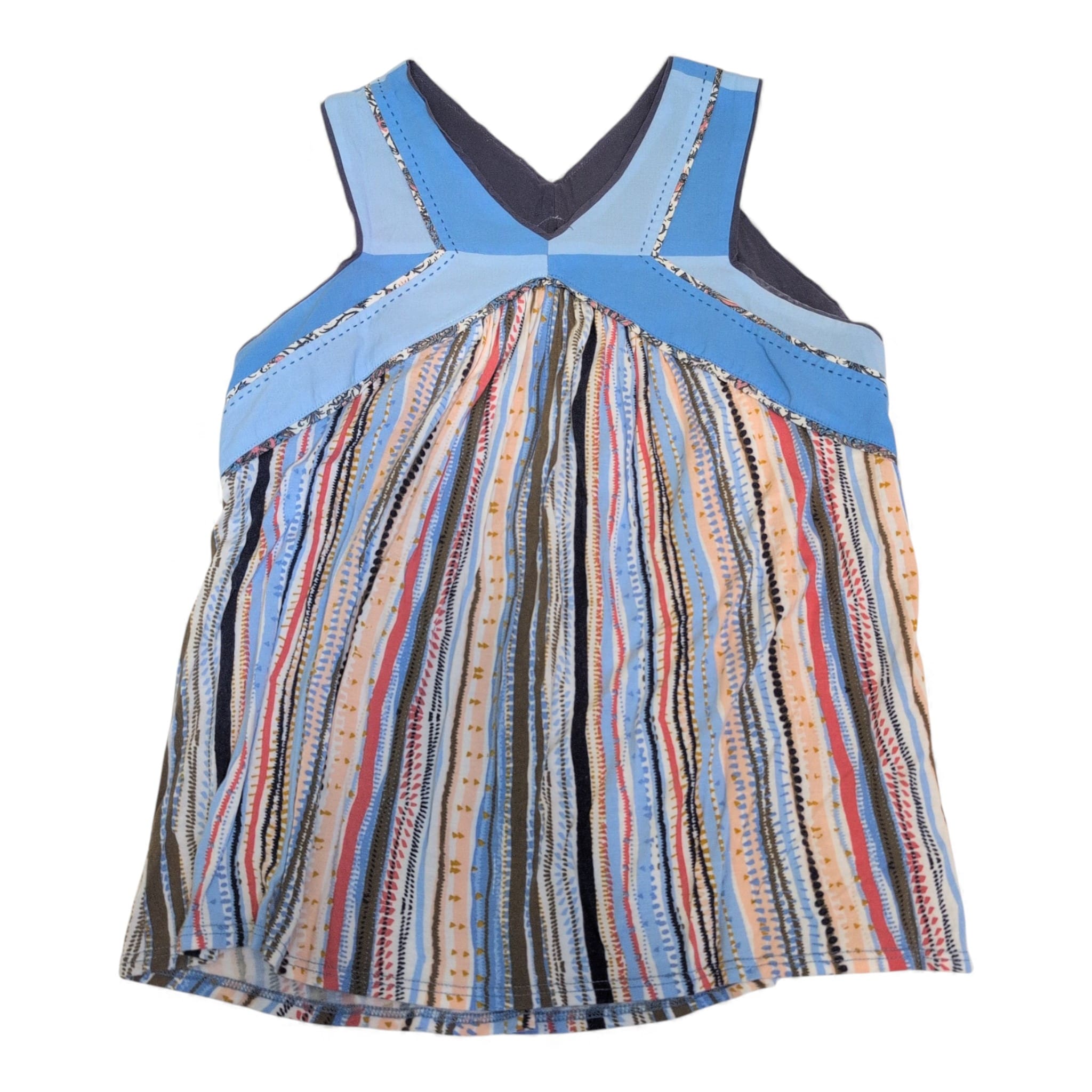 One September sleeveless blouse in size S. Features a V-neck, solid blue yoke with stitched detailing and a flowy, multicolor vertical striped body for a relaxed, boho-inspired silhouette. Lightweight pullover style—ideal for warm-weather layering or casual weekends. Gently used with light signs of wear consistent with pre-owned clothing.