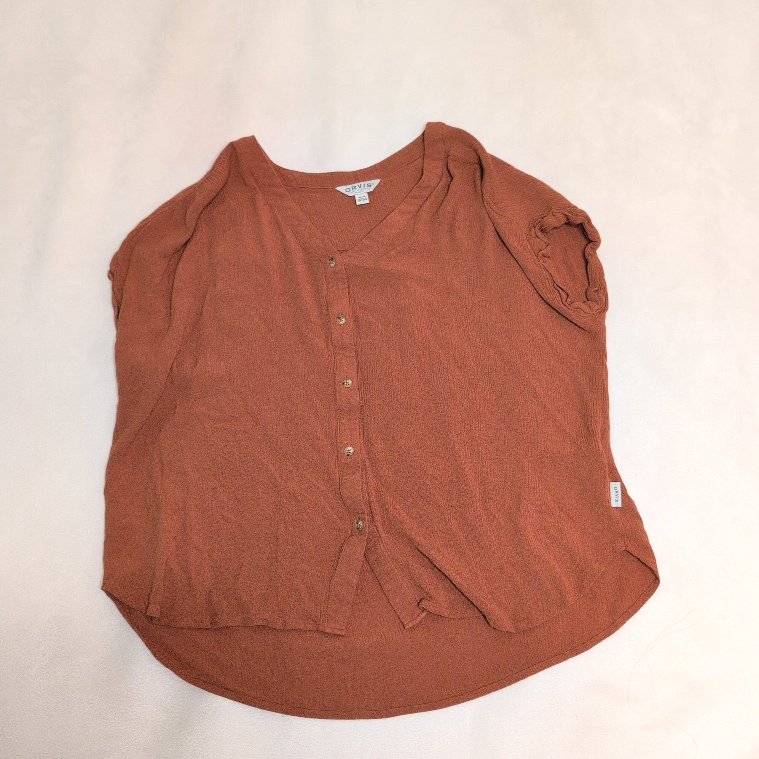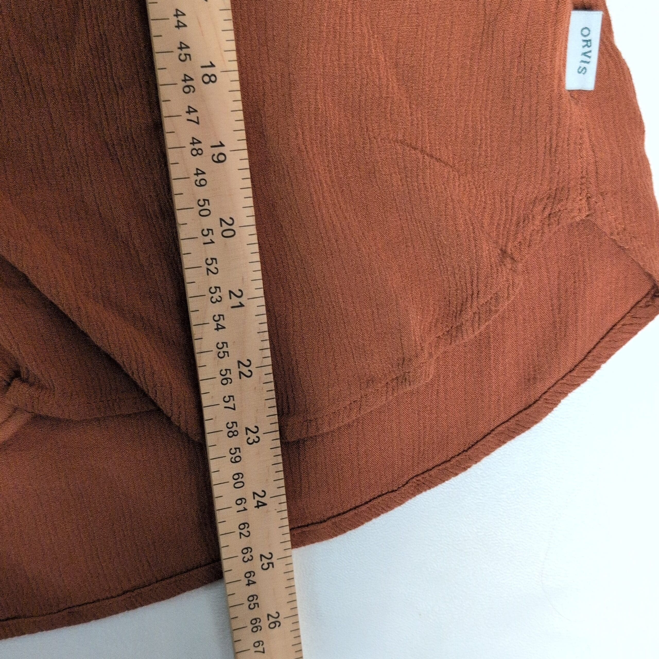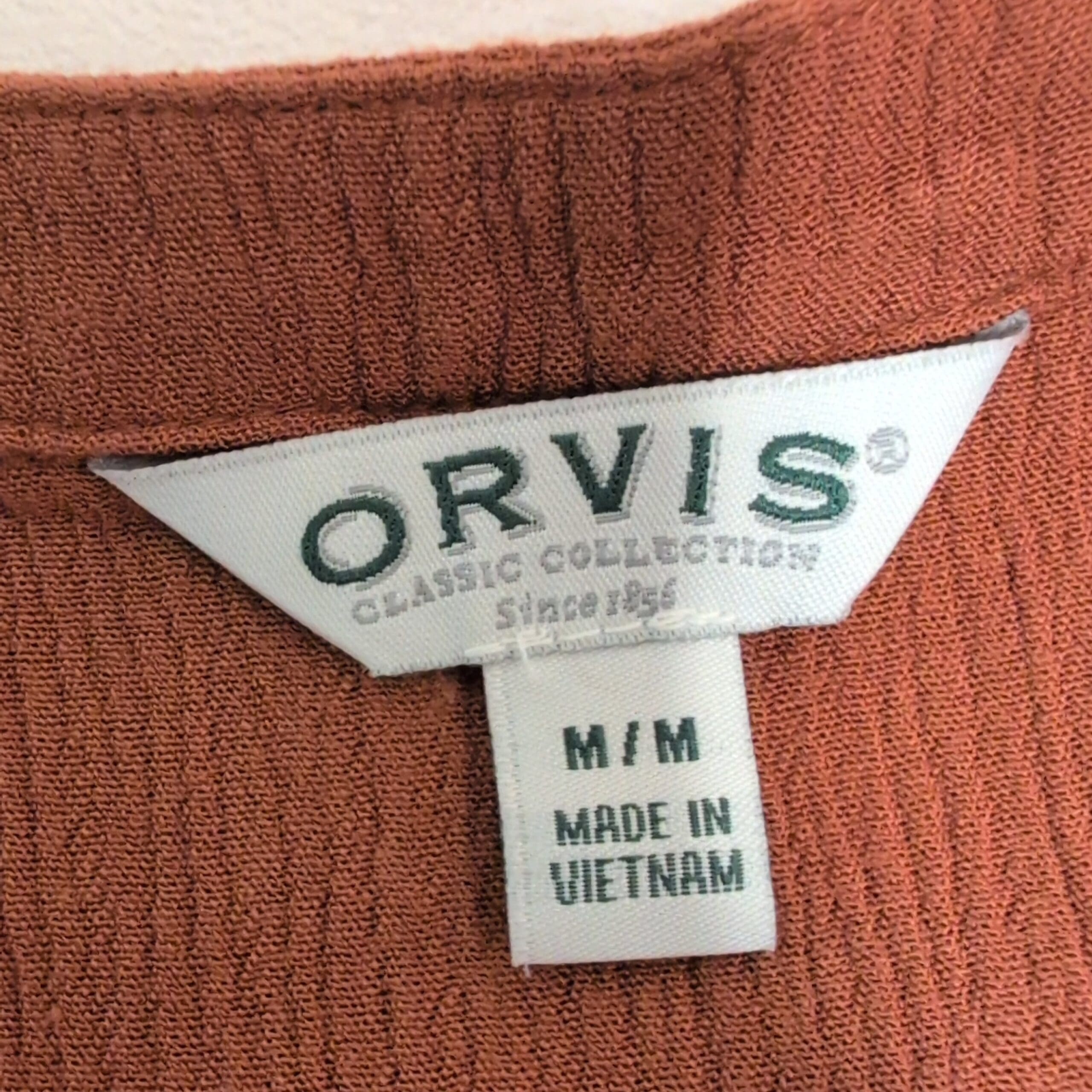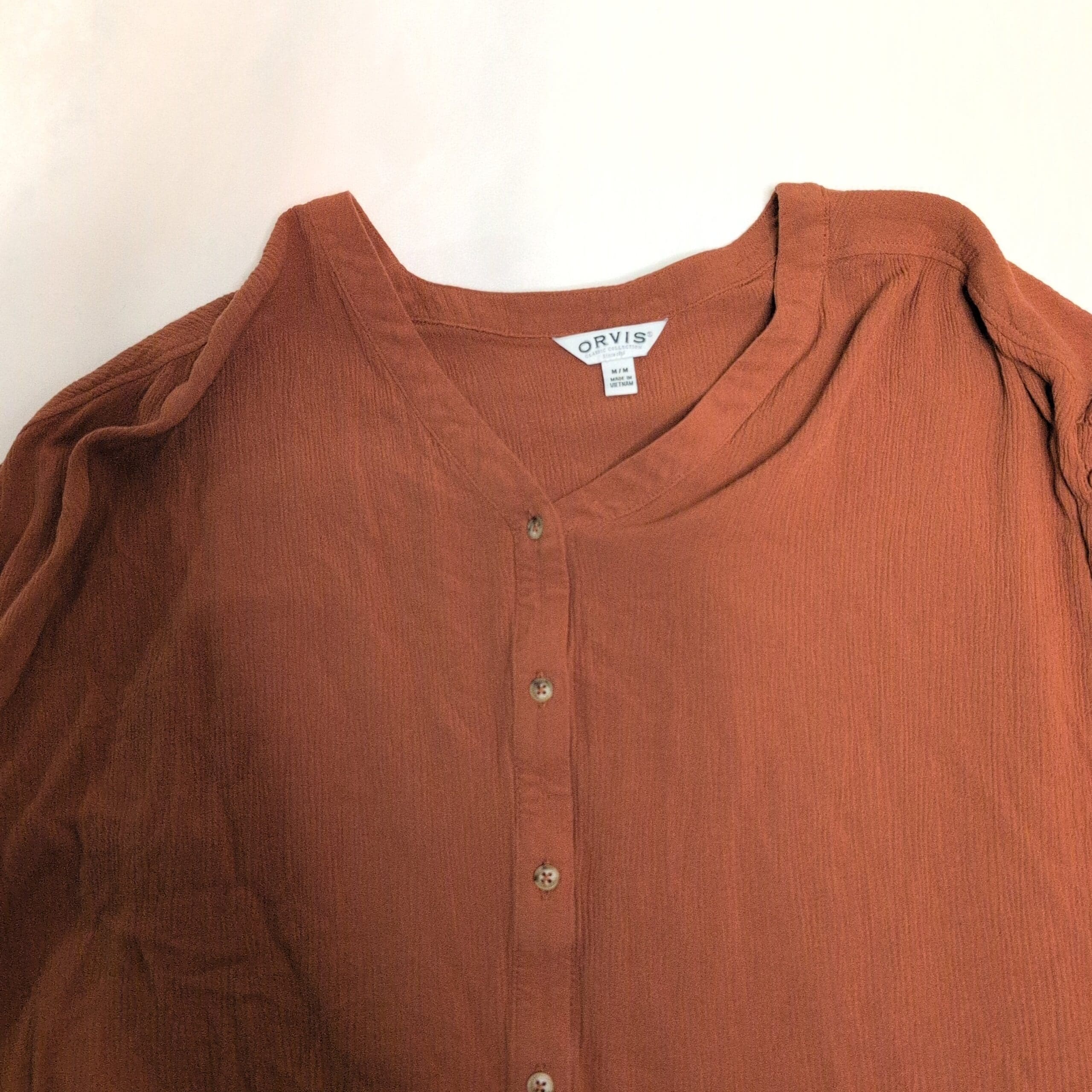 Lightweight Orvis women’s blouse in a warm burnt orange. Features a V-neck, button-front placket, short cap sleeves with subtle gathered detail, and a rounded hi-low hem for a relaxed, easy silhouette. Textured fabric drapes softly and pairs well with jeans or skirts for casual everyday wear. Gently used condition — free of major rips, tears, stains, or flaws; typical wear may be present. Quality notes: burnt orange.