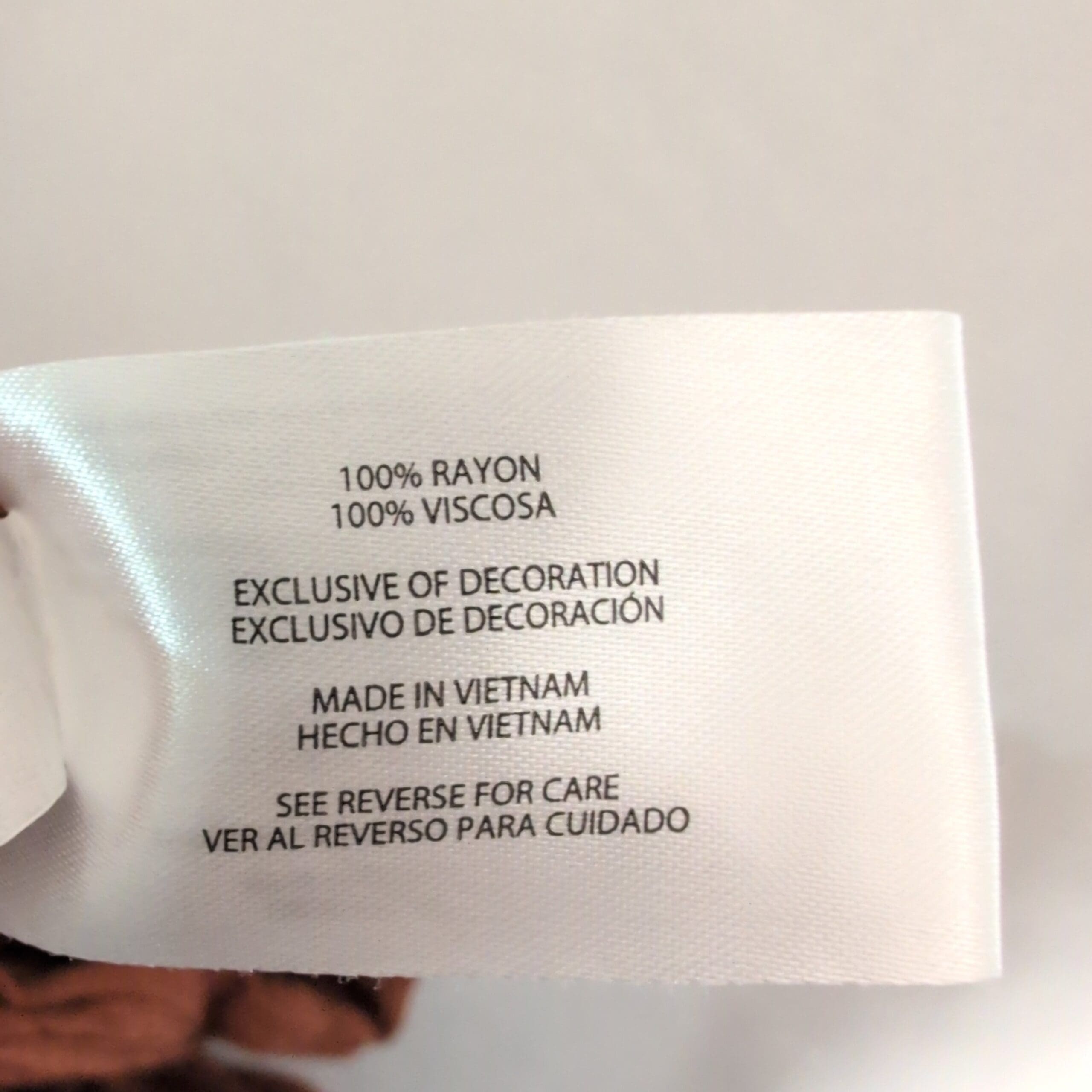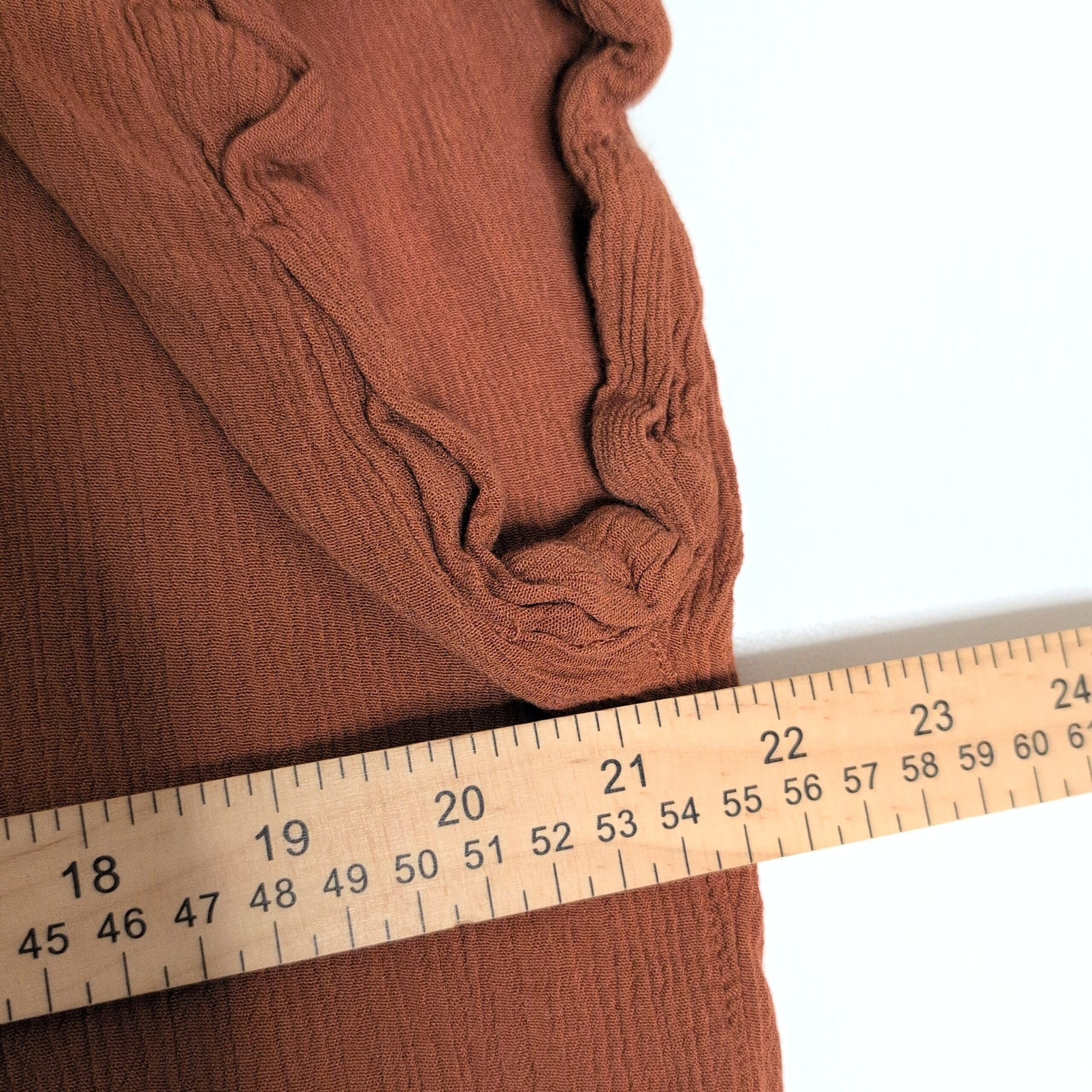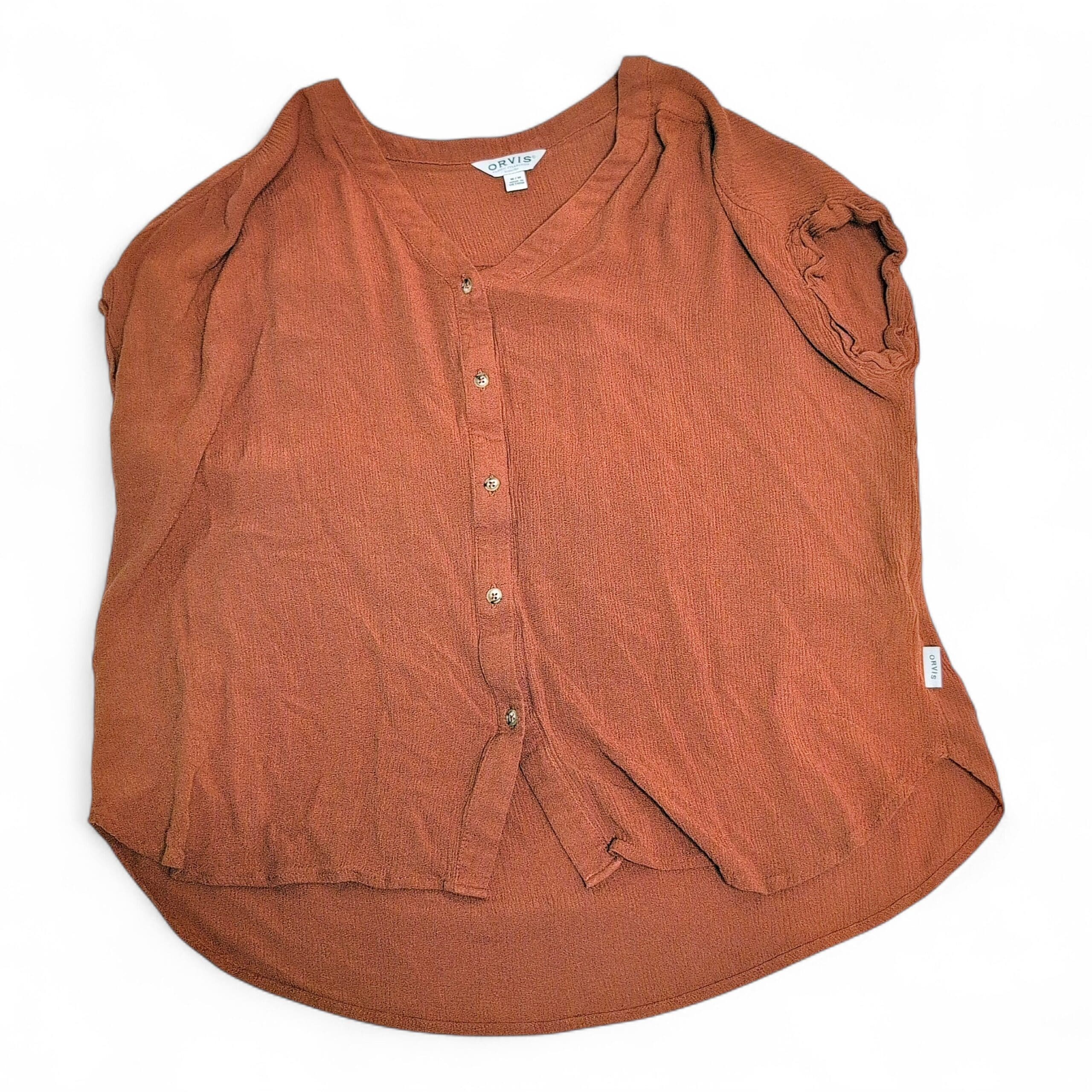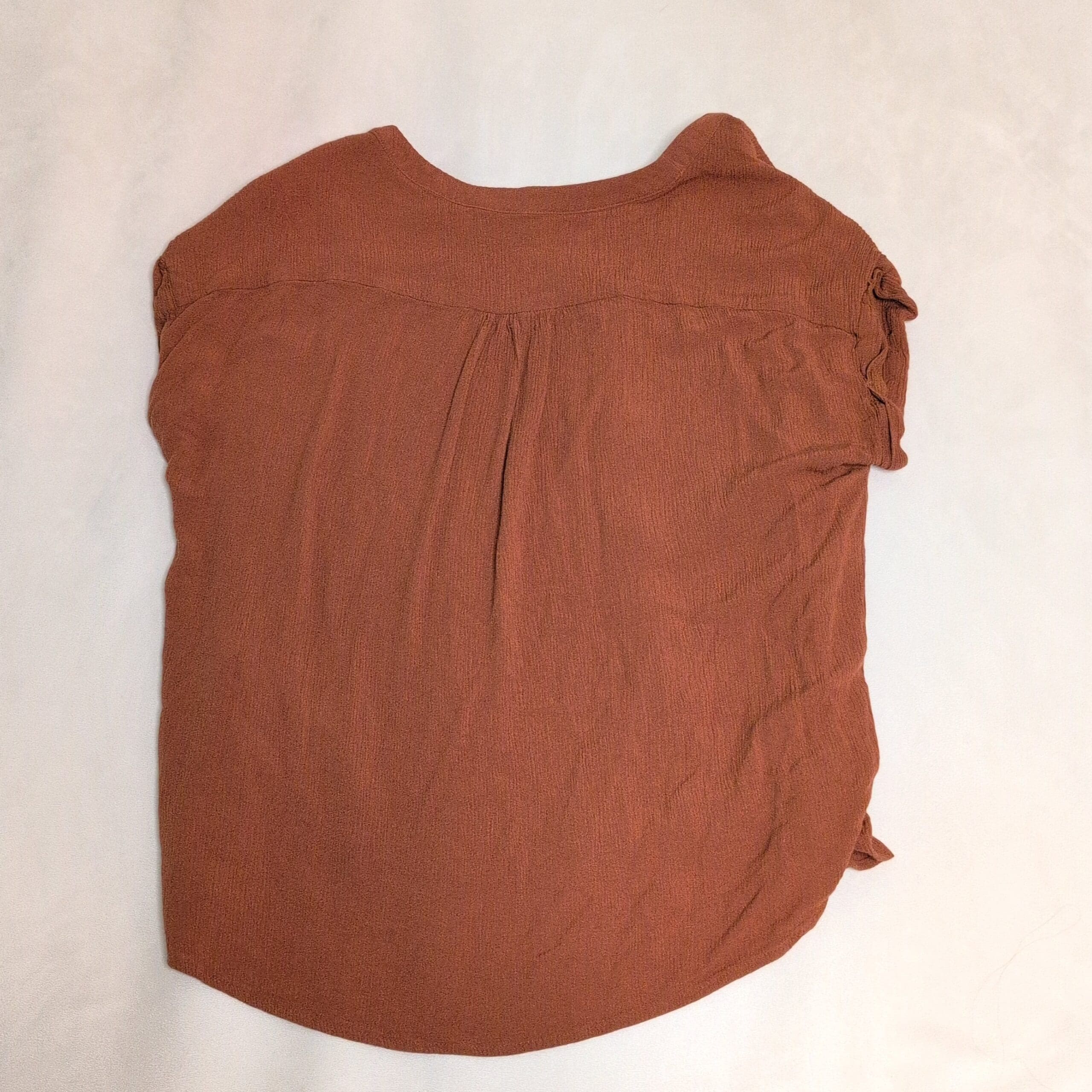 Lightweight Orvis women’s blouse in a warm burnt orange. Features a V-neck, button-front placket, short cap sleeves with subtle gathered detail, and a rounded hi-low hem for a relaxed, easy silhouette. Textured fabric drapes softly and pairs well with jeans or skirts for casual everyday wear. Gently used condition — free of major rips, tears, stains, or flaws; typical wear may be present. Quality notes: burnt orange.
