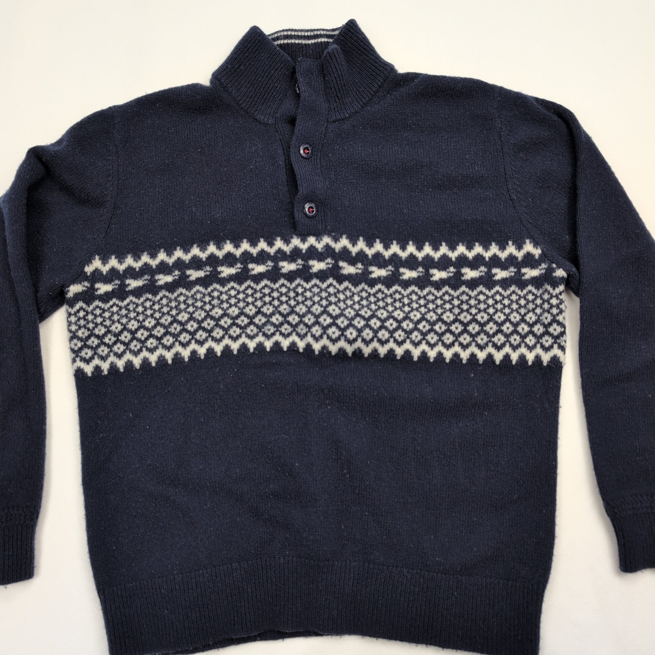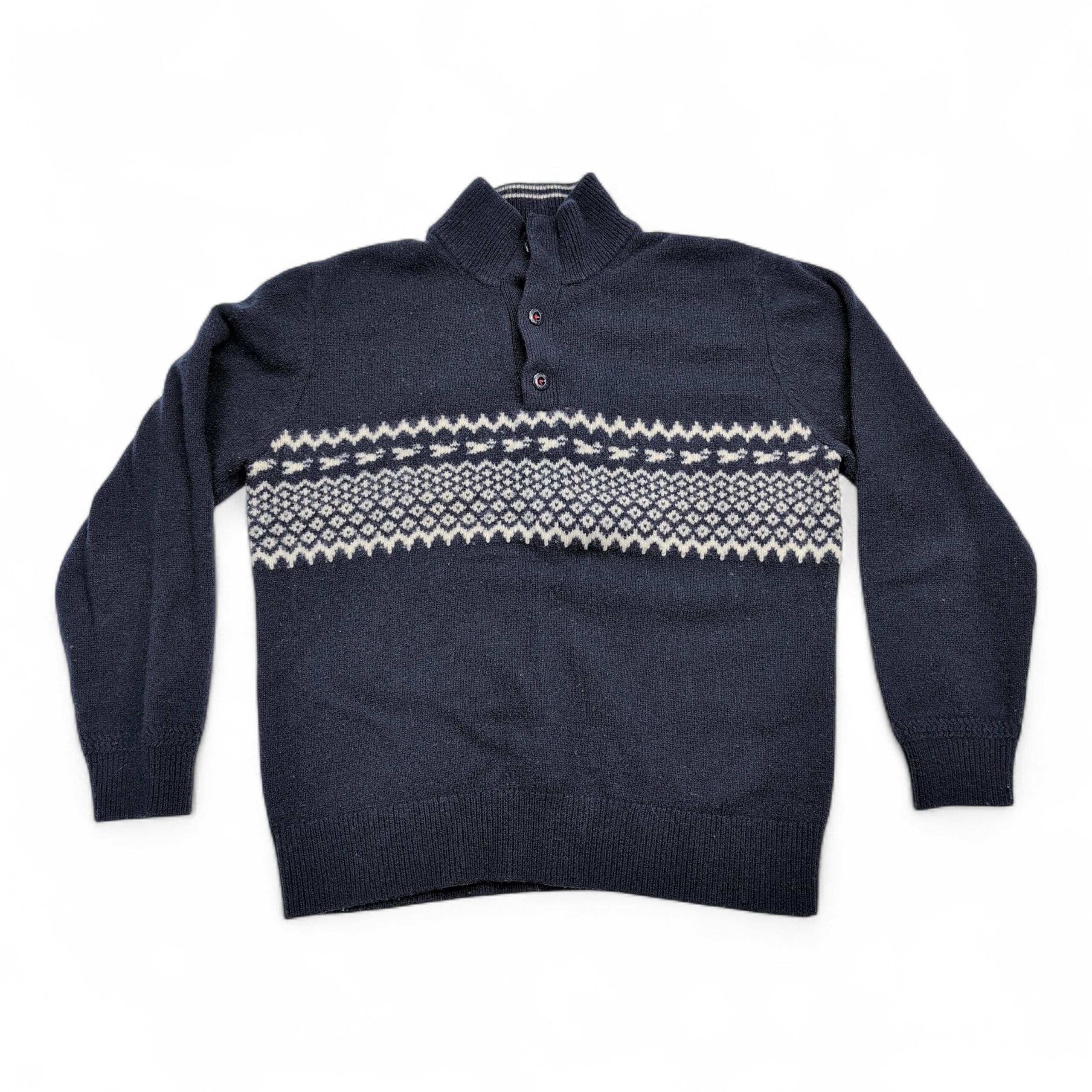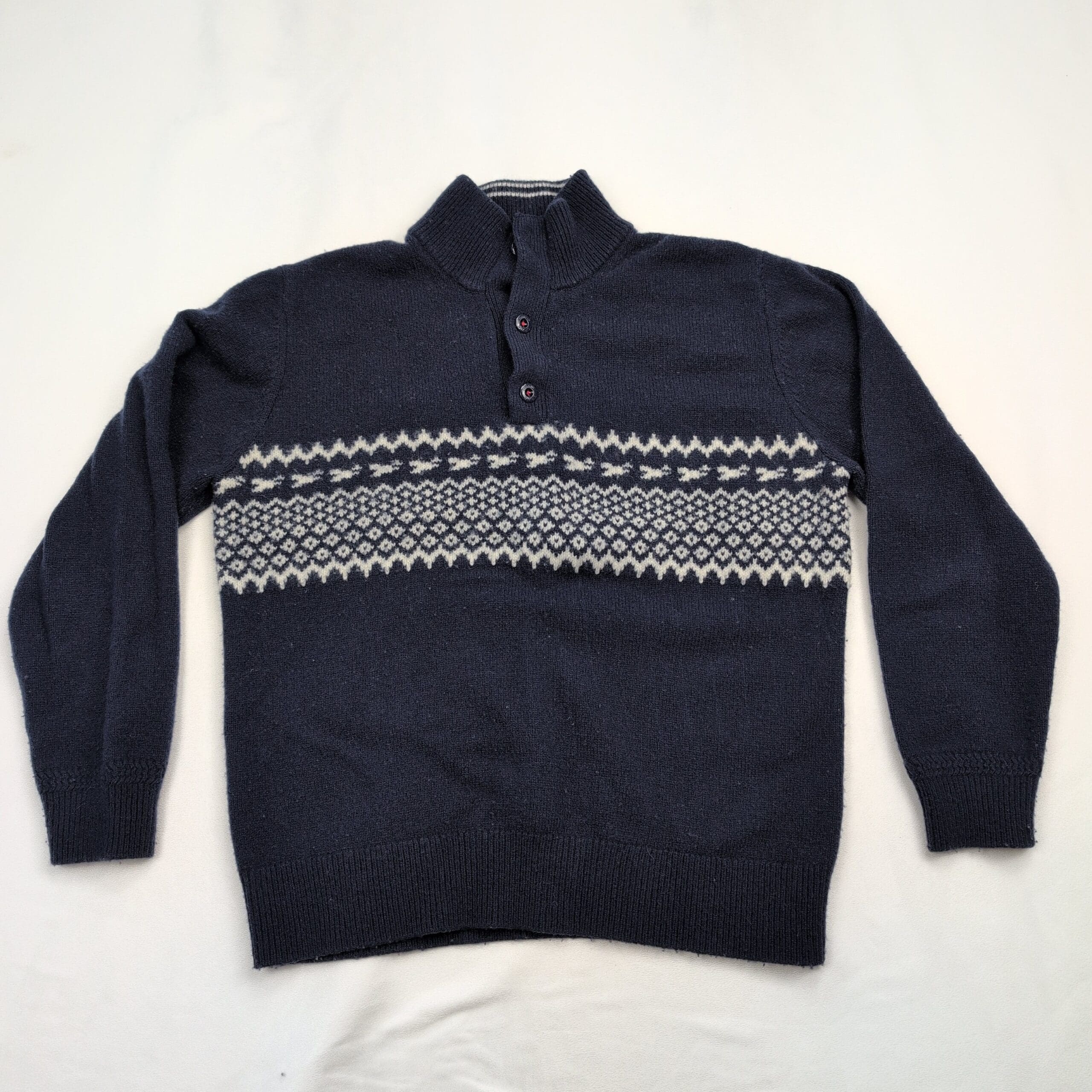 Orvis men’s sweater, size L. Classic navy knit with an ivory Fair Isle band across the chest and a mock/stand collar with a three-button placket for a timeless, outdoorsy look. Medium-weight knit that layers well for cool weather and casual weekends. Excellent used condition — no major rips, stains, or flaws; shows light, gentle surface pilling consistent with normal wear (see photos). A versatile wardrobe staple that pairs well with jeans or chinos.