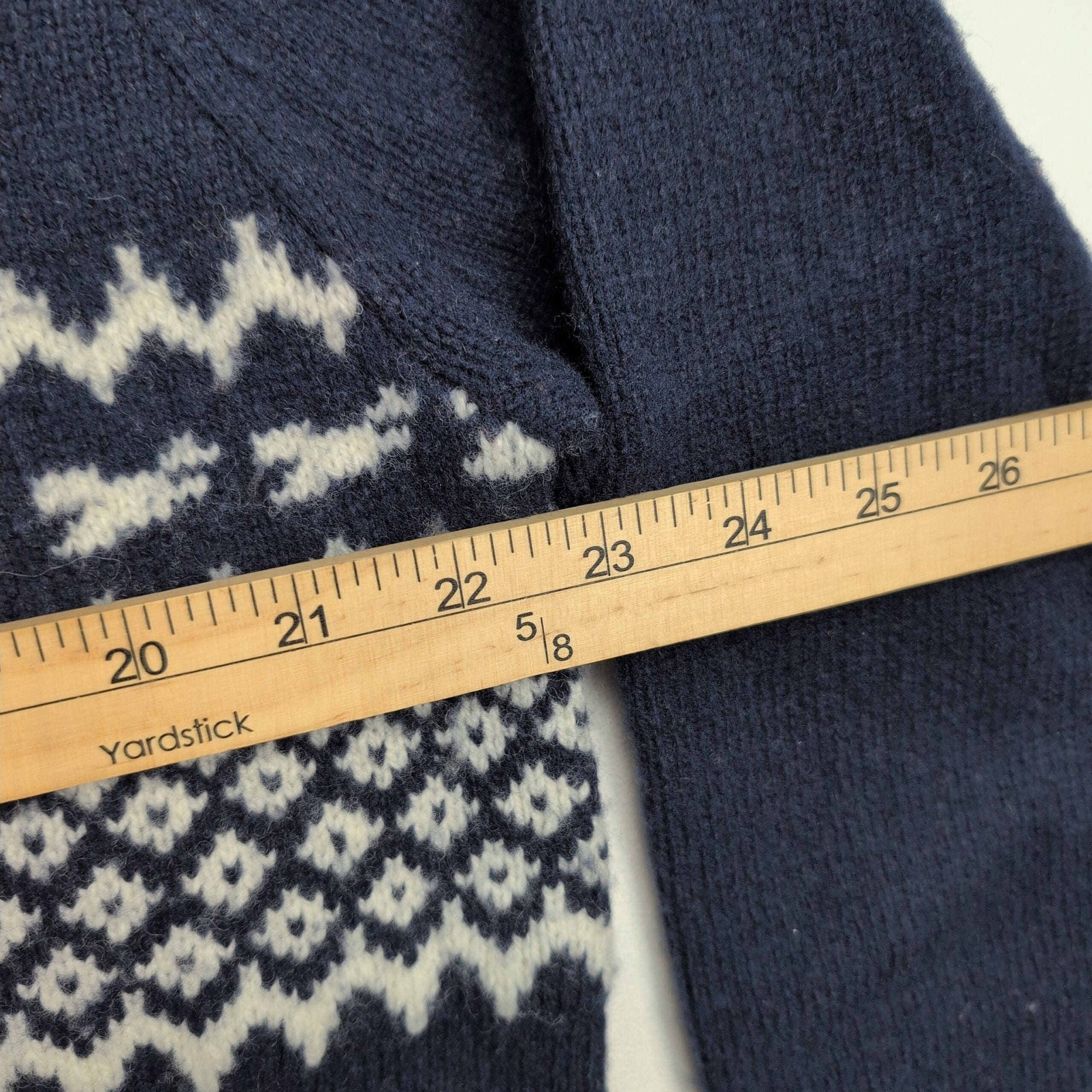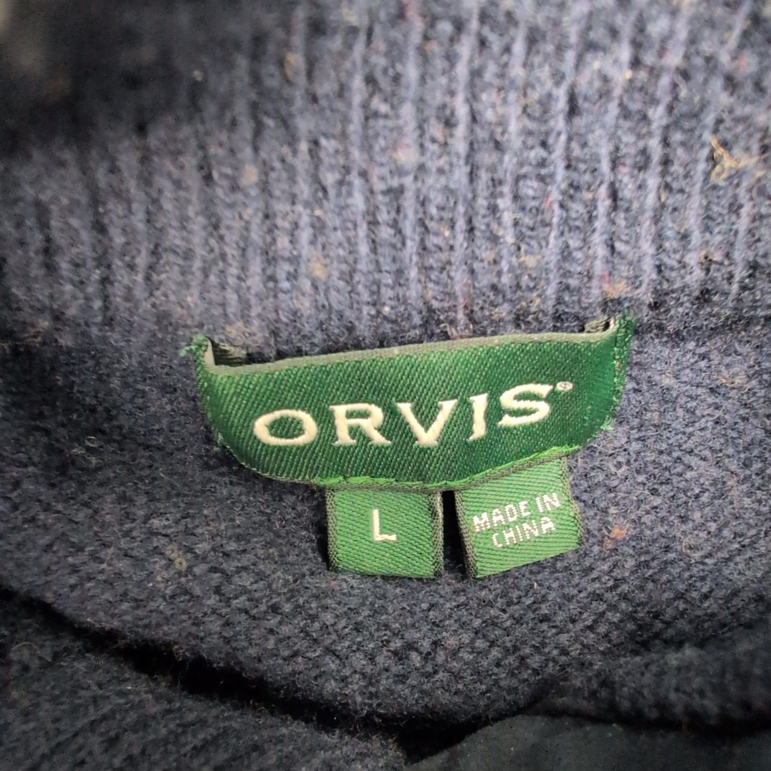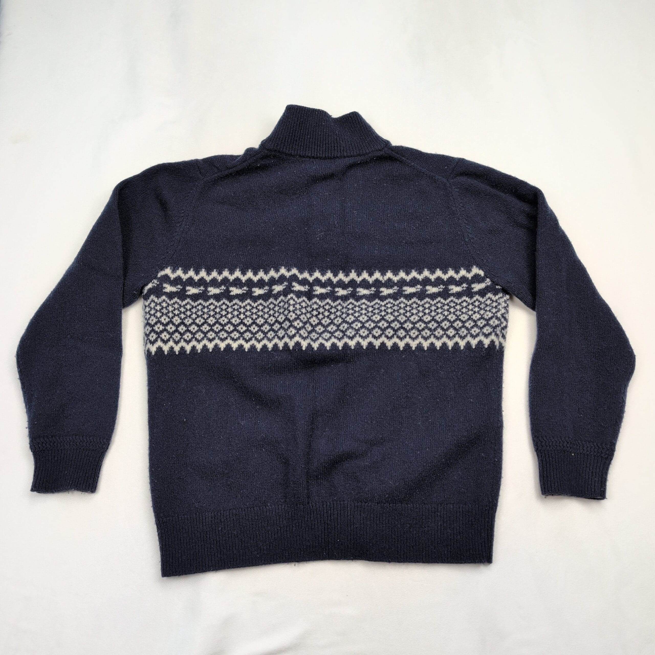 Orvis men’s sweater, size L. Classic navy knit with an ivory Fair Isle band across the chest and a mock/stand collar with a three-button placket for a timeless, outdoorsy look. Medium-weight knit that layers well for cool weather and casual weekends. Excellent used condition — no major rips, stains, or flaws; shows light, gentle surface pilling consistent with normal wear (see photos). A versatile wardrobe staple that pairs well with jeans or chinos.