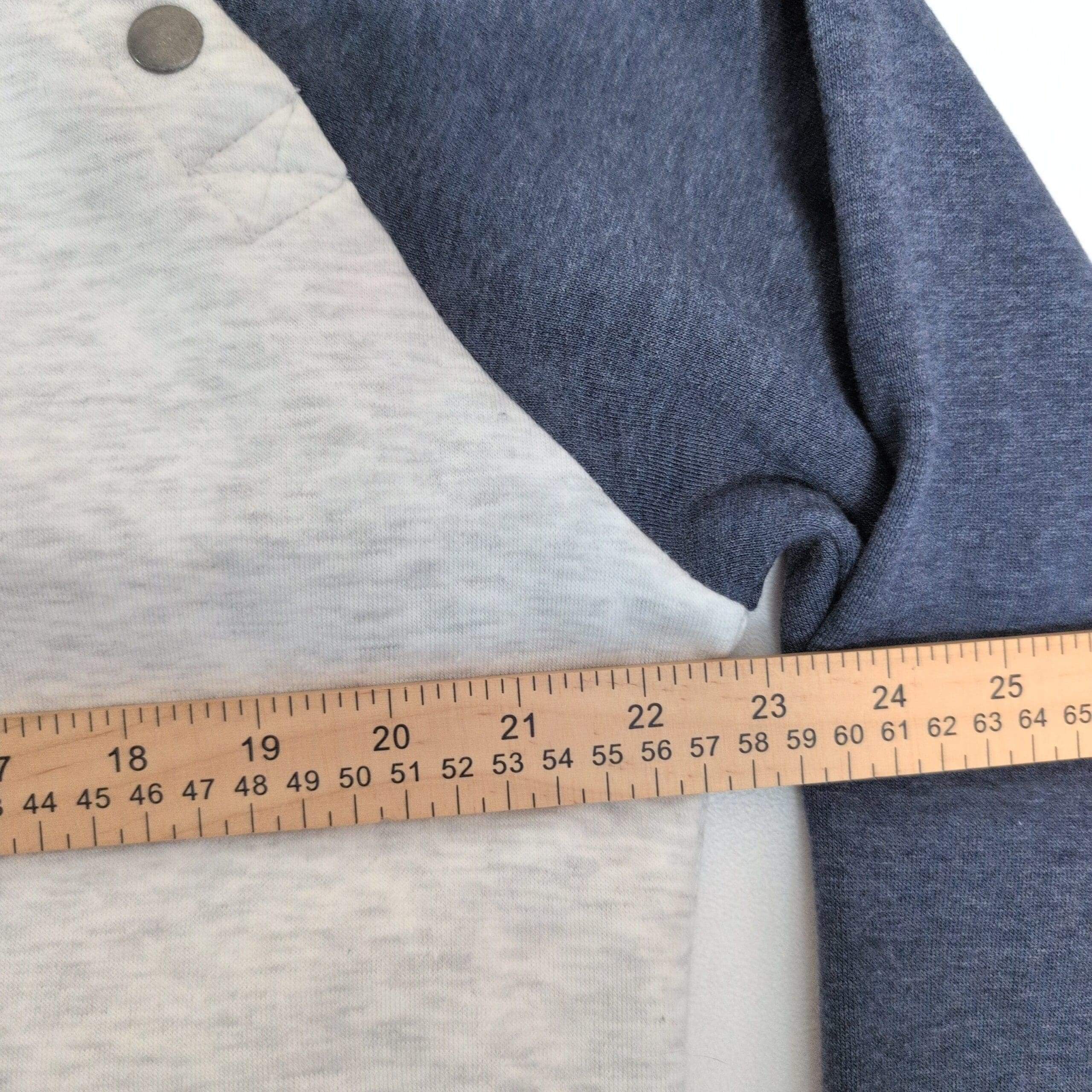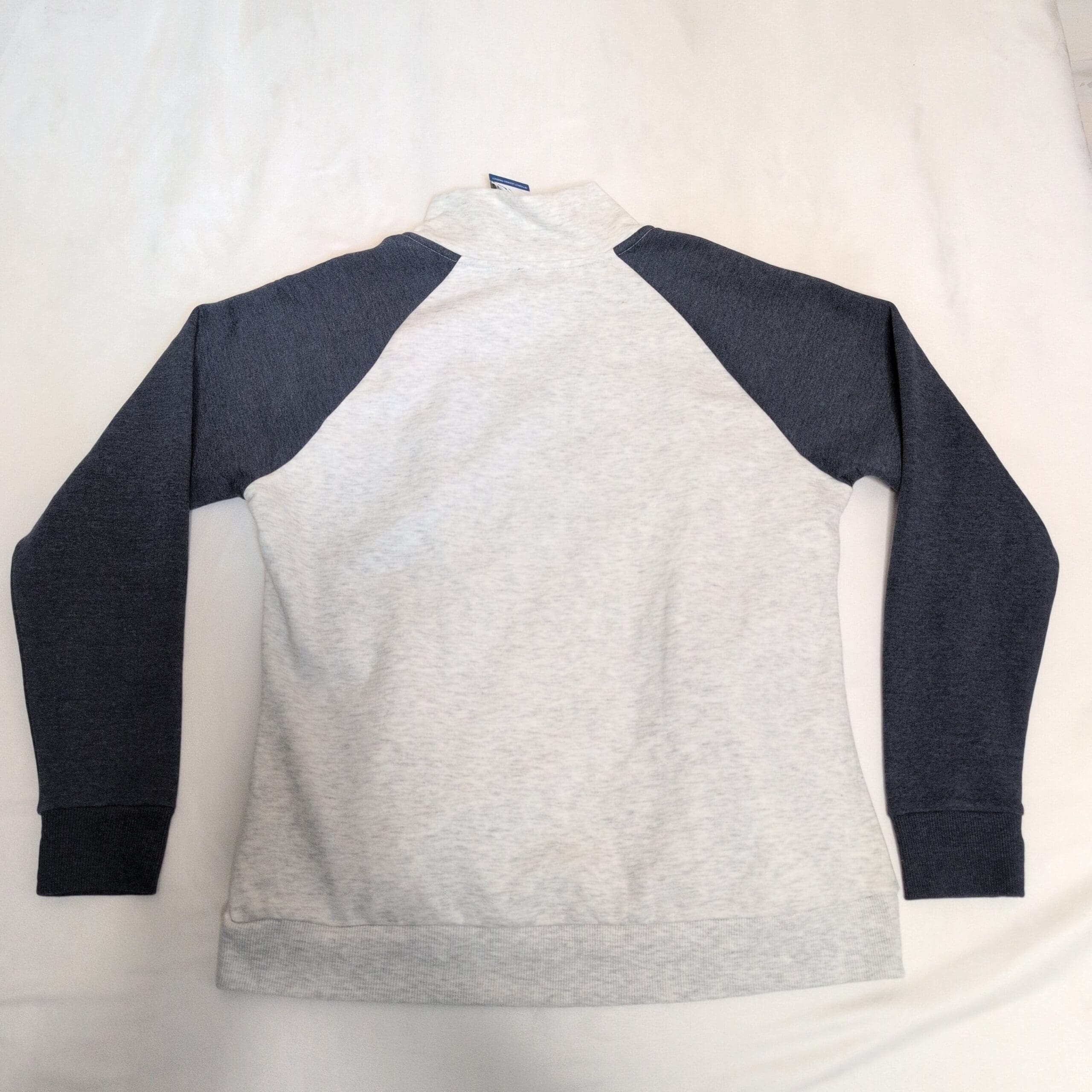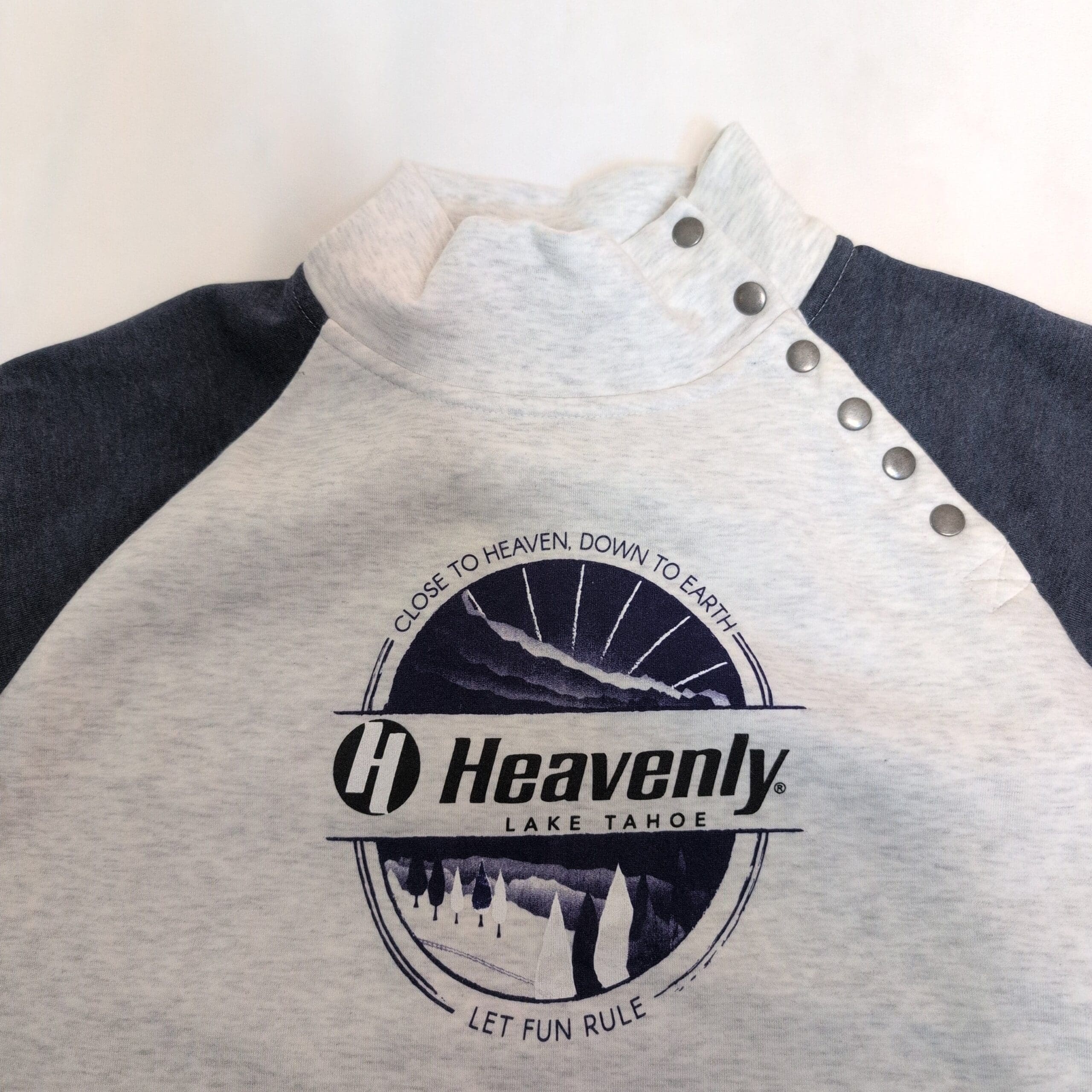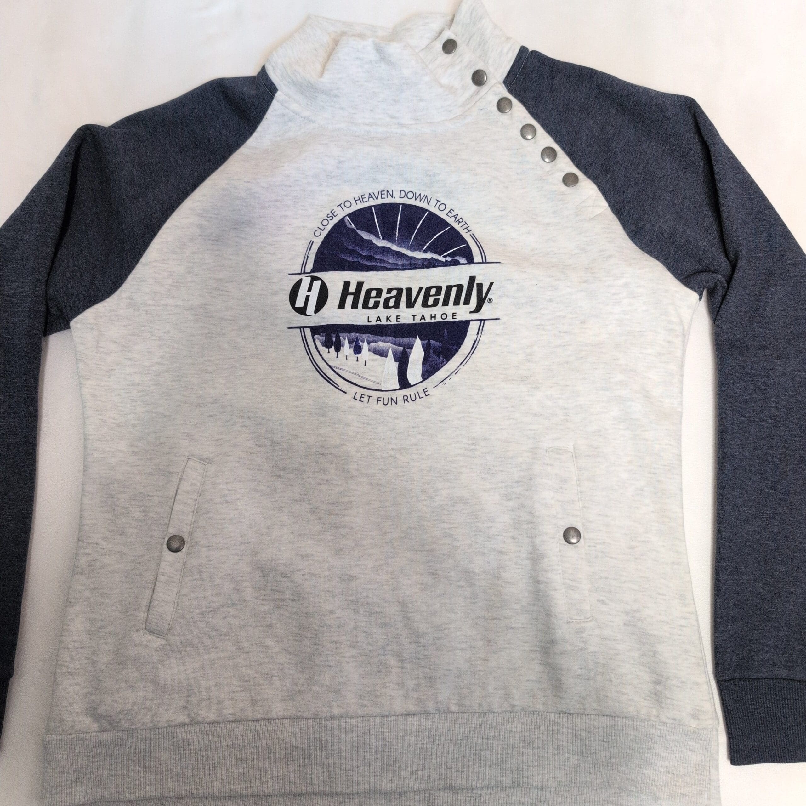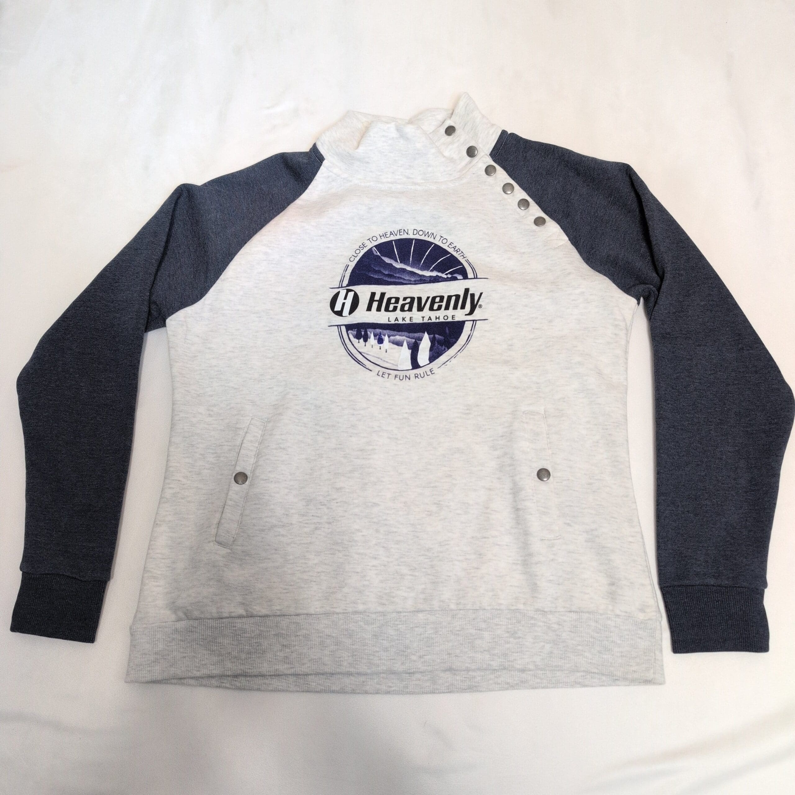 Light heather gray pullover sweatshirt by Ouray featuring navy raglan sleeves and a bold “Heavenly Lake Tahoe” chest graphic. Size L (men). Snap-button high mock neck with shoulder snaps, front hand-warmer pockets with snap closures, and ribbed cuffs and hem for a comfortable fit. Soft midweight fabric perfect for layering during cool weather; great for casual wear or resort days. Pre-owned and in great condition.