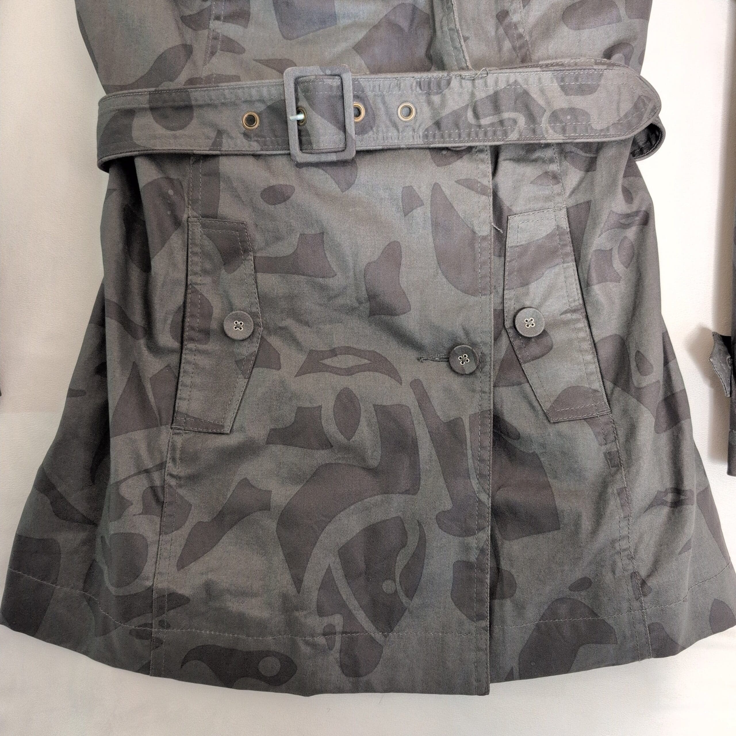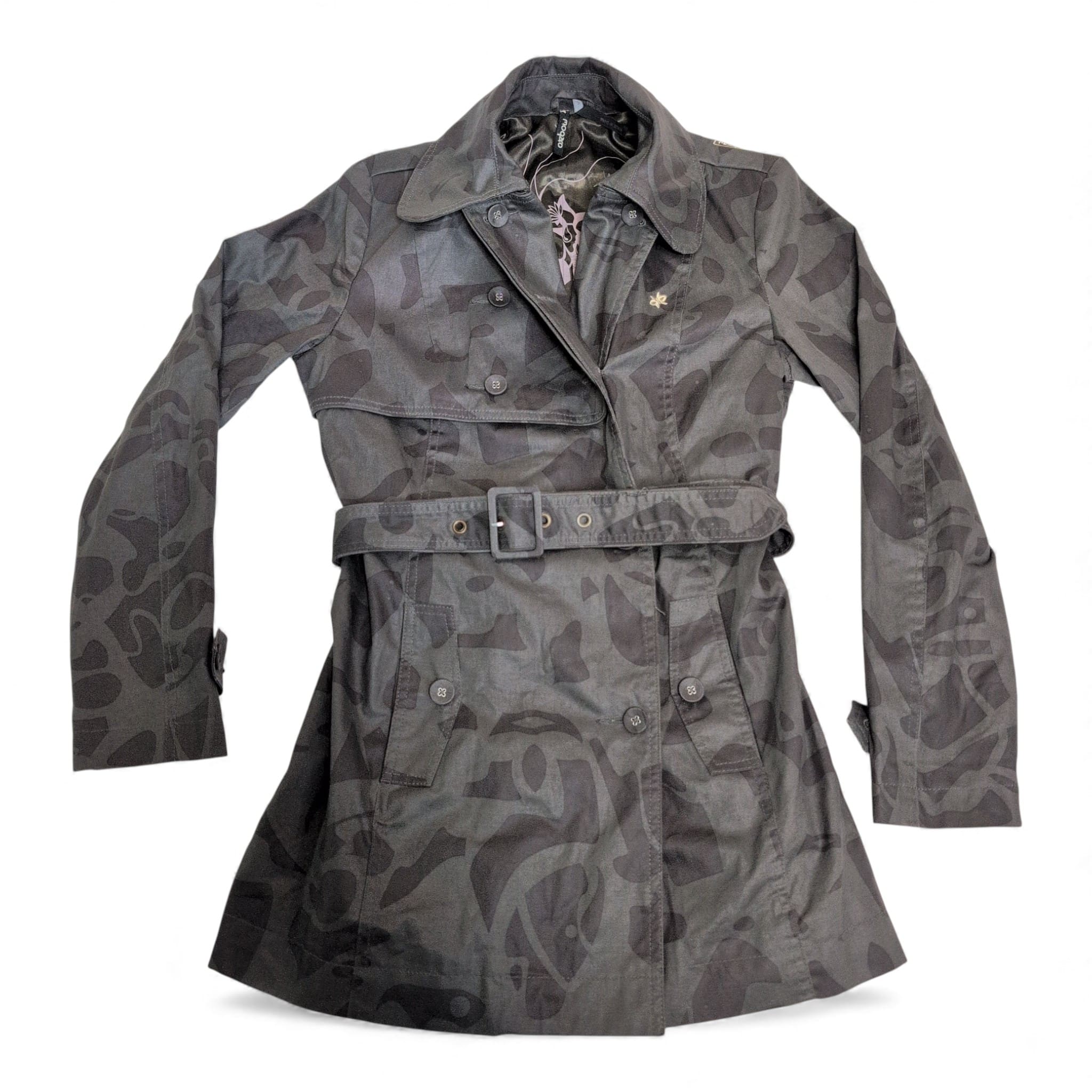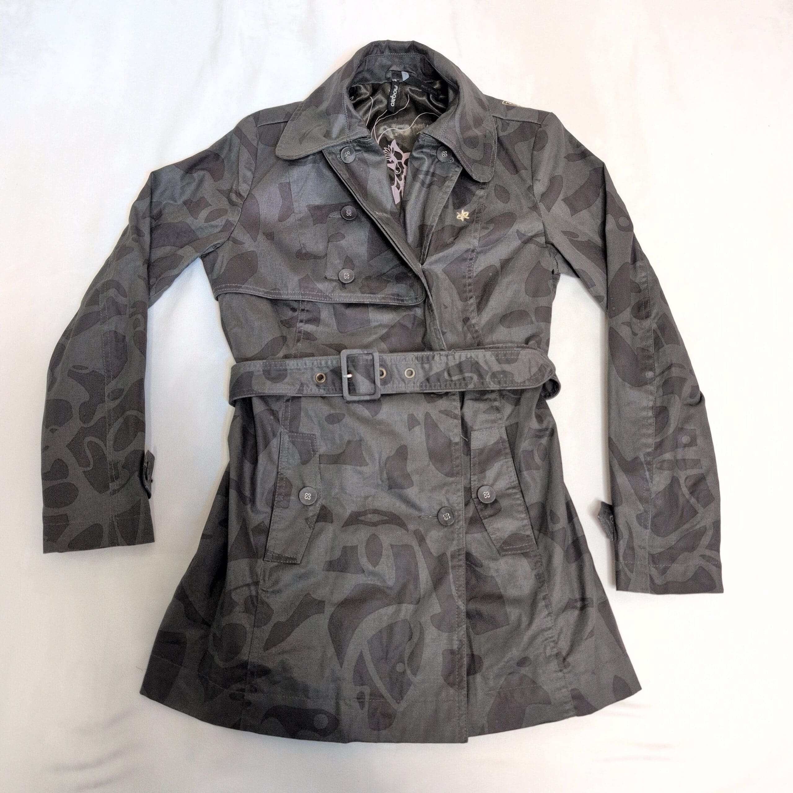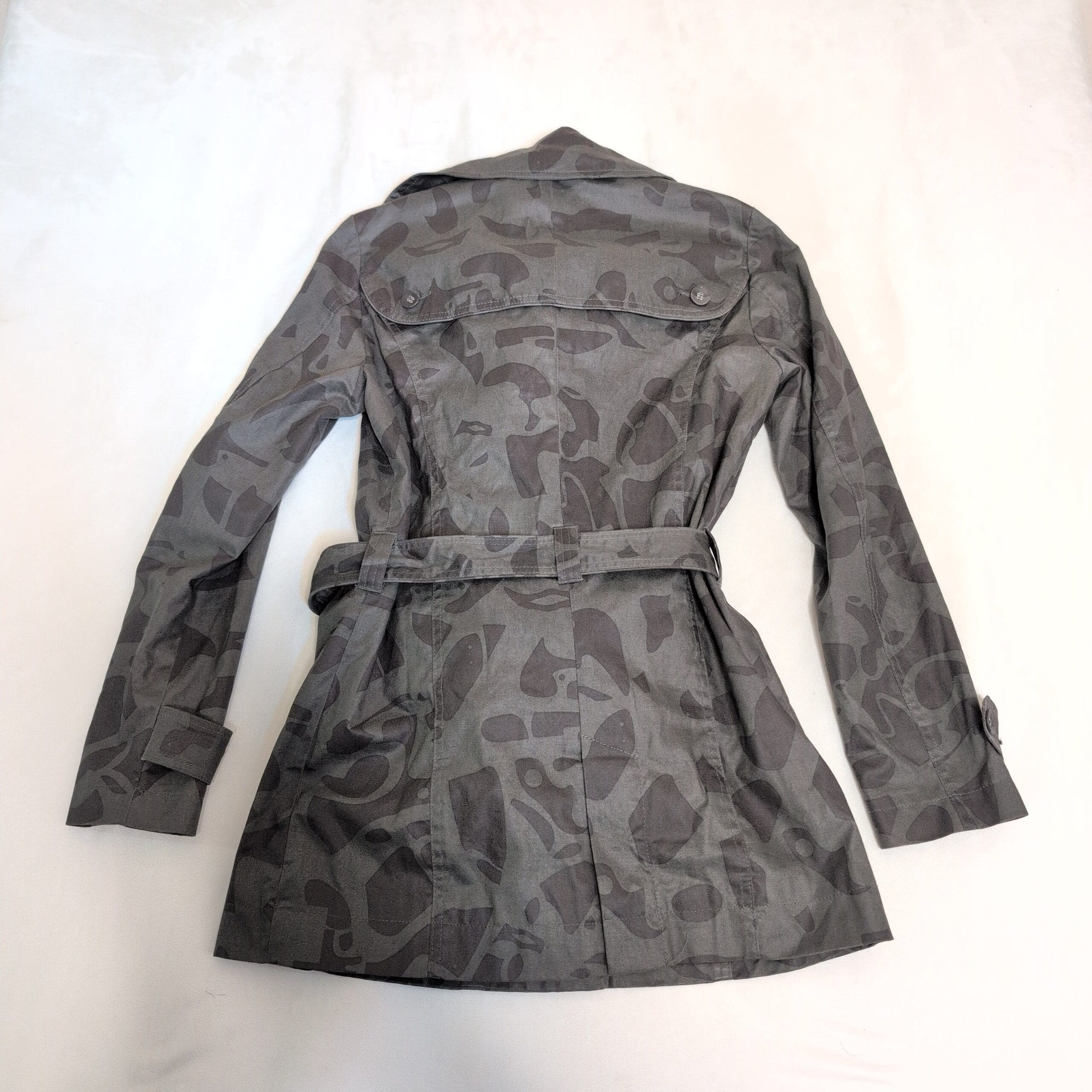 Oxbow women’s gray trench coat in size 2. Classic double-breasted silhouette with button front, adjustable belted waist with square buckle, cuff tabs, button-flap pockets, and a patterned interior lining. Subtle tonal abstract print across the shell gives a modern edge to the timeless trench design. Tailored fit that’s great for layering over sweaters or dresses. Pre-owned in excellent overall condition with minimal signs of wear.