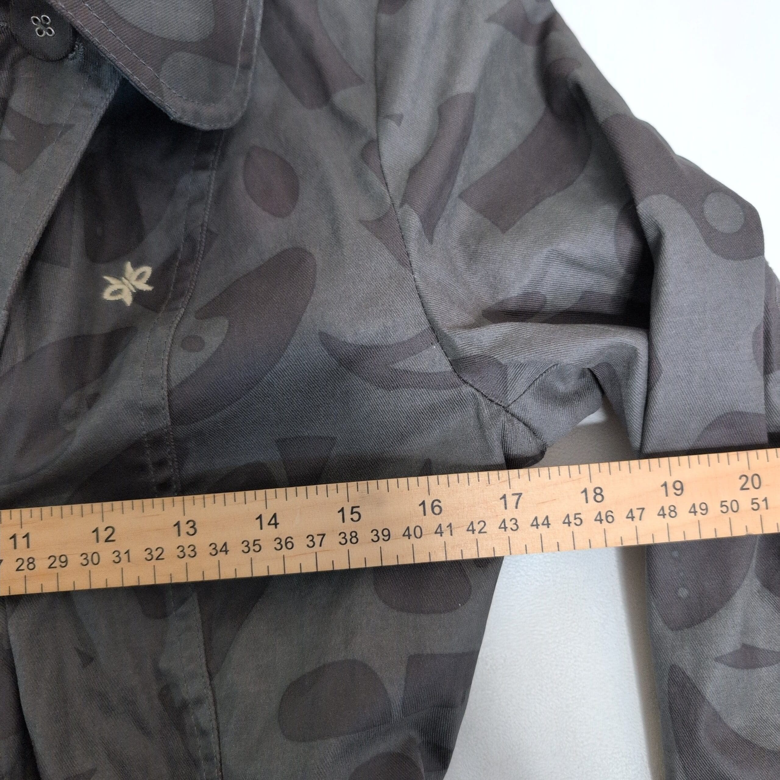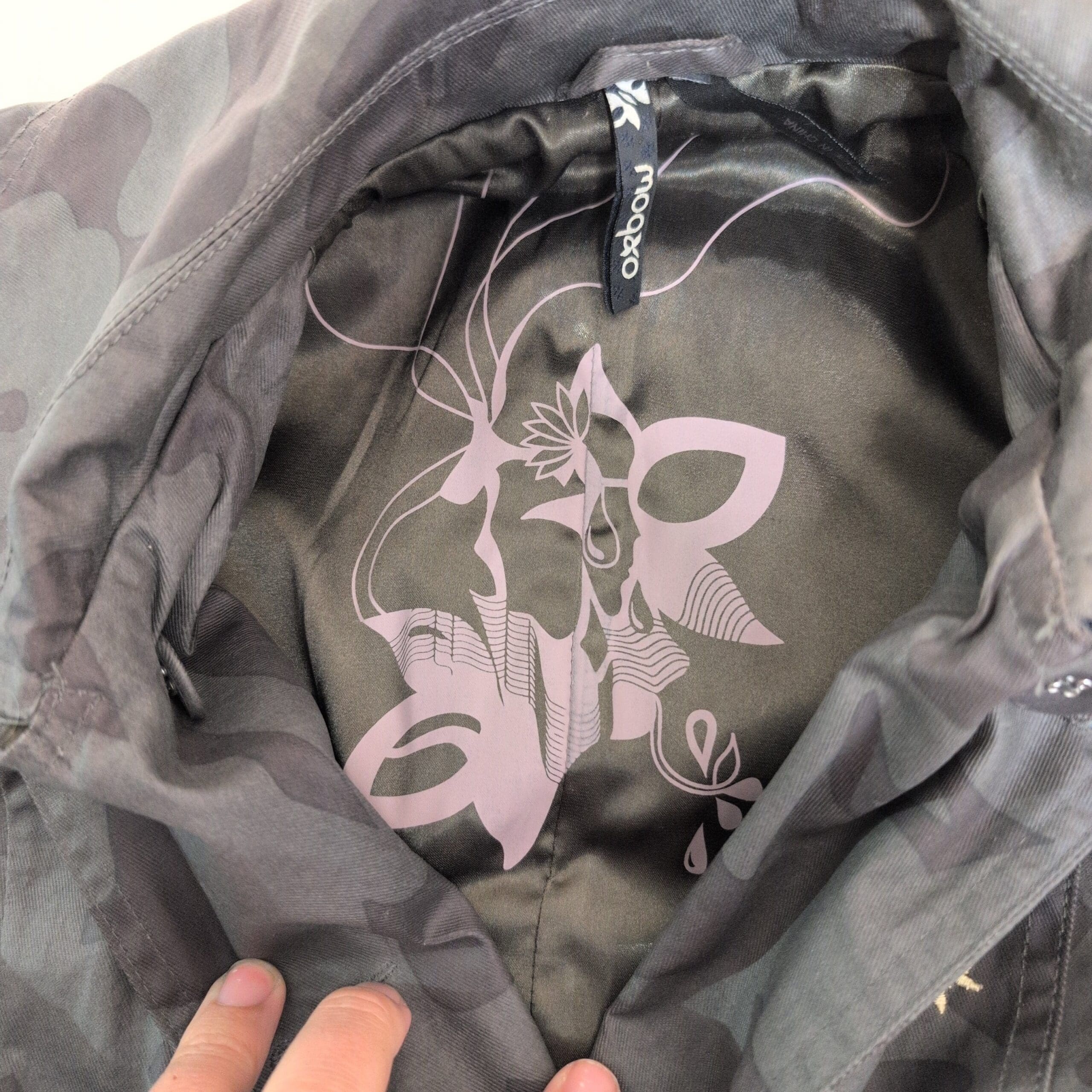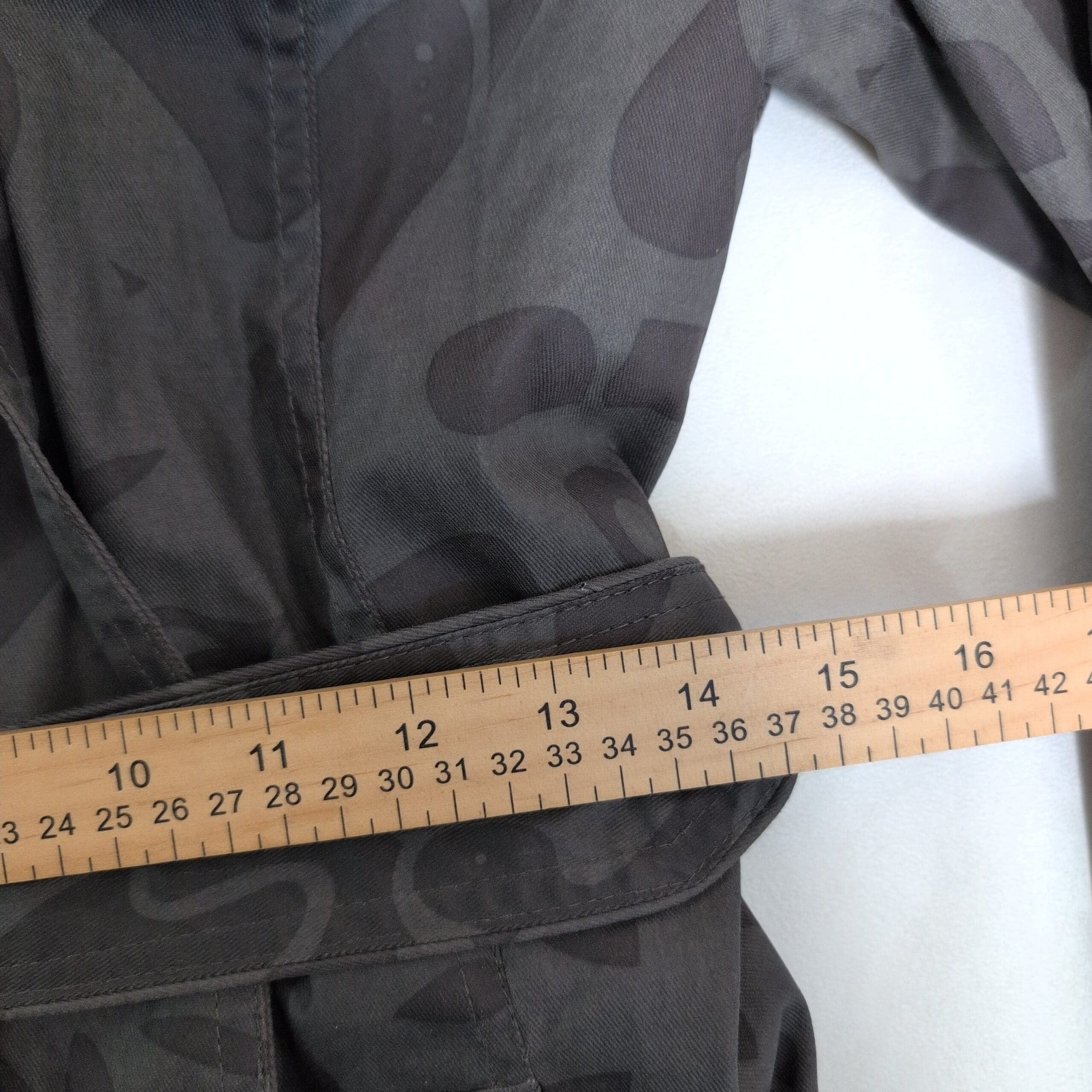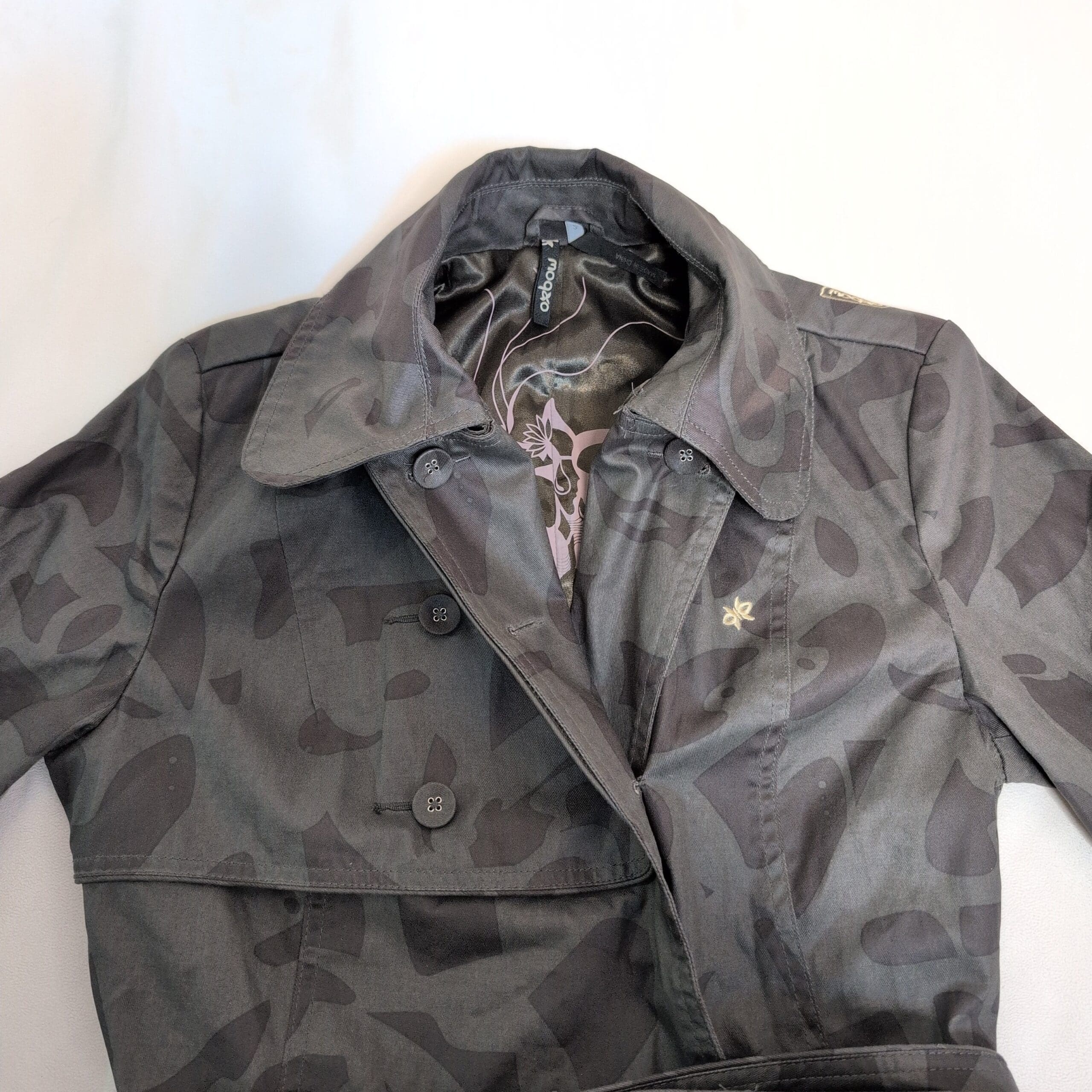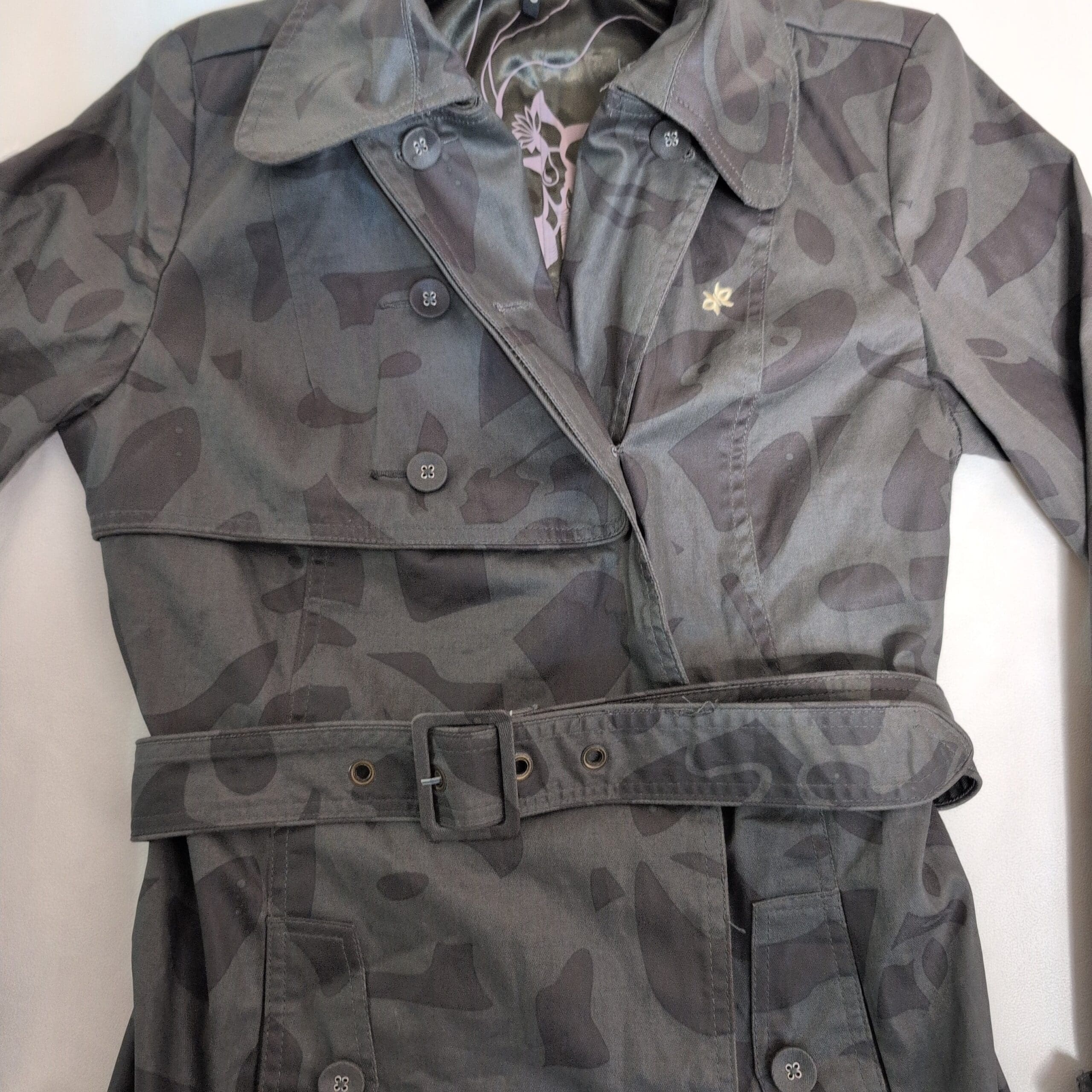 Oxbow women’s gray trench coat in size 2. Classic double-breasted silhouette with button front, adjustable belted waist with square buckle, cuff tabs, button-flap pockets, and a patterned interior lining. Subtle tonal abstract print across the shell gives a modern edge to the timeless trench design. Tailored fit that’s great for layering over sweaters or dresses. Pre-owned in excellent overall condition with minimal signs of wear.