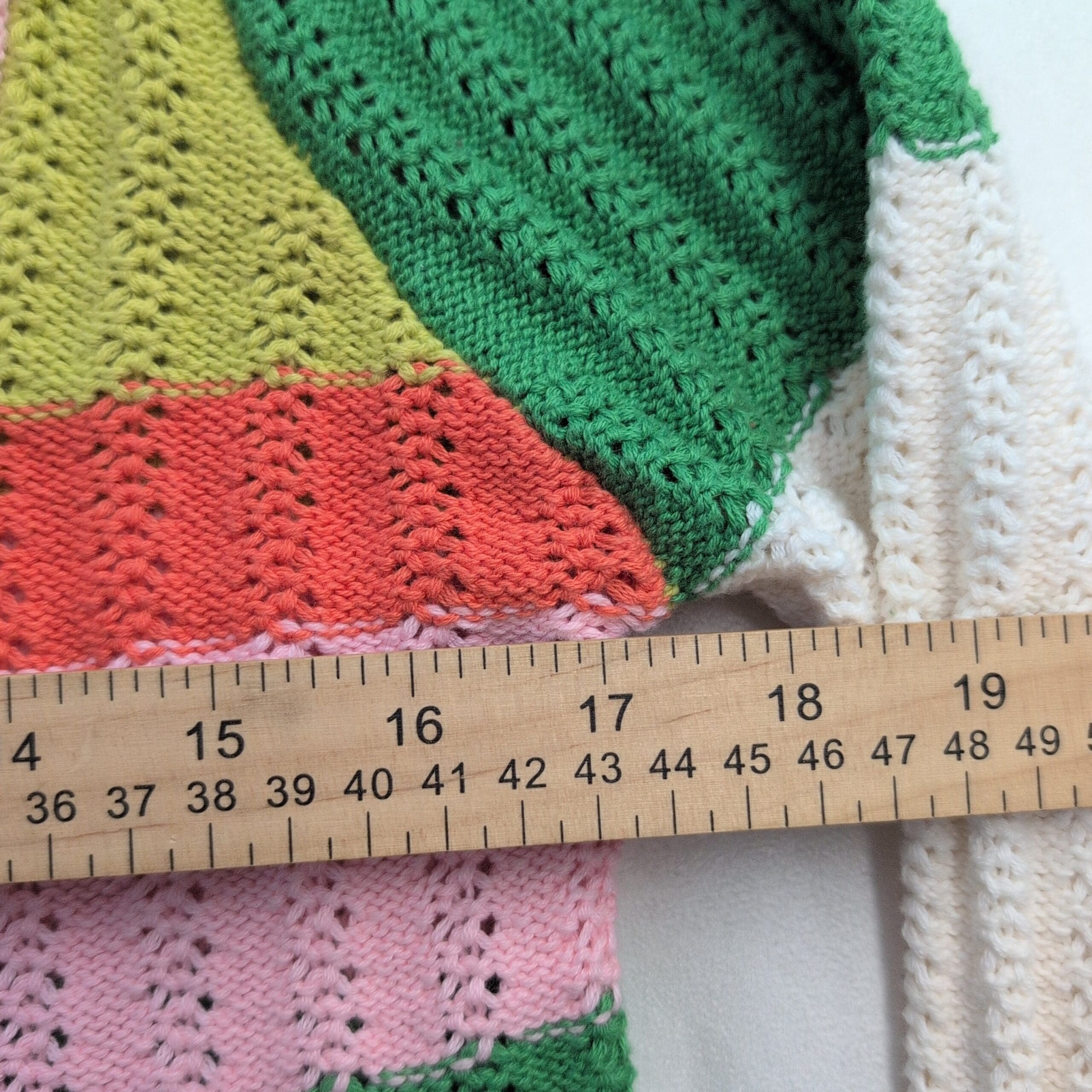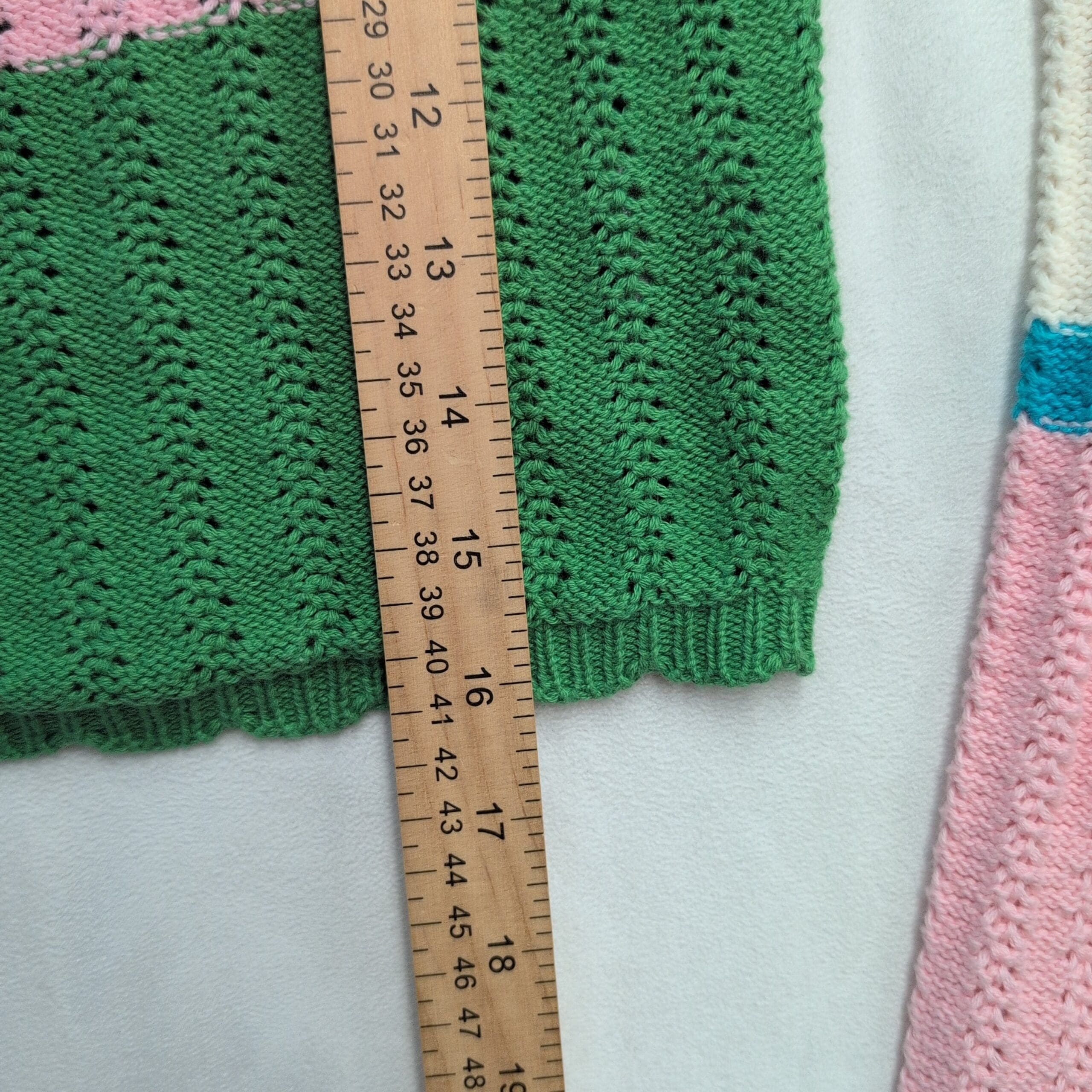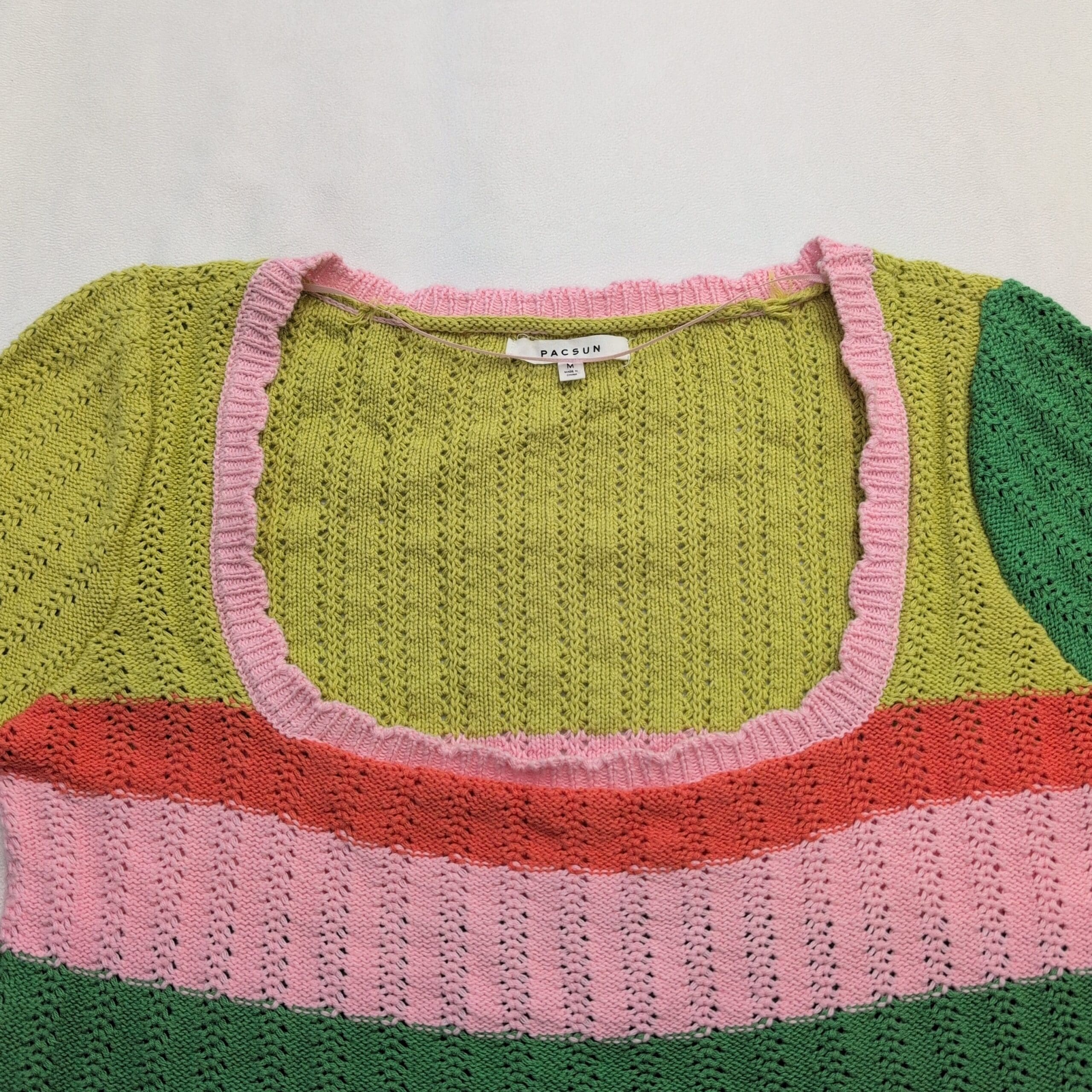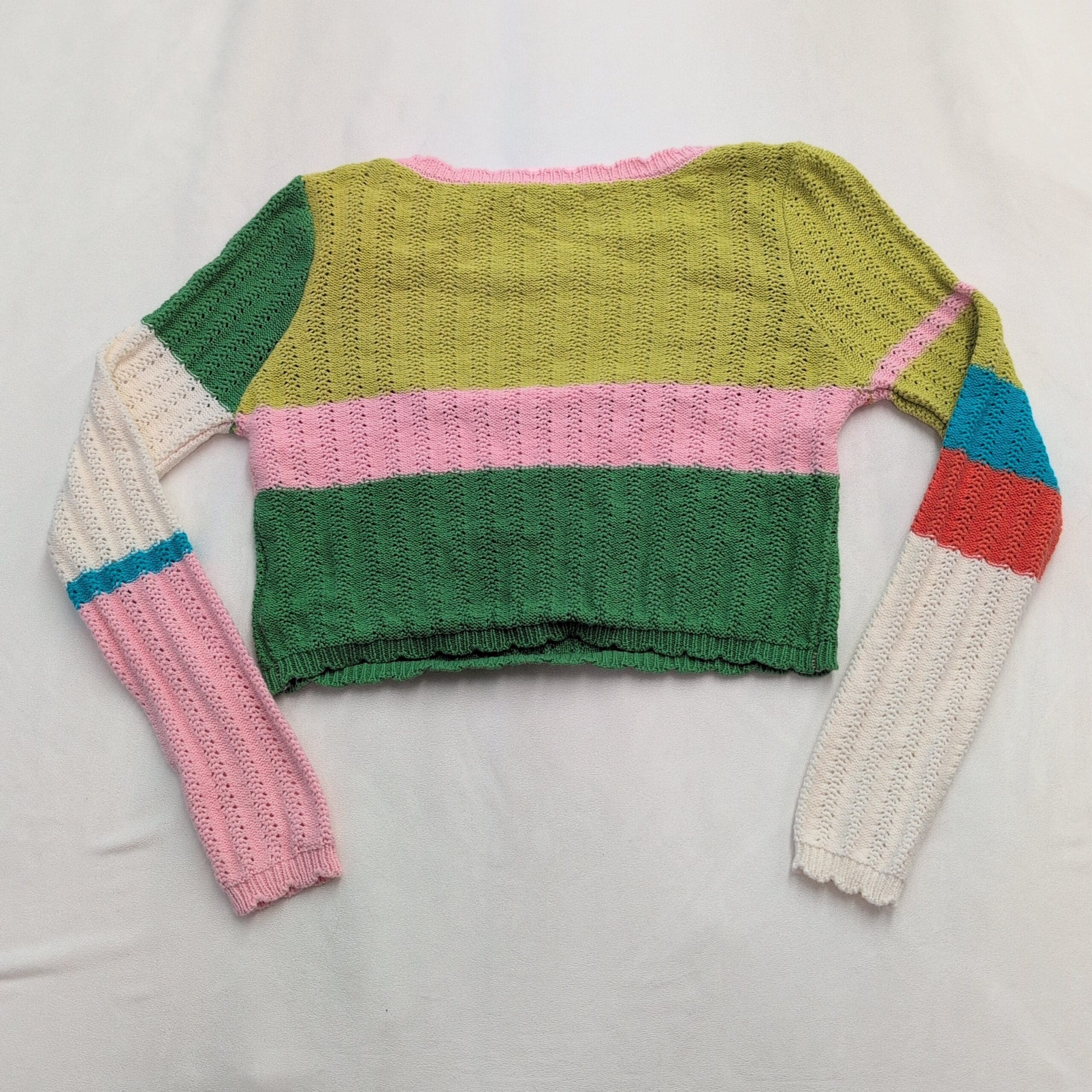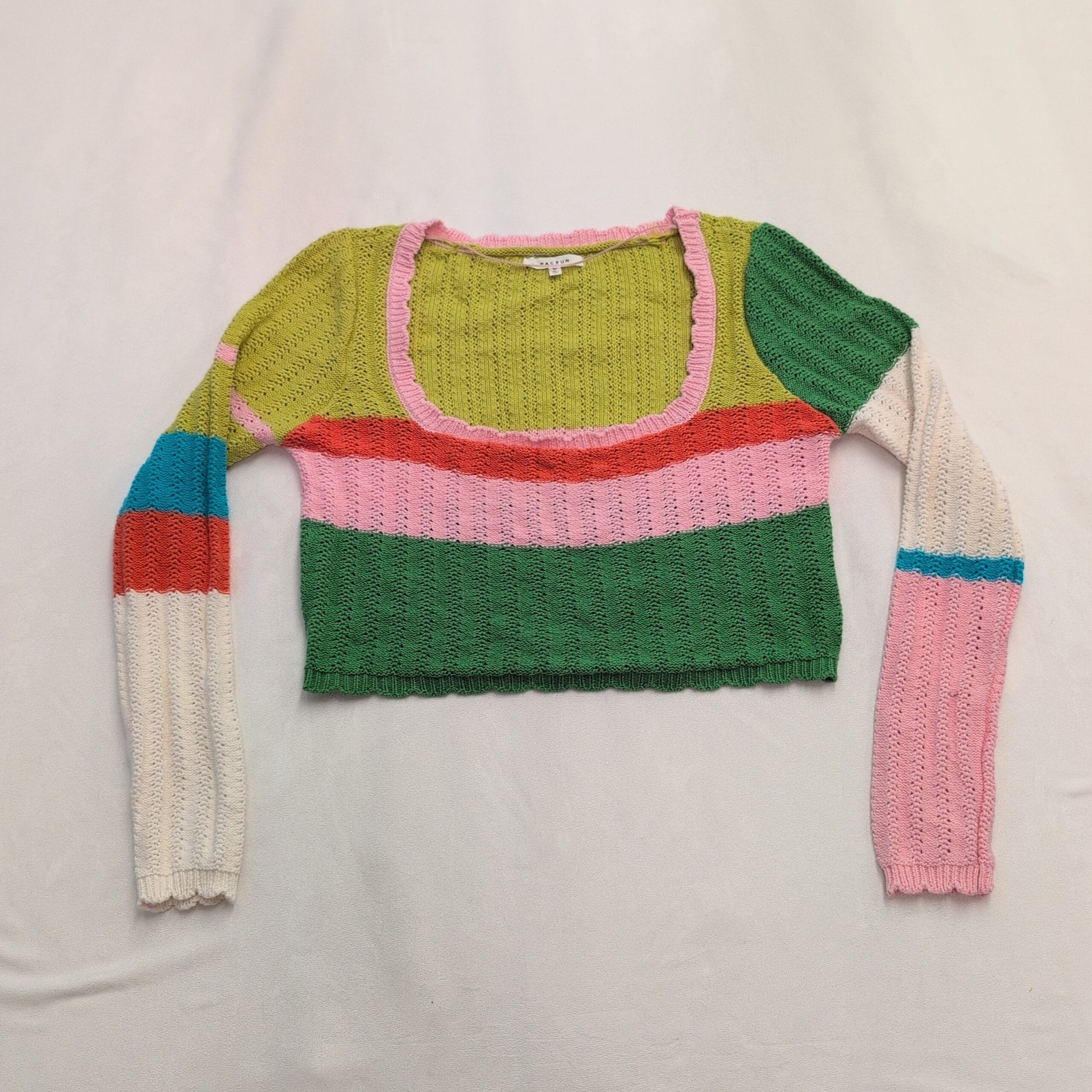 Colorful Pacsun cropped knit sweater in a women’s Medium. Lightweight open-knit construction with a wide scoop neckline, long sleeves, and subtle scalloped ribbing at the hem and cuffs. Colorblock stripes include lime, forest green, soft pink, red, cream and a pop of teal for a playful, vintage-inspired look. Fitted, cropped silhouette ideal for layering over high-waisted jeans or skirts. Gently used — free of major rips, tears, stains, or other significant flaws; typical light wear may be present. Please review photos for condition and color details.