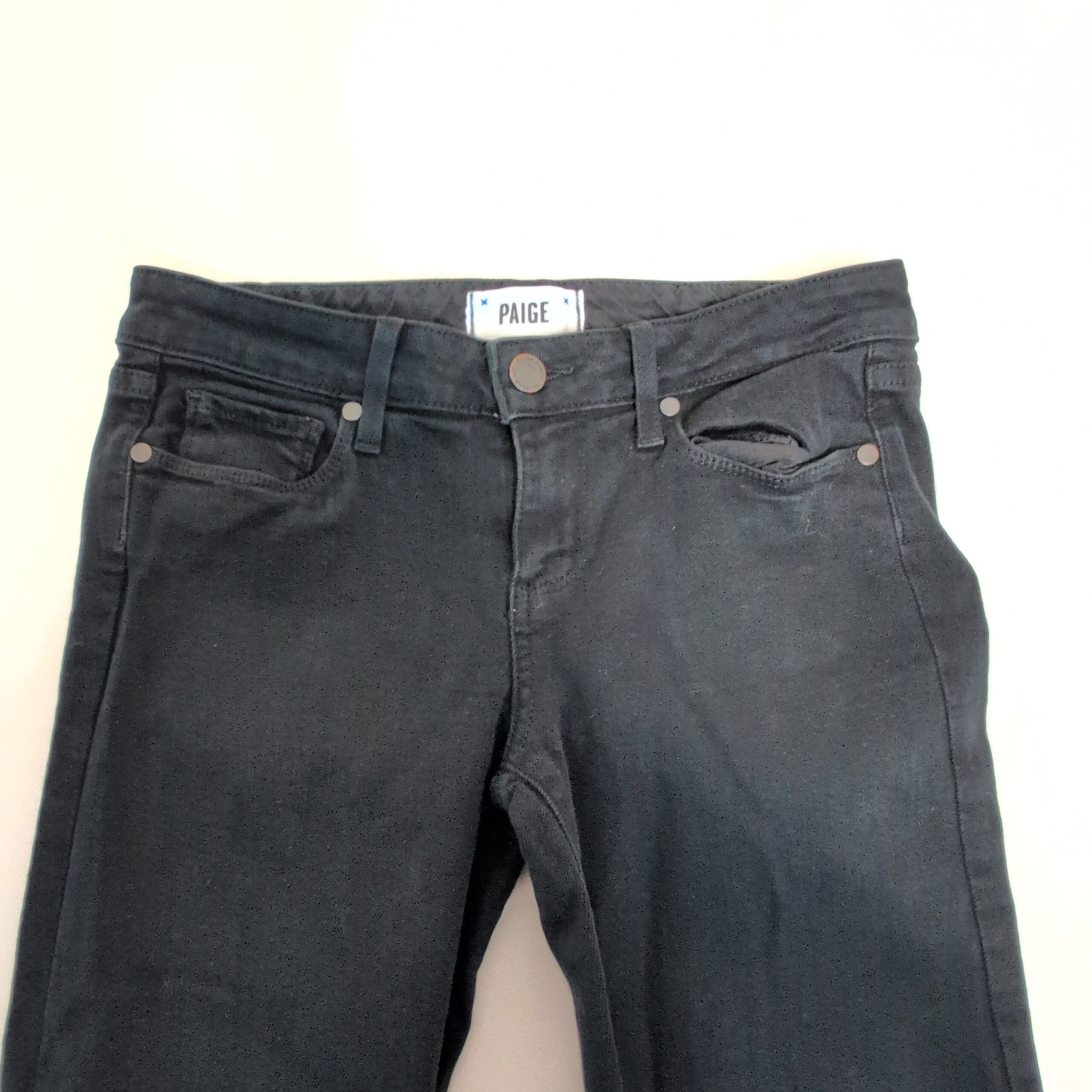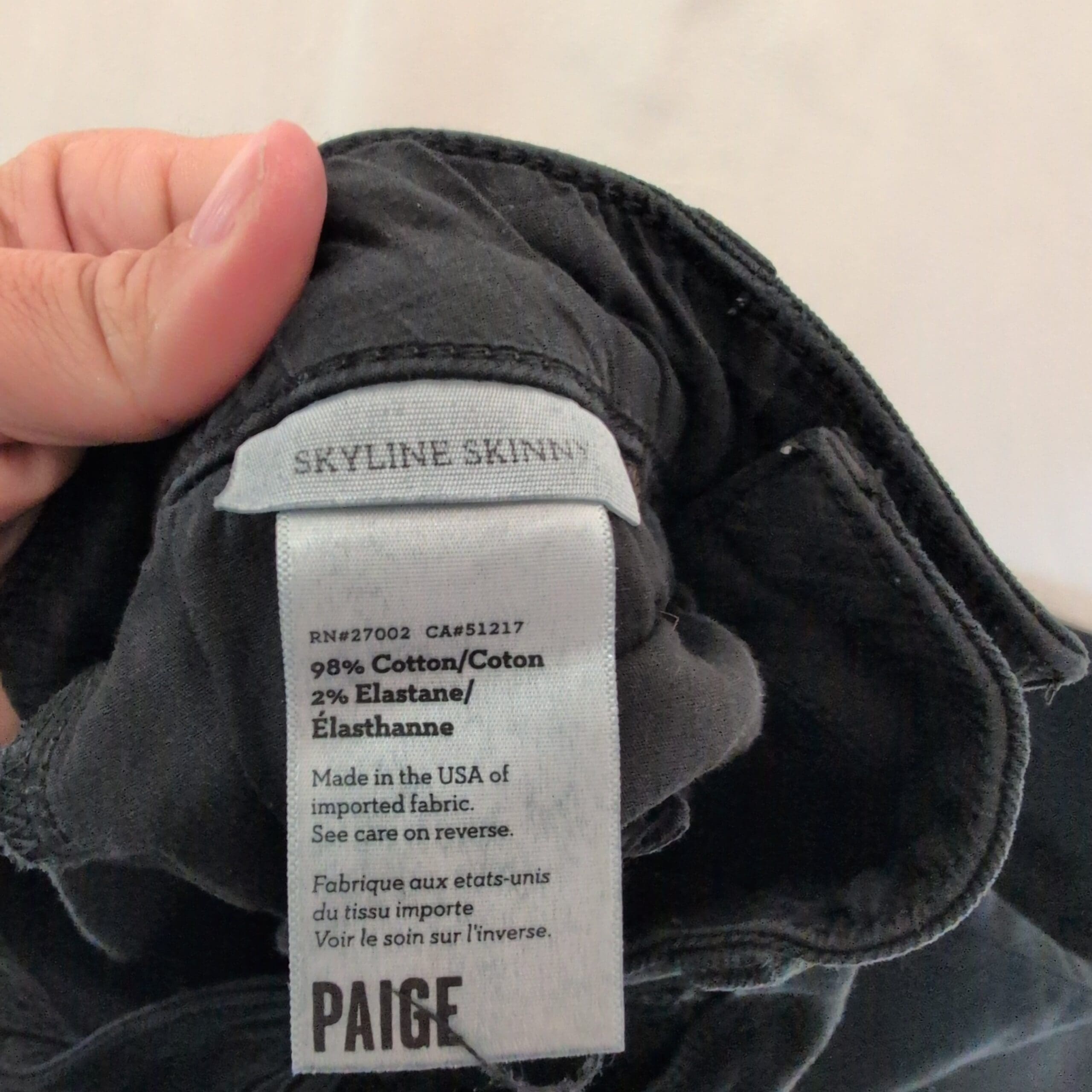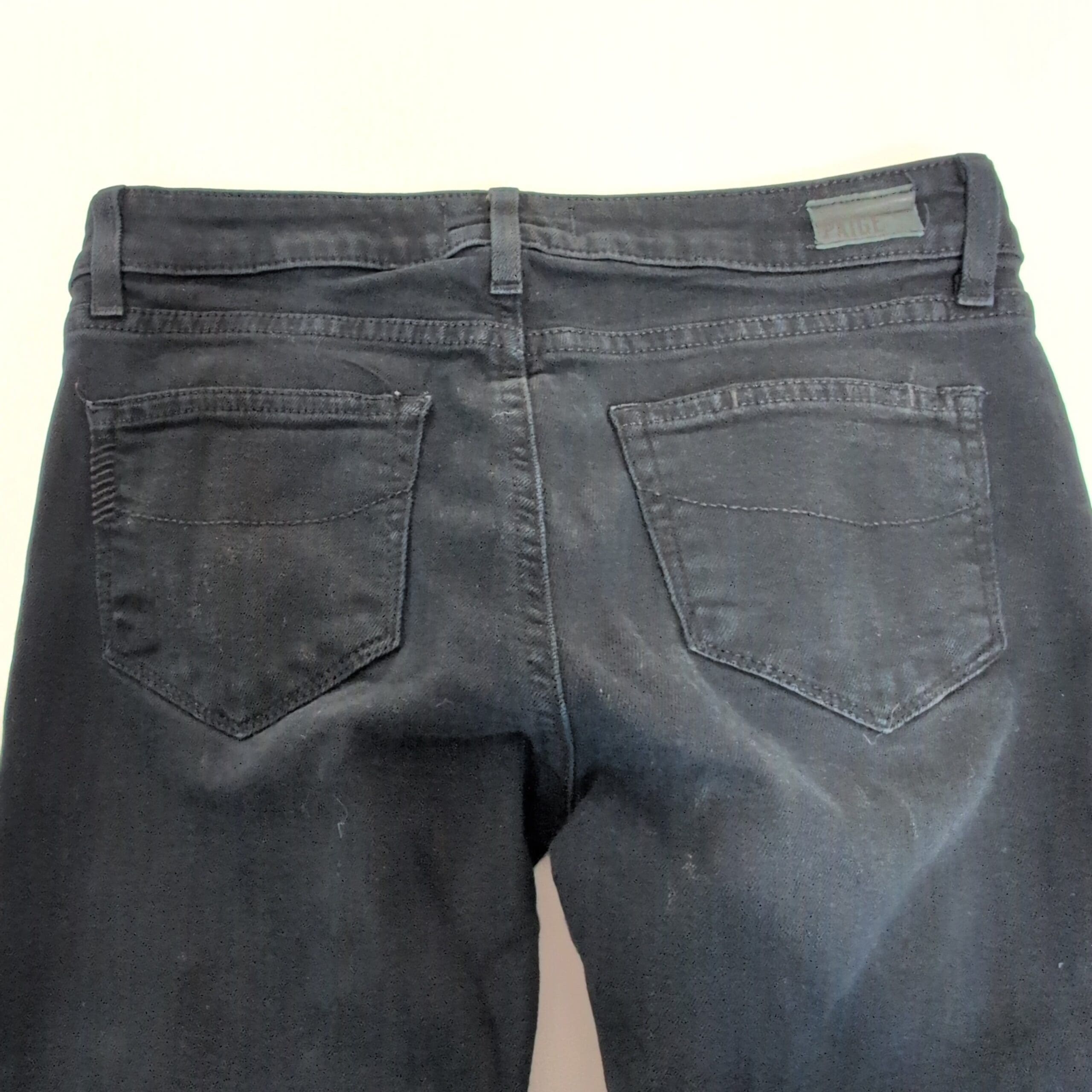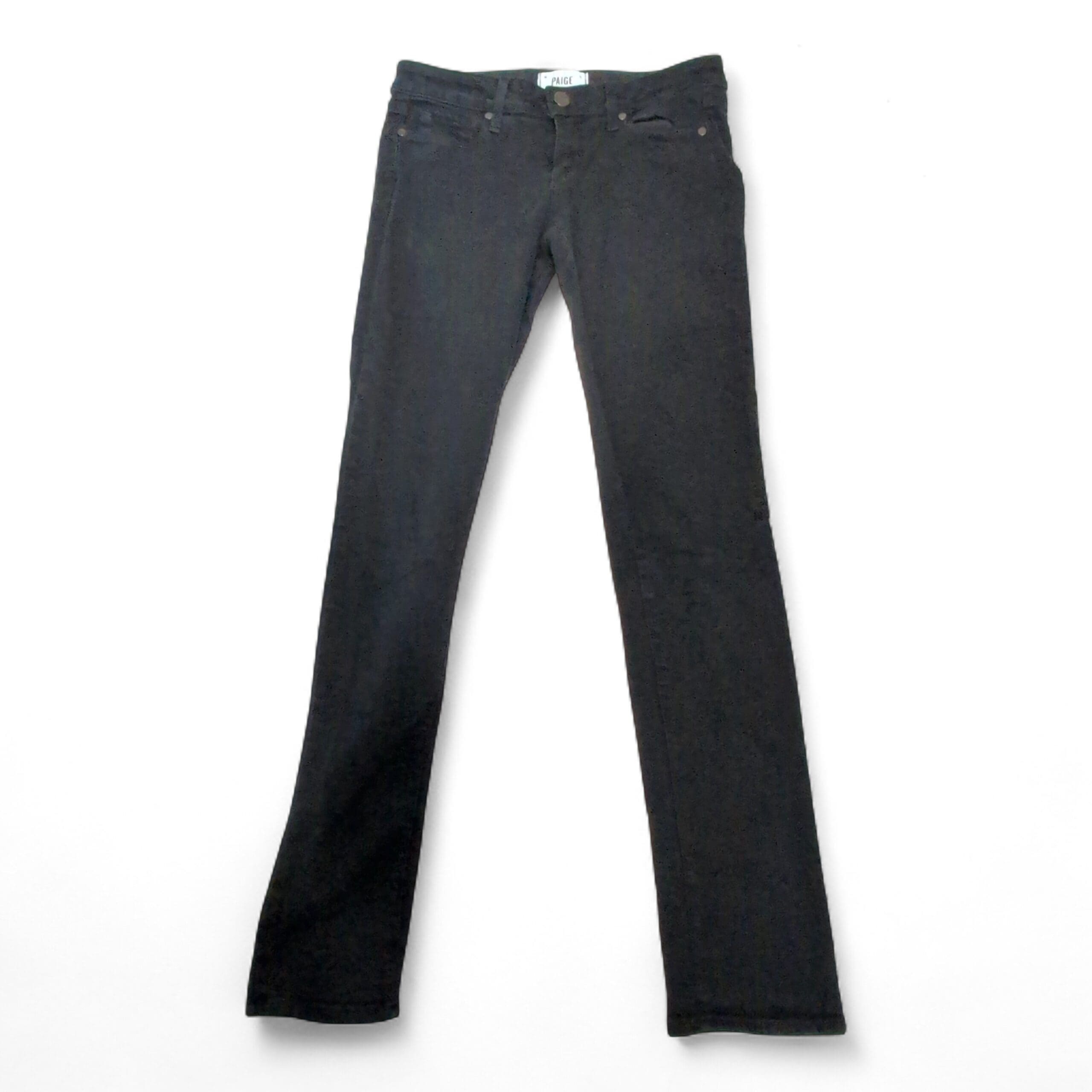 Paige Skyline Skinny black women’s jeans, size 26. Classic skinny silhouette in a clean black wash with five-pocket styling and tonal hardware. Gently used and in good condition with no flaws noted. Versatile wardrobe staple that can be dressed up or down — pairs well with boots, flats, or heels.