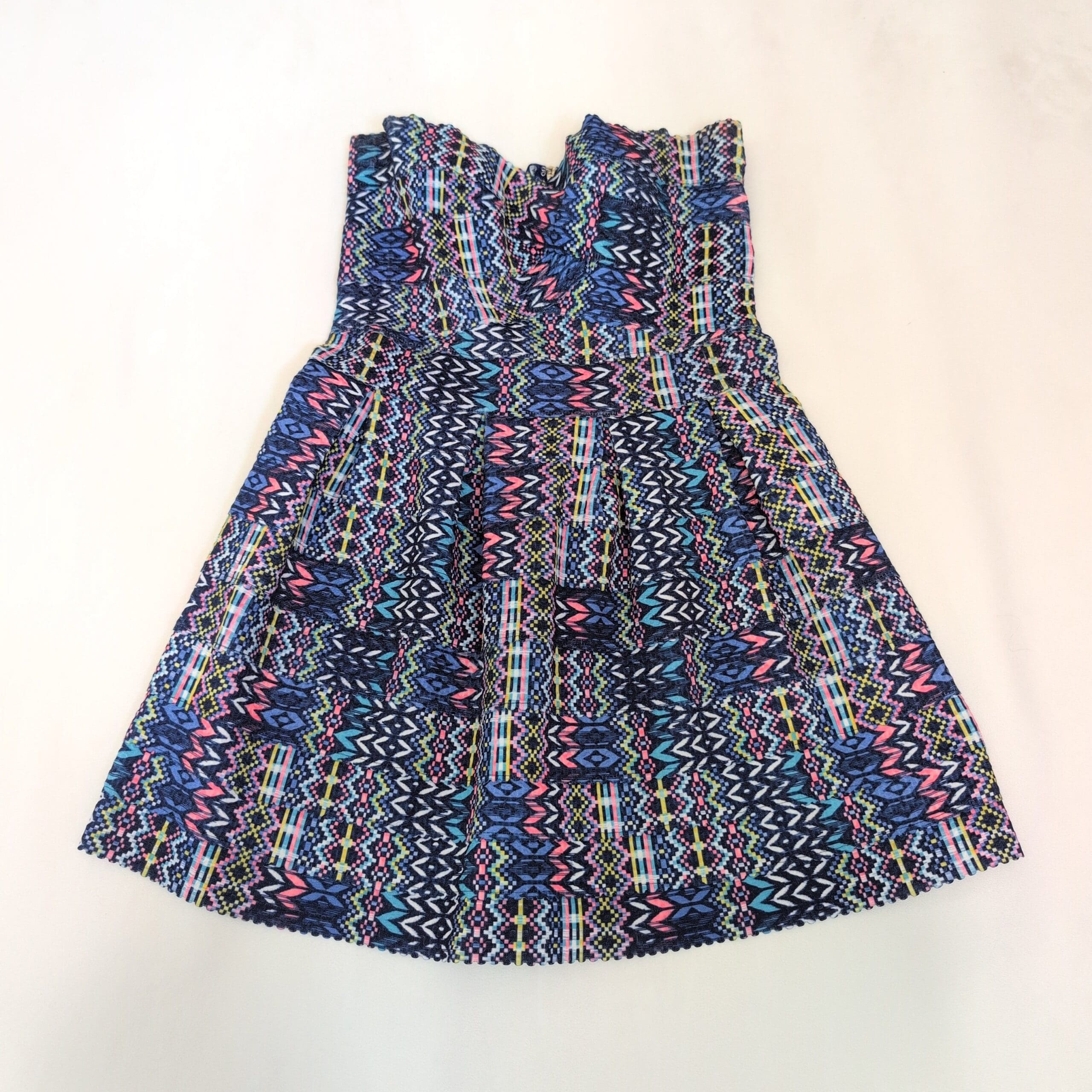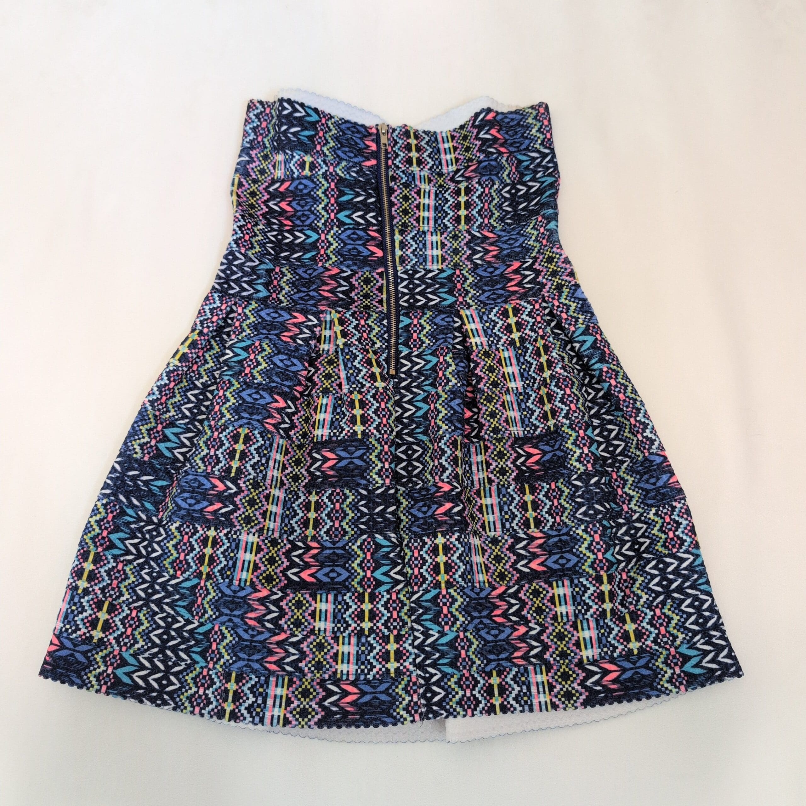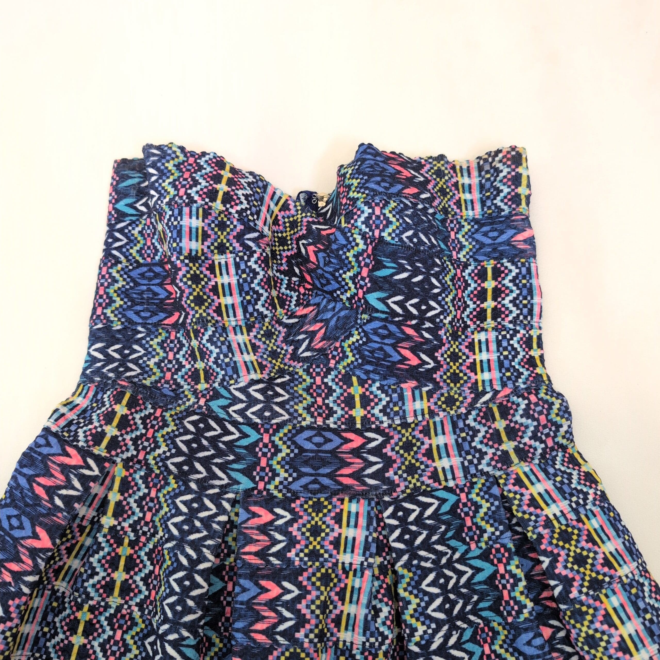 Paper Crane strapless women’s dress in size M. Vibrant blue-based geometric/tribal print with pink, teal, yellow and white accents. Fitted, structured bodice with a flared, pleated skirt for a flattering A-line silhouette. Great for summer events, parties, or a fun night out.
