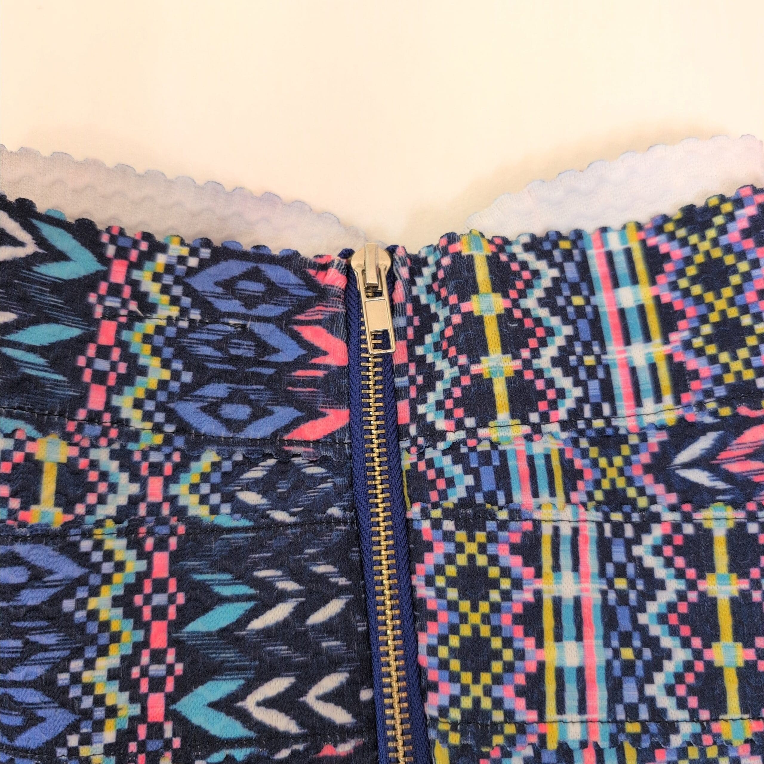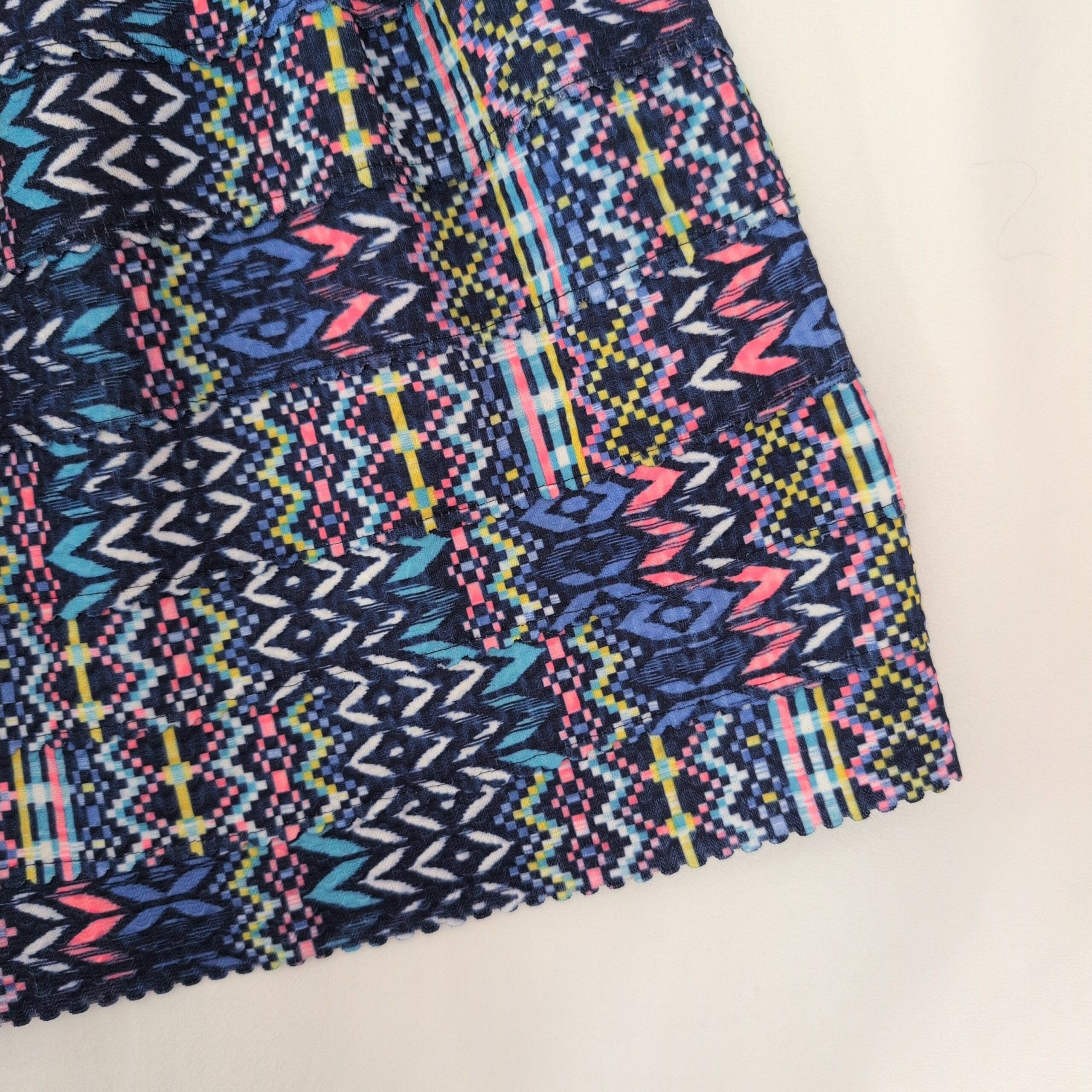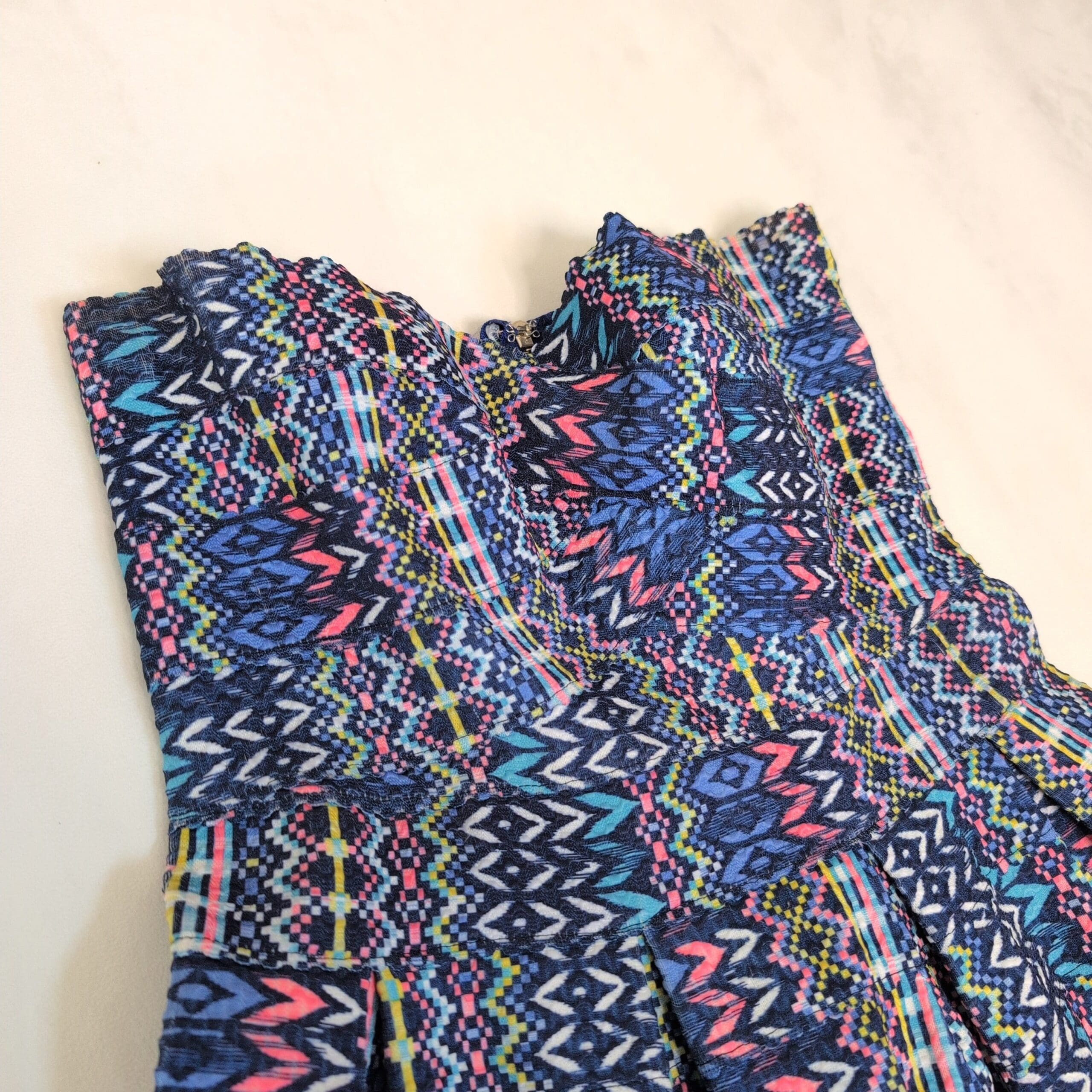Paper Crane strapless women’s dress in size M. Vibrant blue-based geometric/tribal print with pink, teal, yellow and white accents. Fitted, structured bodice with a flared, pleated skirt for a flattering A-line silhouette. Great for summer events, parties, or a fun night out.