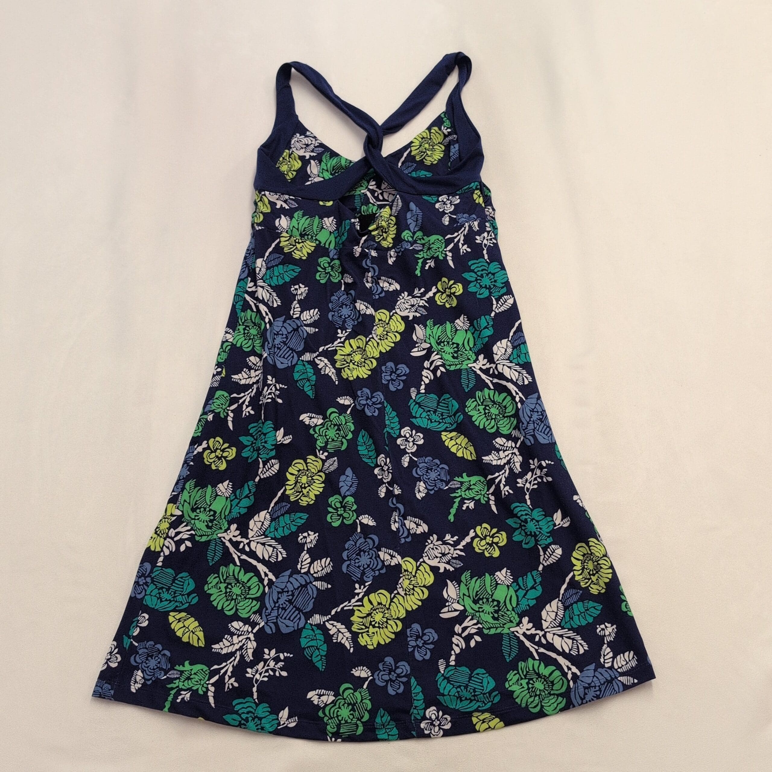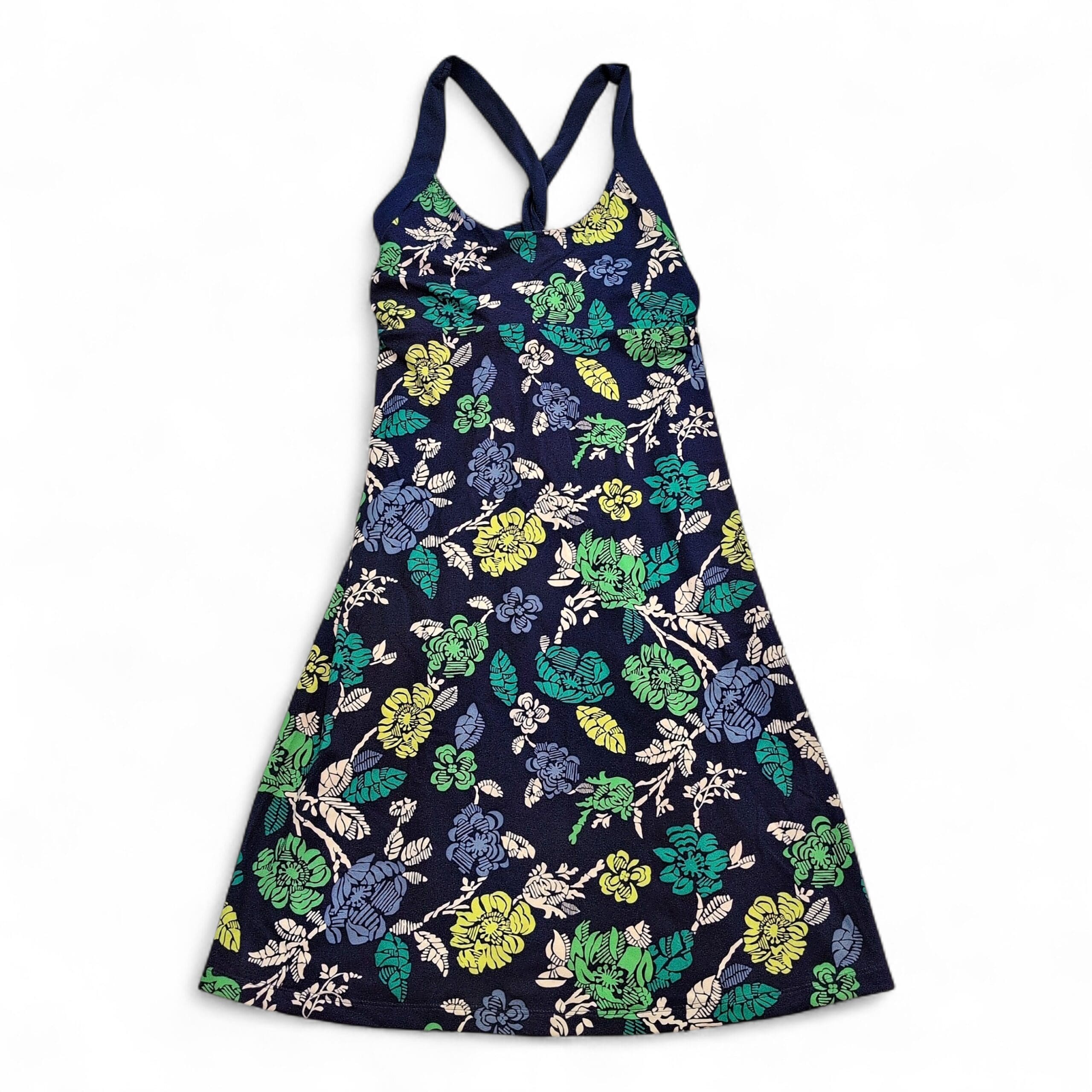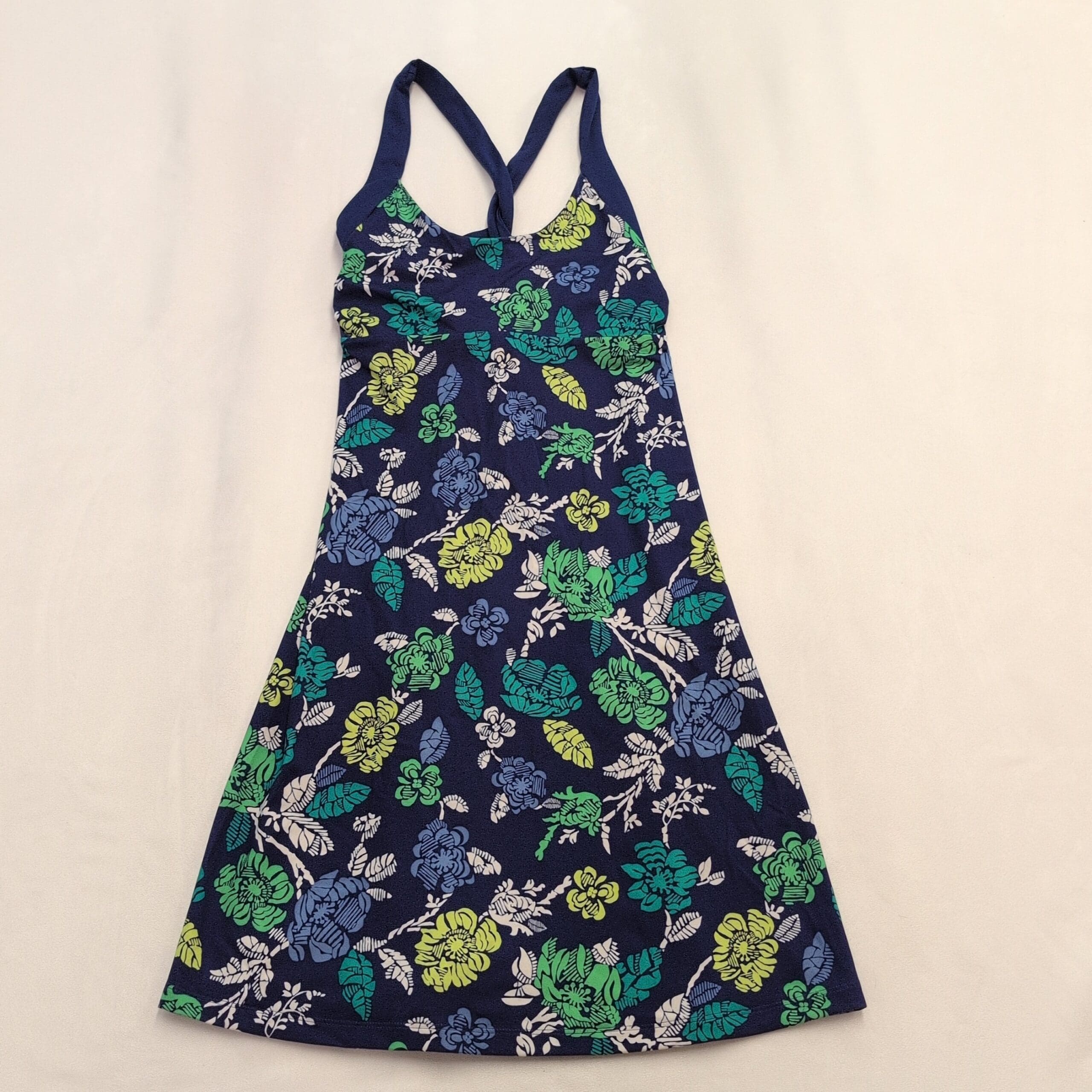 Patagonia women’s floral racerback sundress in size S. Navy base with blue, teal and lime floral print. Racerback straps with a fitted bust and gentle A-line skirt for an easy, casual summer look. Lightweight, comfortable knit ideal for warm days or layering.