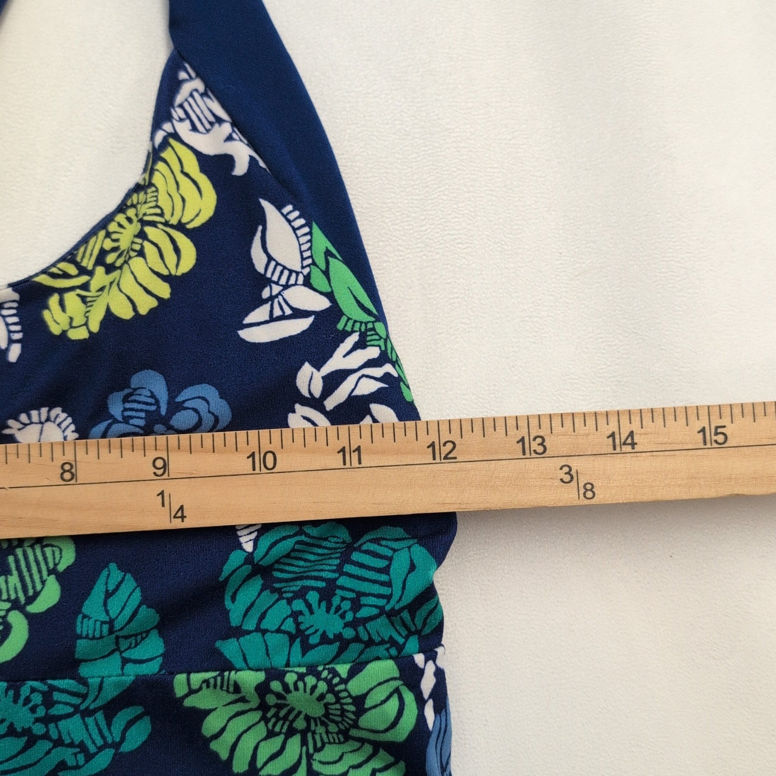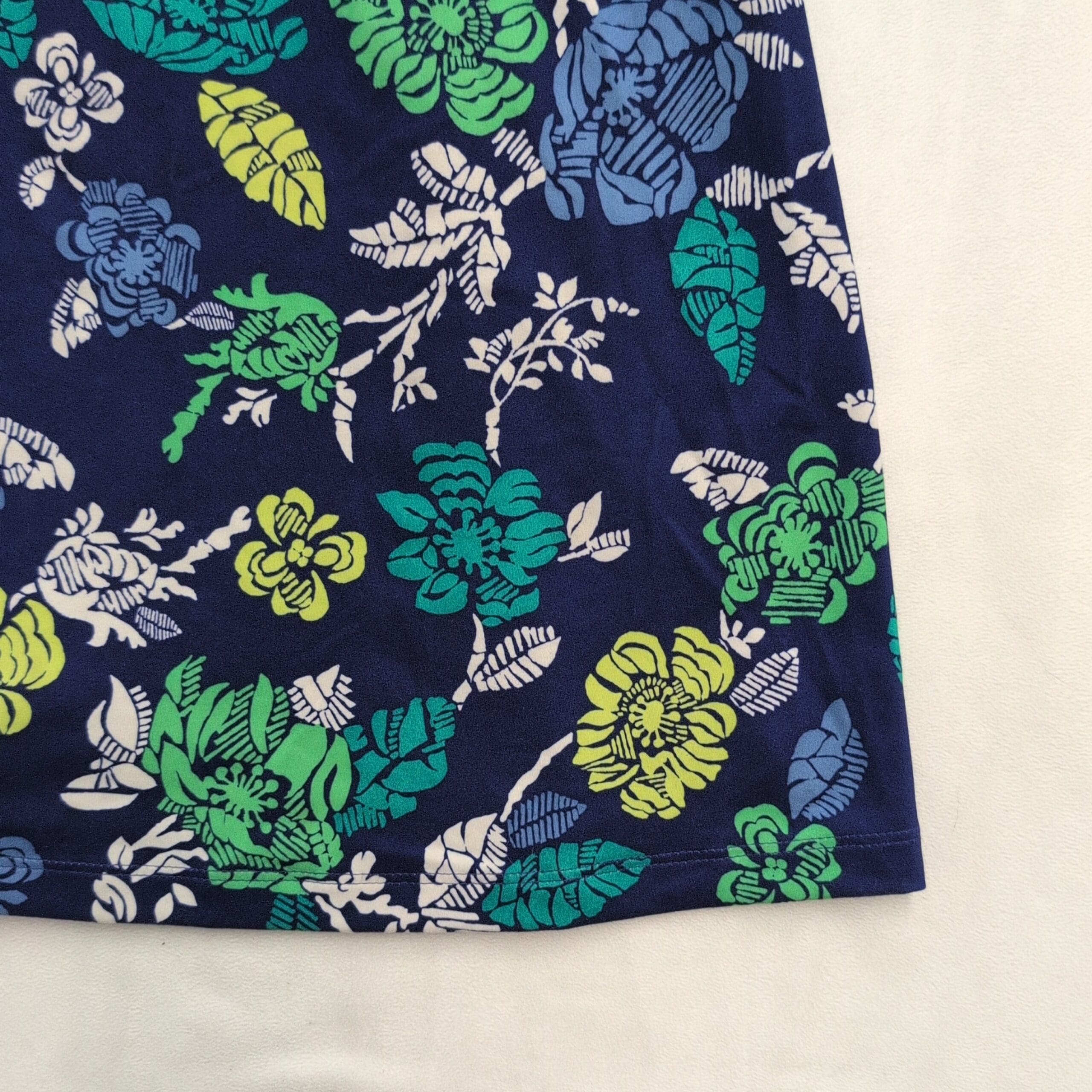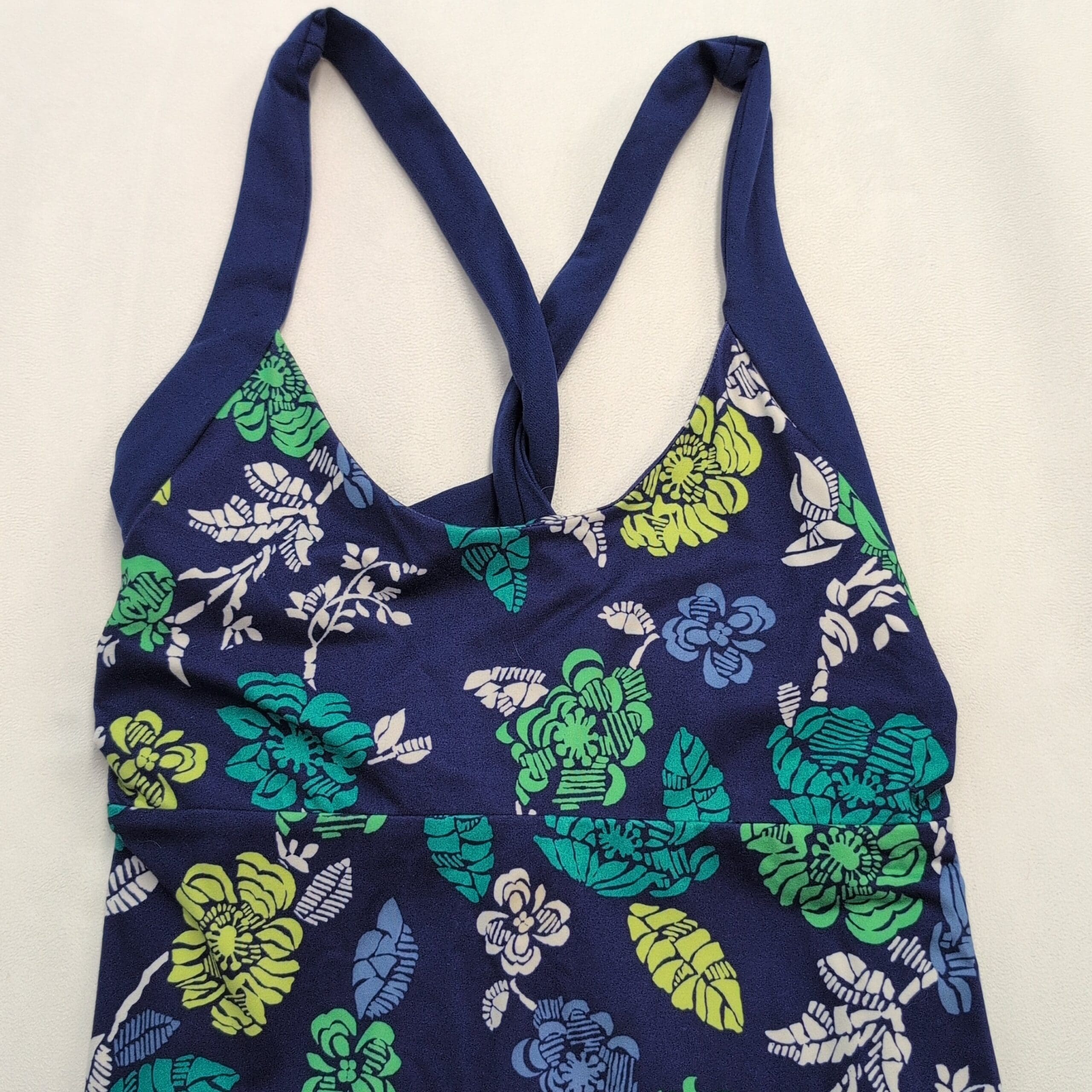 Patagonia women’s floral racerback sundress in size S. Navy base with blue, teal and lime floral print. Racerback straps with a fitted bust and gentle A-line skirt for an easy, casual summer look. Lightweight, comfortable knit ideal for warm days or layering.