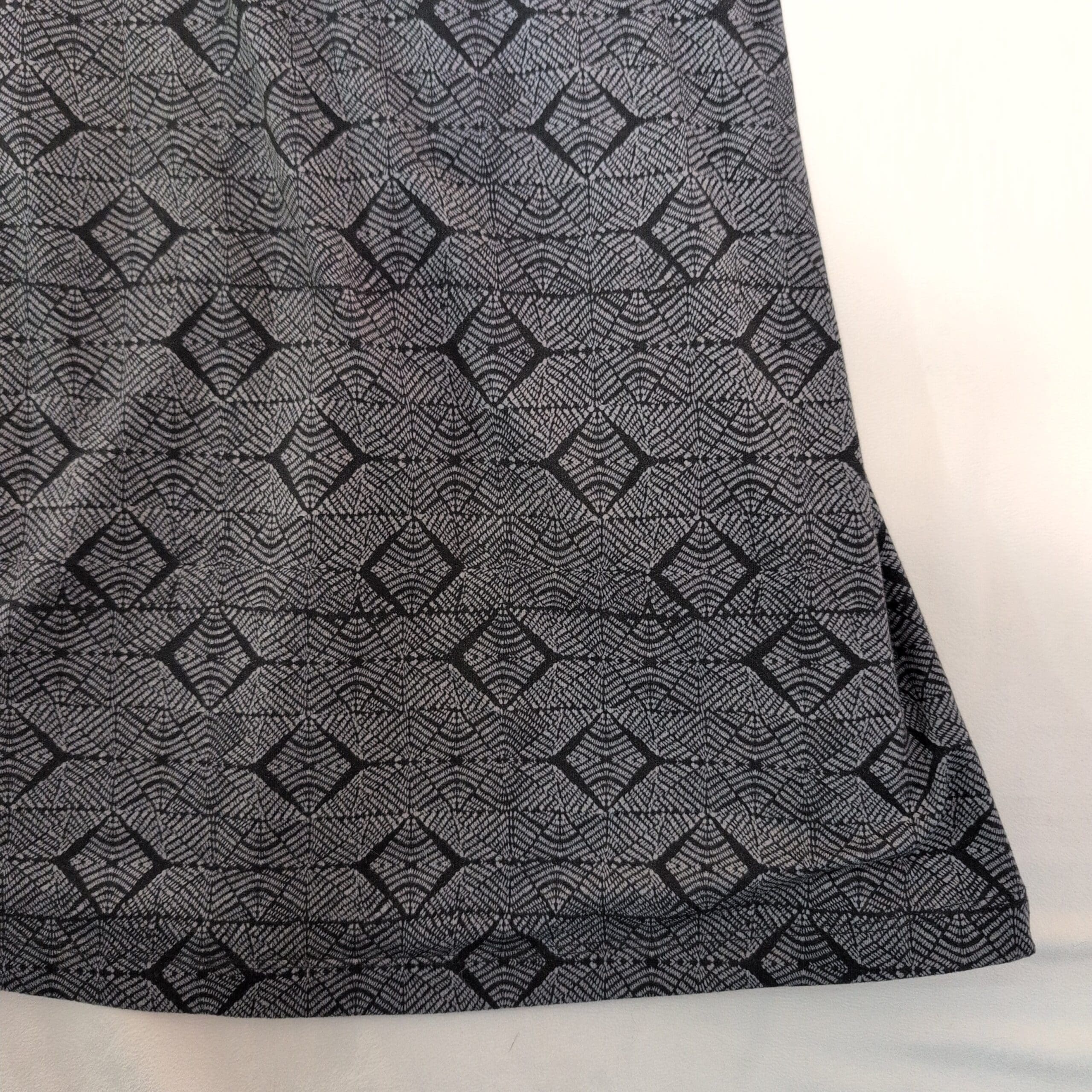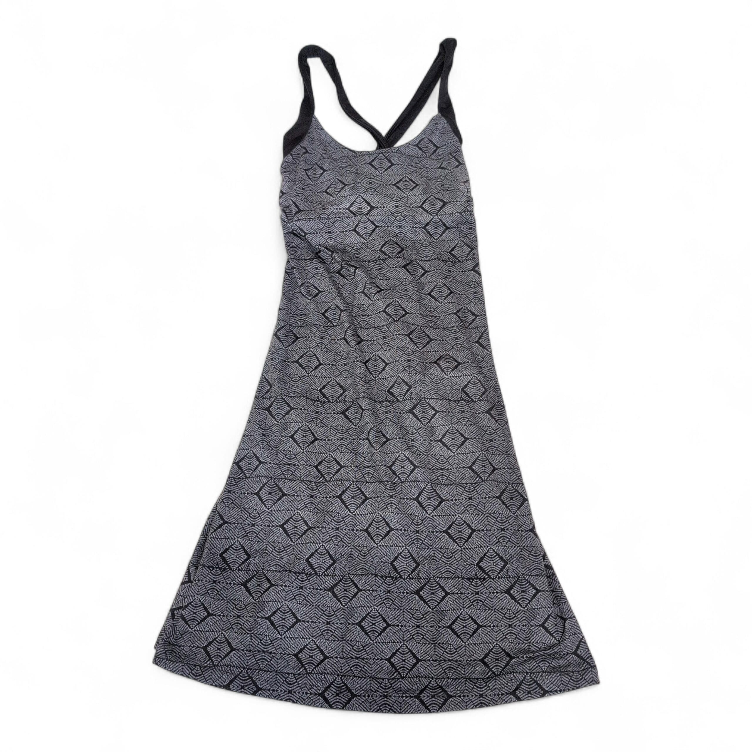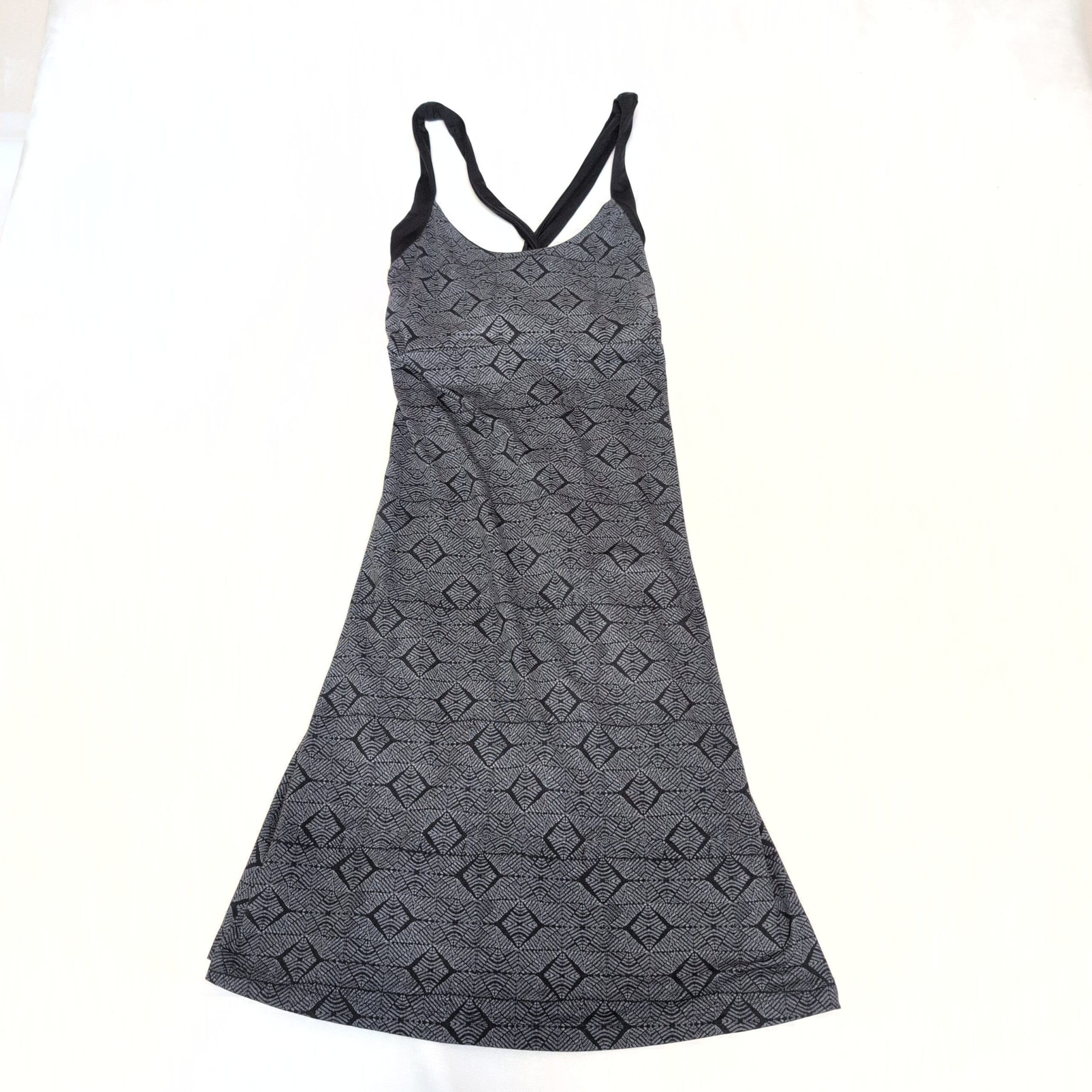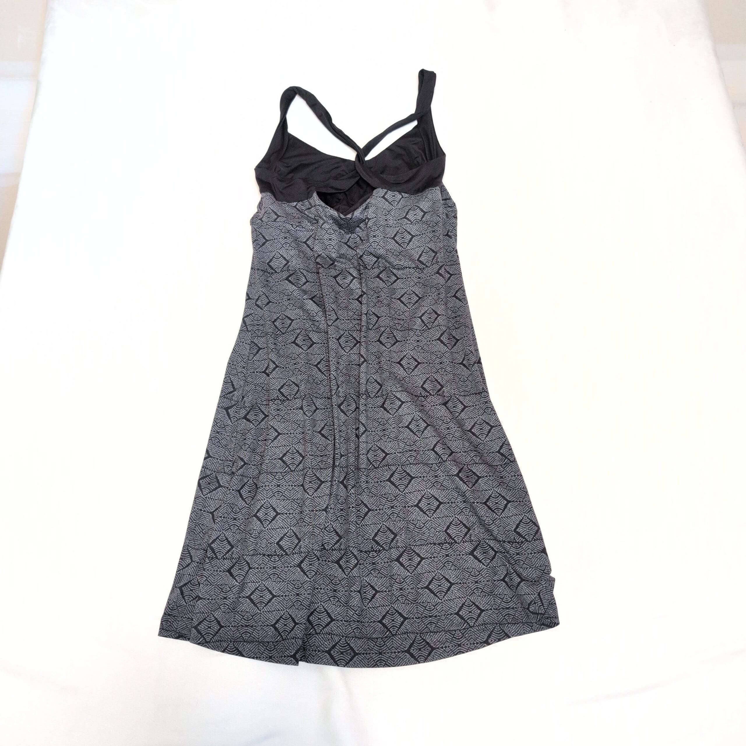 Patagonia women’s midi dress in heathered gray with a subtle geometric pattern. Features a built-in shelf bra and racerback straps for light support, a fitted bodice and a gently flared skirt that hits around mid-calf. Size M (standard) — great for casual wear, travel, or low-impact activities.