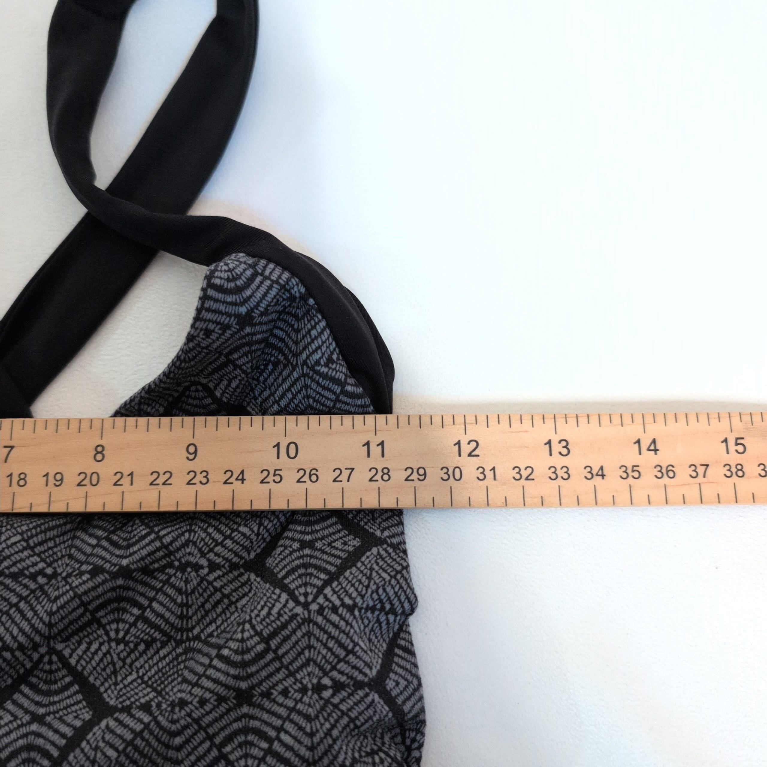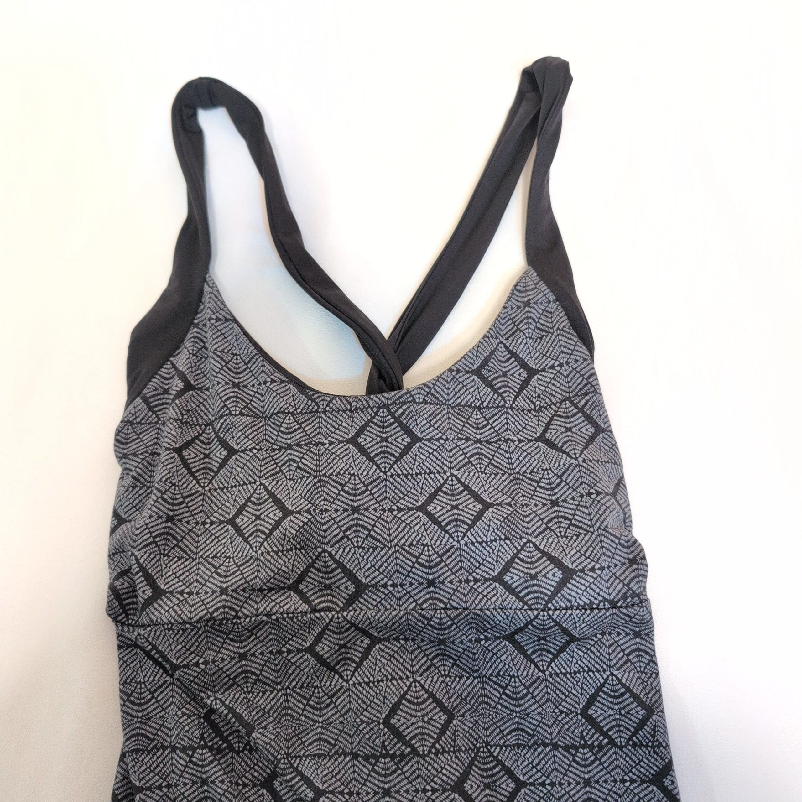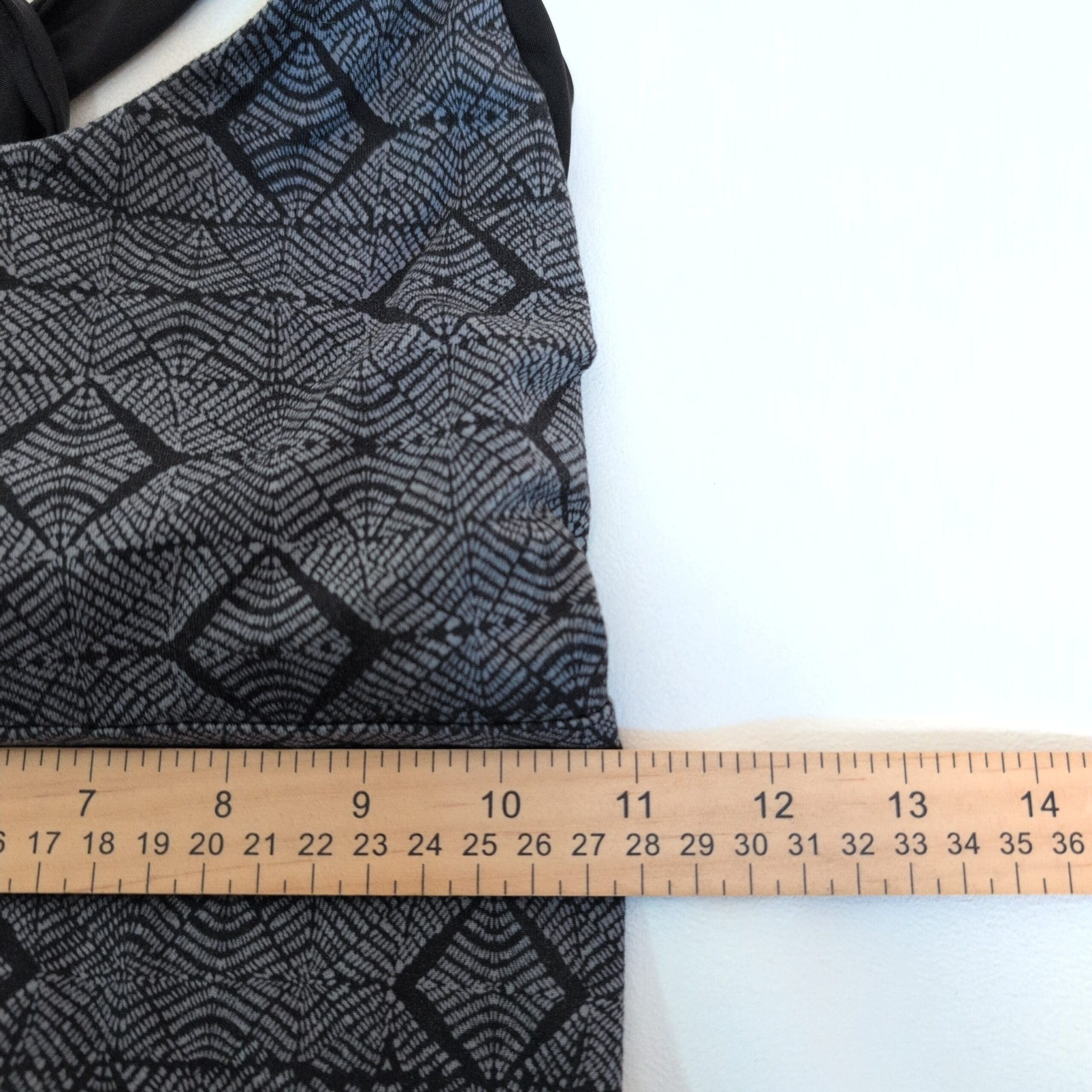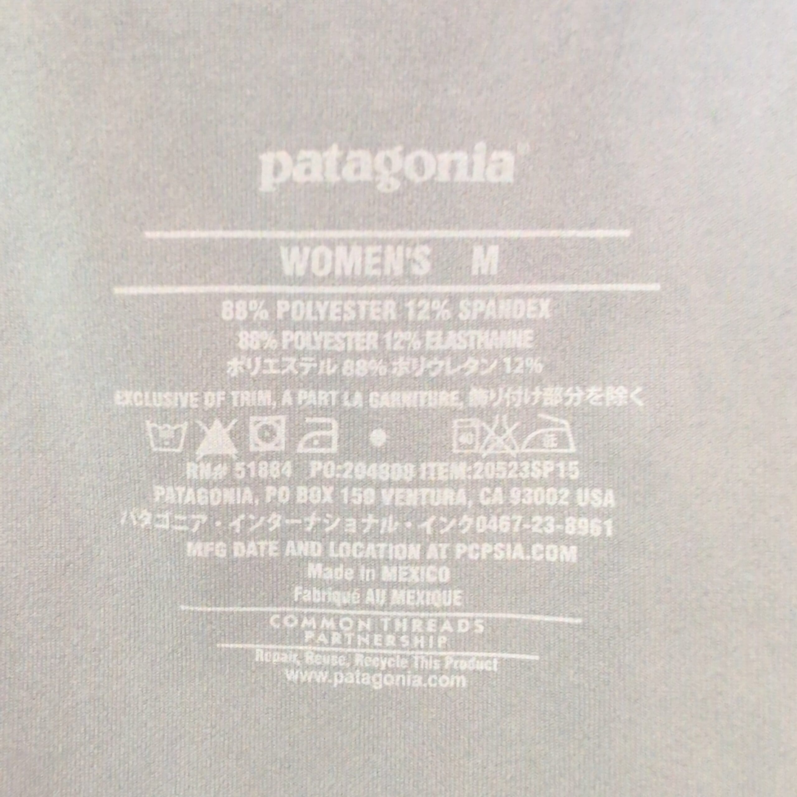 Patagonia women’s midi dress in heathered gray with a subtle geometric pattern. Features a built-in shelf bra and racerback straps for light support, a fitted bodice and a gently flared skirt that hits around mid-calf. Size M (standard) — great for casual wear, travel, or low-impact activities.