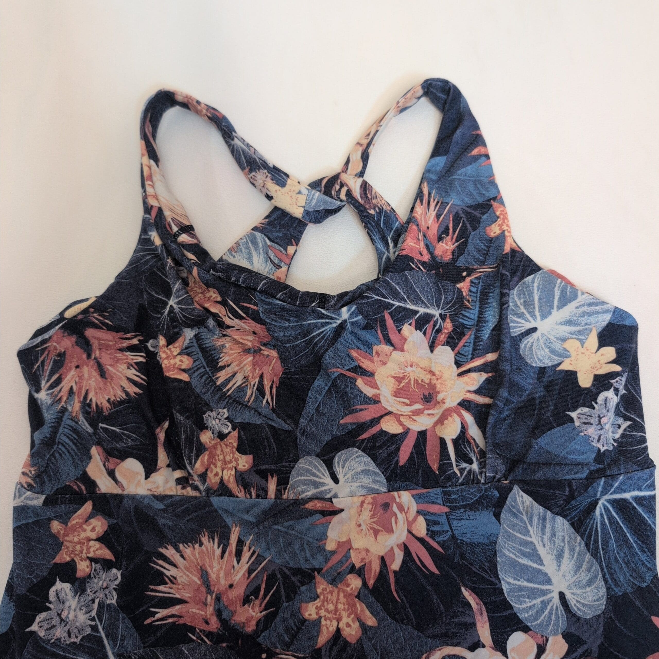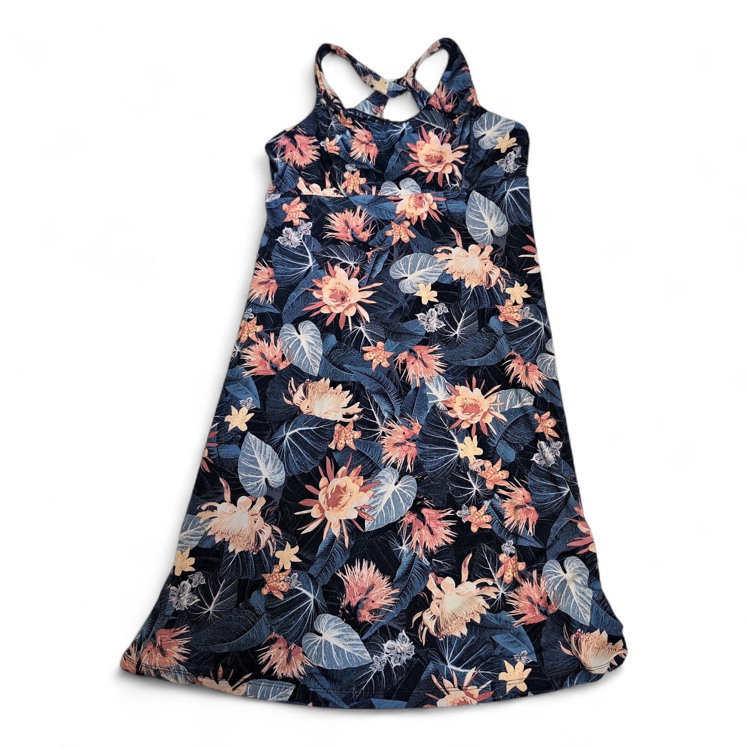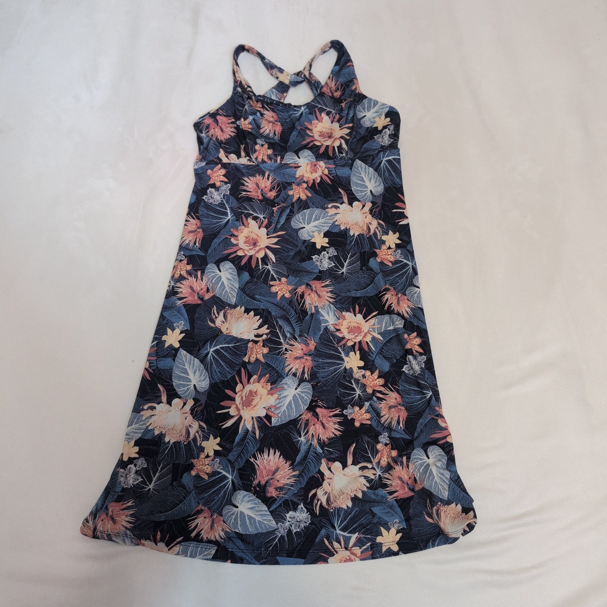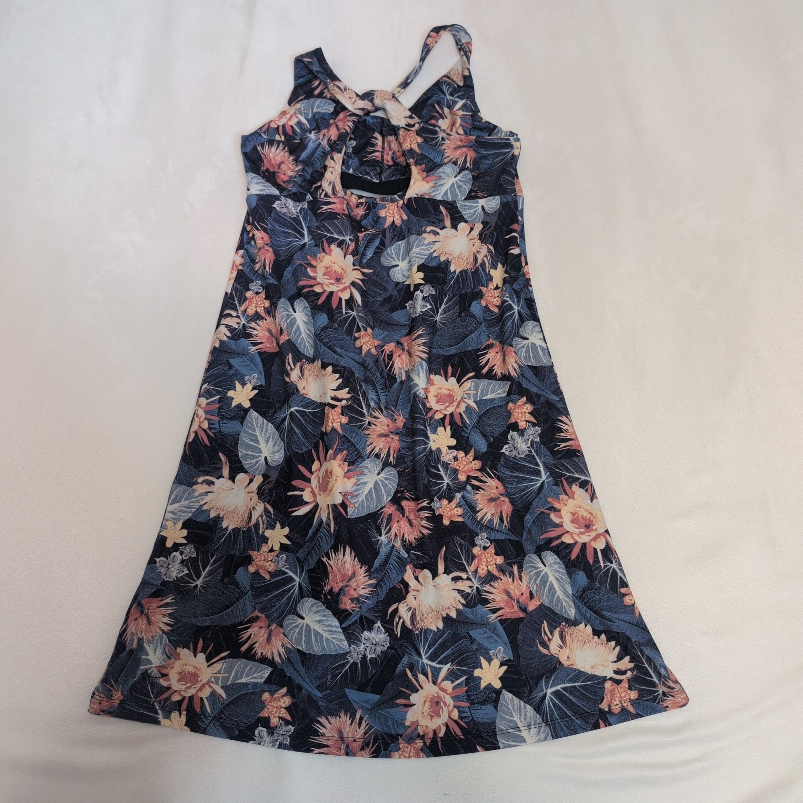 Lightweight Patagonia women’s sundress in a navy-blue tropical floral print. Features a fitted bust with an empire seam, crossed back straps for added support, and a relaxed A-line skirt that drapes nicely for casual days or travel. Size M (standard). Fabric has a soft hand and comfortable stretch—see photos for pattern and condition details.