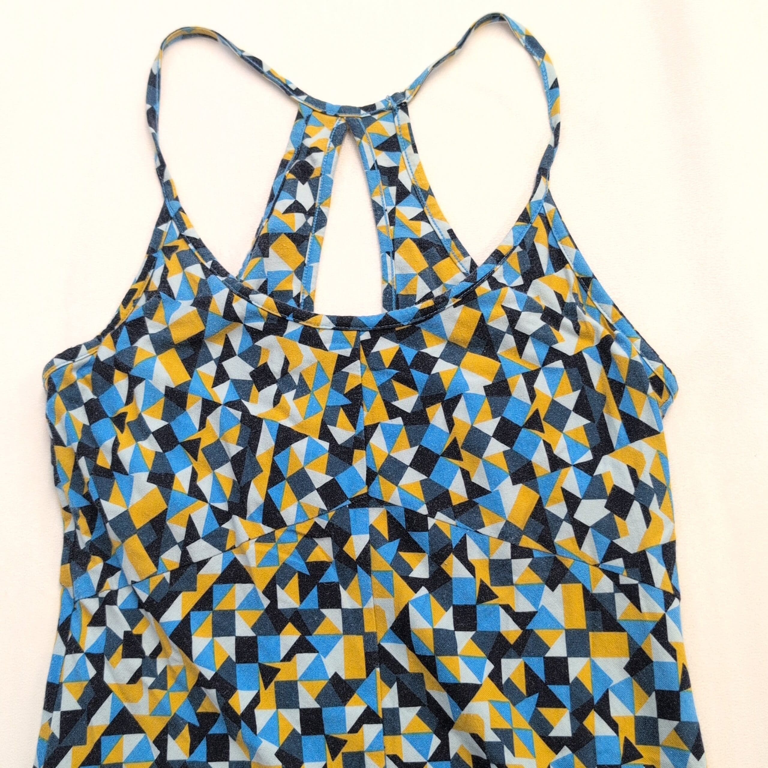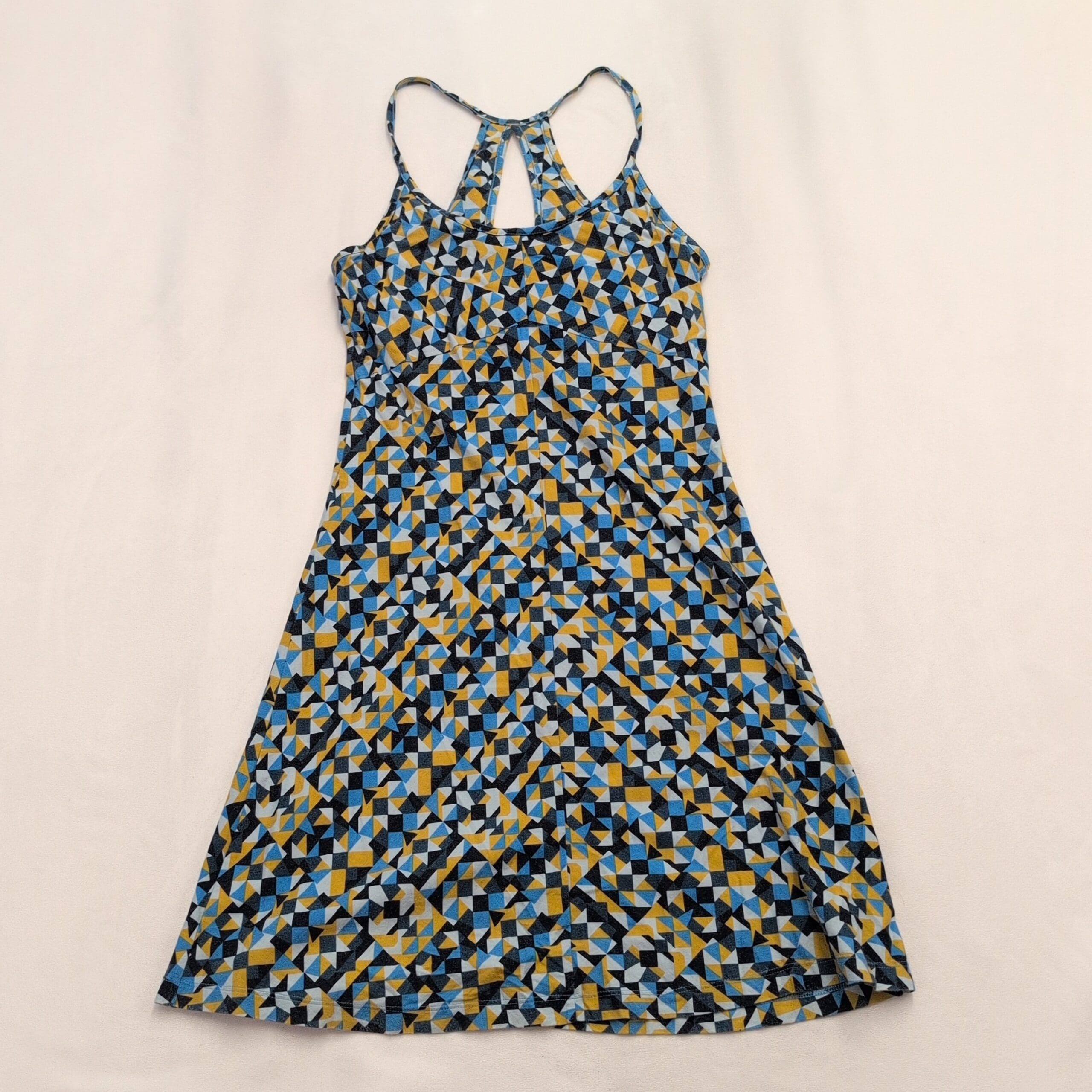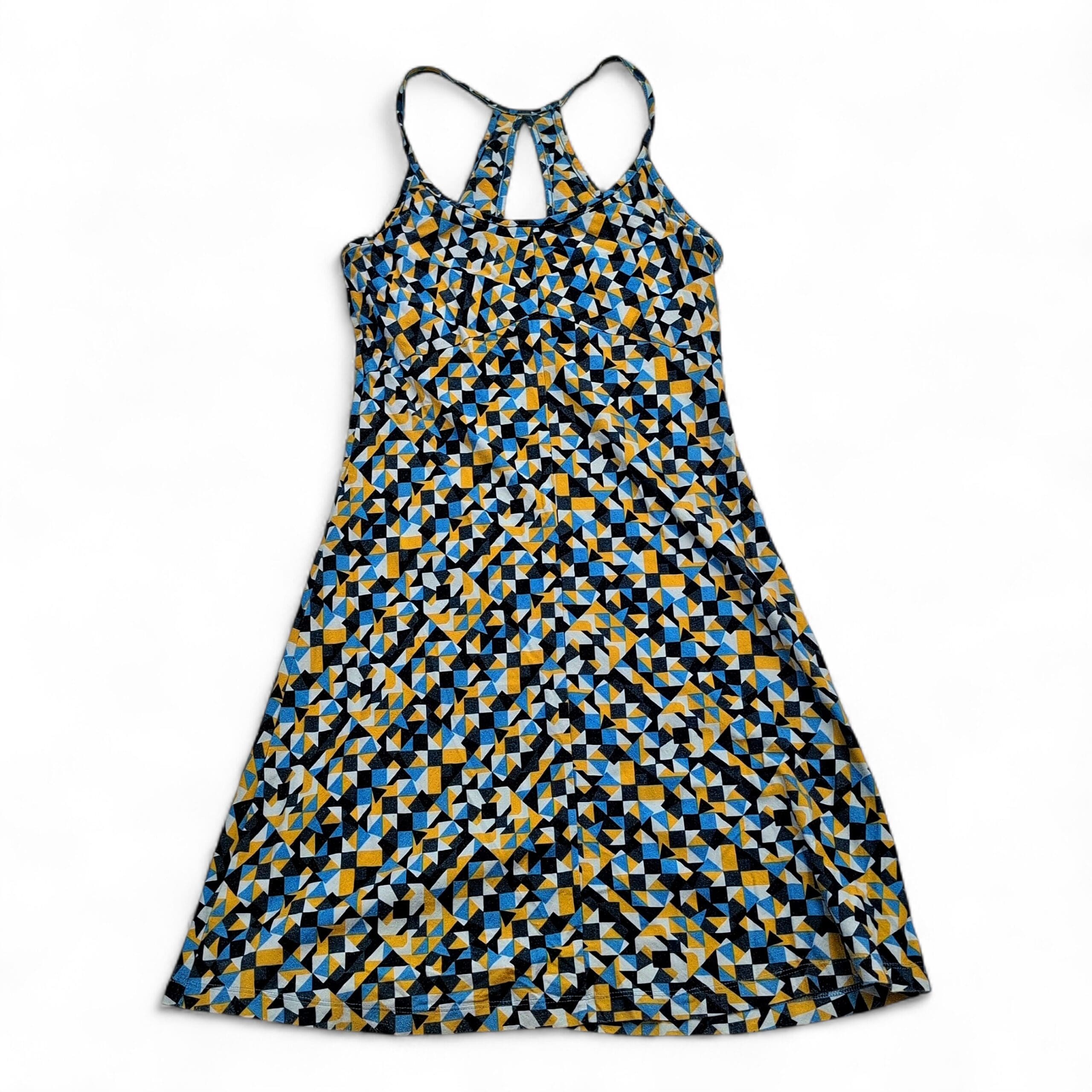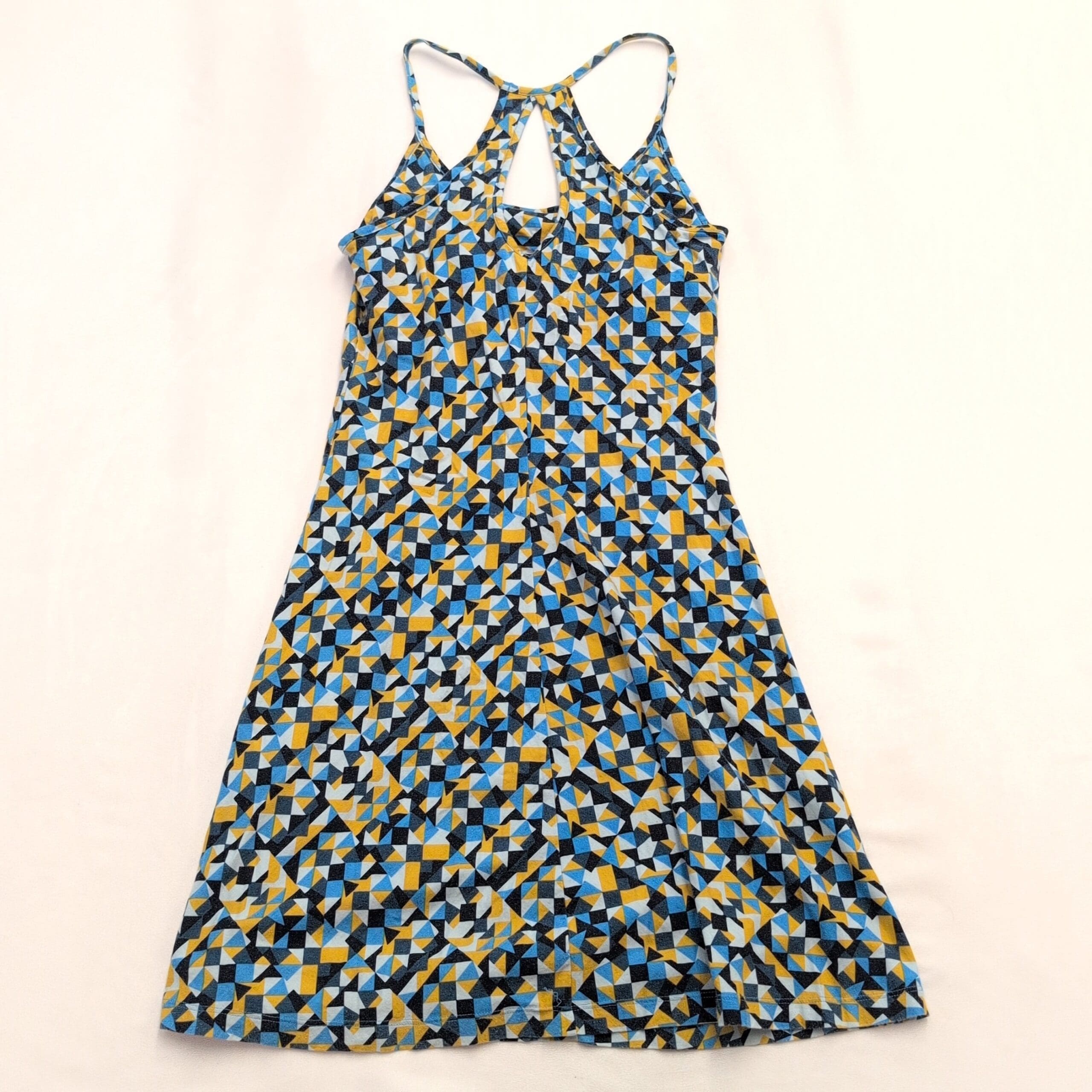 Patagonia women’s geometric racerback A-line dress, size S. Lightweight, breathable knit with narrow straps and a racerback keyhole detail. Flattering casual silhouette with a bold blue, yellow and black geometric print — perfect for summer days or casual outings.