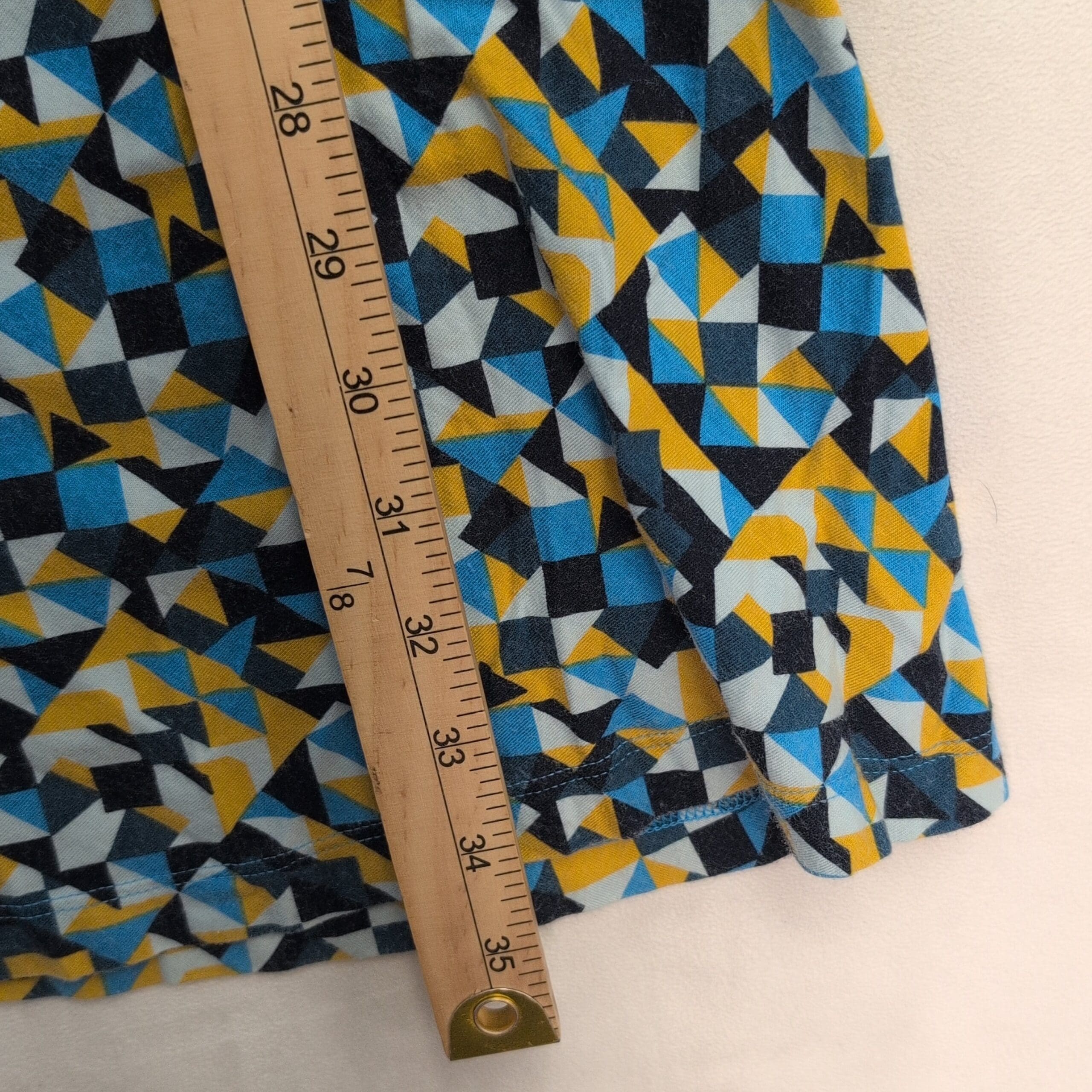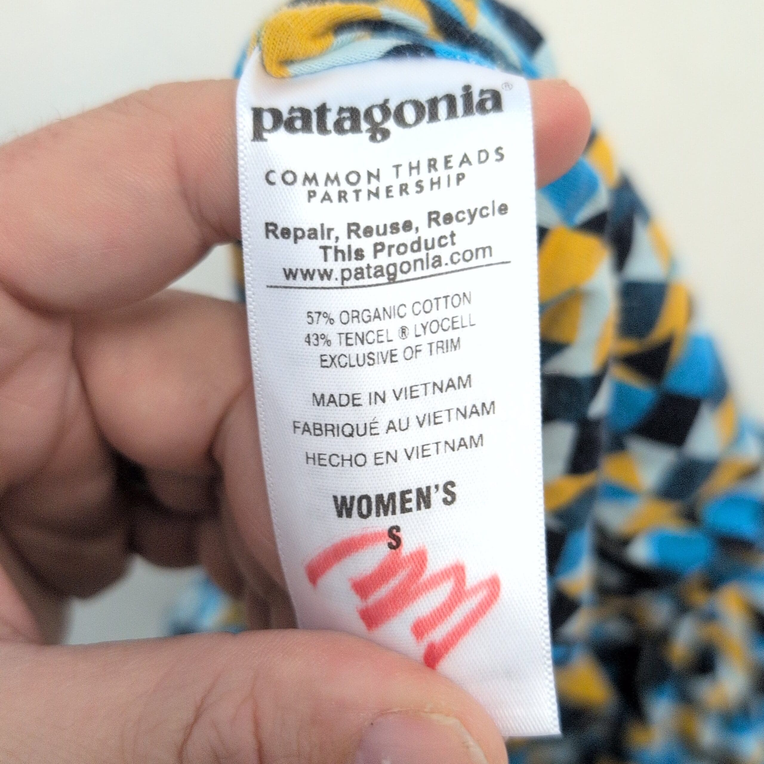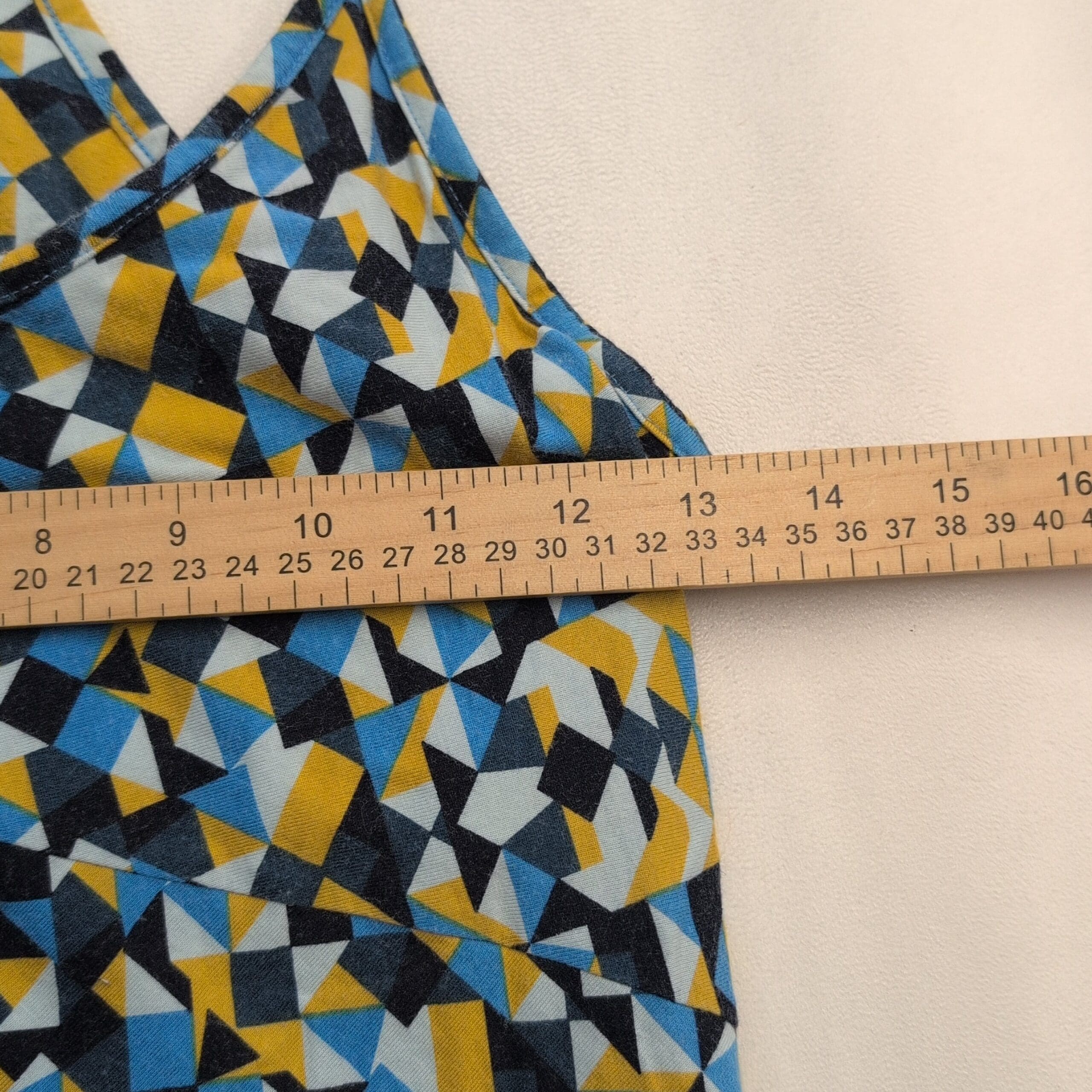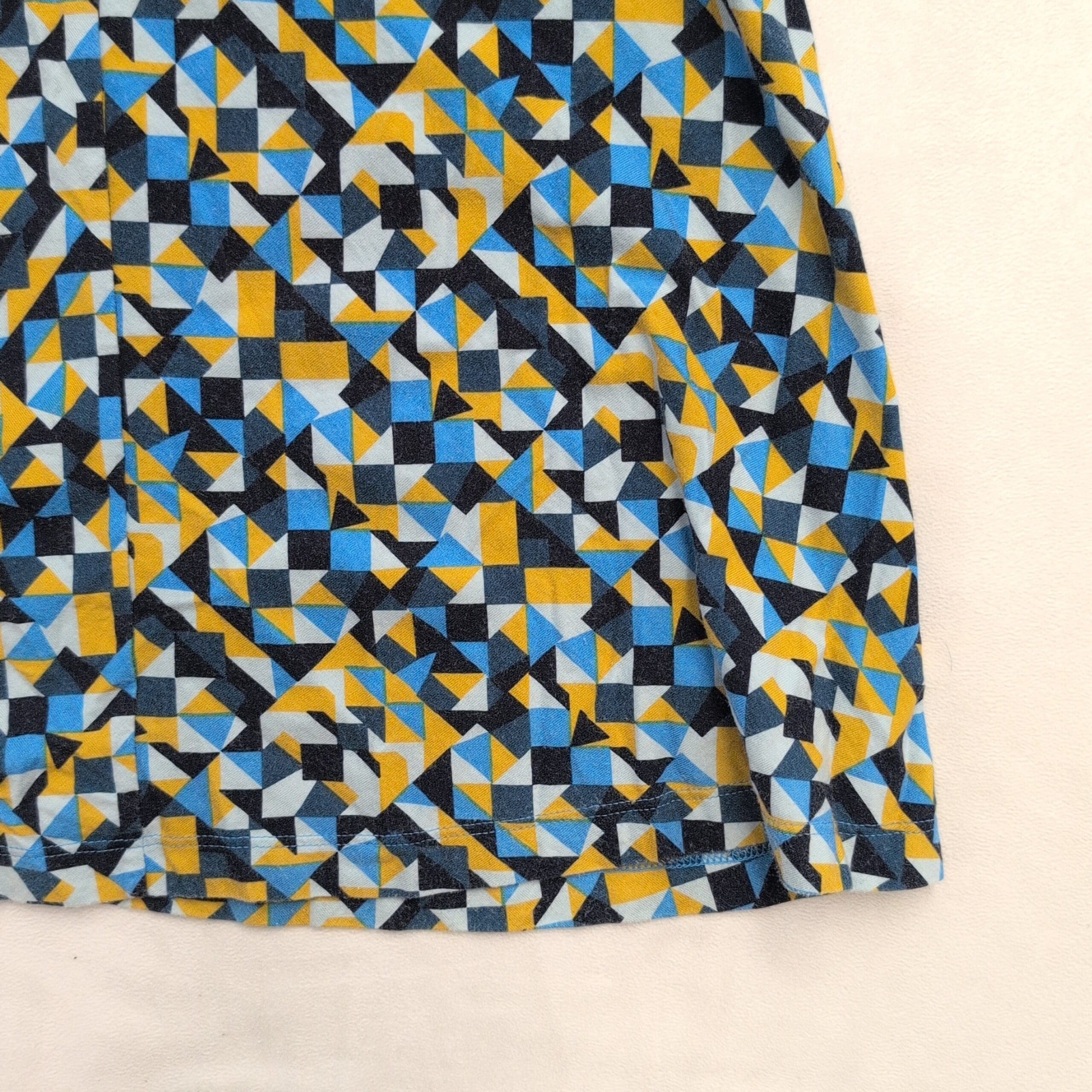 Patagonia women’s geometric racerback A-line dress, size S. Lightweight, breathable knit with narrow straps and a racerback keyhole detail. Flattering casual silhouette with a bold blue, yellow and black geometric print — perfect for summer days or casual outings.