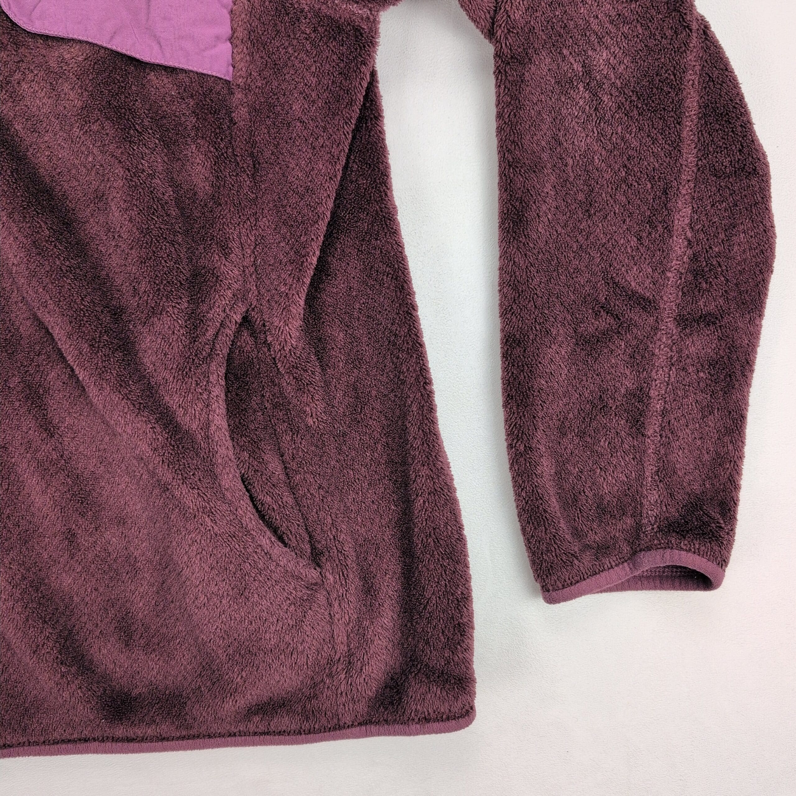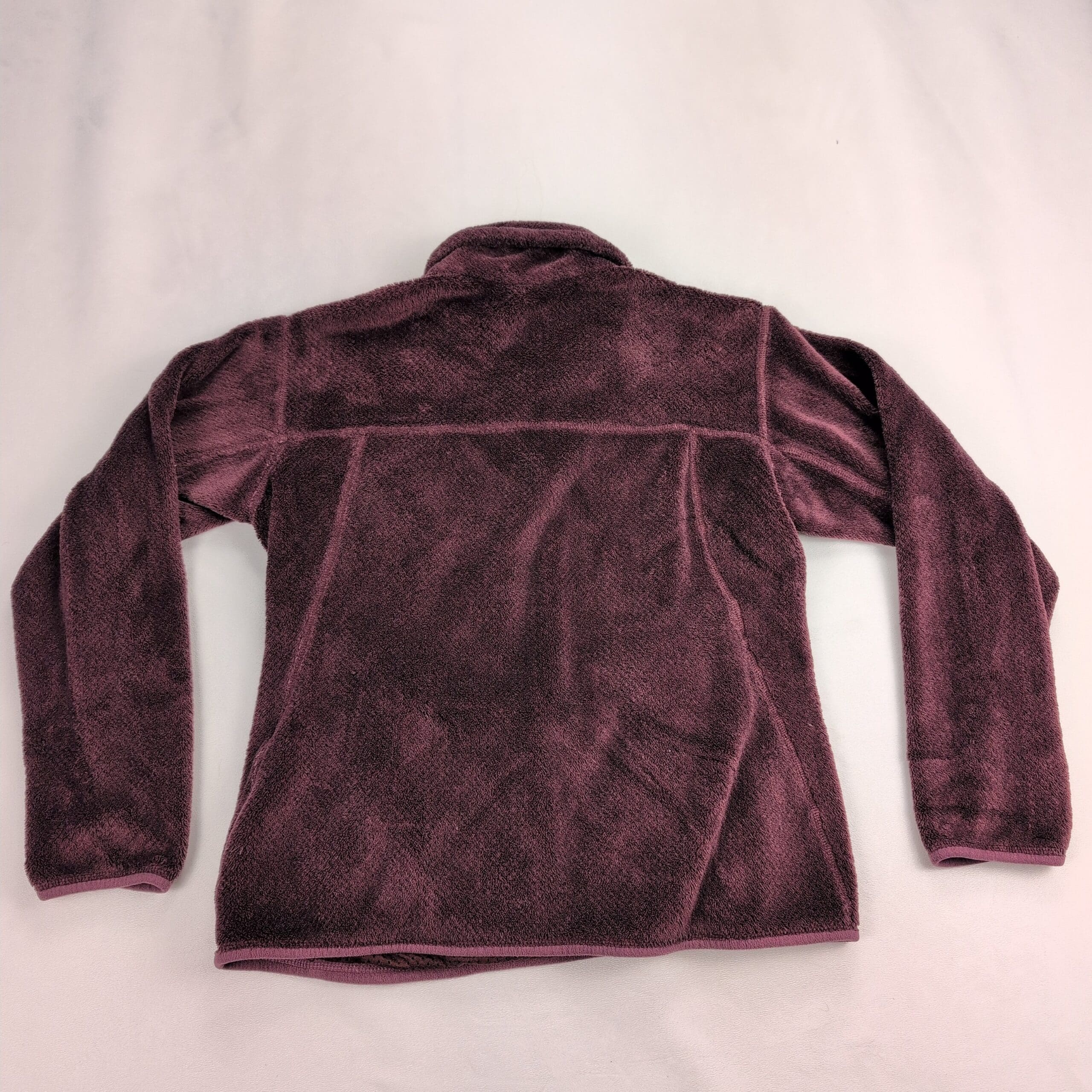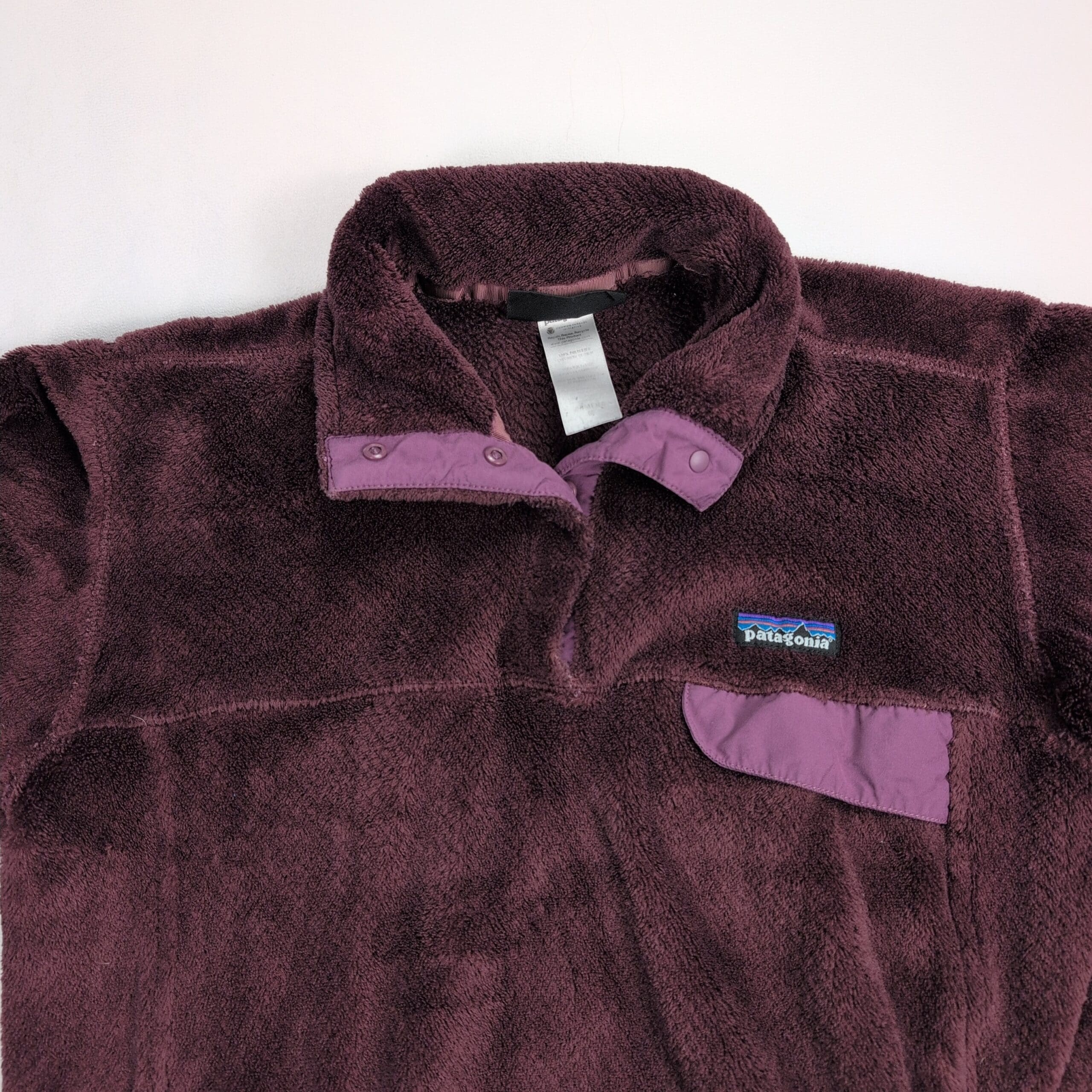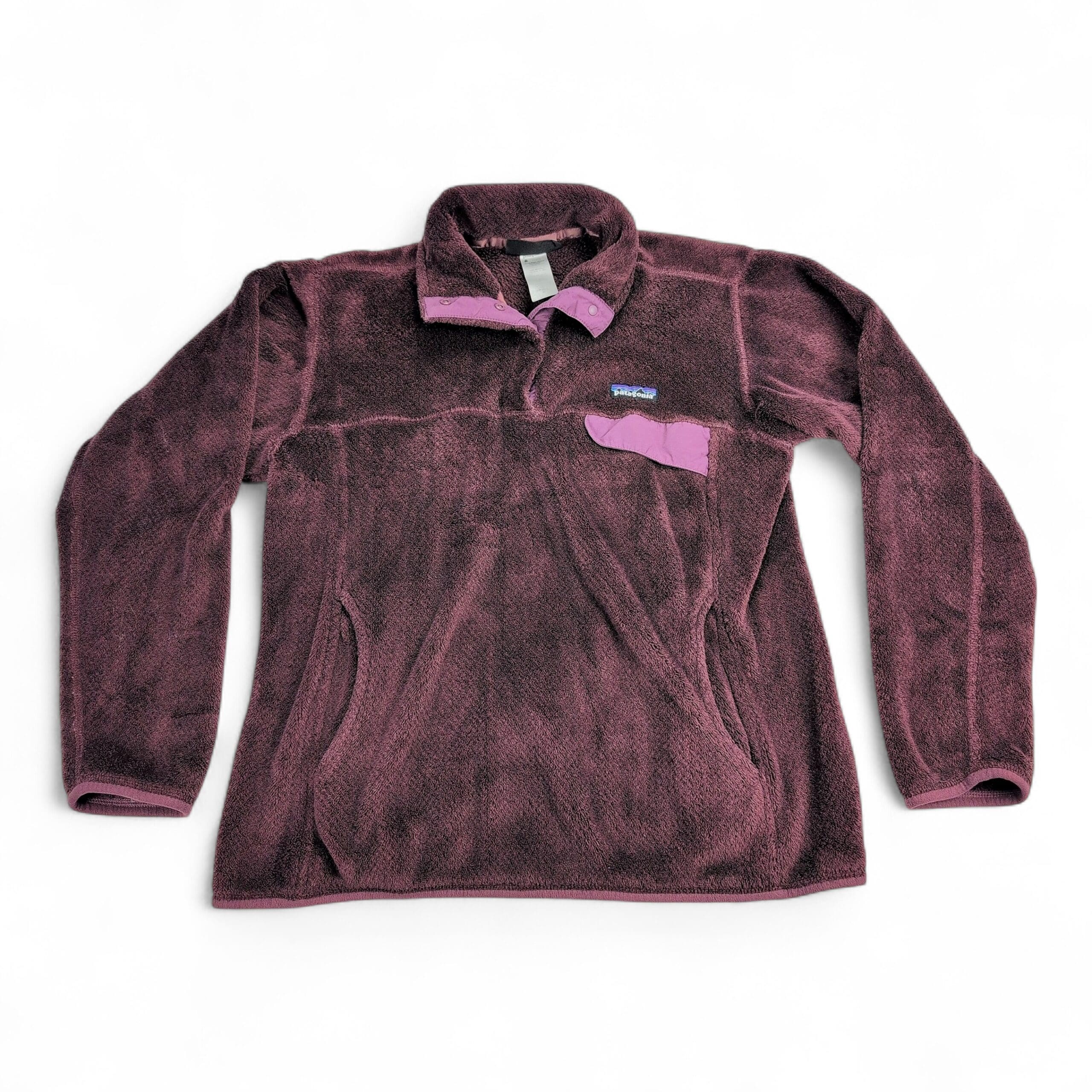 Patagonia women’s Snap-T fleece pullover, size M, in plum/dark purple with lighter trim. Classic snap-placket pullover with chest flap pocket, front hand-warmer pockets, and embroidered Patagonia logo. Great cozy layer for casual or outdoor wear.