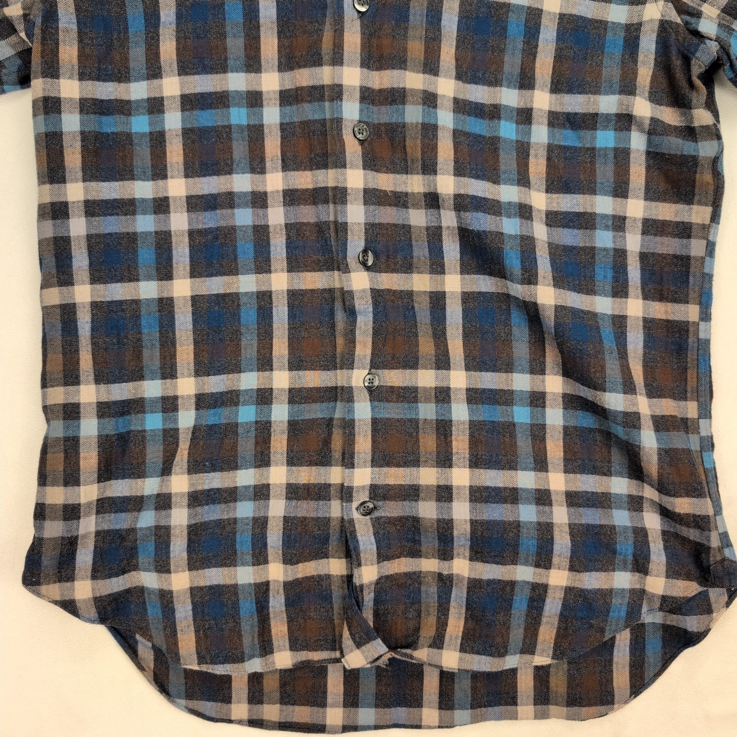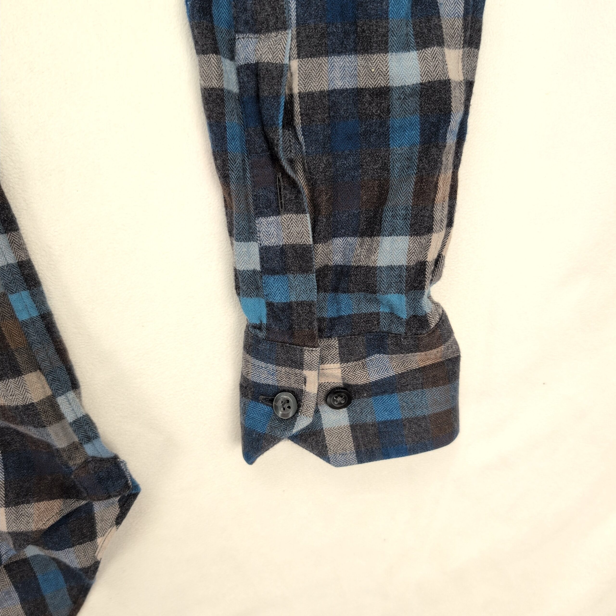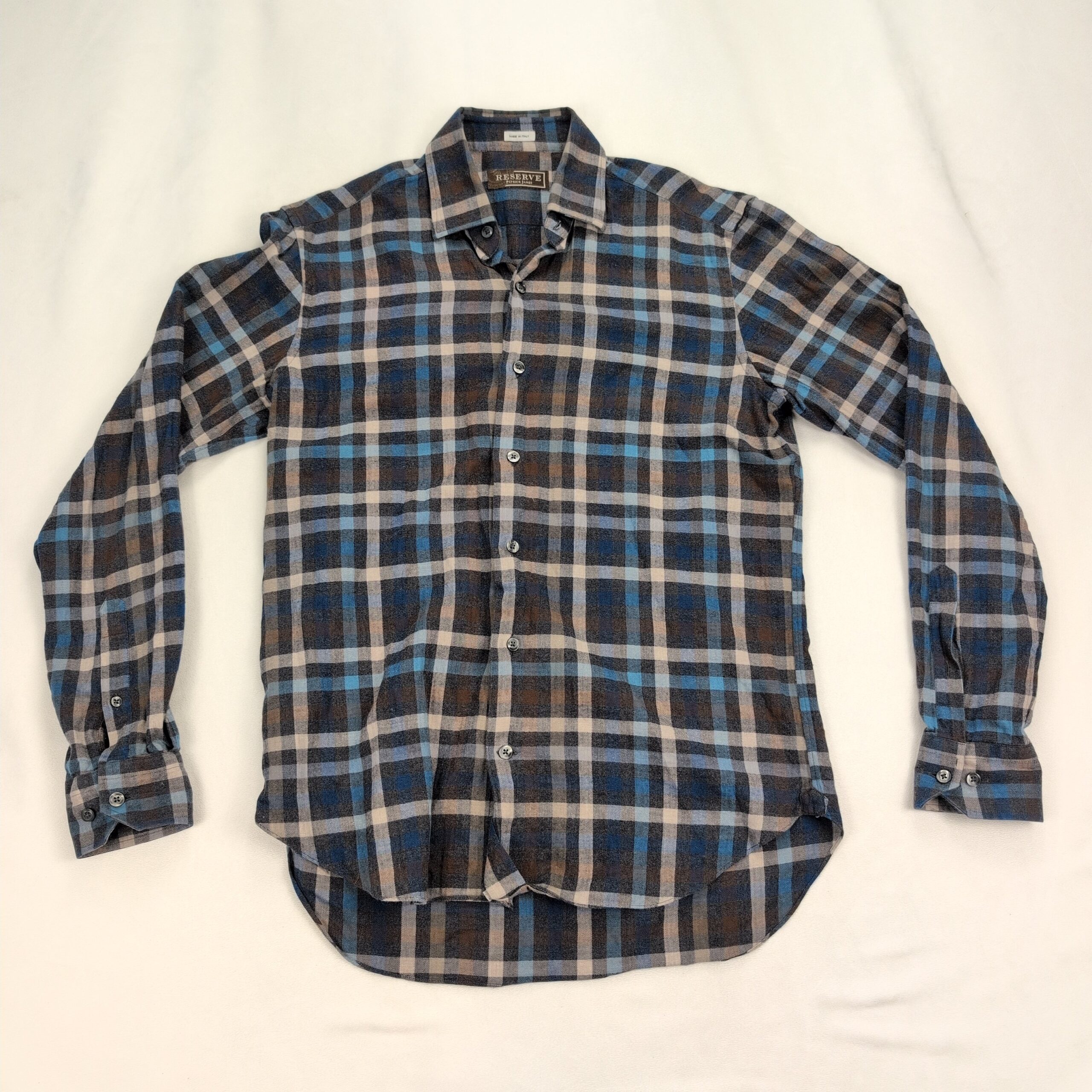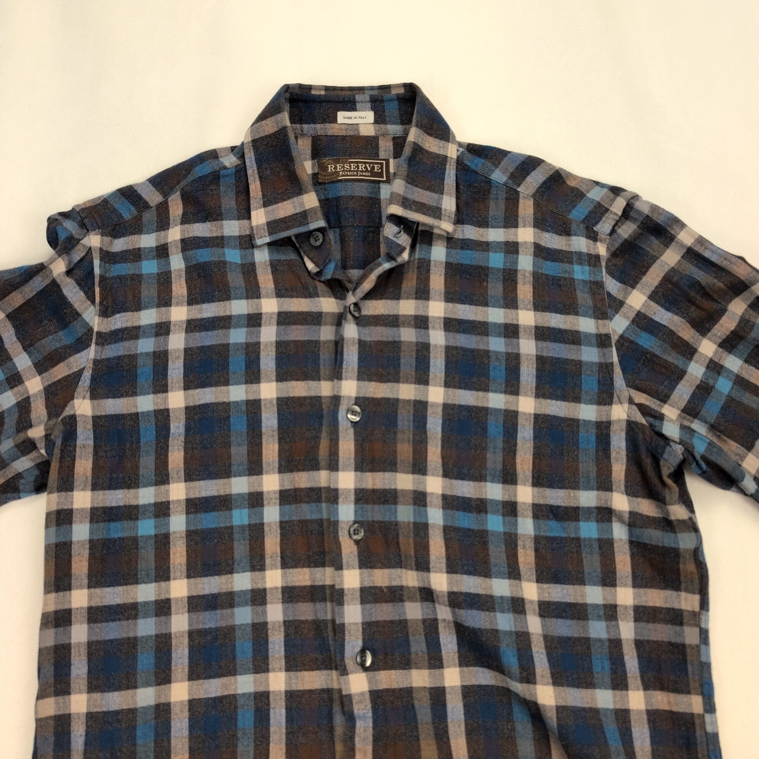 Patrick James Reserve Collection men’s long-sleeve plaid button-down in size M. Classic blue, gray and brown plaid pattern with a spread collar and button cuffs. Reserve label at the neck.