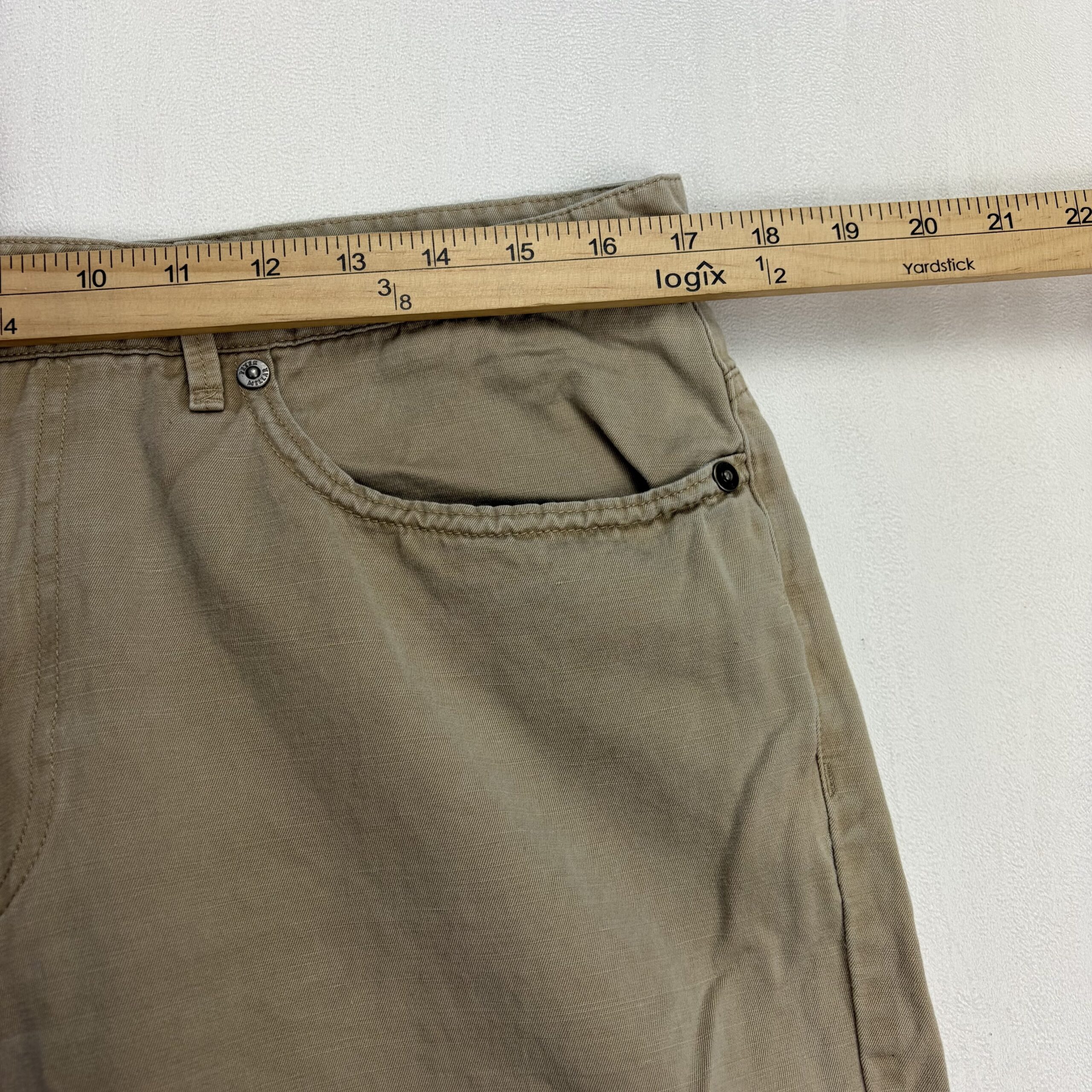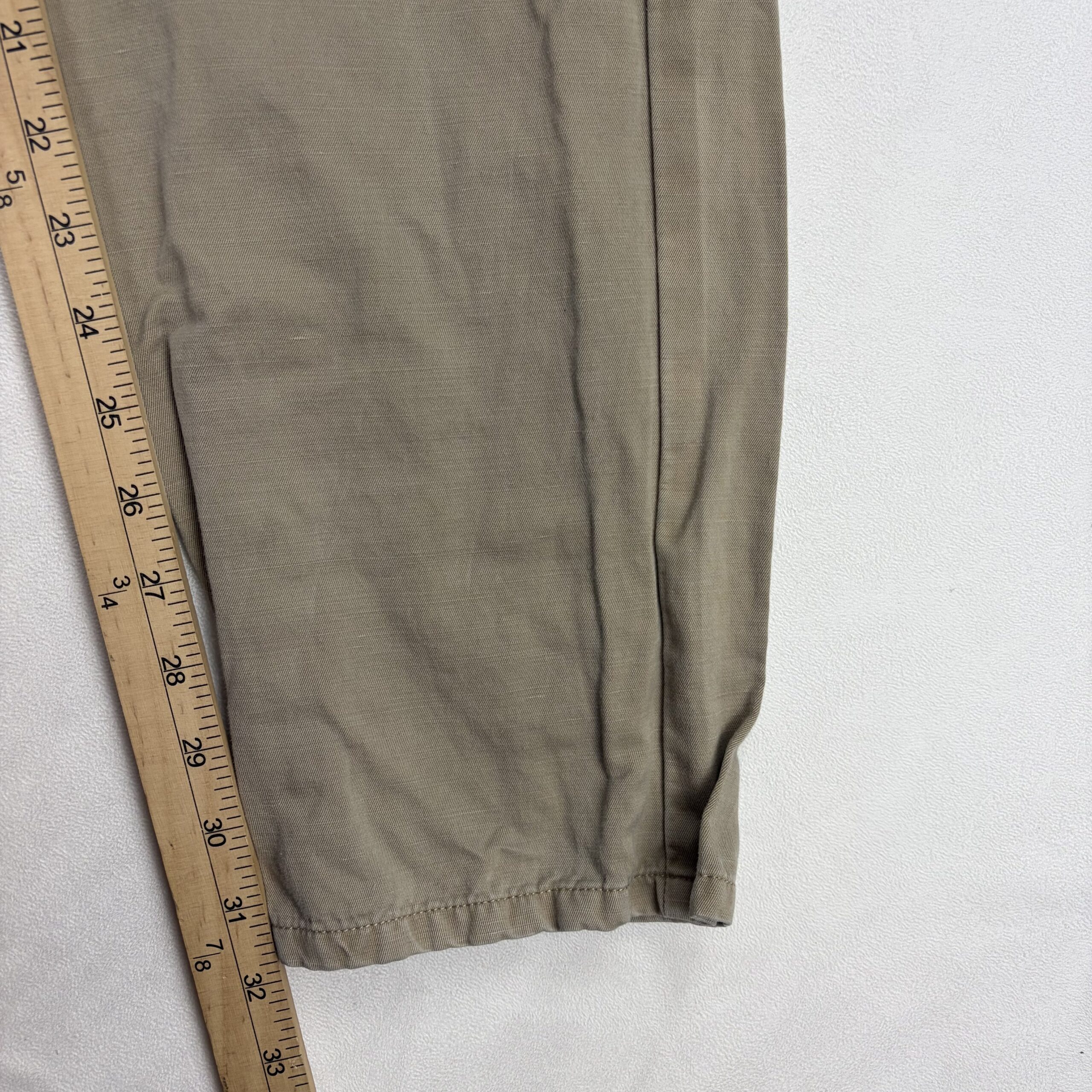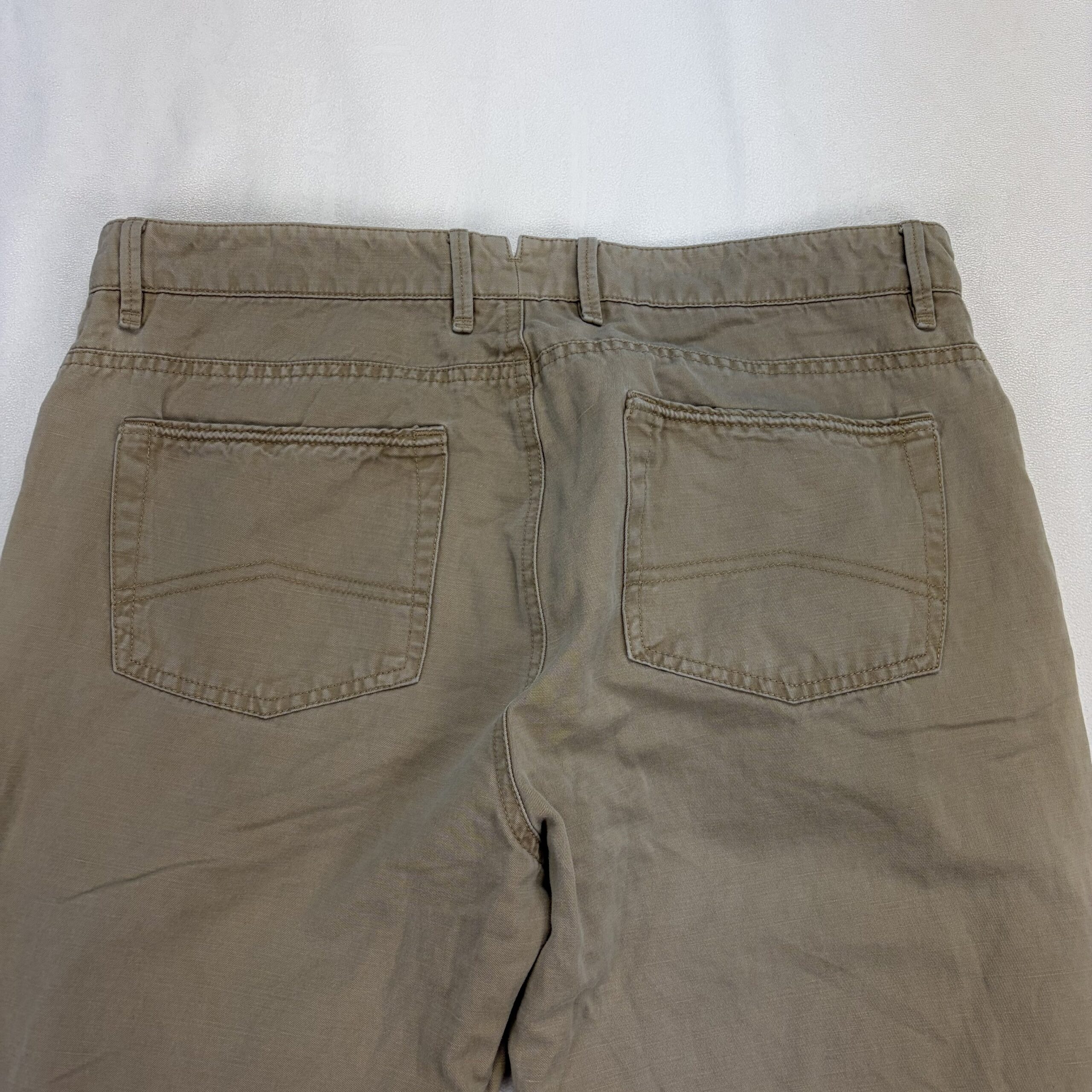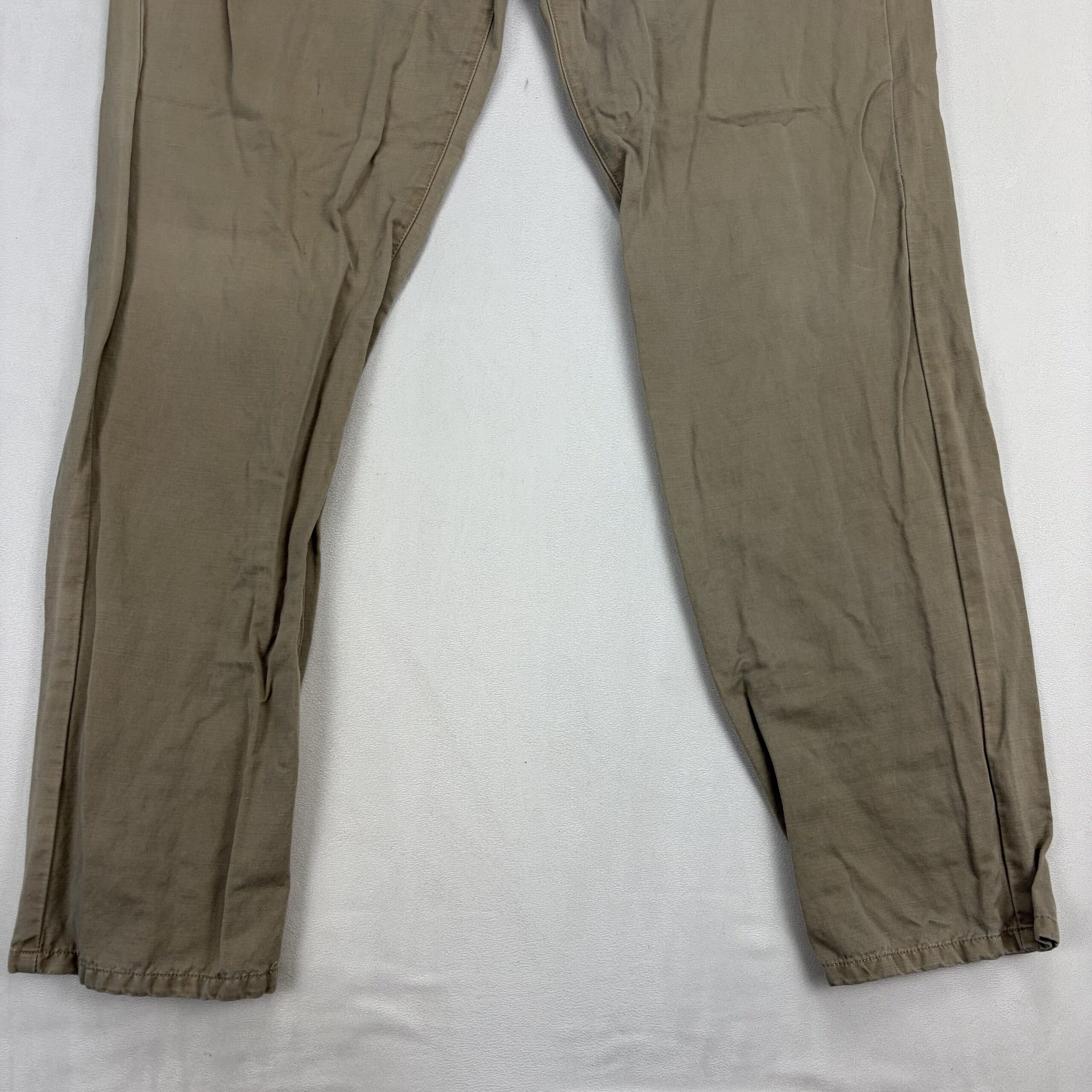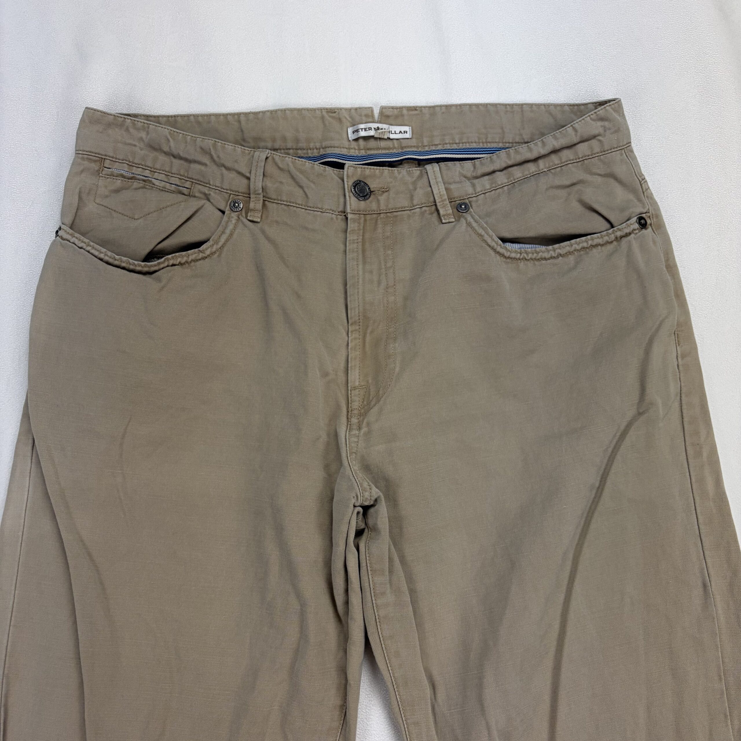 Peter Millar men’s khaki chinos in size W34. Classic, versatile 5-pocket style with belt loops and zip fly—great for smart-casual wear. Color: tan/khaki. Condition: Very good used condition with typical light wear; note there is a small dark stain on the front of the right leg (see photos) — fully disclosed. No major rips, tears, or structural flaws. Perfect for everyday or office casual outfits.