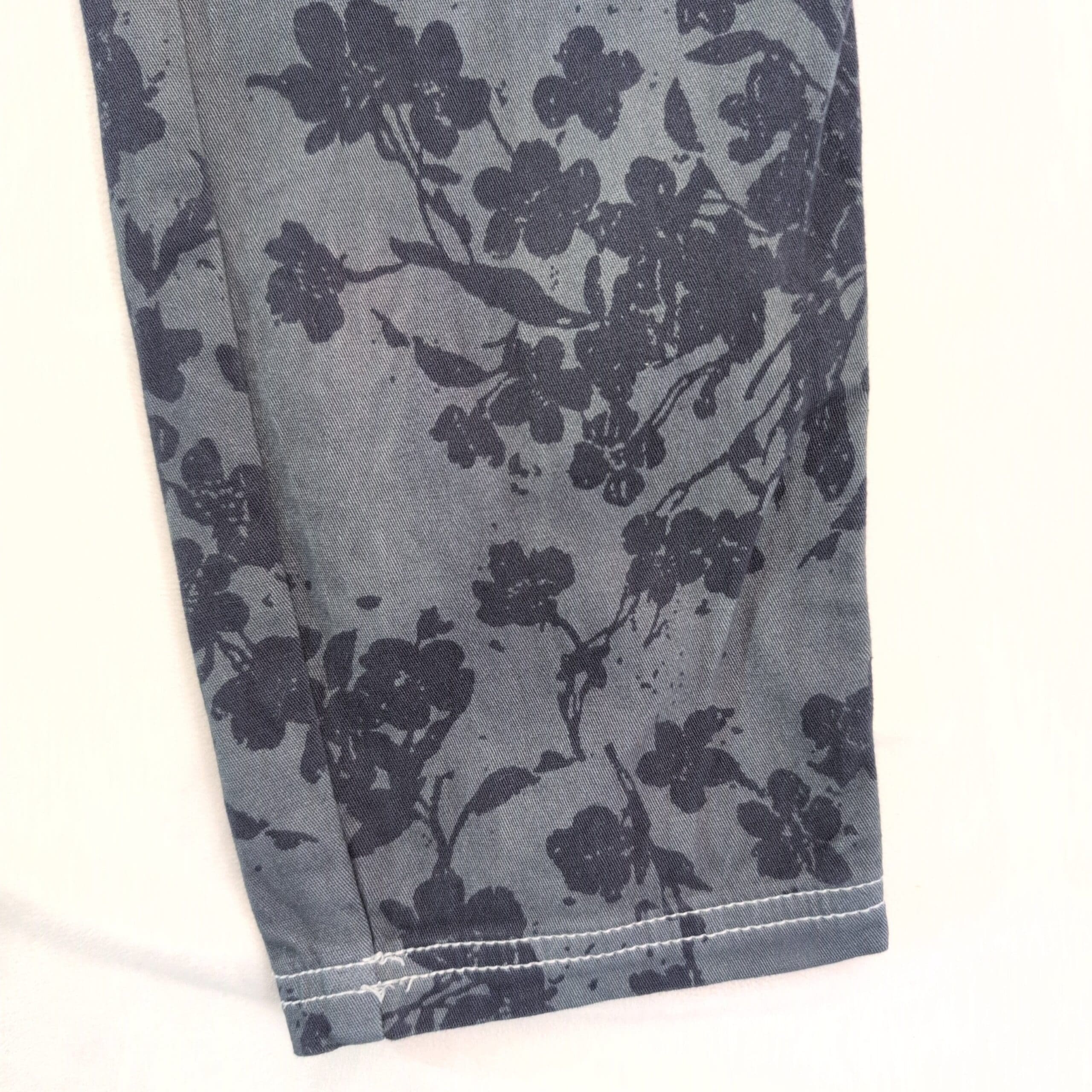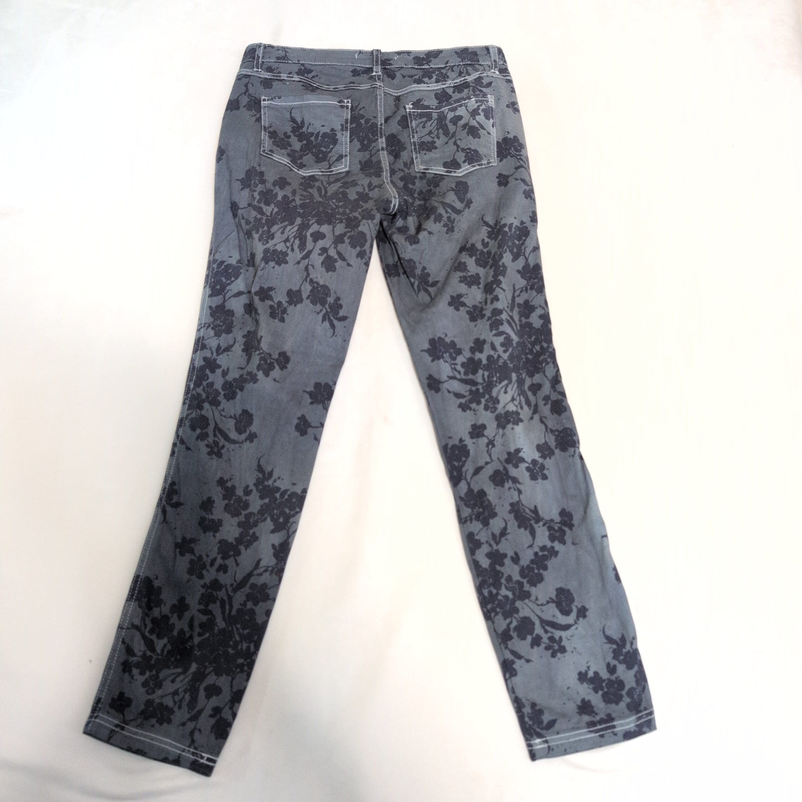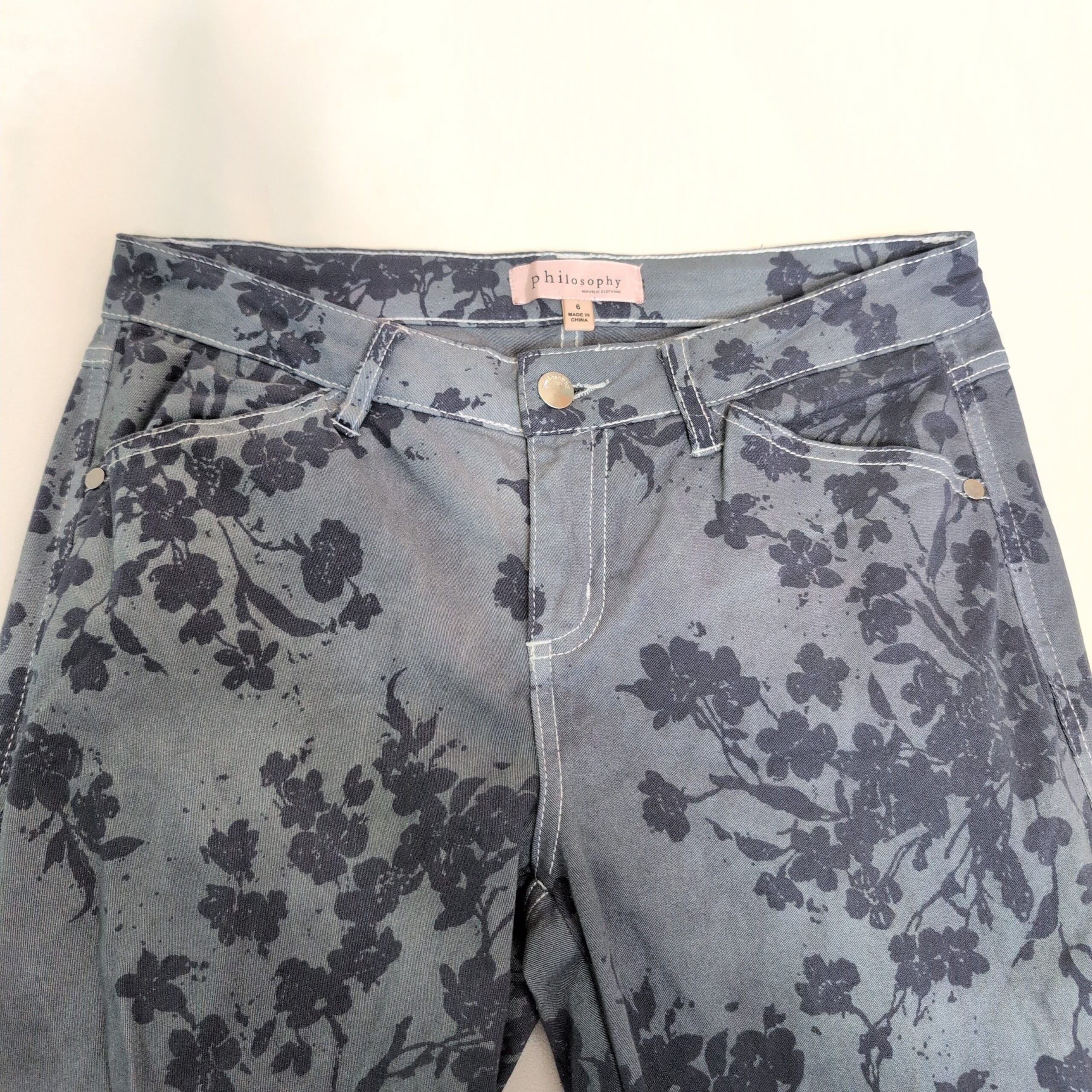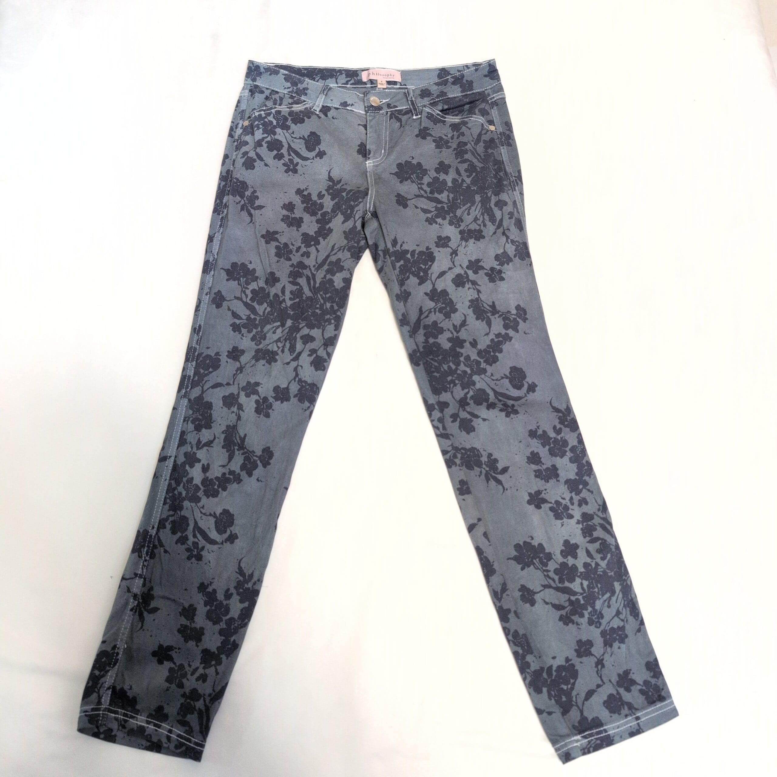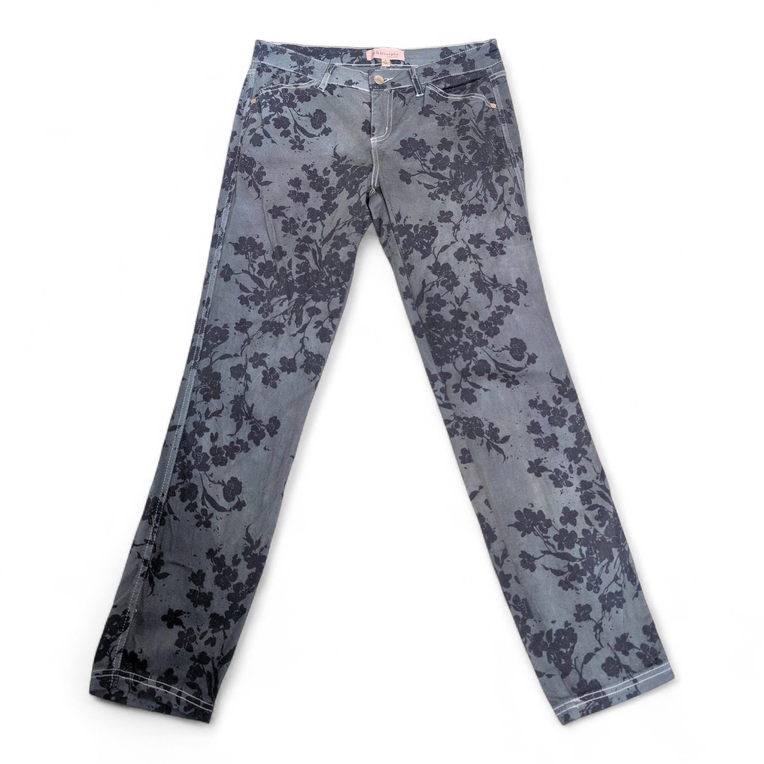 Philosophy grayish-blue floral skinny pants — Size 6. Slim, figure-skimming silhouette with an all-over dark floral print for a standout, modern look. Good used condition: free of major rips, tears, stains, or flaws; typical wear may be present. Denim-like appearance with clean hems and intact stitching.